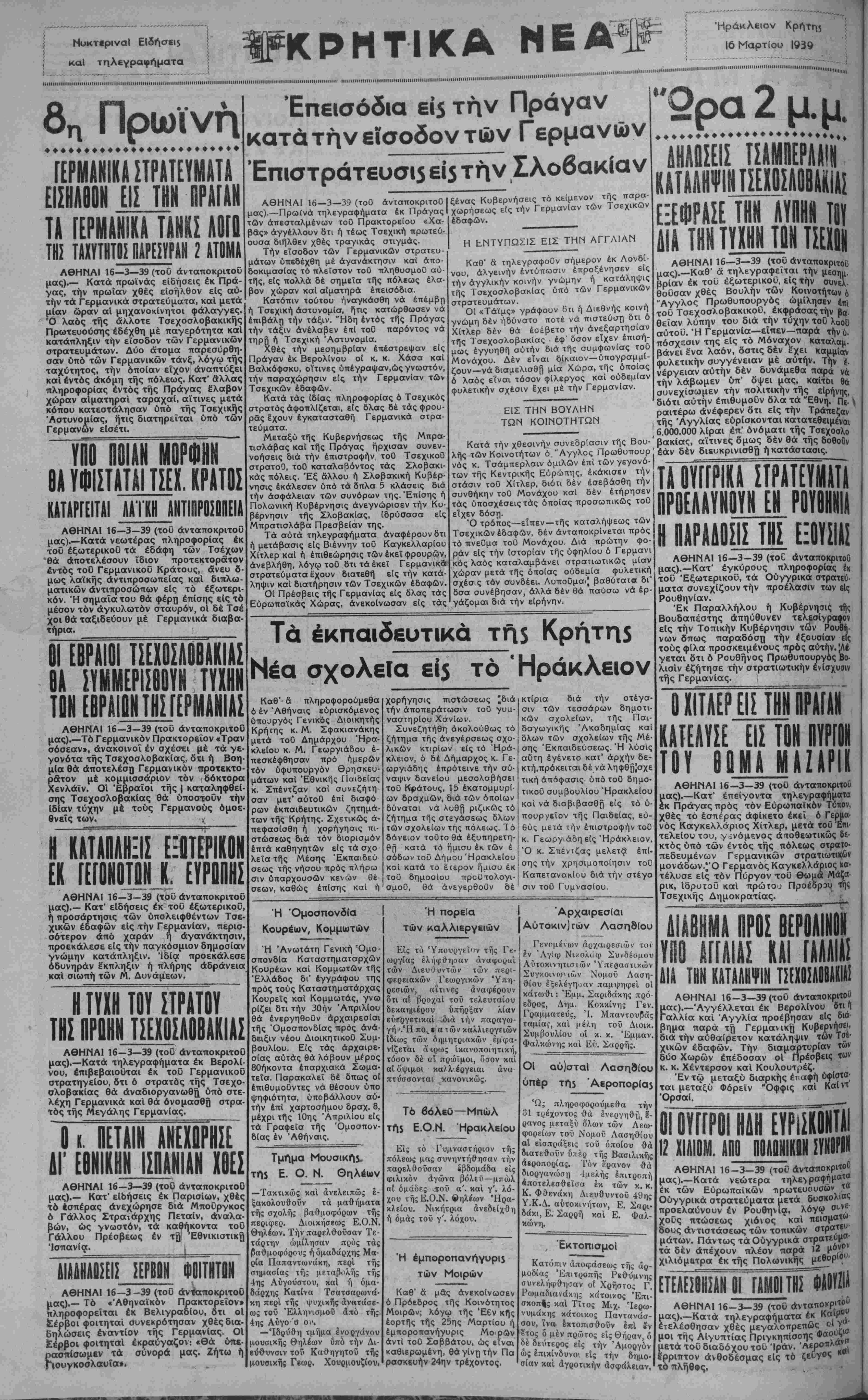 σαν ϋπό των Γερμανικών τάνξ, λόγω τη< ταχύτητος, τήν οποίαν εΐχον αναπτύξει καί εντός ακόμη της πόλεως. Κατ" αλλα' πληροφορίας εντός της Πράγας έ'λαβο χώραν αιματηροί ταραχαί, αϊτινες μετά κόπου κατεστάλησαν υπό της Τσεχικής Αστυνομίας, ήτις διατηρείται Οπό τών Γερμανών είσέτι. ϊί 0 ΠΟΙΑΗ ΜΟΡΦΗΝ ΤΣΕΧ. ΚΡΑΤΟΣ ΟΑ ΥΦΙΣΤΑΤΑΙ ΚΑΤΑΡΓΕΙΤΑΙ ΑΑΊΚΗ ΑΗΤΙΠΡΟΙΒΠΕΙΑ ΑΘΗΝΑΙ 16—3—39 (του ανταποκριτού μας).—Κατά νεωτέρας πληροφορίας έκ τοΰ εξωτερικού τά εδάφη τών Τσέχων *θά αποτελέσουν ϊδιον προτεκτοράτον εντός τοΰ Γερμανικού Κράτους, άνευ δ μως λαϊκής αντιπροσωπείας καί διπλω¬ ματικών αντιπροσώπων είς τό έξωτερι- κόν. Ή σημαία του θά φέρτ] επίσης είς τό μέσον τόν άγκυλωτόν σταυρόν, οΐ δε Τσέ χοι θά ταξιδεύουν μέ Γερμανικά διαβα¬ τήρια. Ι Α ΣΥΜΜ 01ΕΒΡΑΙΙ ΤΣΕ ΣΙ ΗΤ1 ΟΣΑΟΒΑΚΙΑΣ ΟΥΝ ΤΥΧΗΝ Σ ΓΕΡΜΑΝΙΑΣ ΑΘΗΝΑΙ 16—3-39 (τοΰ ανταποκριτού μας).—Τό Γερμανικόν Πρακτορεΐον «Τραν σόσεαν», άνακοινοΐ έν σχέσει μέ τά γε· γονότα της Τσεχοσλοβακίας, δτι ή Βοη μία θά άποτελέσ]] Γερμανικόν προτεκτο¬ ράτον μέ κομμισσάριον τόν δόκτορα Χενλάΐν. 01 Εβραίοι της | καταληφθεί- σης Τσεχοσλοβακίας θά υποστούν τήν Ιδίαν τύχη ν μέ τους Γερμανούς όμοε θνβϊς των. / 1 ΚΑΤΑ0Λ1 Κ ΓΕΓΟΝΟ ΙΙΣ ΕΞΟΤΕΡΙΚΟΗ ΌΝ Κ. ΕΥΡΟΠΗΣ ΑΘΗΝΑΙ 16—3—39 (τοΰ ανταποκριτού μας).— Κατ' είδήσεις έκ του εξωτερικού, ή προσάρτησις τών ύπολειφθέντων Τσε· χικών εδαφών είς τήν Γερμανίαν, περισ σότερον άπό χαράν η άγανακτησιν, προεκάλεσε είς τήν παγκόσμιον δημοσίαν γνώμην κατάπληξιν. Ιδία προεκάλεσε όδυνηράν έκπληξιν ή πλήρης αδράνεια καί σιωπή τών Μ. Δυνάμεων. Η ΤΥΧΗ ΤΟΥ ΣΤΡΑ ΤΗΣ ΠΡΟΗΝ ΤΣΕΧΟΣΑΟ ΟΥ 1ΑΚΙΑΣ ΑΘΗΝΑΙ 16—3—39 (του ανταποκριτού μας).—Κατά τηλεγραφήματα έκ Βερολί¬ νου, έπιβεβαιοϋται έκ τοΰ Γερμανικοΰ στρατηγείου, δτι ό στρατός της Τσεχο¬ σλοβακίας θά αναδιοργανωθώ ύπό στε¬ λέχη Γερμανικά καί θά όνομασθί) στρα¬ τός της Μεγάλης Γερμανίας. ΙΙΙΙΙΙΙΙΙΙΙΙΙΙΙΙΙΙΙΙΙΙΙΙΙΙΙΙΙΙΙΙΙΙΙΙΙΙΙΙΙ.......ΙΙ1ΙΙΙΙΙΙΙΙΙΙΙΙΙΙΙΙΙΙΙΙΙΙΙΙΙΙΙΙΙΙΙΙΙΙΙΙΙΙΙΙΙΙΙΙΙΙΙΙΙ1ΙΙΙΙΙΙΙΙΙ......ΙΙΜΙΙΙΙΗΙΙΙΗΙΙΙΙΙΙΙΙΙΙΙΙΙΙΙΙΙΙΙΙΙΙΙΙΙΙΙΙ Επεισόδια «5 την Πράγαν κατά την εϊσοδοντών Γερμανών Επιστράτευση εί5 τήν Σλοβακία ν Ήράκλειον Κρήτη} | 16 Μαρτίου 1939 ...............π,.....ι.....ι............«......'......."'"......'".................'......'.................,......, 01. ΠΕΤΑΙΝ ΑΝΕΧΟΡΗΣ ΑΙ' ΕΘΗΙΚΗΗΙΣΠΑΗ1ΑΗ ΧΟΕΣ ΑΘΗΝΑΙ 16—3—39 (τοΟ άνταποκριτοΟ μας).— Κατ' είδήσεις έκ Παρισίων, χθες τό εσπέρας άνεχώρησε διά ΜποΟργκος δ Γάλλος Στρατάρχης Πεταίν, άναλα- βών, ώς γνωστόν, τά καθήκοντα τοΰ Γάλλου Πρέσβεως έν τ^' Εθνικιστική Ισπανία. ι ΑΙΑΛΗΑΟ^ΕΙΣ ΙΕΡΒΟΗ Φ01ΤΗΤ0Η ΑΘΗΝΑΙ 16-3 -39 (τοΰ άνϋαποκριτοΟ μας).— Τό «Αθηναϊκών Πρακτορεΐον» πληροφορείται έκ Βελιγραδίου, δτι οΐ &έρβοι φοιτηταΐ συνεκρότησαν χθες δια¬ δηλώσεις εναντίον της Γερμανίας. ΟΙ Σέρβοι φοιτηταΐ έκραύγαζο: «θά ύπε· ρασπίσωμεν τά σύνορα μας. Ζήτω ή Γιουγκοσλαυΐα». ΑΘΗΝΑΙ 16—3—39 (τοϋ άνιαποκριτοΟ μας).—Πρωινά τηλεγραφήματα έκ Πράγας τών απεσταλμένων τοΟ Πρακτορείου «Χα¬ βάς» άγγέλλουν οτι ή τέως Τσεχική πρωτεύ¬ ουσα διήλθεν χθες τραγικάς στιγμάς. Τήν εϊσοδον των Γερμανικών στρατευ¬ μάτων ύπεδέχθη μέ άγανακτησιν καί απο¬ δοκιμασίας τό πλείστον τοΟ πληθυσμού αύ τής, ε[ς πολλά δέ σημεία της πόλβως έλα- βον χώραν και αιματηρά επεισόδια. Κατόπιν τούτου ήναγκάσθη νά έπέμβη ή Τσεχική αστυνομία, ήτις κατώρθωσεν ν α έπιβάλη τήν τάξιν. "Ηδη εντός τής Πράγας τήν τάξιν άνέλαβεν έαΐ τοΟ παρόντος νά τηρη ή Τσεχική Αστυνομία. Χθες τήν μεσημβρίαν επέστρεψαν είς Πράγαν έκ Βερολίνου οί κ