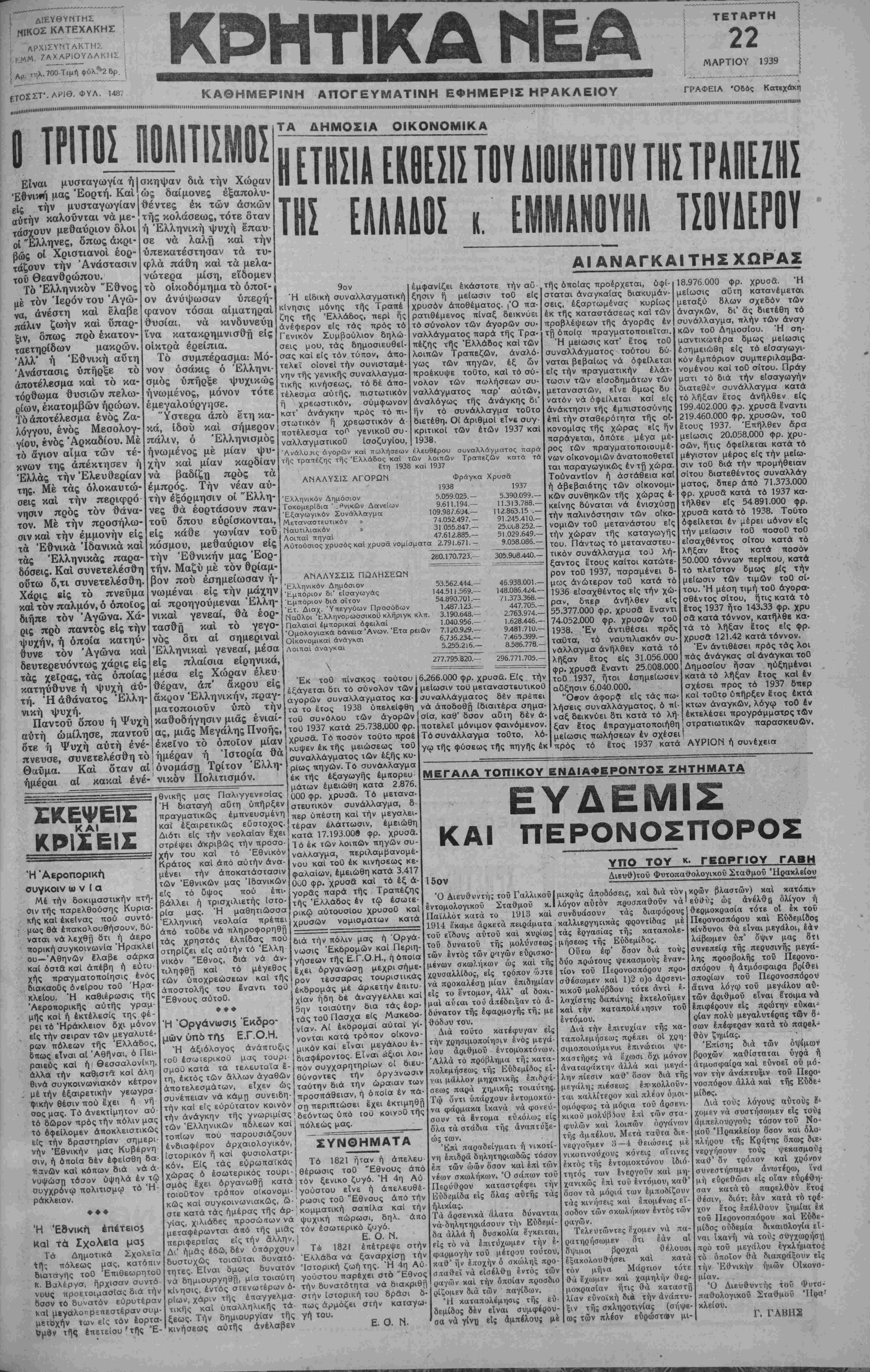ΙΙΙΙΙΙΙΙΙΙΙΙΙΙ1ΙΙΙΙΙΙΙ1ΙΙ1ΙΙΙΙΙΜΜΙΙΙΙΙΗΙΙΙΙΙΙΙΙ1ΙΙ1ΙΙ1ΙΙΙΙΙΙΙΙΙΙ,,,,,,.......ΙΙΙΙΙΙιιιιιιιιιιιιιιιιιιιιιιιιι,ιι,,ιηι,.....ΙΙΙΙΙΙΙΙΙιΙΙΙΙ(ΙΙΗΙΙ(ΙΙΙΙΙΙΙΙιιιιιιιιι|||ι1||Η<ιΙΙΙιιΙιιιιιιιι|Ιιιιι,|||ιιιι.ΙΙΙΙΜΙΙΙΗΙΙΙΙΙΗΙΙ«ΙΙΙΙΙ1ΙΙΙι«ΙΙΙΙΙΙΙΙ|ΙΙΙΜΙΙΐαΐΙΙΙΙΙΙ·ΙΙΙΙΙΙΙΙΙΙΙΙΙΙΙΙ1ΙΙΙΙΙΙΙΙΗΙΙΙ........ΙΙΙΙΙΙ1ΙΙΙΙΙΙΙΗΙΙΙΙ 0 ΤΡΙΤΟΣ ΠΟΜΤΙΣΜΟΣ Είναι μυσταγωγία ήΐσκηψαν δια την Χώραν Εθνική μας Εορτή. Καί ώς δαίμονες έξαπολυ- είς χΆν μυσταγωγίαν Μέντες έκ των ασκών αυτήν καλούνται να με- τής_κολάσεως, τότε δταν τάσχουν μεθαύριον όλοι οι "Ελληνες, όπως ακρι¬ βώς οί Χριστιανοί εορ¬ τάζουν την Άνάστασιν Θεανθρώπου. Το Έλληνικόν "Εθνος με τον Ιερόν του "Αγώ¬ να, ανέστη καί έλαβε πάλιν ζωήν καί ΰπαρ- ξιν, δπως προ εκατον¬ ταετηρίδων μακρών. Αλλ' ή Εθνική αΰτη Άνάστασις υπήρξε το αποτέλεσμα καί το κα¬ τόρθωμα θυσιών πελω¬ ρίων, εκατομβών ηρώων. Τό αποτέλεσμα ενός Ζα¬ λόγγου, ενός Μεσολογ¬ γίου, ενός Αρκαδίου. Με τό άγιον αίμα τών τέ¬ κνων της άπέκτησεν ή Ελλάς την Έλευθερίαν της. Με τάς όλοκαυτώ- σεις καί την περιφρό νησιν προς τον θάνα¬ τον. Με την προσήλω- σινκαί την έμμονήν εις τα Εθνικά "Ιδανικά καί τάς Έλληνικάς παρα¬ δόσεις. Καί συνετελέσθη οΰτω δ,τι συνετελέσθη. Χάρις βίς τό πνεύμα καί τον παλμόν, ό οποίος διήπε τον "Αγώνα. Χά¬ ρις προ παντός είς τήν ψυχήν, ή οποία κατηύ¬ θυνε τον "Αγώνα καί δευτερευόντως χάρις είς τάς χείρας, τάς οποίας κατηύθυνε ή ψυχή άύ- τή. Ή αθάνατος Ελλη¬ νική ψυχή. Παντοΰ δπου ή Ψυχή αυτή ώμίλησε, παντοΰ δτε ή Ψυχή αυτή ενέ¬ πνευσε, συνβτελέσθη τό Θαϋμα. Καί δταν αί ή Ελληνική ψυχή έπαυ¬ σε να λαλή καί τήν ύπεκατέστησαν τα τυ¬ φλά πάθη καί τα μελα- νώτερα μίση, εΐδομεν τό οίκοδόμημα τό όποι¬ ον ανύψωσαν ύπερή- φανον τόσαι αίματηραί θυσίαι, νά κινδυνεύη ϊνα κατακρημνισθή είς οικτρά ερείπια. Τό συμπέρασμα: Μό¬ νον οσάκις ό Ελληνι¬ σμός υπήρξε ψυχικώς ηνωμένος, μόνον τότε έμεγαλούργησε. Ύστερα από έτη κα¬ κά, "ιδού καί σήμερον πάλιν, ό "Ελληνισμός ηνωμένος με μίαν ψυ- χήν καί μίαν καρδίαν νά βαδίζη προς τα εμπρός. Τήν νέαν αυ¬ τήν έξόρμησιν οί "Ελλη¬ νες θα εορτάσουν παν- τοϋ δπου ευρίσκονται ΤΑ ΔΗΜΟΣΙΑ ΟΙΚΟΝΟΜΙΚΑ Η ΕΤΗΣΙΑ ΕΚ8ΕΣΙΙ ΤΟΥ ΔΙΟΙΚΗΤΟΥ ΤΗΙ ΤΡΑΠΕΖΗΣ ΤΗΙ ΕΛΛΑΔΟΣ ι. ΕΜΜΑΝΟΥΗΛ ΤΣΟΥΔΕΡΟΥ ΑΙ ΑΝΑΓΚΑΙ ΤΗΣ ΧΩΡΑΣ 9ον Ή είδική συναλλαγματική κίνησις μόνης τής Τραπέ ζης τής Ελλάδος, περί ής άνέφερον είς τάς προς χό Γενικόν Συμβούλιον δηλώ¬ σεις μου, τάς δημοσιευθεί¬ σας καί είς τον τύπον, απο¬ τελεί οιονεί τήν ουνισταμέ- νην τής γενικής συναλλαγμα¬ τικής κινήσεως, τό δέ άπο- πιστωτικόν συμφωνον τέλεσμα αυτής, ή χρεωστικόν, κατ' ανάγκην ιτρός τό πι- στωτικόν ή χρεωστικόν α¬ ποτέλεσμα το·"1 γενικοΟ συ¬ ναλλαγματικού Ισοζυγίου, εμφανίζει εκάστοτε τήν αυ· ξησιν ή μείωσιν τοΟ είς χρυσόν αποθέματος. ?Ό πα- ρατιθέμενος πίναξ δεικνύει τό σύνολον τών αγορών συ¬ ναλλάγματος παρά τής Τρα¬ πέζης τής "Ελλάδος καί των λοιπών Τραπεζών, αναλό¬ γως τών πηγών, έξ ων προέκυψε τοΟτο, καί τό σύ¬ νολον τών πωλήσεων συ¬ ναλλάγματος παρ" αυτών, αναλόγως τής ανάγκης δι" ή'ν τό συνάλλαγμα τοΟτο διετέθη. Οί αριθμοί εΐνε συγ κριτικοί 1938. τών ετών 1937 καί Άνάλυΐις άγορΩν και πωλήσεων ελευθέρου συναλλάγματος παρά τής τραπέζης τής Ελλάδος καί τΟν λοιπών Τραπεζών κατά τα Ετη 1938 καί 1937 ΑΝΑΛΥΣ1Σ ΑΓΟΡΩΝ Φράγκα Χρυσά "2 βίς κάϋε γωνίαν τοϋ κόσμου, μεθαύριον είς τήν Έθνικήν μας Έορ- τήν. Μαζύ με τον θρίαμ- βον πού έοημείωσαν ή- νωμέναι είς τήν μάχην αί προηγούμεναι Έλλη- νικαί νενεαί, θα έορ- τασθη καί 