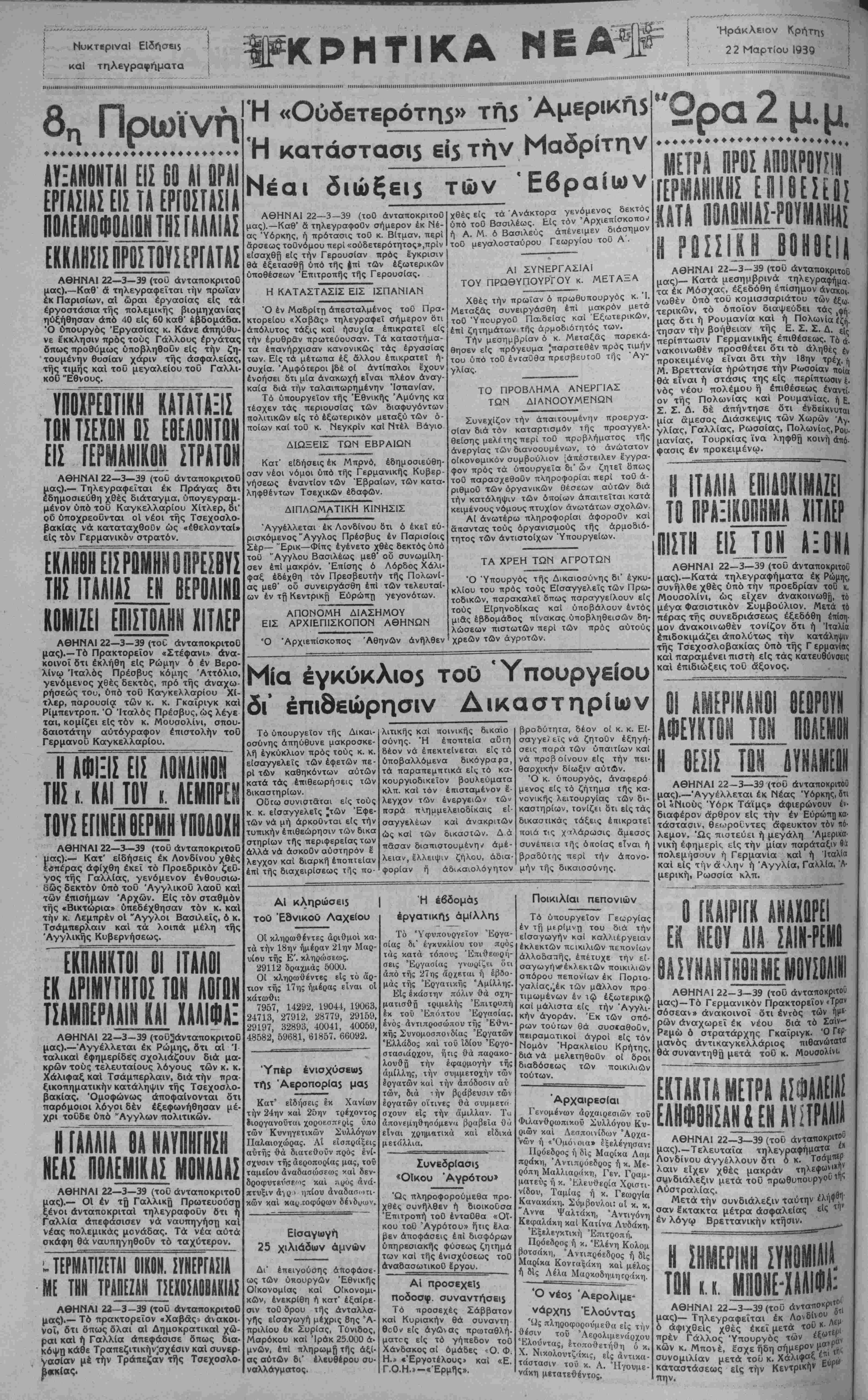 ,........,,ι.....ΜΗ»»........"""".......""•""ΙΙ"""""'»·<»»ΙΙΙΙΙΙΙΙ||||Ι,,ΙΙ1( "2ρα 2 μ. μ ΜΕ ΓΕΡΪ ΚΑΤ ΡΑ ΠΡΟΣ ΑΠΟΚΡΟΥΩ ΑΝΙΚΗΣ Ε ί! ■ΡΙ ΙΕΣΕΟ ΥΜΑΝΙ Ρ0ΣΣΙ_Ο__|0ΗΒΕΙΑ ΑΘΗΝΑΙ 22—3-39 (τοΰ ανταποκριτού μας)_ Κατά μεσημβρινά τηλεγράφημα, τα έκ Μόσχσο, εξεδόθη έπίσημον άνκκοι. νωθέν ύπό τοΰ κομισσαριάτου τών έξω. τερικών, τό όποιον διαψεύδει τάς φή. μας δτι ή Ρουμανία καί ή Πολωνία ίζή. τησαν τήν βοήθειαν τής Ε. Σ. Σ. Δ. είς περίπτωσιν Γερμανικής επιθέσεως. Τό <*. νακοινωθέν προσθέτει δτι τό αληθές έν προκειμένω είναι δτι τήν 18ην τρέχ. α Μ. Βρεττανία ήρώτησε τήν Ρα,σσίαν ποίο! θά είναι ή στάσις της είς περίπτωσιν έ. νός νέου πολέμου ή επιθέσεως εναντί¬ ον τής Πολωνίας καί Ρουμανίας, ή ε, Σ. Σ. Δ. δέ απήντησε δτι ενδείκνυται μία άμεσος Διάσκεψις τών Χωρών Άγ. γλίας, Γαλλίας, Ρωσσίας, Πολωνίας, Ρου¬ μανίας, Τουρκίας ίνα ληφθη κοινή άπ6. φασις έν προκειμένω. ΤΟ Ι ΑΛΙΑ ΕΠΙΔΟΚΙΜΑΖ ΡΑΞΙΚΟΠΗΜΑ Χ1ΤΑ ΠΙΣΤΗ ΕΙΠΗ ΙΞΙΙΙ ΑΘΗΝΑΙ 22—3—39 (τοΟ ανταποκριτού μας).—Κατά τηλεγραφήματα έκ Ρώμης, συνήλθε χθες ύπό τήν προεδρίαν τοΟ κ. Μουσολίνι, ώς εΐχεν ανακοινωθώ τό μέγα Φασιστικόν Συμβούλιον. Μετά τό πέρας της συνεδριάσεως εξεδόθη επίση¬ μο ν ανακοινωθέν τονίζον δτι ή Ιταλία επιδοκιμάζει απολύτως τήν κατάληψιν τής Τσεχοσλοβακίας ύπό τής Γ ερμανίας καί παραμένει πιστή είς τάς κατευθύνσεις καί επιδιώξεις τοΟ άξονος. 01 ΑΦΕΥΚΤΟΝ ΤΟ Η ΒΕΪΙ! ΤΟΝ ΑΘΗΝΑΙ 22—3—39 (τοΰ ανταποκριτού μας).—'Αγγέλλεται έκ Νέας "Υόρκης, δτι οι «Νιους 'Υόρκ Τάϊμς» αφιερώνουν εν¬ διαφέρον άρθρον είς τήν έν Εύρώπυ κσ· τάστασιν, θεωροΟντες άφευκτον τόν τϊ6· λεμον. '£ϊς πιστεύει ή μεγάλη "Αμερικα¬ νική έψημερ'κ είς τήν μίαν παράταξιν θα πολεμήσουν ή Γερμανία και ή Ιταλία καί είς τήν ά^λην ή "Αγγλία, Γαλλία, Α¬ μερική, Ρωσσία κλπ. Ο ίΚΑΙΡΙΓΧ ΑΝ&ΧΟΡΕΙ ΝΕΟΥ ΑΙΑ ΣΑΙΝ-ΡΕΜΟ ΒΑΣΥΗΑΗΤΗΒΗ ΜΕ ΜΟΥΣΟΛΙΝΙ ΑΘΗΝΑΙ 22—3—39 (τοΟ ανταποκριτού μας)—Τό Γερμανικόν Πρακτορεΐον «Τρσν σόσεαν» άνακοινοΐ δτι εντός τών ήμβ ρών αναχωρεί έκ νέου διά τό Σσΐν- Ρεμώ ό στρατάρχης Γκαΐριγκ. Ό Γψ μανός άντικαγκελλάριος πιθανότατο θά συναντηθ^ μετά τοΟ κ. Μουσολίνι. ΕΚΤΑΚ ΕΛΗΦΒ & ΜΕΤΡΑ ΑΣΦΑΛΕΙΑ ΑΘΗΝΑΙ 22—3—39 (του «νι«»"τ μας)—Τελευταία τηλεγραφήματα Λονδίνου άγγέλλουν δτι ό κ. Τσάμ"£Ρ λαιν εΐχεν χθες μακράν τηλεφωνική* συνδιάλεξιν μετά τοΟ πρωθυπουργού τηί Αυστραλίας. Μετά τήν συνδιάλεξιν ταύτην σαν έκτακτα μέτρα ασφαλείας έν λόγω Βρεττανικήν κτήσιν. Τ Σ ΙΗ ι. κ. ΜΙ ί, Ι Ι»·ι«·--· Λ 1ΚΗΑΑΙΦΑ: ΑΘΗΝΑΙ 22-3—39 (τοΰ άντατιοκρ μας)— Τηλεγραφεΐται έκ Λονδίνου 6 αφιχθείς χθες έκεϊ μετά του*^ •πρέν Γάλλος Υπουργός των ^ωΊΛν κών κ. Μπονέ, ϋσχε ήδη σήμερον»μα»Ρ συνομιλίαν μετά του κ. Χάλιψσξ έ*^ καταστάσεως είς τήν Κεντρικην ^ν πην.