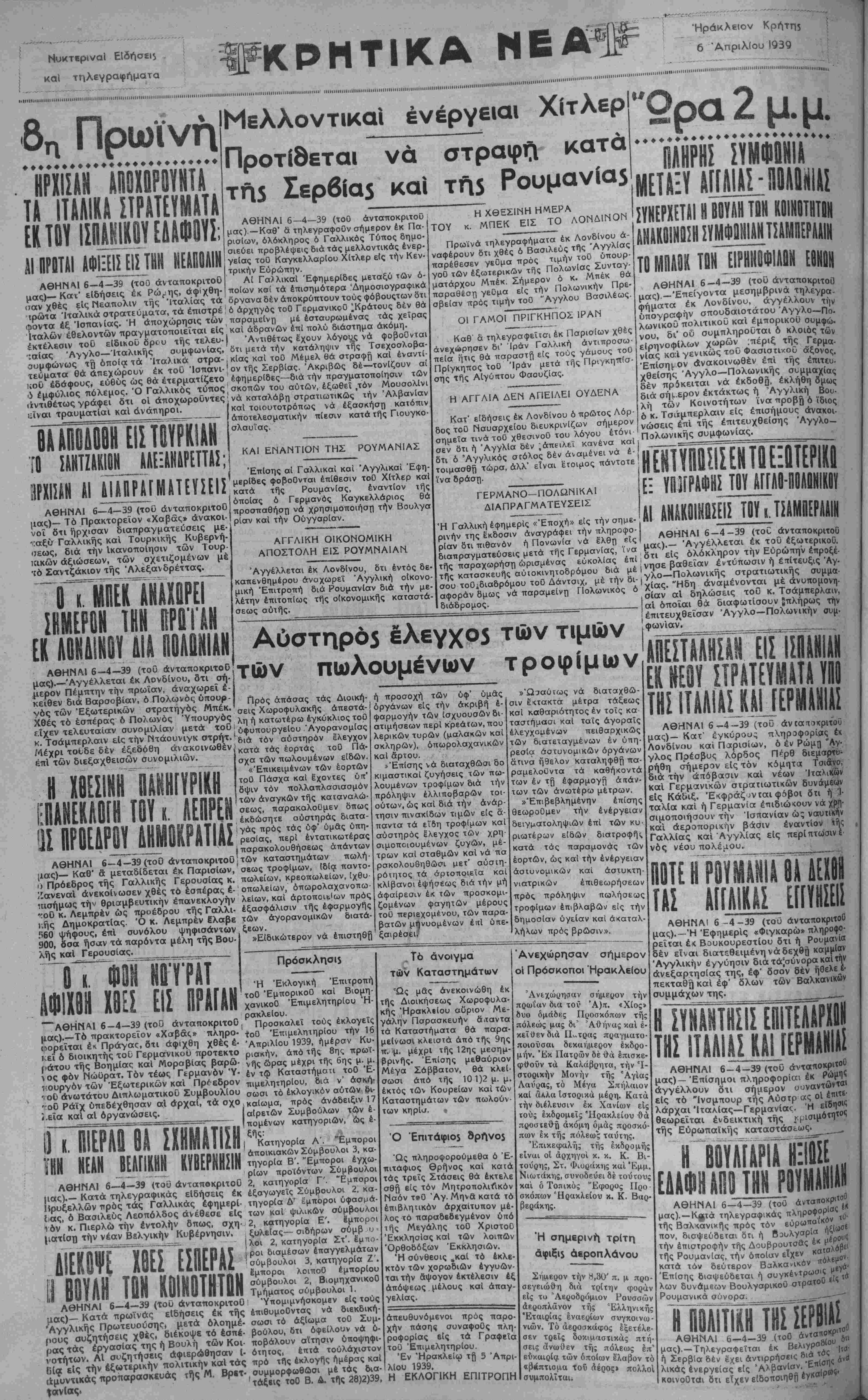 και άεροπορικήν βάσιν εναντίον <ής Γαλλίας και Αγγλίας είς περίπτωσιν!· νός νέου πολέμου. Ε ίΡ8ϊΐί1ί¥1β» ΤΑ Α ίΑΙΚΑΙ ΕΠΥ»!ί ΑΘΗΝΑ! 6-4-39 (του άνταποκριτοΟ μας).—Ή Έφημερ'ις «Φιγκαρώ» πληροφο¬ ρείται έκ Βουκουρεστίου δτι ή Ρουμανία δέν είναι διατεθειμένη νάδεχθη καμμίαν Άγγλικήν έγγΟησιν διατά^σύνορακαΐτίΐν ανεξαρτησίας της, έψ" δσον δέν ήθελε ί· πεκταθ^κα^ έφ' δλων τών Βαλκανικών συμμάχων της. Η ΙΥΚΑΝ ΤΗ ΙΤΑΑ ΗΣΙΣ ΕΠ ΑΠΑ! ΜΑΝΙΑΣ ΑΘΗΝΑ! 6—4—39 (του άνταποκριτοΟ μας)— Επίσημοι πληροφορίαι έκ Ρώμηί άγγέλλουν οτι σήμερον ουναντώνίο" είς τ6 "Ινσμπουρ τής Αύστρ ας οΐ επιτε· ΙΜΓί Ή ειδηο"! ς Ινσμπουρ τής Αύστρ ας λάρχαι'ΙχαΜας—Γδρμανίας. Ή ειδηο"! θεωρείται ενδεικτική τής ϊ ρίσιμότη"1» τής Ευρωπαϊκής καταστάσεως. Η Β1 ΕΑΑΦΗΑ ΥΑΓΑΡ1Α 1) ΤΗΝ ΡΙ '-ΆΙ Υ ΑΘΗΝΑΙ 6—4—39 (τοό άνταποκρι™0 ^ τηλεγραφικός πληροφορίας " τής Βαλκανικής προς τόν ευρωπαϊκών τ πον, διαψεύδεται δη ή Βουλγαρία ής'ωσ τήν έπιστροφήν τής Δουβρουτσδς έκ μέρο ·. τής Ρουμανίας, τήν οποίαν εΐχεν κσίσλβρ κατά τόν δεύτερον Βαλκανικόν πόλεμο ■ Επίσης διαψεύδεται ή συγκένΐρωσις μ6^ λων δυνάμεων Βουλγάρικου στρατοΟ «'ί Ρουμανικά σύνορα. Η ΠΟΛΙΤΙΚΗ ΤΗΣ ΑΘΗΝΑΙ 6—4-39 (του δη μας).—Τηλεγραφεΐται έκ Βελιγραδίου Σερβία δέν έχει αντιρρήσεις δι* τ"ς Ιν£) ικάς ενεργείας ε(ς 'Αλβανίσν. Έι»ΙβΠ« κοινοΟται δτι εΐχεν είδοποιηθπ έγκσΐρ»1··