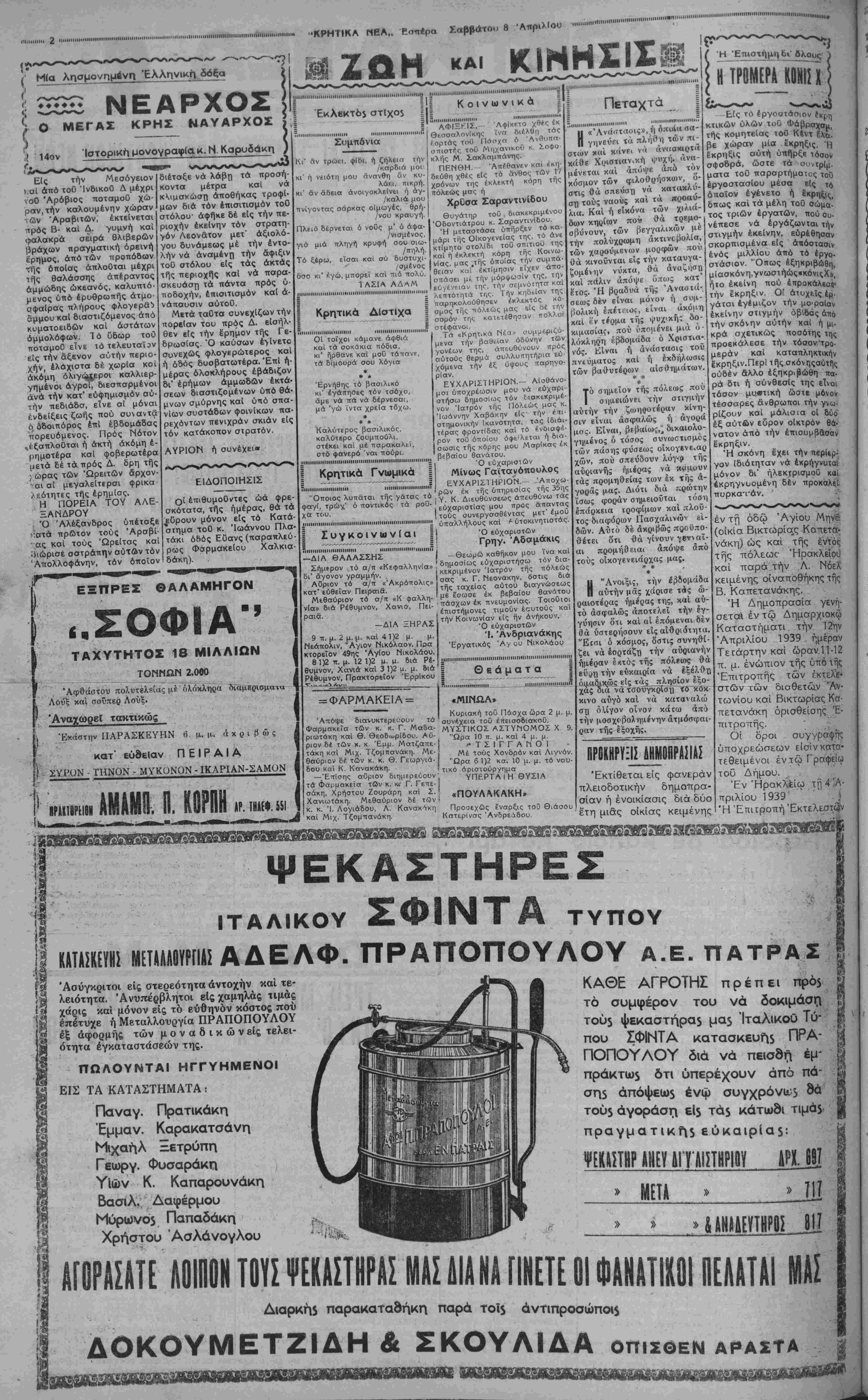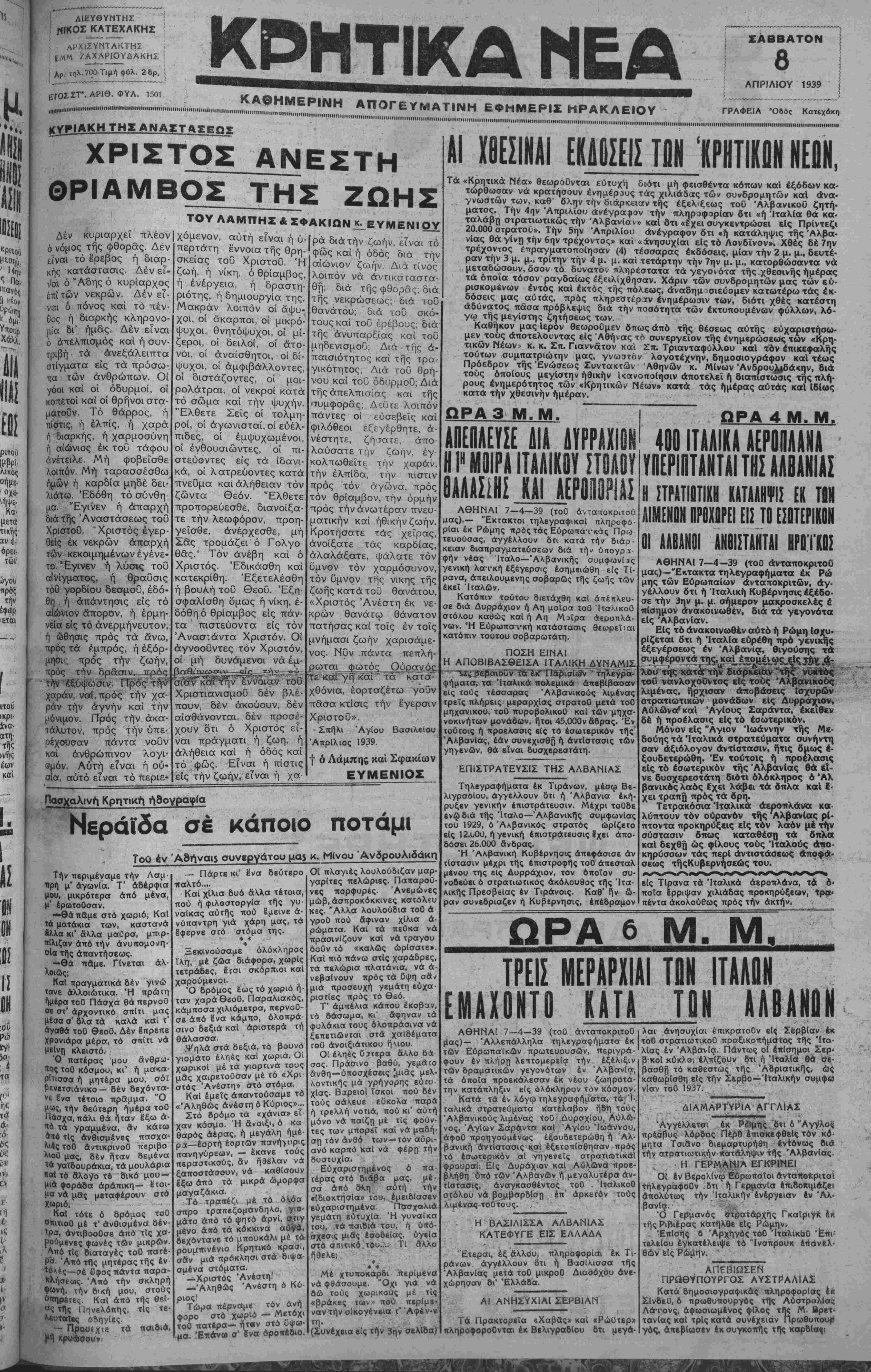 ΰπό μάλης κ«ι ή μουσική π>ϊ< Δήμον. Τήν περιφοράν παρηκολοΰθη σεν δ Δήμαρχος κ.Γεωργιάδης, δ Διοικητής τοΰ .Συντάγματος, δ Διοικητής,,ΧωροφυλακτΙς καί χιλιάδες κόσμου. —Επίσης ή πβριφορά τοΰ Ιπιταφίβυ ,τοϋ Αγίου Τίτου έγίνετο διά τής πλατείας Καλ- λβργών, πλατείας Νικηφόρου Φωκά, όδοϋ 1866, πλατείας Τριών Καμάρων, Λεωφόρου Κουντουριώτου, τβ συνοδεία Ναυτοπ^οσκόπων, (·μ<ίδων Φαλ λαγγιτών και Φαλαγγιτισσών, Όδηγών και στρα τοΰ, χορωδί¬ ας έκ καλλιφώνων νέων και πολλού κόσμου. Έπίση; τήν περιφορά ν τών επιταφίων τοΰ Αγίου Δημητρίον, τής Αγίας Παρασκευής καίΆγίου Ματθοί ου, παρηκολοΰθησαν κόσμου. Άξιέπαινο$ δωρεά Οί έν ΠειραιεΙ έμποροι Α¬ δελφοί Μπσρκή εύχαριστοΟν- τες τηλεγραφικώς τόν Νο· μάρχην Ηρακλείου κ. Ανδρ. Μάρκελλον και τόν Δήμαρ¬ χο ν κ. Μηνά Γεωργιάδη διό τήν παρασχεθεΐσαν είς τους Ίσραηλίτας έπιβάτας τοΟ «ΝομικοΟ» άμέριστον ένίσχυ σίν των κατά τήν προχθεσι- νήν διέλευοίν των έκ τοΟ λι μένος μας,Ιθεσαν είς τήν διά θεσιν τοΟ κ. Δημάρχου μέσω τοΟ ένταΟθα Οίκου Αδελφών Χάλαρη δραχμάς 10.000 δ πως διατεθώσι κατά βού- λησιν υπέρ τών πτωχών τής πόλεως μας κατά τάς Αγίας ημέρας τοΟ Πάσχα. Ό κ. Δήμαρχος ηύχαρίστησεν θερ¬ μώς τους ανωτέρω δωρη- τάς. ΔωρεαΙ Ό κ. Νικόλαος Χατζηκώστας καοέθεσεν είς τά Γραφεία μας δραχ. 1000 έξ ών δραχ. 500 διά τόν Μορφωτικόν Σύλλογον Άρχανών ,καί δραχ. 500 διά τόν Σύλλογον Δεσποινίδων τής Ιδίας Κω- μοπόλεως ε!ς μνήμην τοΟ αποβιώσαντος Μ. Λυδάκη. 0Ρ« 3Η Μ. Μ. 01 ΙΤΛΑΟΙ ΑΓΓΕΑΑΟΥΗ 011 ΚΑΤΕΑΑΒΟΗ II ΤΙΡΑΝΑ «Ι 1»» Β. Μ. ΑΘΗΝΑ! 8-4-39 (τοΟ άνταποκριτοΟ μας)— Μετε- δόθη περί τήν Ιην μ. μ. σή¬ μερον τηλεγραφικώς έκ Ρώ¬ μης, δτι τήν 9ην πρωννήν σήμερον τά ΊταΚικά στρα¬ τεύματα κατέλαβαν τήν Άλ- βανικήν Πρωτεύουσαν Τίρα¬ να. "Η άντίοτασις τών Άλ* βανών είς τους προελαύνον- τας Ιταλούς συνεχίζεται με¬ τά πείσματος, 2 μ μ. ♦♦♦♦♦♦ μ ♦♦♦♦♦♦♦♦♦♦♦♦♦♦♦♦♦♦♦♦♦♦*4 ΤΟ ΑΥΝΑΜΕΟΝ _Τ| ΛΟΝ Τ Ι» ΕΗ3ΠΛ0Η ' "141 " λ ο ._______ ΑΘΗΝΑΙ 8—4—39 (του άνταποκριτοΟ μας),_·Αλλεπάλληλα τηλεγραφήματα έκ τών Ευρωπαϊκών πρωτευουσών εξαίρουν μέ τά ζωηρότερα χρώματα τήν γενναίο. τητα κ«1 τήν αύτοθυσίαν τοΟ ΆλβανικοΟ λαοί:, αεθ' ών υπεραμύνεται της άν^ξαρ. τησίας καί τής άκεραιότητος της χώρας του και τών ελευθεριών του. Άν καί οΐ •Ιταλοί διά τήν κατάληψιν τής Αλβανίας γρησιμοποιοΟν 179 πολεμικά, 400 αερο. πλάνα, 200 τάνκς καί 60.000 στρατοΡ, £ν τούτοις δέν ήδυνήθησαν μέχρι τοι δε νά προελάσουν βίς την ένδοχώραν τής Άλ. βανίας είς βάθος μεγαλύτερον τών 3-5 χιλιομέτρων. ΕΙς Λυρράχιον προεβλήθη λυσσώδης άντίστασις. Έπτάκις άπεκρούσθησαν αϊ άπόπειραι άποβά^εως καί μόνον τΐν όγδόην μετά τεσσάρας βομβαρδισμούς διά τών πολεμικών καί δύο τής αεροπο¬ ρίας επετεύχθη ή κατάληψις τής πόλίΜς, ΟΊ "Αλβανοί συνεχίζουν μέ άναπτερωμε. νον ηθικόν τόν αγώνα, δισμφισβηταΐϊν- τες τό Ήάτριον εδοφος σπιθαμήν πρδς σπιθαμήν. 01 "Αγιοι Σαράντα κατέστρω¬ σαν τελείως ύπό τοϋ Ιταλικού στόλουλό· γω τής προβληθείσης εξαιρετικής αντι¬ στάσεως ύπό τών Αλβανών. . ΣΪΗΕΧΙΙΗ ΑΝΤΙΠΑΙ1Ι ίΙΙΒίΙΙί ΚΡΙΙΙΙΜ1 ΑΘΗΝΑΙ 8—4—39 του άνταποκριτοΟ μας).— Τό τιρακτορεΐον «Στεφάνι» άνσ- κοινοί δτι ό Αλβανός Βασιλεύς Ζώγου μετά τής Κυβερνήσεως άνεχώρησεδιά τό έοωτερικόν. Ή έδρα τής Κυβερνή¬ σεως μετεφέρθη έκ Τιράνων εΐςΈλβα- σάν. Τά αρχεία και τά πολύτιμα κειμή¬ λια μειεφέρθησαν αύτοκινητιστικώί. Προ τής αναχωρήσεως €κ Τιράνων όΒσσιλεός Ζώγου διέταξε τήν άποφυλάκισιν 6λ»? τών κρατουμένων καί τόν έξοπλισμδ$ των ϊνα αγωνισθούν κατά τών Ιταλών. "Ηδ