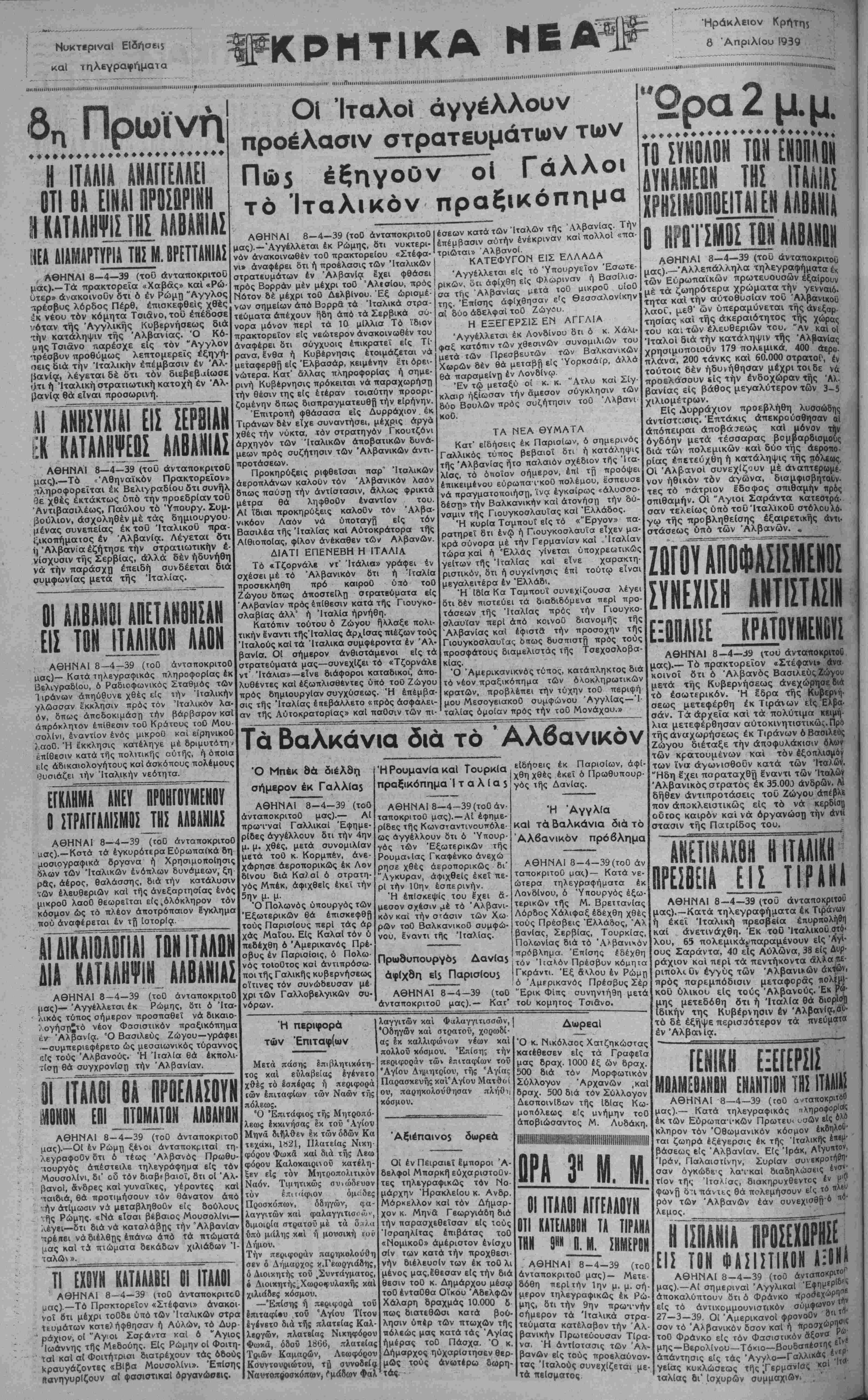 ϋ 11 ■ ■ ■ · 11 ί 111 · > 1111111 < 1.11 ■ < < 111 >.....1111111ΜΙ ί < 111.....ϋ 111 ϊ ■ ί ί Ι«ϋ βπ Πρωϊνη ♦♦♦♦♦♦♦♦♦♦♦♦♦♦♦♦♦♦♦♦♦♦♦♦♦ ΑΕΙ ΡΙΝΗ ΑΝΙΑΣ Η ΙΤΑΛΙΑ ΑΗΑΓΓΕ ΟΤΙ ΒΑ ΕΙΝΑΙ ΠΡΟΣΙ ΙΙΗΜΜΙΠΗΙ ίΙΕΑ ΑΙΑΗΙΑΡΤΥΡΙΑ ΤΗΣ Μ. 8ΡΕΤΤΑΗΙΑΪ , ΑΘΗΝΑΙ 8—4—39 (χοΟ ανταποκριτού μας).—Τά πρακτορεία «Χαβάς» και «Ρώ· Οτερ» άνακοινοΟν δτι 6 έν Ρώμη "Αγγλος ^ρέσβυς λόρδος Πέρθ, επισκεφθείς χθες £κ νέου τον κόμητα Τσιάνο, του έτιέδοσε νόταν τής Αγγλικής Κυβερνήσεως διά τήν κατάληψιν της Αλβανίας. Ό Κό- αηςΤσιανο παρέσχε εις τόν "Αγγλον 'τρέσβυν προθύμως λεπτομερείς έξηγή· οεις διά την Ίταλικήν έπέμβασιν έν Αλ¬ βανία, λέγεται δέ δτι τόν διεβεβα(ωσε ι]τι ή Ιταλική στρατιωτική κατοχή έν Αλ¬ βανία θά είναι προσωρινή. ΗΙΠΙΙΙ ΕΚ ΚΑΤΑΛΗΨ ΕΚ ΙΕΡΒΙΑΝ [ΟΙ ΑΑΒΑΜΙΑΣ ΑΘΗΝΑΙ 8—4—39 (του ανταποκριτού μας).—Το «Άθηναϊκόν Πρακτορεΐον» πληροφορείται έκ Βελιγραδίου δτι συνήλ Οε χθες εκτάκτως ύπδ την προεδρίαν του Άντιβασιλέως, Παύλου τδ Ύπουργ. Συμ- βουλιον, άσχοληθένμέ τάς δημιουργού μένας συνεπείας έκ του ΊταλικοΟ πρα¬ ξικοπήματος έν Αλβανία. Λέγεται δτι ή "Αλβανία έζήτησε τήν στραιιωτικήν έ- νίσχυσιν της Σερβίας, άλλα δέν ήδυνήθη νά τήν παράσχυ επειδή συνδέεται διά συμφωνίας μετά της Ιταλίας. 01 Αλ ΕΙΠ ΑΝ! Ν Ι ΑΠΕΤΑΝΟΗΙΑΝ ΤλλΙΚΟΝ ΛΑΟΝ ΑΘΗΝΑΙ 8—4—39 (όΟ άνταποκριτοΟ μας)— Κατά τηλεγραφικός πληροφορίας έκ Βελιγραδίου, ό Ραδιοφωνικός Σταθμός των Τιράνων απηύθυνε χθες εις τήν Ίταλικήν γλώσσαν ίίκκλησιν προς τόν Ίταλικόν λα¬ όν, δπως άποδοκιμάση τήν βάρβαρον κσΐ άπρόκλητον έπίθεσιν τοΟ Κράτους γοΟ Μου¬ σολίνι, εναντίον ενός μικροΟ και ειρηνικού ί.αοΟ. Ή έκκλησις κατέληγε μέ δριμύτατη ι κπίθεσιν κατά τί|ς πολιτικές ούτής, ή όποια ι:[ς αδικαιολόγητους κσΐ άσκοπους πολέμους θυσιάζει τήν Ίταλικήν νεότητα. ΕΓΚΛΗΜΑ ΑΗΕΥ 0 ΣΤΡΑΓΓΑΛΙΣΜΟΣ ΤΗΣ ΑΑΒΑΗΙΑ2 ΑΘΗΝΑΙ 8—4—39 (γοΟ άνταποκριτοΟ • αας).—Κατά τά εγκυρότερα Εύρωπαίκά δη μοσιογραφικά όργανα ή Χρησιμοποίησες όλων των Ιταλικών ενόπλων δυνάμεων, ξη ρας, αέρος, θαλάσσης, διά τήν κατάλυσιν *;ων ελευθεριών καΙ τής ανεξαρτησίας ενός μικροΟ λαοΟ θεωρείται είς 4όλόκληρον τόν κόσμον ώς τό πλέον άποτρόπαιον Ιγκλημα πού αναφέρεται έν τη" Ιστορία. Α Α ΔΙΚΑΙΟΛΟΓΙΑ ΚΑΤΑΑΗΨ Α ι Ν ΤΟΝ ΑΛΟΗ ΑΝΙΑ! ΑΘΗΝΑΙ 8—4—39 (τοΟ άνταποκριτοΟ μας)— Άγγέλλεται έκ Ρώμης, δτι ό Ιτα¬ λικός τύπος σήμερον προσπαθεί νά δικαιο- λογήστ)£τό νέον Φασιστικόν πραξικόπημα ι·ν Αλβανία. Ό Βασιλεύς Ζώγου—γράφει —συμπεριεφέρετο ώς μεσαιωνικός τύραννος »*.ίς τους Αλβανούς. Ή Ιταλία θά έκπολι- -£ση θά συγχρονίση τήν Άλβανίαν. Μ0Κ0Ν ΕΠΙ ΠΤΟΜΑΤΟΗ ΑΛΒΑΚΟΗ ΑΘΗΝΑΙ 8—4—39 (τοΟ άνταποκριτοΟ μας).—01 έν Ρώμη ξένοι άνταποκριταί τη· λεγραφοΟν οτι 6 τέως Αλβανός Πρωθυ- Ίουργός απέστειλε τηλεγράφημα είς τόν Μουσολίνι, δι' οδ τόν διαβίβαιοΐ, δτι οί "Αλ¬ βανοί, άνδρες καΙ γυναίκες, γέροντες καΙ ιαιδιά, θά προτιμήσουν τόν θάνατον άπό • ήν άτίμωσιν νά μεταβληθούν εις δούλους Λ.ής Ρώμης. «Νά εΤσαι βέβαιος Μουσολίνι— λέγει—δτι διά νά καταλάβης τήν Άλβανίαν τιρέκει νά διέλθης επάνω άπό τά πτώματα μας κσΐ τά πιώματα δεκάδων χιλιάδων "Ι¬ ταλών »._____________________________ ΤΙ ΕΧΟΥΝ ΚΑΤΑΑλΒΕΙ 01 ΙΤΑΛΟΙ ΑΘΗΝΑΙ 8—4—39 (τοΟ άνταποκριτοΟ υας).—Τό Πρακτορεΐον «Στεφάνι» άνακοι- νοΐ δτι μέχρι τοΟδε ύπό τών Ιταλικών στρα ΐευμάτων κατελήφθησαν ή Αυλών, τό Δυρ- ' ράχιον, οΐ "Αγιοι Σσςάντα καΙ ό "Αγιος Ιωάννης τής Μεδούης. ΕΙς Ρώμην οί Φοιτη- ταί καΙ αί Φοιτήτρισι διατρέχουν τάς οδούς κρσυγσζοντες «ΒΙβα Μουσολίνι». Επίσης πανηγυρίζουν αϊ φασιστικά! όργανώ
