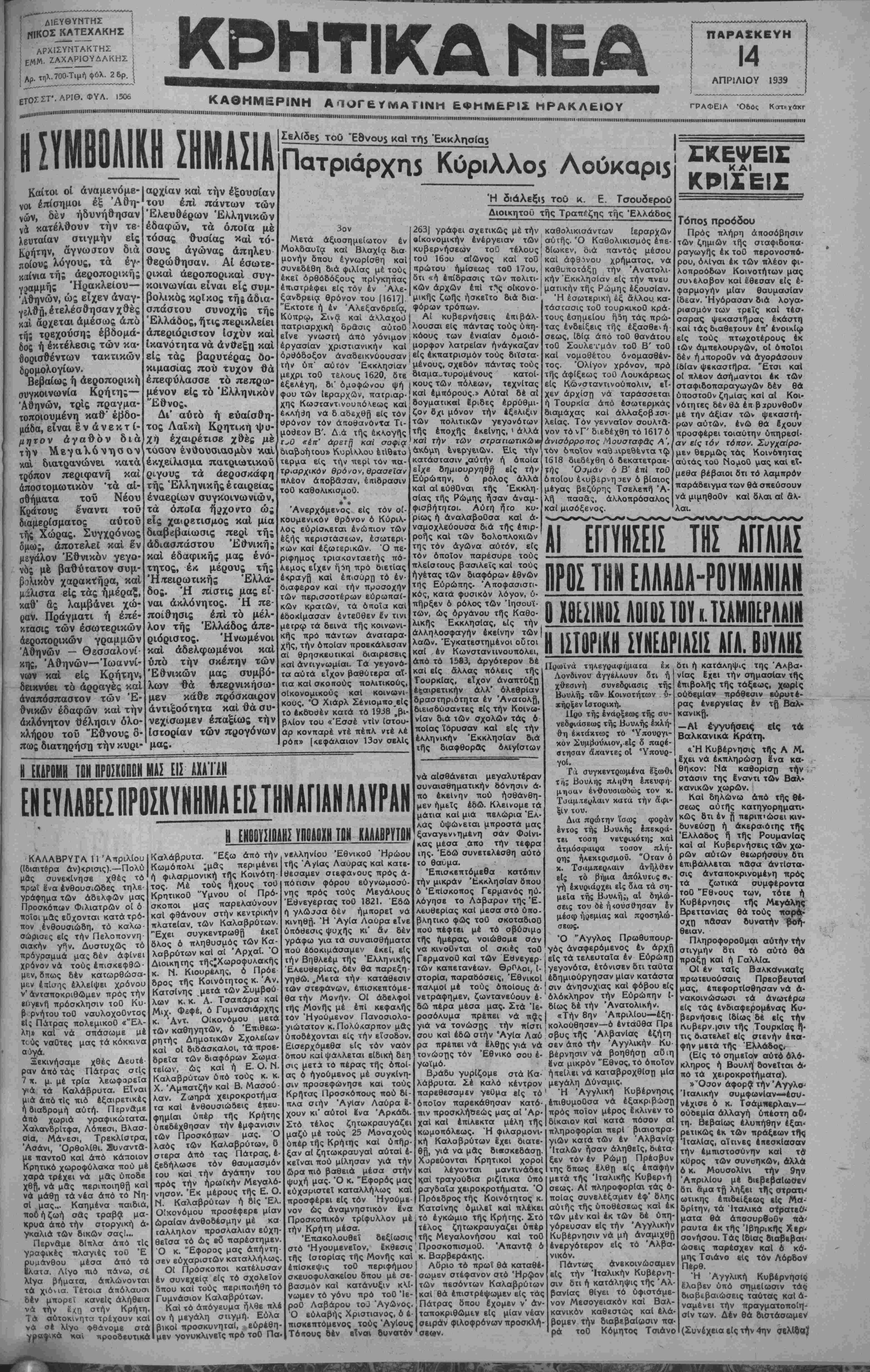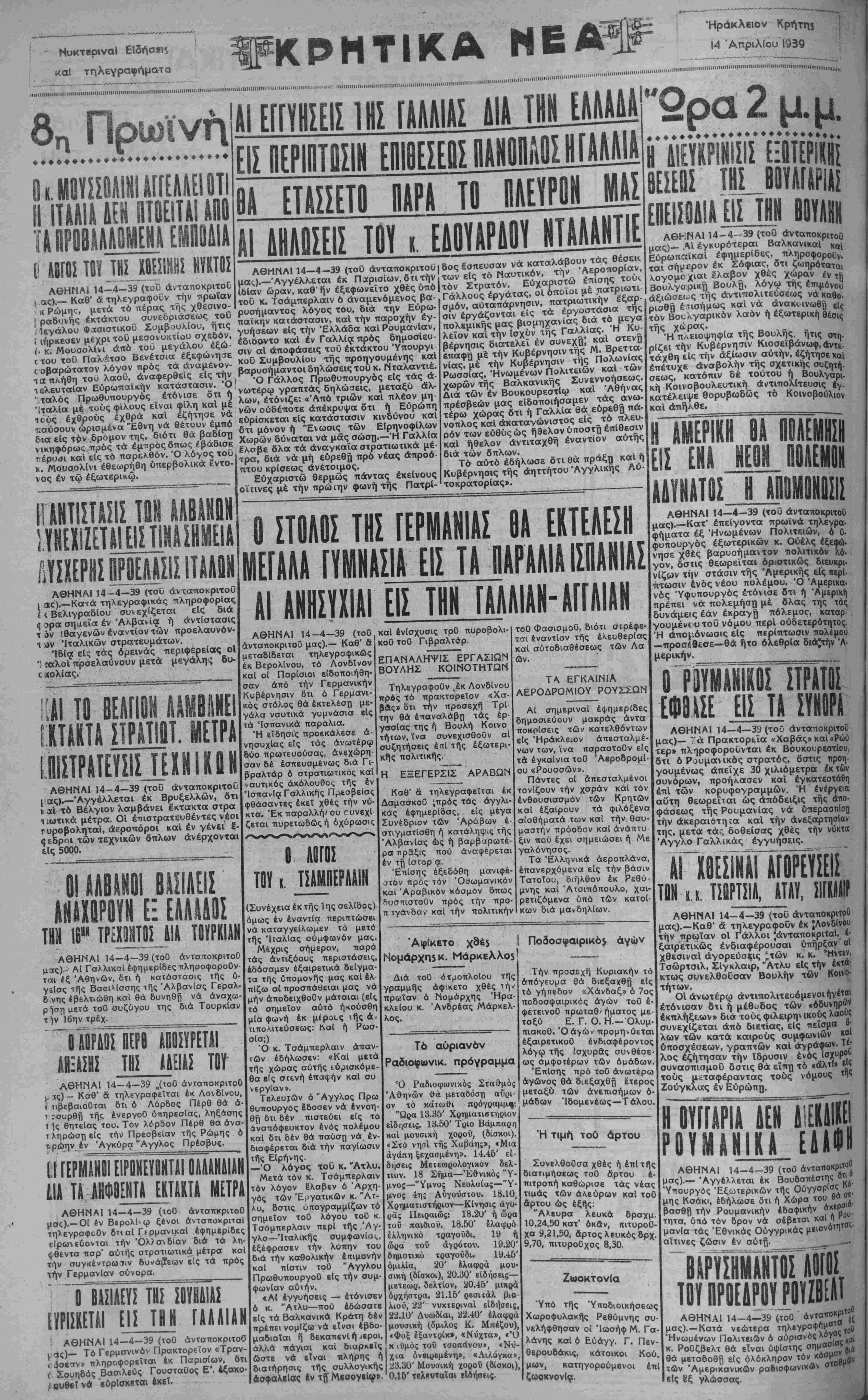 ΑΘΗΝΑΙ 14—4—39 (τοΰ άνταποκριτοΟ