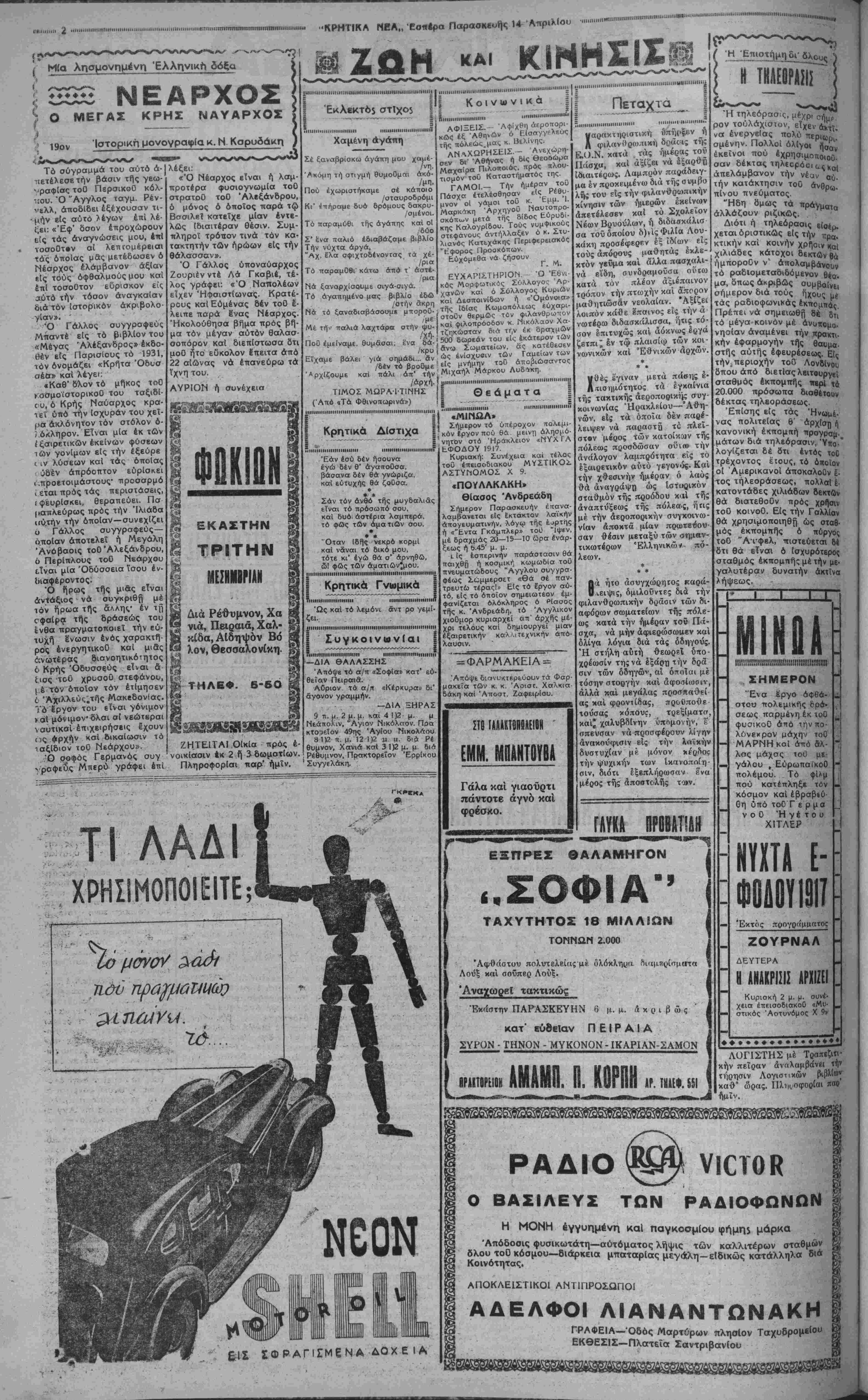 Διά τοΟ <5τμοπλοίου τής γραμμής όφικετο χθες ιήν πρωΐαν ό Νομάρχης Ηρα¬ κλείου κ. Ανδρέας Μάρκελ¬ λος. Τό αύριανόν Ραδιοφωνικ. πρόγραμμα Ό Ραδιοφωνικός Σταθμός Αθηνών θά μετάδοση αϊίρι- ον τό κάτωθι ποόγ^αμμφ "Ωρα ΙΒ.Βδ' Χρηματιοτηριον είδιισεις. 1ϋ.50' Τρίο Βάμπαρη καί μουσική χοροϋ, (δίσκοι). Στο νησί τής Χαβάης», «Μια αγάπη ξεχασμένη». 14.45' ει¬ δήσεις Μειεωρολογικον δελ- τιον. 18 Σήμα—Εθνικός "Ύ¬ μνος—"Υμνος Νεολαίας—"Υ¬ μνος 4ης Αύγουστου. 18.10, Χρηματιστήριον—Κίνησις αγο¬ ράς Πειραιώς: 18.2υ' ή ωρα τοΰ παιόιοΰ. 18.50' ελαφρό ελληνικό τραγούδι. 19 ή ώρα τοΰ άγρότου. 19.20" δημοτικό τραγούδι. 19.45' ομιλία, 20' ελαφρά μου¬ σική (δίσκοι), 20.30' ειδήσεις— μετεωρ. δελτίον, 20.45' μικρά ορχήστρα, 21.16' ρβσιιάλ βιο¬ λιού, 22' νυκτερινοί εΙδήσεις, 22.10' Δυωδίαι, 22.40' ελαφρά μουσική (δμιλος Κ. Μπέζου), «Φοξ έξαντρίκ», «Νΰχτα», «Ό κιϋμόςτοΰ τσοπάνου», «Νύ¬ χια δνβιρεμίνη», «Λιλόγκα», 23.30' Μουσική χοροΰ (δίσκοι), 0.15' τβλβνταϊαι βίδήσΐις. Ποδοσφαιρικός άγων Τήν προσεχή Κυριακήν τό απόγευμα Θά διεξαχθβ είς τό γήπεδον «Χάνδαξ» ό 7ος ποδοσφαιρικός άγων τοΟ έ- φετεινοΟ πρωταθ/ήματος με¬ ταξύ Ε. Γ. Ο. Η.-Όλυμ- πιακοΟ. Ό άγω»» προμηνύεται έξαιρετικοΟ ενδιαφέροντος λόγφ τής ίσχυράς συνθέσε¬ ως αμφοτέρων των ομάδων. Επίσης πρό τοΟ ανωτέρω αγώνος θά διεξαχθη δτερος μεταξύ τών ανεπισήμων ο¬ μάδων Ιδομενέως—Τ άλου. Ή τιμή τού άρτου ΣυνελθοΟσα χθες ήέπΐτής διατιμήσεως τοΟ άρτου ε¬ πιτροπή καθώρισε τάς νέας τιμάς τών αλεύρων καί τοΟ άρτου ώς εξής: "Αλευρα λευκά δραχμ. 10,24,50 κατ1 όκαν, ΛίτυροΟ- χα 9,21,50, δρτος λευκός δρχ. 9,70, πιτυροΟχος 8,30. ΖωοκτονΙα "Υπό τής 'Υποδιοικήσεως Χωροφυλακής Ρεθύμνης συ¬ νελήφθησαν οί Ιωσήφ Μ. Γα¬ λάνης και ό Εύάγγ. Γ. Πεν- θερουδάκις, κάτοικοι Κού. μων, κατηγορούμενοι επί ζωοκνονία. ρισ τόν ίίξιώσεως της «ντιεσεως νά καθο. ιισθα έ.ησήμως καί νά άνακιινωθϊί ει<. :όν Βουλγαρικόν λαόν ή εξωτερική θέσις τής χώρας. Ή «Αειοψηφία τής Βουλής, ήτις οτη. ρίζει τήν Κυβέρνησιν Κιοσεϊβάνωφ, άντε. τάχθη ιΐς τήν άξίωσιν αυτήν, έζήτησε και επέτυχε ώναβολήν τής σχετικής συζητή. σβως, κατόπιν δέ τούτου ή Βουλγαρι. κή Κοινοβουλευτική άντιπολίτευσις εγ¬ κατέλειψε θορυβωδώς τό Κοινοβούλιον καΐ απήλθε ΗΤΜΕπΚΗ ί1 ΕΝΑ ΑΔΥΗΑΤΟΣ ΠΘΑΕΜΗ ΠΟΛΕΜ Η ΑΘΗΝΑΙ 14—4—39 (τοΟ ΛνταποκριτοΟ μας).—Κατ* επείγοντα πρωινά τηλεγρα- φήματα έξ Ηνωμένων Πολιτειών, ό 0. φυπουργός εξωτερικών κ. Ουέλς έξεφώ- νησε χθες βαρυοήμαντον πολιτικόν λό· γον, όσιις θεωρείται οριστικώς διεοκρι. νίζων ττ|ν στάσιν τής Αμερικής είς περί- πτωσιν ενός νέου πολέμου. Ό Άμερικο. νός Υφυπουργός έτόνισε δτι ή Αμερική πρέπει νά πολεμήσΐ} μέ δλας της τάς δυνάμεις έάν έκραγή πόλεμοο, καταρ¬ γουμένου τοΰ νόμου περί ούδετερότητος. Ή άπομόνωσις είς περίπτωσιν πολέμου —προσέθεσε—>θά ήτο όλεθρία διά^τήν Ά-