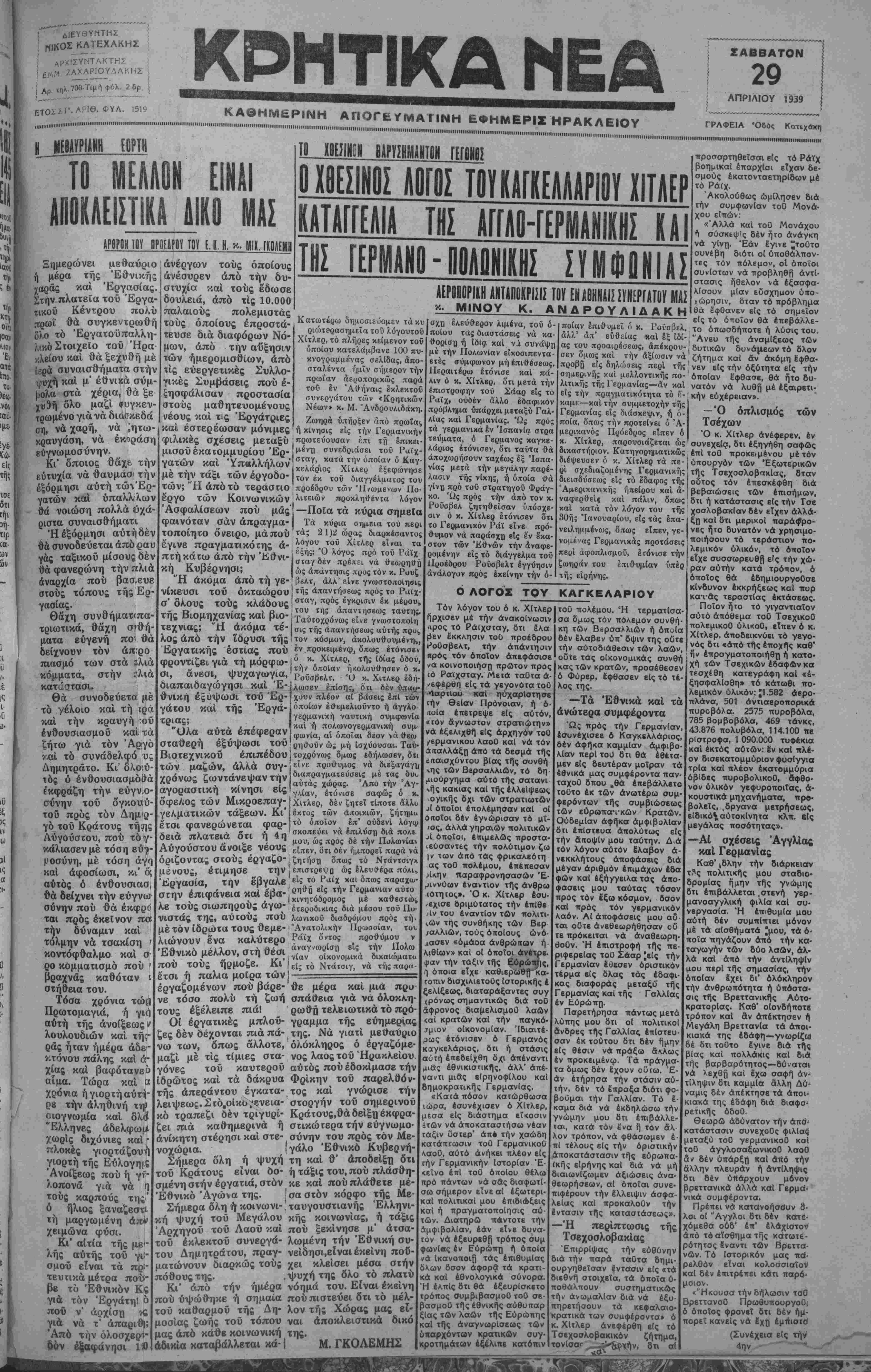 ΑΘΗΝΑΙ 29—4—39 (τοΟ άνταποκριτοΟ