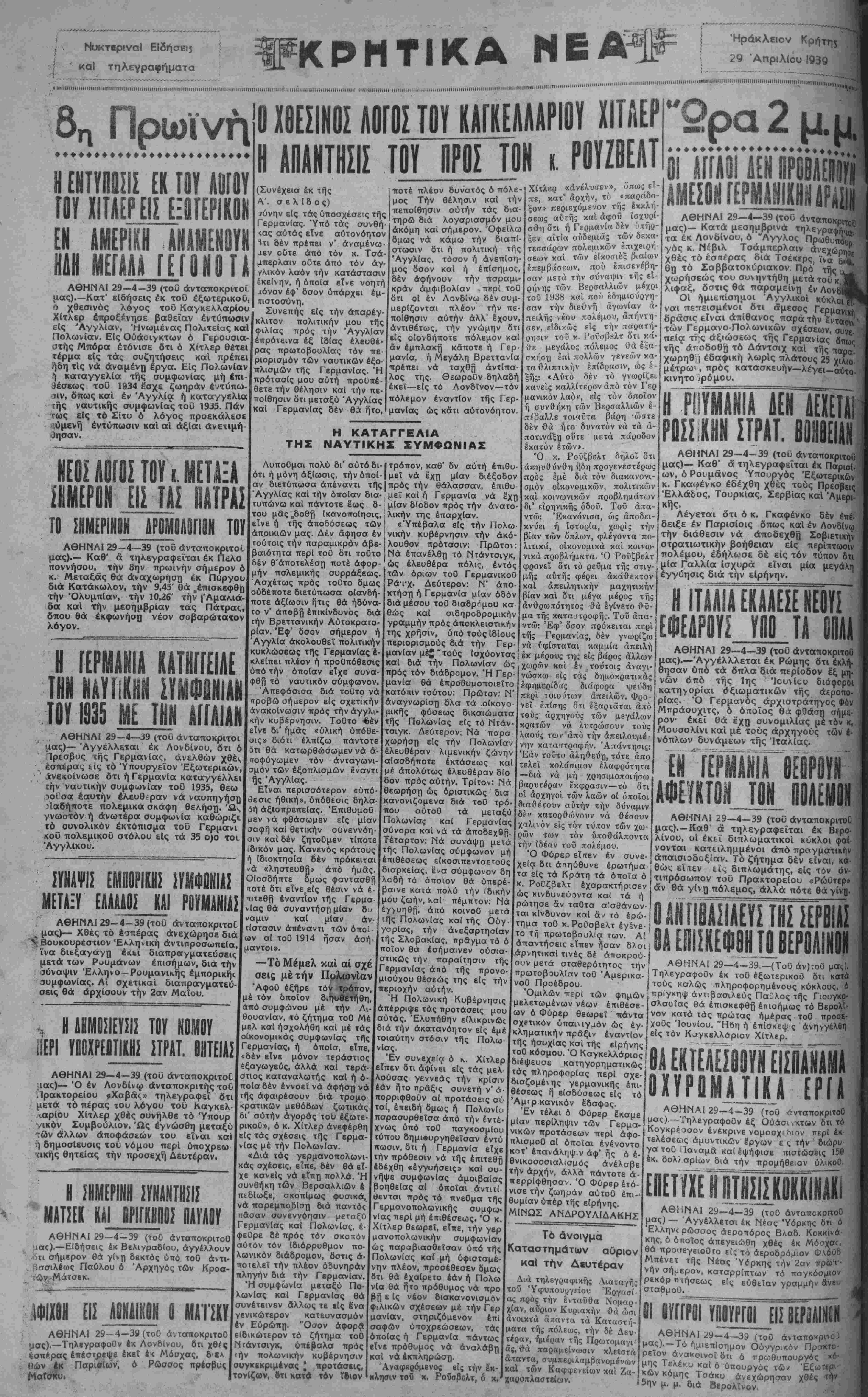 ΑΘΗΝΑΙ 29—4—39 (του άνταποκριτοΟ