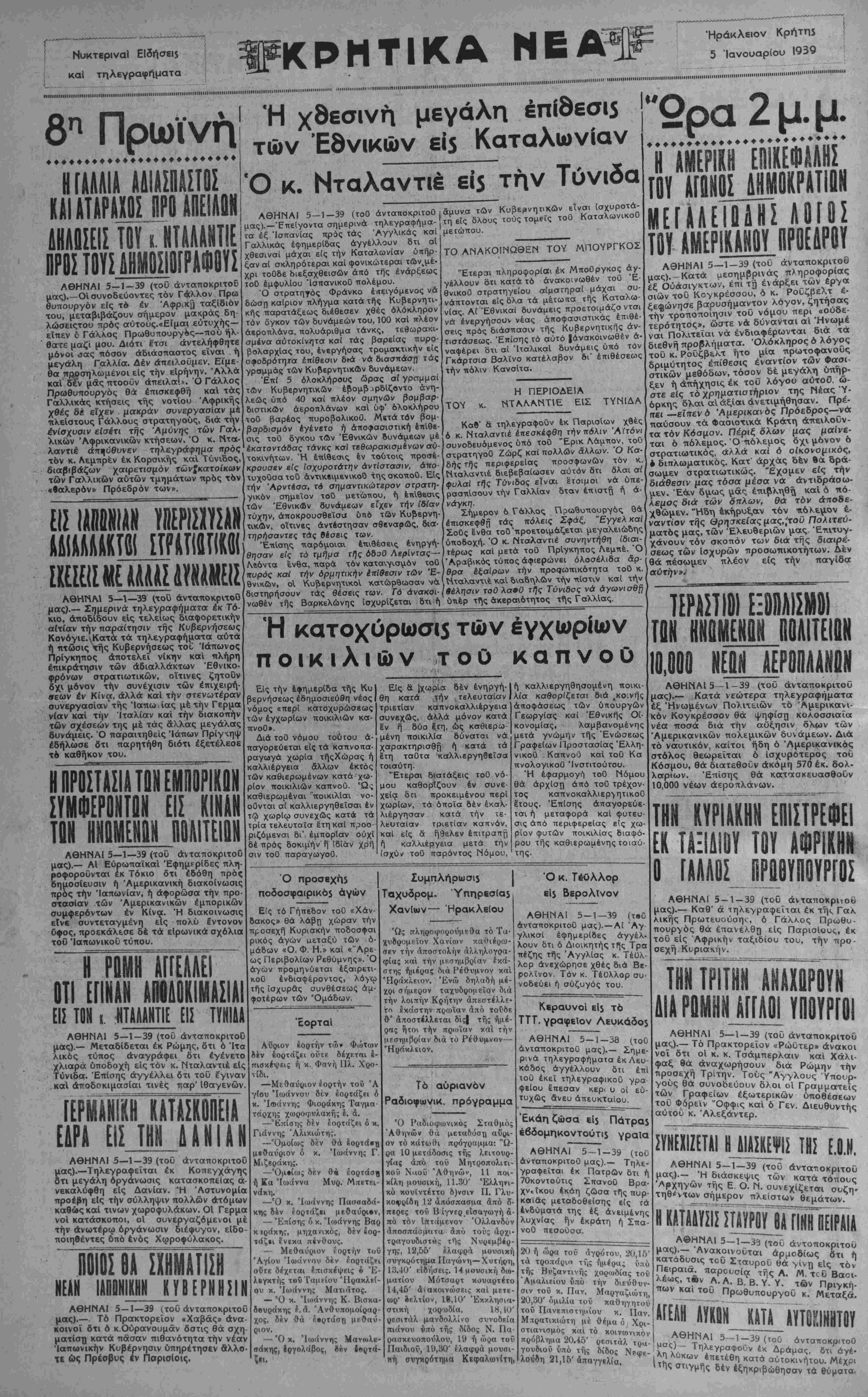 κβιας μεταδοθείσης είς <ά ενδύματα της έξ άνειμενης λυχνίας ήν έκράτη ή Σπα¬ νοΟ πεσουσα. 20 ή ώρα τοΰ αγρό του, 20,1 β' τά τροπάριο τίις ήμερα; «πό τής Βυζαντινής χορωδίας τοΰ Αμαλιείον ν.τό τήν οιενθνν- , μιλία του καθηγητού τοΰ Πανεπιστημίου κ. Παν Μτρατικιώτη μέ θέμα ό Χρι¬ στιανισμός καί τό κοινωνικό ν πρόβλημα 2Ο.4ό' ρεσιτάλ τρα γουδιού ύπό τής δίδος Ν λουδη 21,16' δπαγγ«λία, "2ρα 2 μ. μ. ♦♦♦♦♦♦♦♦♦♦♦♦♦♦♦♦♦♦♦♦♦♦♦* Η ΑΜΕΡΙΚΗ ΕΙΜΜΚ ΤΟΥ ΜΕΓΑΑΕΙ04ΗΣΑΟΓ.ΟΣ ΤΟΥ ΑΜΕΡΙΚΑΝΟΥ ΠΡΟ ΑΘΗΝΑΙ 5—1-39 (του ανταποκριτού αας).-Κατά μεσημβρινός πληροφορίας έΕ Ούάσιγκτων, έπι τϊ| ένάρξει των έργα σιών τοΰ Κογκρέσσου, 6 κ. ΡοΟζβελτ ε- ξεφώνησε βαρυσήμαντον λόγον, ζητήσας ιήν τροποποιηαιν του νόμου περί «ουδε- τερότητ°ζ*' ωστε να δύνανται αϊ Ήνωμέ ναι Πολιτεΐαι νά ένδιαφέρωνται διά τα διεθνή προβλήματα. Ολόκληρος ό λόγος τοϋ κ. Ρούζβελτ ήτο μία πρωτοφανούς δριμύτητας έπίθεσις εναντίον τών Φασι¬ στικών μεθόδων, τόσον δέ μεγάλη ύπήρ- ξεν ή άπήχησις έκ τοϋ λόγου αύτοΟ. ώ¬ στε είς τό χρηματιστήριο ν της Νέας Υ¬ όρκης δλαι αϊ άξίαι άνετιμηθησαν. Πρέ- πει —εϊττεν ό Αμερικανός Πρόεδρος—νά παύσουν τά Φασιστικά Κράτη άπειλοΰν- τα τόν Κόσμον. Πέριξ δλων μας μαίνε¬ ται ό πόλεμος. Ό πόλεμος δχι μόνον 6 στρατιωτικός, αλλά και ό οικονομικός, * διπλωματικός. Κατ" αρχάς δέν βα δρά- σωμεν στραιιωτικώς. "Εχομεν είς τήν διάθεσιν μας τόσα μέσα νά άντιδράσω- μεν. Έά,ν διως ιάς έπι^ληθ^ καί ό «ό- λεμος διά τών Οπλων, θά τόν άηοΒε- χθώμεν. "Ηδη έκηρυί,αν τ6ν ιιόΚε^ον ε¬ ναντίον τής θρησκείας μας,,'τοϋ Πολιτεύ¬ ματος μας, τών Ελευθεριών μας "Επιτυγ¬ χάνουν τόν σκοπόν των δια τής διαιρέ¬ σεως τών ισχυρών προσωπικοτήτων. Λεν θά τιέσωμεν πλέον είς τήν παγίδα αυτήν»; ΤΕΡΑΣΤΙΟΙ ΕΙ ΤΟΝ 10,000 ΜΤΕΙϋΝ ΑΘΗΝΑΙ 5—1 -39 (τοϋ άνταποκριτοΟ μας).— Κατά νεώτερα τηλεγραφήματα έξ Ηνωμένων Πολιτειών τό Άμερικανι- κόν Κογκρέσσον θά ψηφίση κολοσσιαίο: νέα ποσά δια τήν αϋξησιν δλων τών Αμερικανικών πολεμικών δυνάμεων. Διά τό ναυτικόν, καίτοι ήδη ό Αμερικανικός στόλος θεωρείται 6 ισχυρότερος του Κόσμου, θά διατεθούν ακόμη 570 έκ. δολ- λαριων. Επίσης θά κατασκευασθούν 10,000 νέων αεροπλάνων. ΤΗΝ ΚΫΡΙΑΚΗΗ ίΙΤΡΕΦΕΙ ΕΚ Τ&ΙΙ1118Υ ΤΟΥ ΑΦΡΙΚΗ» 0 ΓΑΛΛΟΣ βΡΟΘΥΠΘΥΡΓΟΣ ΑΘΗΝΑΙ 5-1-39 (τοΰ ανταποκριτού μας).— Καθ" ά τηλεγραφεΐιαι έκ τή<. Γαλ λικής Πρωτευούσης, ό Γάλλος Πρωθυ¬ πουργός θά έπανέλθη είς Παρισίους, έκ του είς Άφρικήν ταξιδιού του, τήν προ¬ σεχή Κυριακήν. ΔΙΑ ΡΠΜΗΗ ΑΓΓΛΟΙ ΥΠΟΥΡΓΟΙ ΑΘΗΝΑΙ 5-1-39 (του ανταποκριτού ^!ν·— Το Πρακτορεϊυν «Ρώυτερ» άνακοι νοι δτι οΐ κ. κ. Τσάμπερλαιν και Χάλι¬ φαξ θά αναχωρήσουν δια Ρώμην τήν προσεχή Τριτην. Τους "Αγγλους Υπουρ¬ γούς θά συνοδεύουν δλοι οι Γραμματείς των Γραφείων εξωτερικών υποθέσεων του Φόρείν ·'Οφφις καί 6 Γεν. Διευθυντής αυτού κ. Αλεξάντερ. '^ ΣΥΝΕΧΙΖΕΤΑΙ Ι ΛΙίΙΡΙί ΤΚ Ε.Ο Η 8 ΙΜΪΤΪΐΙ ίΤΗΤΗρΓί ΠΕΙΡΑΙΑ «ω ηηι_ϋτΓιίτκιιιιτπ σαν τά θύματα.