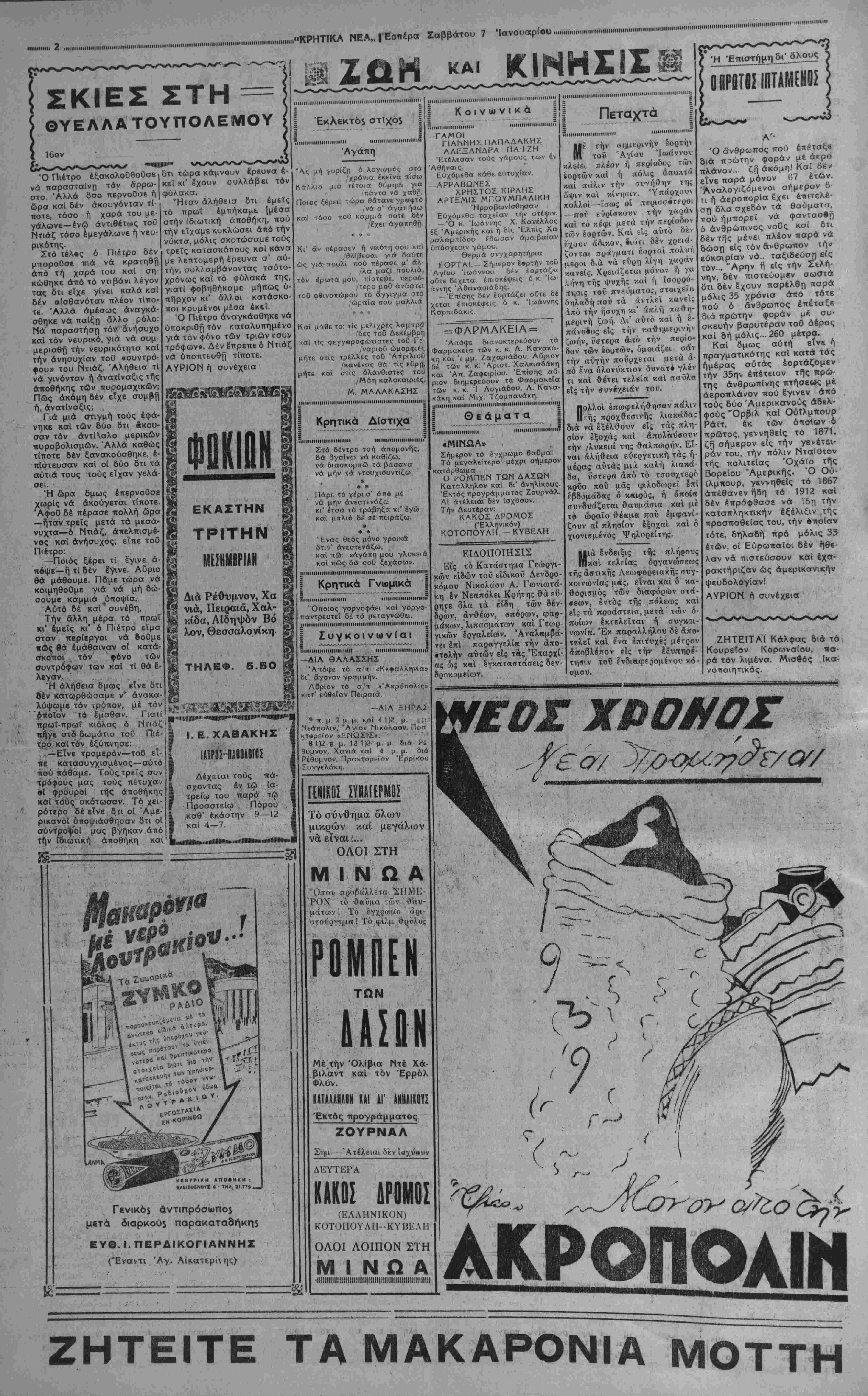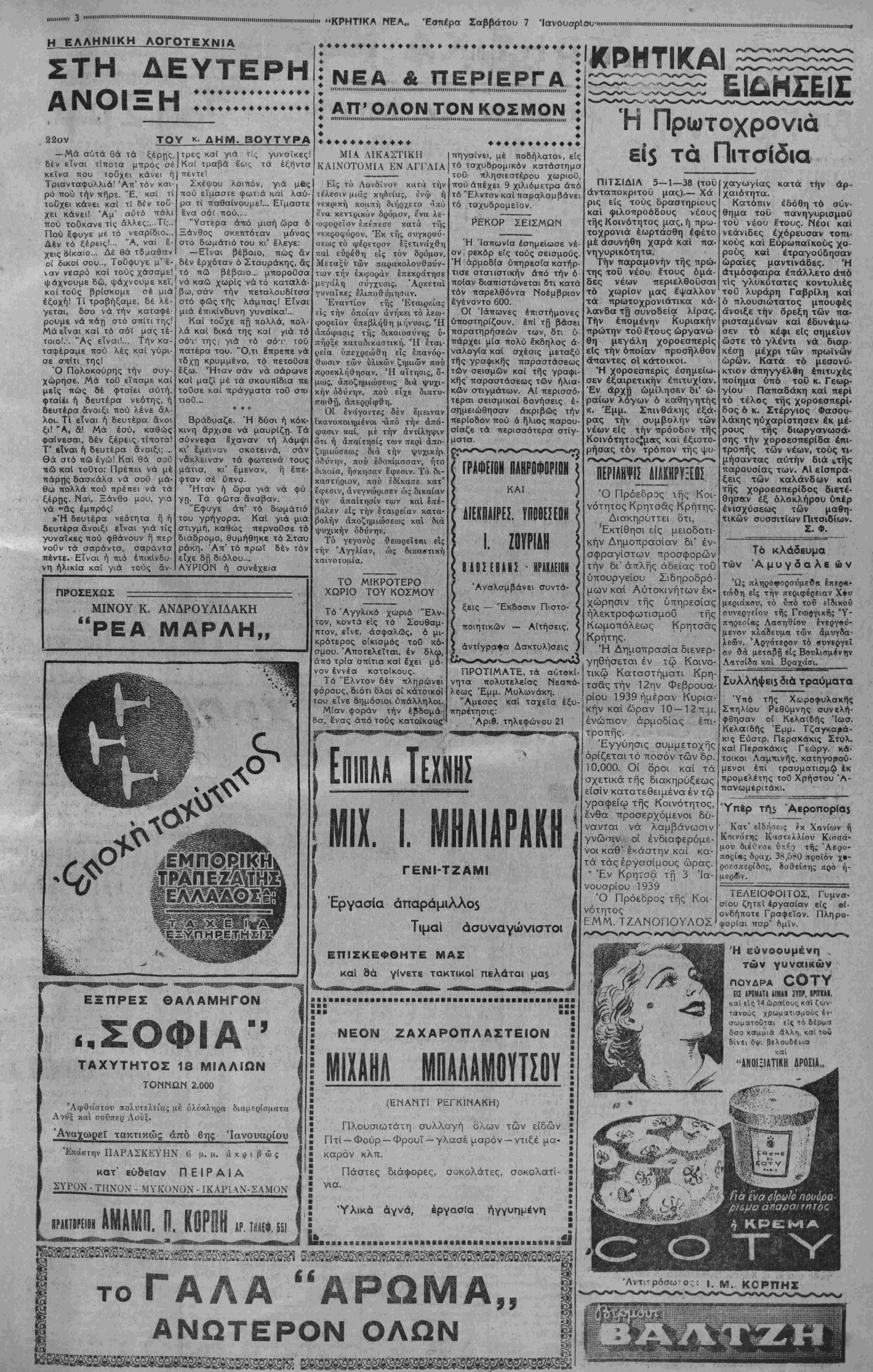 Λιά τόν νΐόν της Ίω<ίνγην, ση μερον Ιορτήν τοϋ Άγ. 'Ιωιίν Ή σημερινή ονομαστική έπέτειοχ του Αρχηγού τηχ Κυβερνήσεως ΑΘΗΝΑΙ 7-1—39 (τοΟ αν¬ ταποκριτού μας).~Έπί τη σημερινή ονομαστική έπε- τβΐω του ΆρχηγοΟ τής Ε¬ θνικής κυβερνήσεως καί του "ΕθνικοΟ Κράτους κ. Ίωαν. Μεταξά, έτελέοθη είς τήν Μητρόπολιν δοξολογία, εις ήν παρέστη ή «"Ομόνοια Κρητών», απασαι αί "Οργα¬ νώσεις Αθηνών — Πΐιραιώς καί χιλιάδες λαοΟ. Έξ αλ¬ λού έκ τών "Επαρχιών κα- ταφβάνουν χιλιάδες ευχητή¬ ρια τηλεγραφήματα προς τόν κ. Μεταξαν καί ψηφί¬ σματα ευγνωμοσύνης. Προήχ&η ε|5 Σμήναρχον 6 κ. ΓβώρΥ. Φαλκωνάκΐ5 Αιά Βασιλικού Διατάγματος προήχθη ?1ς σμήναρχον ό συμ* πολίτης άντισμτ'|ν(ΐρχο; τής α¬ εροπορίας κ. Γεώργ. Φαλκω- νάκης. ( Ήράκλειον 7 Ιανουαρίου 1939 ,,,,,,,,,ι,.........ηπ.ιιπ.Μΐ..........ι·»·...........>.......»'»'.....'......""......"""