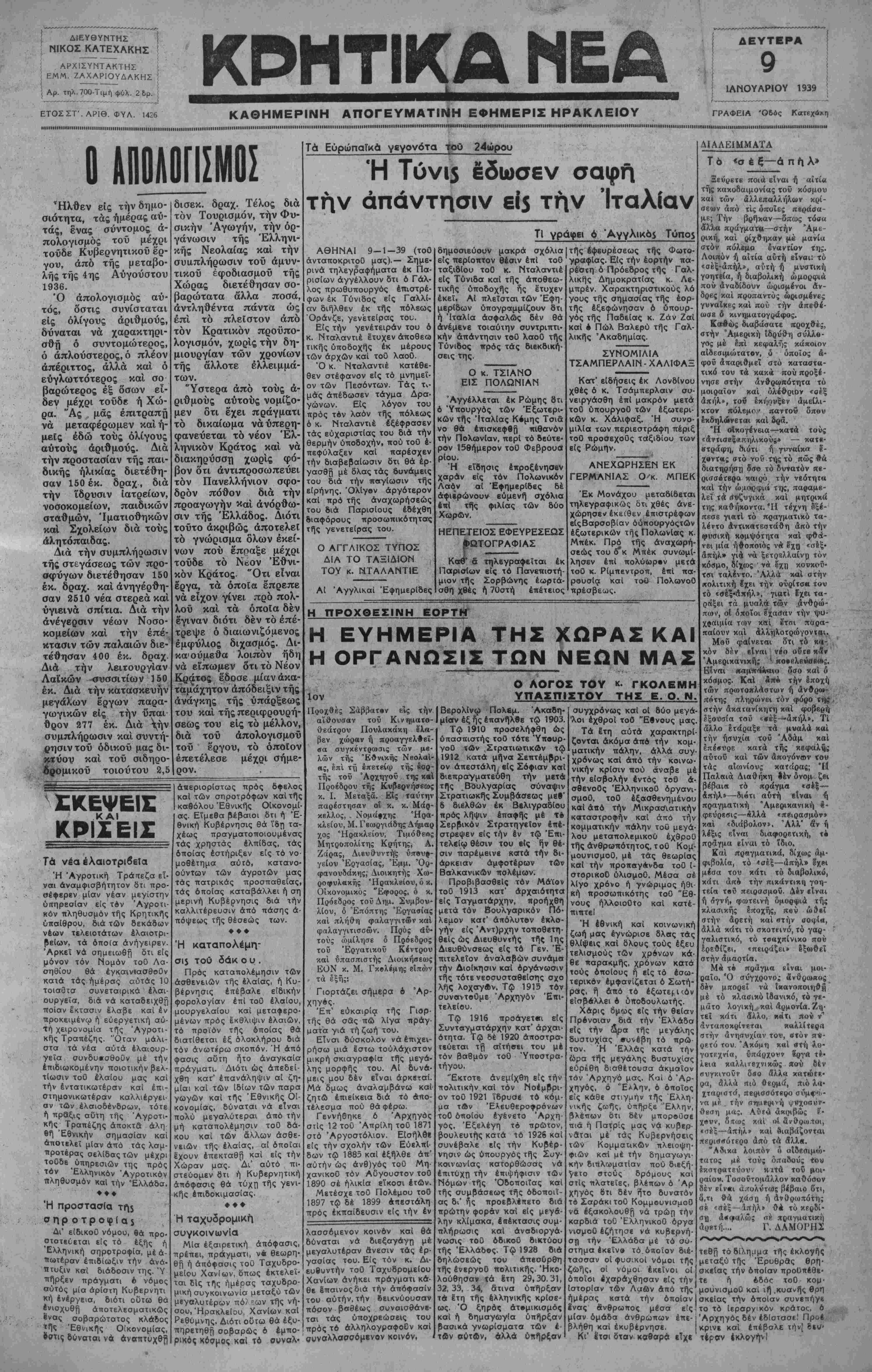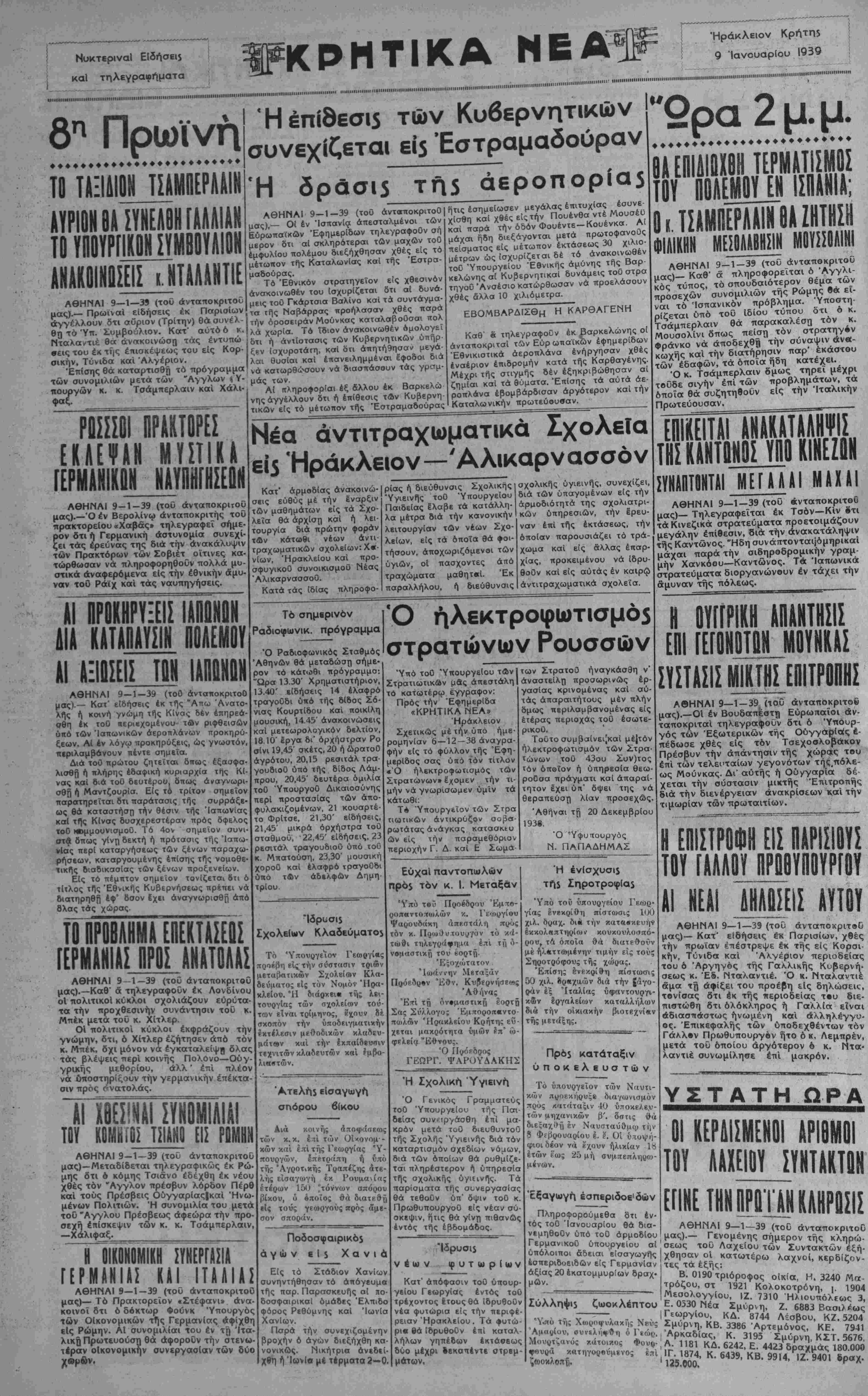 ΑΘΗΝΑΙ 9—1—39 (του ανταποκριτού