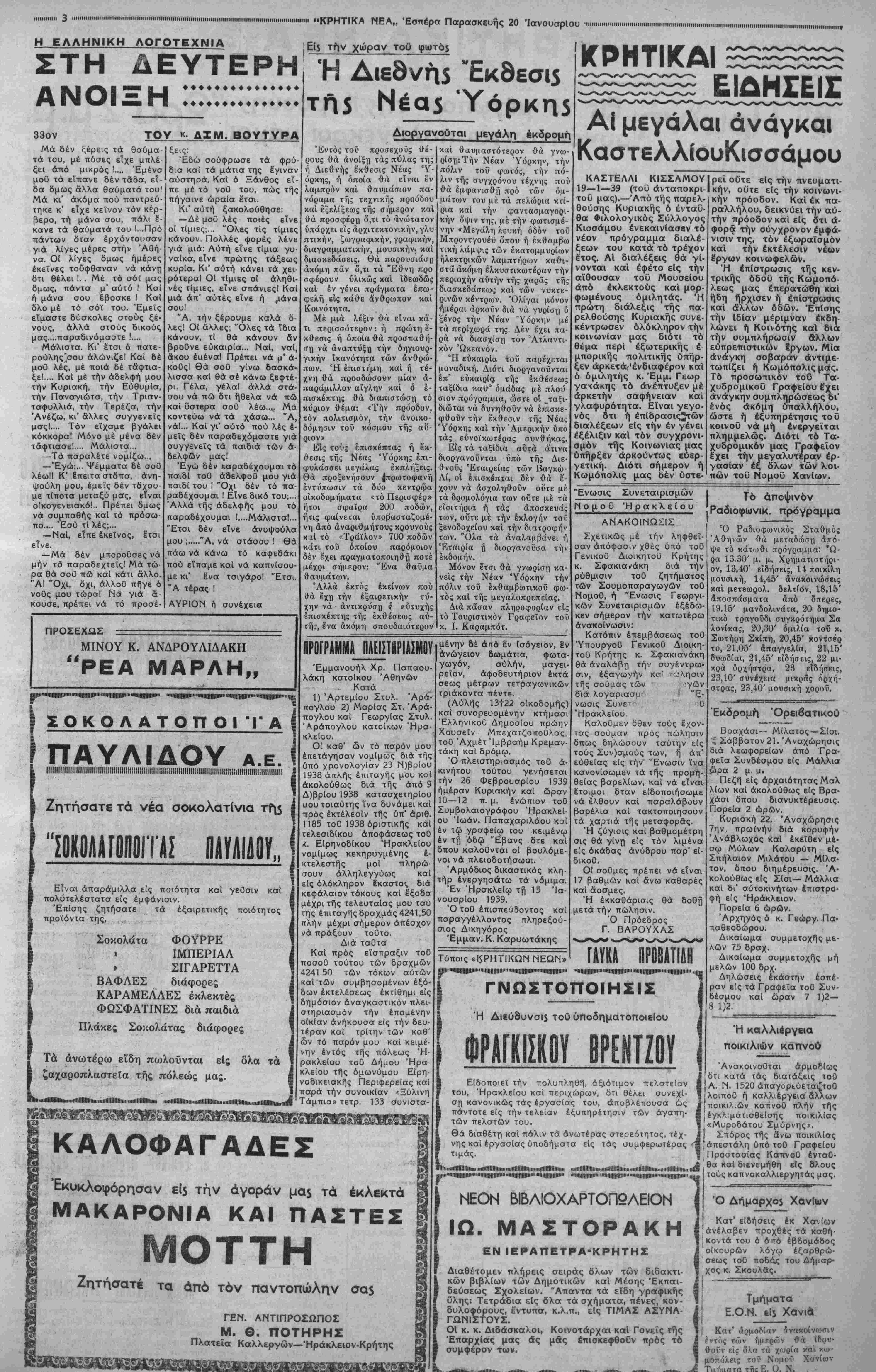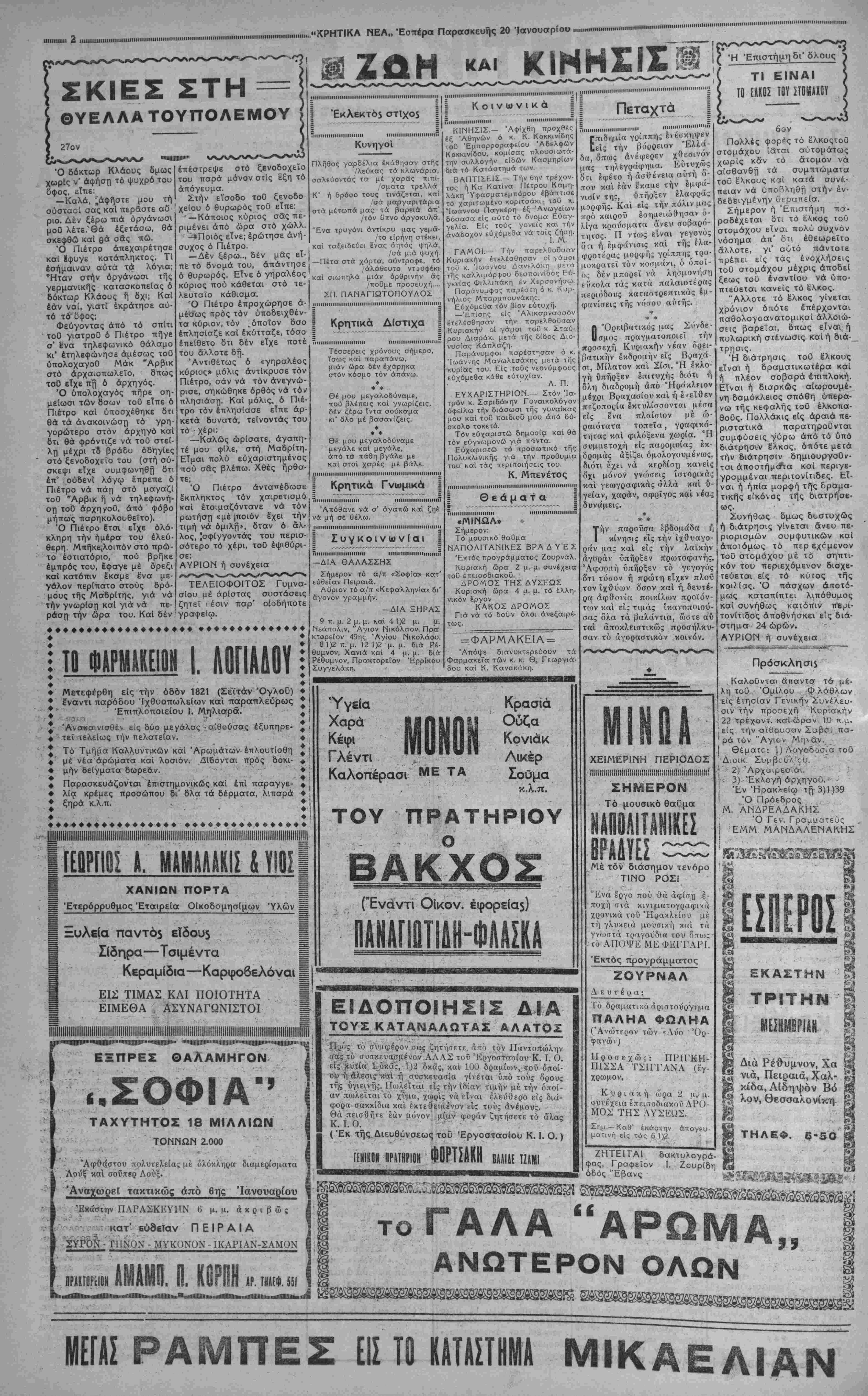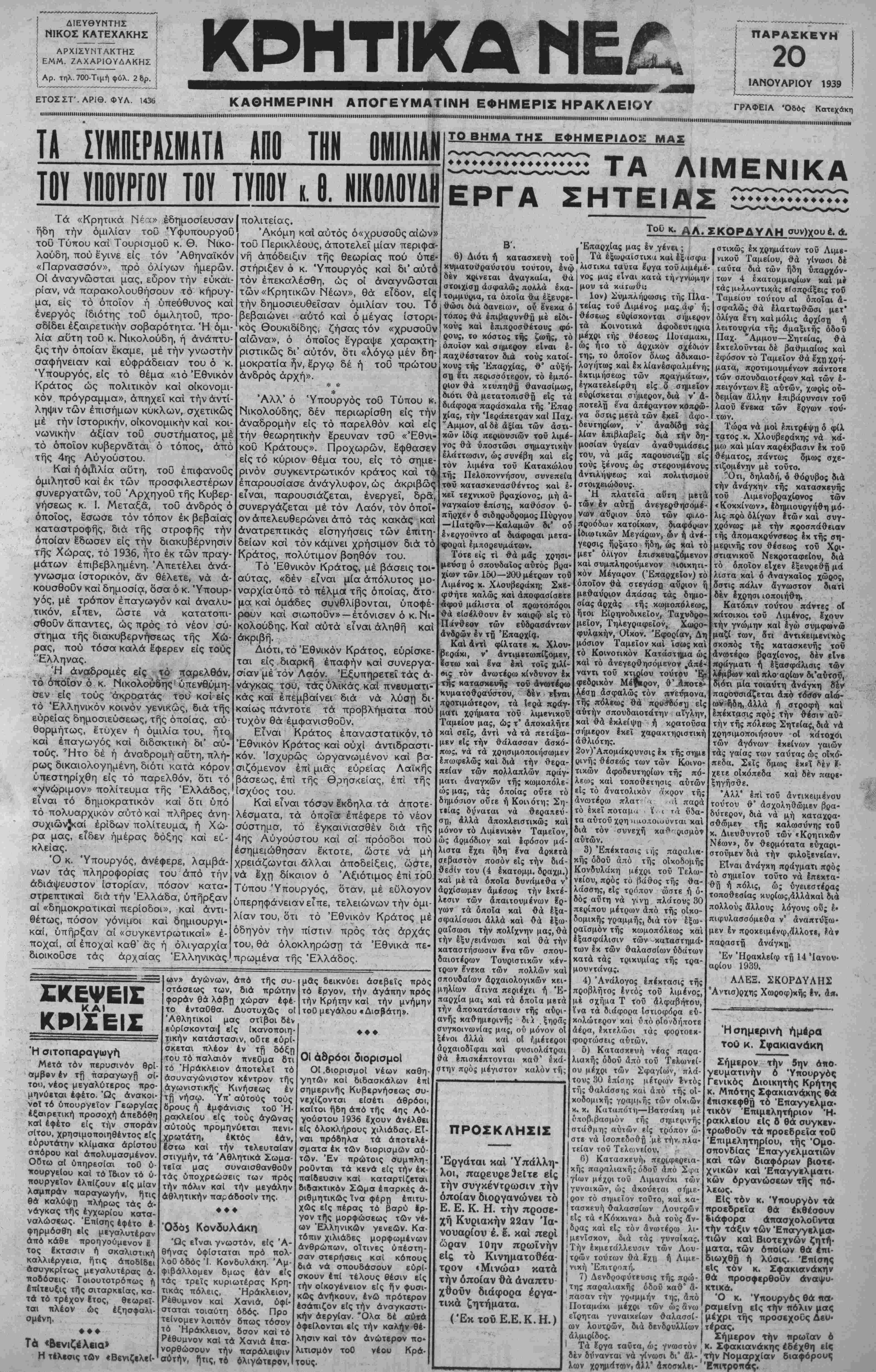 <Κοκκίνων», έδημιουργήθη μό¬ λις πρό ολίγων ετών καί συγ¬ χρόνως μέ τήν προσπάθειαν τής Απομακρύνσβως Ικ τής ση¬ μερινής του θέσεως τοΰ Χρι¬ στιανικού Νεκροταφείου, διά το όποιον εΐχεν έξευρβθη μά λίστα καί ό Αναγκαίος χώρος, δστις πάλιν άγνωστον διατί δέν Ιχρησι ιοποιήθη. Κατόπιν τούτου πάντες οί κάτοικοι τοΰ Λιμένος, δχουν τήν γνώμην καί εγώ συμφωνώ μαζί των, δτι Αντικειμενικός σκοπός τής κατασκευής τοΰ Ανωτέρω βραχίονος, δέν είνβ «ράγματι ή έξασφάλισνς τδν λέμβων καίπλοαρίων δι'αύίοΰ, διότι μία τοιαύτη Ανάγκη 8έν παρουσιάζεται Από ΐόΰβν αΐώ- ωνήδη, Αλλά ή στροφή καί Ιπέκτασις προς τήν θέσιν αυ¬ τήν τής πόλεως Σητείας, διά νά χρησιμοποιήσουν οΐ κάτοχοι τών Αγόνων εκείνων γαιών τάς γαίας των ταύτας ώς οικό¬ πεδα. Σεις δ"μ<«ς Ικ*ΐ Λεν Κ· χετε οικόπεδα καί δέν παρβ- ξηγήσθε. Άλλ1 Ιπί τοΰ Αντικειμένου τούτου θ' Ασχοληθώμεν βρα- δύτερον, διά νά μή καταχρα- σθώμεν τής καλωσύνης κ, Διευθυντοΰ τών «Κρητικών Νέων», δν θερμότατα εύχαρι- στοϋμεν διά τήν φιλοξενείαν, Είναι Ανάγκη πράγματι προς τό σημεΐον τοΰτο νά Ιπεκτα- ή πόλις, ώ; ύγειεστέρας τοποθεσίας κυρίως,Αλλάκαί διά πολλούς Αλλους λόγους οβς έ· πιφυλασσόμεθα ν" Αναπτύξω· μεν Ιν προκειμένω,ά'λλοτβ, παραστβ Ανάγκη. Εν Ήρακλείφ τ^ 14 Ιανου¬ αρίου 1939. ΑΛΕΞ. ΣΚΟΡΔΥΛΗΣ "Αντισ)ρχης Χωροφ)κής !ν. Α«. Ήοημίρινή ήμερα του κ. Σφακιανάκη Σήμερον τήν 5ην άηο- γευματινήν 6 Υπουργός Γενικός Διοικητής Κρήτης κ. Μπάτης Σφακιανά,κης Θά έΘό τό Επάγγελμα· λή Ή φό γγμ τικόν Έπιμιλητήριον Ή- ρακλβίου είς 6 θά συγκκν* τρωθοΟν τά προεδρεία τοϋ Επιμελητηρίου, τής "Ομο¬ σπονδίας Επαγγελματιών καί των διαφόρων βιοτε¬ χνικών καΐ Έπαγγιλματι- κών οργανώσεων τής τιό· λεως. Είς τόν κ. Ύπουργόν τά προεδρεία θά εκθέσουν διάφορα απασχολούνται τήν τάξιν τών Έπαγγβλμα· τιών καί Βιοτεχνών ζητή¬ ματα, τών οποίων θά έπΐ- διωχθή ή λύσις. Επίσης βίς θά ΚΤΙΚά. Ό κ τόν κ. Σφακιανάκη ν προσφερθούν άναψυ- Ύπουργός θά ηα· ραμείνη είς την πόλιν μας ε'ίρηται γυναικείων θαλασσί-1 μέχρι τής προσεχοΟς Δεν»· ων λουτρών, διά δενδρυλλίων τέρας, αλμιρίδος. Σήμερον τήν πρωία ν 6 Τά 8ργα ταΰτα, ώ; γνωστόν κ. Σφακιανάκης εδέχθη είς δέν δύνανται νά γίνωσι δι* άλ- ,τήν Μομαοχίαν διαφόρους λων χρημάτοον, ΑΪλ* 4«οβχλιι- Ε