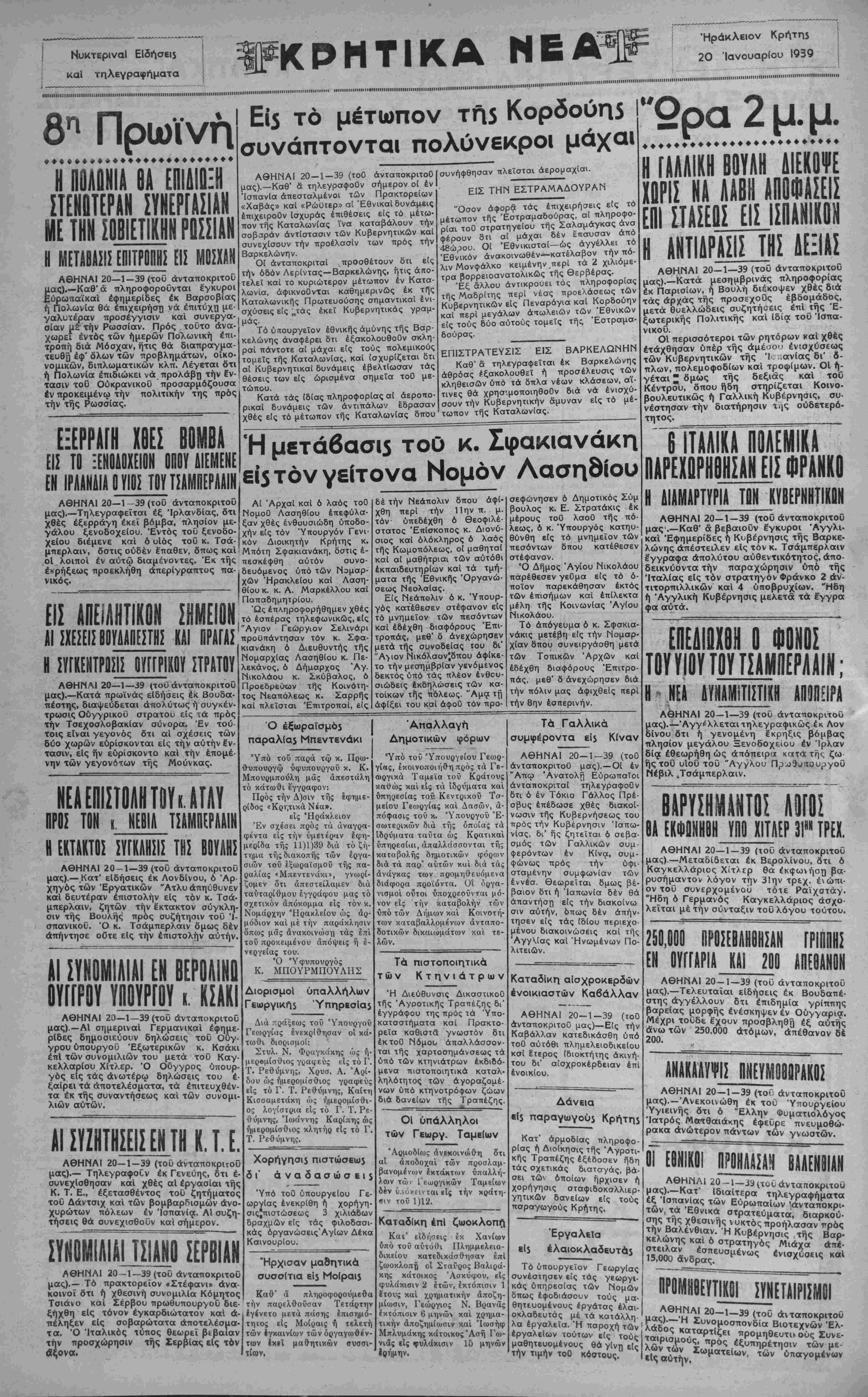 ΑΘΗΝΑΙ 20—1—39 (τοϋ ανταποκριτού
