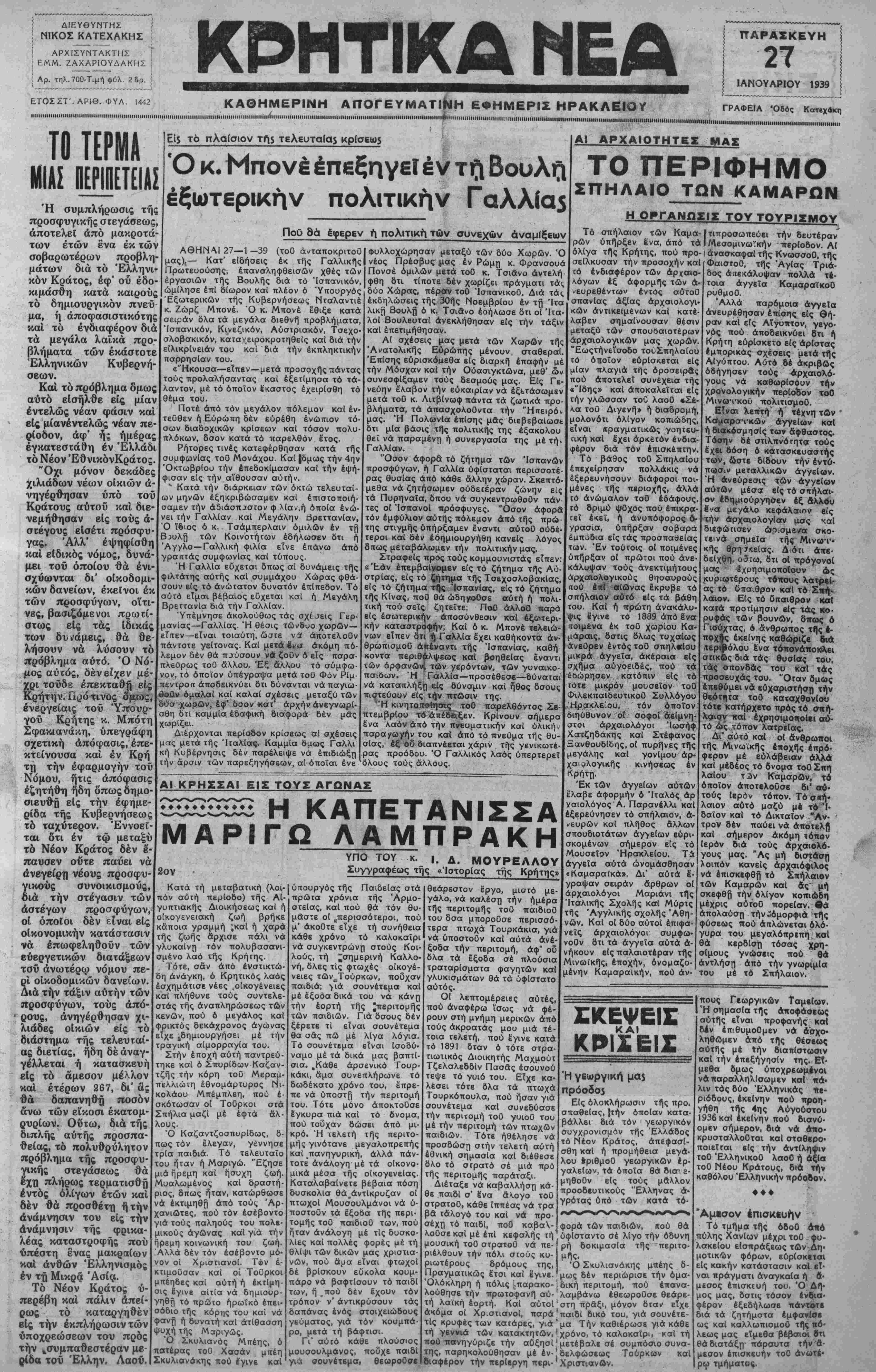 '".........'..............<"»■<.".«■»"<......-■«■»".....Ι...........Η.ΙΙΙΙΛΙ.......ΜΜΙΙΙ....ΙΙΜΙΗΙΙ».....Ι.....Η,,,,....,....,.............Η,..........Μ,*,......,„„„,„„„„,.....ιιηιιι1111111.....«,,,,,™,,,,™,,,,,^,,.,,,,,,,,,,,,^,,,,,^,,,,,,,,,,,,^,,,,,,,,,^,,,,.....,,,^......„„„„„„„,„,„„„,„„,,„„„,„ ΤΟ ΤΕΡΜΑ ΜΙΑΣ ΙίΡΙΙίΤΕΙϋί Ή συμπλήρωσις τής προσφυγικής στεγάσεως, αποτελεί άπό μακρότα¬ των ετών ενα εκ των σοβαρωτέρων προβλη¬ μάτων δια το Έλληνι· κόν Κράτος, έφ' ού έδο- κιμάσθη κατά καιρούς το δημιουργικόν πνεΰ μα, ή άποφασιστικότης καΐ το ενδιαφέρον δια τα μεγάλα λαϊκά προ¬ βλήματα των εκάστοτε Ελληνικών Κυβερνή¬ σεων. Και το πρόβλημα δμως αυτό είσήλΰε είς μίαν εντελώς νέαν φάσιν και είς μίανέντελώς νέαν πε- ρίοδον, άφ' ή; ημέρας έγκατεστάθη έν Ελλάδι το Νέον ΈθνικόνΚράτος. "Οχι μόνον δεκάδες χιλιάδων νέων οίκιών ά- νηγέρθησαν ύπό τοΰ Κράτους αύτοϋ και διε- νεμήθησαν είς τους ά- σεέγους εΙσέτι πρόσφυ¬ γας. Άλλ' έψηφίσθη και είδικός νόμος, δυνά¬ μει τοΰ οποίου θα ένι- σχύωνται δι' οικοδομι¬ κών δανείων, εκείνοι έκ των προσφύγων, οΐτι- νες, βασιζόμενοι πρωτί¬ στως είς τάς Ιδικάς των δυι/άμεις, θα θε¬ λήσουν να λύσουν το πρόβλημα αότό. Ό Νό¬ μος αυτός, δεν είχε ν μέ¬ χρι τούδβ έπεκταθή είς Κρήτην. Πρό τίνος όμως, ένβργείαις τοΰ Ύΐΐουρ- γοΰ Κρήτης κ. Μπότη Σφακιανάκη, υπεγράφη σχετική άπόφασις, έπε- κτείνουσα και έν Κρή τη την έφαρμογήν τοΰ Νόμου, ήτις άπόφασις έζητήθη ήδη δπως δημο¬ σιευθώ είς την εφημε¬ ρίδα της Κυβερνήσεως τό ταχύτερον. Εννοεί¬ ται δτι έν τω μεταξύ τό Νέον Κράτος δέν έ'- παυσεν ούτε παύει να ανεγείρε νέους προσφυ¬ γικούς συνοικισμούς, οιά την στέγασιν τών αστέγων προσφύγων, οΐ οποίοι δέν είναι είς οίκονομικήν κατάστασιν να επωφεληθούν τών ευεργετικών διατάξεων τσΰ άνωτέρφ νόμου πε¬ ρί οίκοδομικών δανείων. Διά τήν τάξιν αυτήν τών προσφύγων, τους από¬ ρους, άνηγέρθησαν χι¬ λιάδες οικιών είς τό διάστημα τής τελευταί¬ ας διετίας, ήδη δε αναγ¬ γέλλεται ή κατασκευή εΙς τό άμεσον μέλλον και έτερων 267, δι' ας θά δαπανηθή ποσόν &νω τών είκοσι έκατομ- ρυρίων. Οΰτω, διά τής διπλής αυτής προσπά¬ θειας, τό πολυθρύλητον πρόβλημα τής προσφυ¬ γικής στεγάσεως θά έχΉ πλήρως τερματισθη εντός ολίγων ετών και δέν θά προσθετή ή τήν άνάμνησιν του είς τήν άνάμνησιν τής φρικα¬ λέας καταστροφής πού υπέστη ένας μακραίων καΐ ανθών Ελληνισμός έν τη Μικροί Ασία. Τό Νέον Κράτος υ¬ περέβη και πάλιν απεί¬ ρως τό καταργηθέν βίς τήν έκπλήρωσιν τών υποχρεώσεων του προς τήν ^συμπαθεστέραν με¬ ρίδα τοϋ Έλλην, Λαοΰ. Εί$ τό πλαίσιον τή$ τελευταία$ Ό κ. Μπονέ επεξηγεί έν τ$ Βουλή έξωτερικήν πολιτικήν Γαλλία5 ΠοΟ 8ά έφερεν ή πολιτική τών συνεχών αναμίξεων ΑΘΗΝΛΙ27—1-39 μας),— Κατ' είδήσεις Πρωτευούσης, εργασιών τής (τοΟ ανταποκριτού" έκ τής Γαλλικής έπαναληφθεισών χθες τών Βουλής διά τό Ίσπανικόν, ώμίλησε έπί δίωρον και πλέον 6 "Υπουργός Εξωτερικών τής Κυβερνήσεως Νταλαντιέ κ. Ζώρζ Μπονέ. Ό κ. Μπονέ έθιξε κατά σειράν δλα τα μεγάλα διεθνή προβλήματα, Ίσπανικόν, Κινεζικόν, Αύσιριακόν, Τσέχο- σλοβακικόν, καταχειροκροτηθείς και διά τήν είλικρίνειάν του παρρησίαν του. και διά τήν έκπληκτικήν 'Ηκουσα—-εΐπβν—μετά προσοχής τιάντας τους προλαλήσαντας καΐ έξετίμησα τό τά- λαντον, μέ τό όποιον έκαστος έχειρίσθη τό θέμα του. Ποτέ άπό τόν μεγάλον πόλεμον καΐ έν· τεΟθεν ή Ευρώπη δέν ευρέθη ενώπιον τό¬ σων διαδοχικών κρίσεων καΐ τόσον πολύ¬ πλοκων, δσον κατά τό παρελθόν δτος. Ρήτορες τινές κατεφέρθησαν κατά τής συμφωνίας τοΟ Μονάχου. Καί |δμως τήν 4ην "Οκτωβρίου τήν έπεδοκί