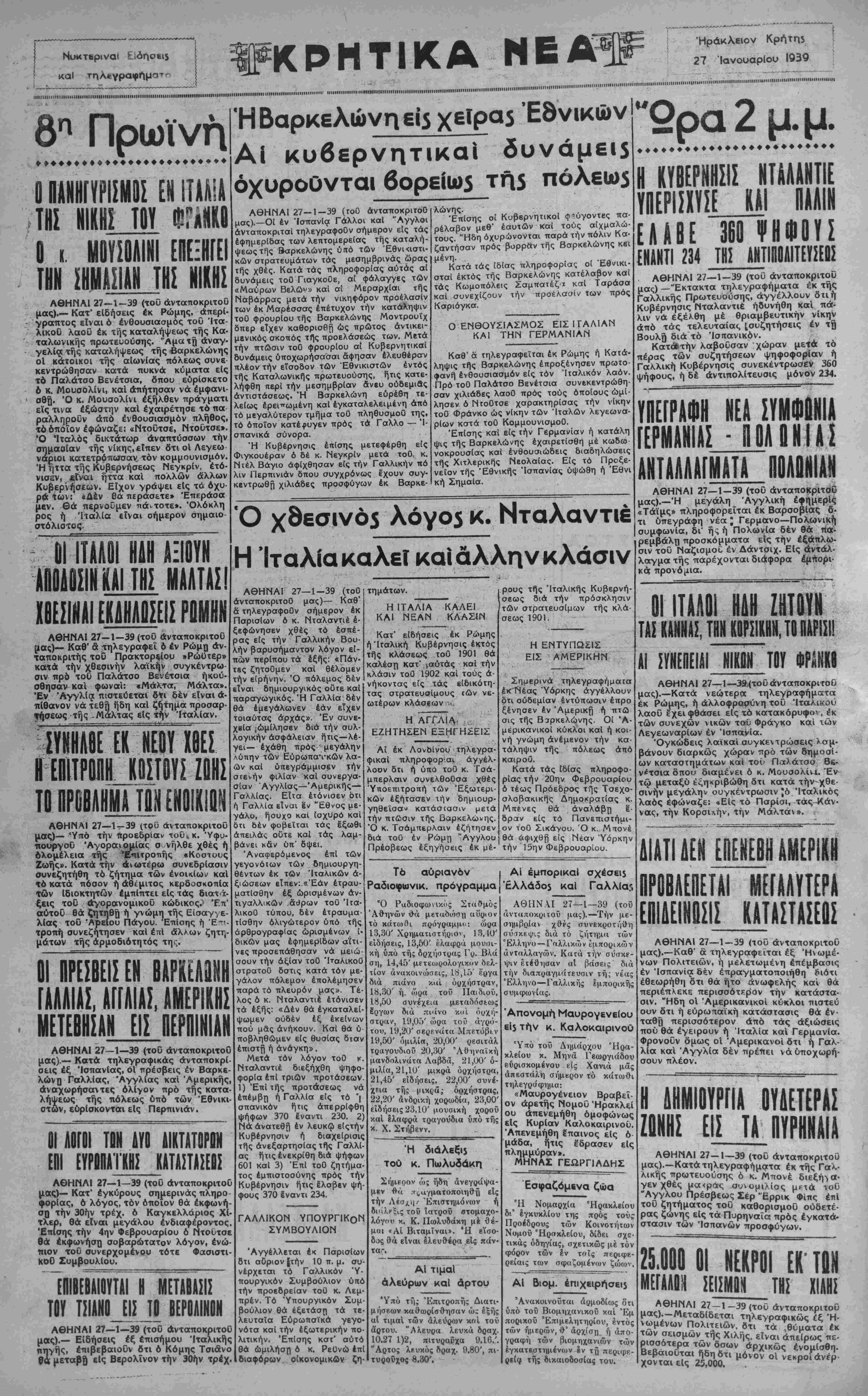 ΑΘΗΝΑΙ 27—1—39 <τοΟ ανταποκριτού μας) —"Εκτακτα τηλεγραφήματα έκ τής Γαλλικής Πρωτευούσης, άγγέλλουν δτι ή Κυβέρνησις Νταλαντιέ ήδυνήθη καΐ πά¬ λιν να έξέλθη μέ θριαμβευτικήν νίκην άπό τάς τελευταίας [συζητήσεις έν τ^ Βουλο διά τό Ίσπανικόν. Κατά»τήν λαβοΰσαν χώραν με<ά τό πέρας τών συζητήσεων ψηφοφορίαν ή Γαλλική Κυβέρνησις συνεκέντρωσεν 360 ψήφους, ή δέ άντιπολίτευσις μόνον 234. ΥΠΕΓΡΑΦΗ ΚΕΑ ΣΥΜΦ ΓΕΡΜΑΝ ΑΣ - Π ΟΑ 0 Ν ΙΝ1Α ΑΙ ΑΝΤΑΛΛΑΓΜΑΤΑ Π0ΛΟΜ1ΑΗ ΑΘΗΝΑΙ 27—1-39 (τοϋ άνταποΚριτύ'6 μας).—Ή μεγάλη Αγγλική έφημερίς; «Τάϊμς» "πληροφορείται έκ Βαρσοβίας δ¬ τι υπεγράφη νέα ^ Γερμανό—Πολωνική συμφωνία, δι' ή ς ή Πολωνία δέν θά Άα· ρεμβάλη προσκόμματα είς τήν έξάπλω- σιν του Ναζισμοί έν Δάντσιχ. ΕΙς αντάλ¬ λαγμα τής παρέχονται διάφορα εμπορι¬ κά προνόμια. 01 ΙΤΑΛΟΙ ΗΔΗ ΖΗΤΟΥΗ; ΤΑΙ ΚΛΗΜΑΣ, ΤΗΜ ΚΟΡΙΐΙΙΗΗ, ΤΟ ΒΑΡ1Ι1Ϊ «Ι ίϊΚίΟΕΙί! ΗΙΚΡΗ ΤΟΥ ΦΡΑΚΚ0 ΑΘΗΝΑΙ 27-τΙ—39!(τοΟάνταποκριτοΟ μας).—Κατά νεώτερος τηλεγραφήματα έκ Ρώμης, ή άλλοφραρύνη του ΊταλικοΟ λαοΰ έχει φθάσει είς τό κατακόρυφοι, έκ τών συνεχών νικών τ«ΰ Φράγκο και ών Λεγεωναρίων έν "Ισπανία. "Ογκώδεις λαικαΐ συγκεντρώσεις λαμ¬ βάνουν διαρκώς χώραν πρό τών δημοσί¬ ων καταστημάτων και τοΰ Παλάτσο 8&- ν^τσια δπου διαμένει ό κ. Μουσολίνι. Έν τφ μεταξύ έςηκριβώθη δτι κατά τήν χθε¬ σινήν μεγάλην ουγκέντρωσιν |[ό "Ιταλικός λαός έφώναζε: «ΕΙς τό Παρίσι, τάς Κάν· νας, τήν Κορσιχήν, τήν Μάλτα»». . ΔΙΑΤΙ ΔΕΝ ΗΒΗ ΑΜΕΡΙΚΗ ΠΡΟΒΛΕΠΕΤΑΙ ΜΕΓΑΛΥΤΕΡΑ ΕΠ1ΑΕΙΜ ΚΑΤΑΣΤΑΣΕΟΣ ΑΘΗΝΑΙ 27—1-39 (τοΰ άνταποκριτοΟ μας).—Καθ" α τηλεγραφεΐται έξ Ήωμέ· νων Πολιτειών, ή μελετωμένη έπέμβασις έν "Ισπανία δέν έπραγματοποιήθη διότι έθεωρήθη δτι θά ήτο ανωφελής και θά περιέπλεκε περισσότερον τήν κατάστα- σιν. "Ηδη οΐ "Αμερικανικοί κύκλοι πιστεύ ουν δτι ή ευρωπαϊκή κατάστασις θά έν- ταθη περισσότερον άπό τάς αξιώσεις πού θά εγείρουν ή Ιταλία καΐ Γερμανία. Φρονοϋν δμως οι "Αμερικανοί δτι ή Γαλ¬ λία και "Αγγλία δεν πρέπει νά υποχωρή¬ σουν πλέον. Η ΔΗΜΙΟΥΡΓΙΑ ΟΥΔΕΤ£ΡΑΣ ΖΟΝΗΣ ΕΙ! ΤΑ ΑΘΗΝΑΙ 27—1—39 (τοΟ ανταποκριτού μας).—Κατά τηλεγραφήματα έκ τής Γαλ¬ λικής πρωτευούσης ό κ. Μπονέ διεξή>α·