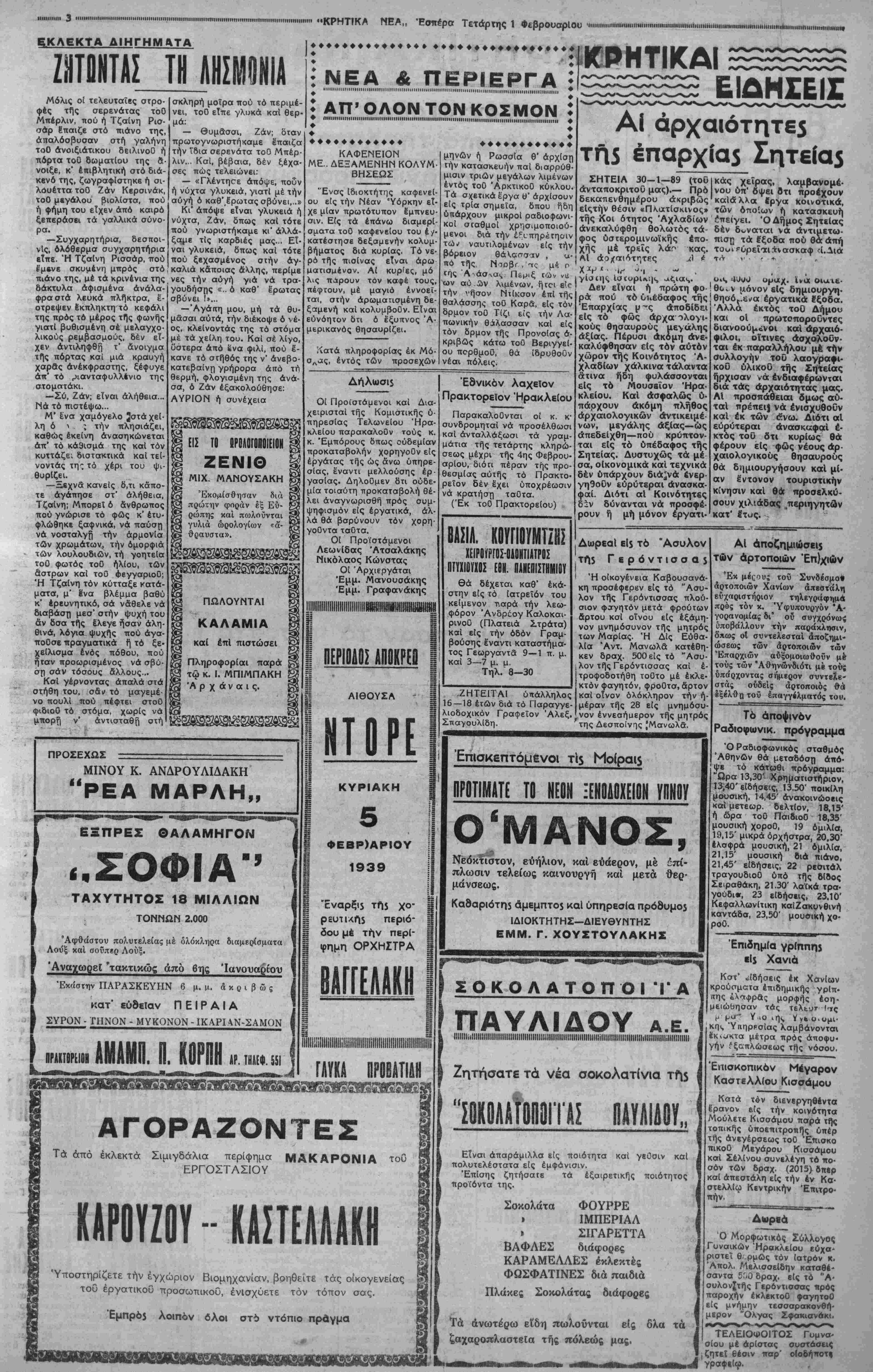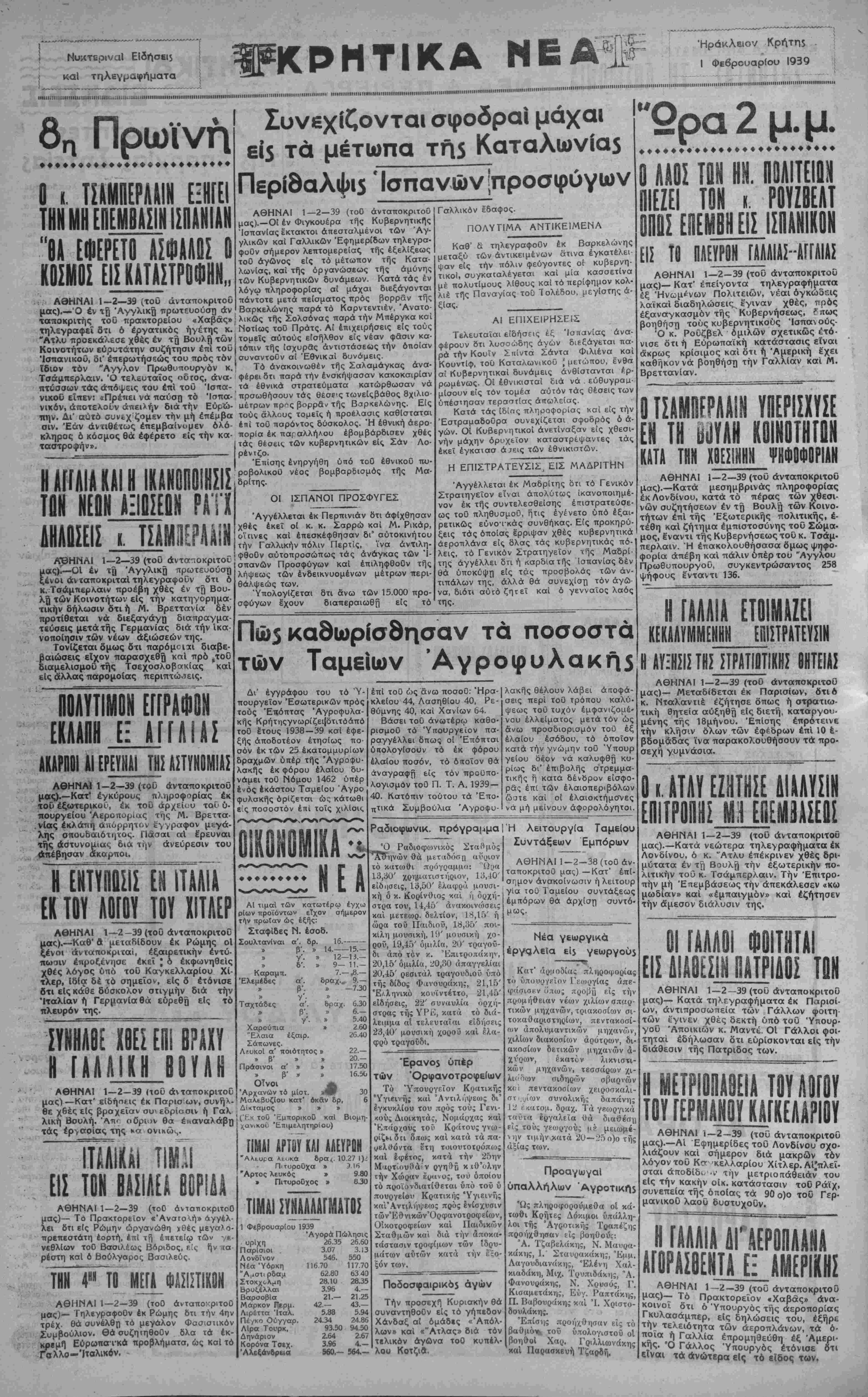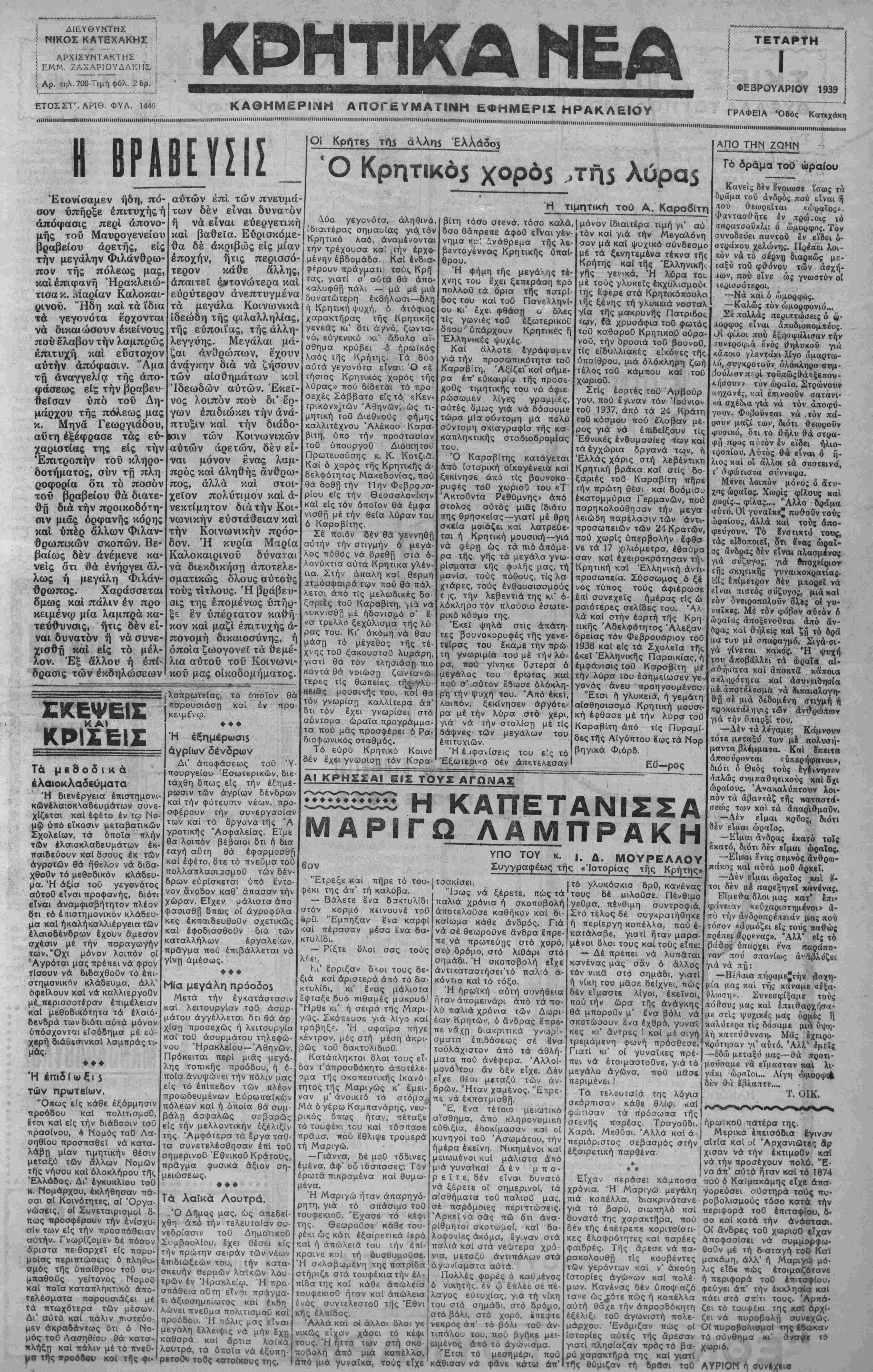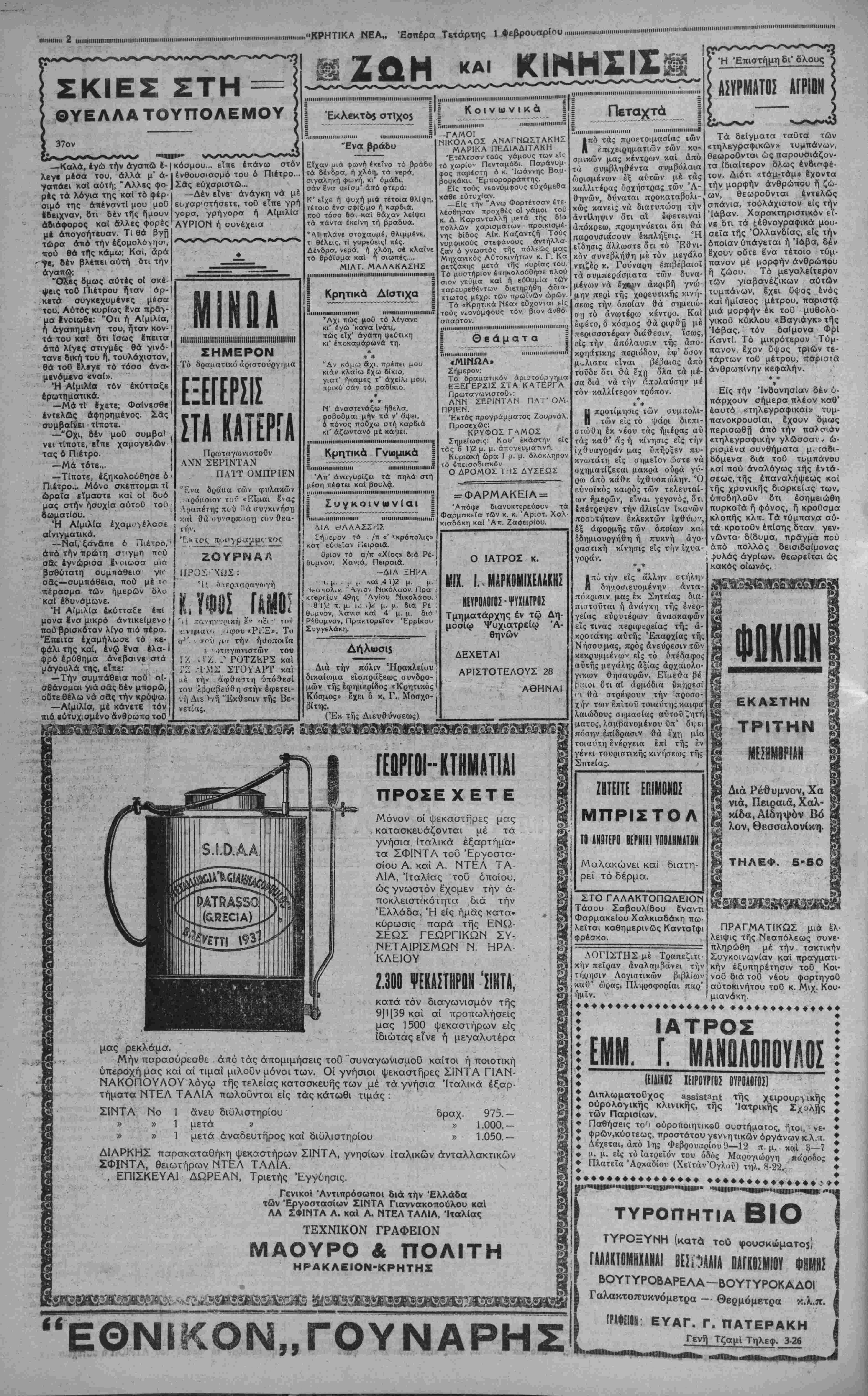 | Αρ. τηλ.700Τιμή <ρύλ. 2 6ρ. ΚΡΗΤΙΚΑ ΝΕΑ ■ ΤΕΤΑΡΤΗ ΦΕΒΡΟΥΑΡΙΟΥ 1939 ετοσστ αριθ φυλ 1446 ΚΑΘΗΜΕΡΙΝΗ ΑΠΟΓΕΥΜΑΤΙΝΗ ΕΦΗΜΕΡΙΣ ΗΡΑΚΛΕΙΟΥ γραφεία ·ο*6ς ·»'»··■■"»>■■»......ηιιιιιιιιιιιΐιι......ι..ι.ι·ιιιιιιιιιιιιιιιιιιι.Η..ιιιιιιιιΐίΐιΐιιιιι·π.....»-<................ΙΙΙΙΙΙΙΙΙ1ΙΙ.ΙΜΙΙΙΙΙΙΙΗΙΙΙΙΙΙΙΙΙΙΙΙΙΙΙΙΙΙΝΙΙΙΙΙ..ΙΙΙΙ..ΙΙΙΙΙΙΙΙΙΙΙ.....ι.ι.ΗΜ.ιι...,,.....„„„........„„„„„„„„.....ιιπι.ι.ιι.,,,,,,,,,,,,,,,,,,,,,,,,,,,,,,,,,,,,,,,,,,,π,.,.....,..,.,......„„ """""""""•"ΙΗΙΙΙΙΙΙΙΙΙΙΙΙΙΙΙΙΙΙΙΙΙΙΙΙΙΙ,ΙΙ,,ΙΙ,,,,,Ι,,,,,,,,,,,,,,,,,,,,,,,,,,,,,, Η ΒΡΑΒΕΥΣΙΣ Έϊονίσαμεν ήδη, πό¬ σον υπήρξε επιτυχής ή άπόφασις περί απονο¬ μής τοΰ Μαυρογενείου βραβείου αρετής, εις τήν μεγάλην Φιλάνθρω¬ πο ν τής πόλεως μας, και επιφανή Ήρακλειώ- τισα κ. χνίαρίαν Καλοκαι¬ ρινού. Ήδη και τα ίδια τα γεγονότα έρχονται νά δικαιούσουν εκείνους πού ελαβον τήν λαμπρώς επιτυχή και εΰστοχον αυτήν άπόφασιν. "Αμα τη αναγγελία τής απο¬ φάσεως είς τήν βραβευ- θεϊσαν ύπό τοϋ Δη¬ μάρχου τής πόλεως μας κ. Μηνά Γεωργιάδου, αΰΐη εξέφρασε τάς ευ¬ χαριστίας της είς τήν Έπιτροπήν τοϋ κληρο¬ δοτήματος, συν τη πλη ροφορία δτι το ποσόν τοϋ βραβείου θα διατε- •θή διά τήν προικοδότη- σιν μιας ορφανής κόρης καΐ υπέρ δλλων Φιλαν¬ θρωπικών σκοπών. Βε¬ βαίως δεν ανέμενε κα¬ νείς δτι θα ένήργει άλ¬ λως ή μεγάλη Φιλάν¬ θρωπος. Χαράσσεται δμως και πάλιν εν προ κειμένω μία λαμπρά κα- τεύθυνσις, ήτις δεν εί¬ ναι δυνατόν ή νά συνε- χισθή και είς το μέλ¬ λον. Έξ άλλου ή επί- δρασις των εκδηλώσεων Οί Έλά5ο$ Ό Κρητικό5 τή5 αυτών επί των πνευμά¬ των δεν είναι δυνατόν ή νά είναι ευεργετική και βαθεία. Ευρισκόμε¬ θα δε ακριβώς είς μίαν έποχήν, ήτις περισσό- τερον κάθε άλλης, απαιτεί ςρτονωτερα και εύρύτερον ανεπτυγμένα τά μεγάλα Κοινωνικά ιδεώδη τής φιλαλληλίας, τής εύποιΐας, τής αλλη¬ λεγγύης. Μεγάλαι μά- ξαι ανθρώπων, έχουν ανάγκην διά νά ζήσουν τών αισθημάτων και Ιδεωδών αυτών. Εκεί¬ νος λοιπόν πού δι1 έρ¬ γων επιδιώκει τήν άνά- πτυξιν και τήν διάδο- &σιν τών Κοινωνικών αυτών αρετών, δεν εί¬ ναι μόνον ένας λαμ¬ πρός και αληθής άνθρω¬ πος, άλλα και στοι- χείον πολύτιμον και ά- νεκτίμητον διά τήν Κοι- νωνικήν εΰστάθειαν και τήν Κοινωνικήν πρόο- δον. Ή κυρία Μαρία Καλοκαιρινού δύνατοα νά διεκδίκηση άποτελε- σματικώς δλους αυτούς τους τίτλους. Ή βράβευ- σις της επομένως υπήρ¬ ξε εν ύπέρτατον καθή¬ κον και μαζί επιτυχής α¬ πονομή δικαιοσύνης, ή όποια ζωογονεί τά θεμέ¬ λια αύτοΰ τού Κοινωνι¬ κού μας οικοδομήματος. ΕΚΕΨΕΙΕ ΚΑΙ ΚΡΙΣΕΙΣ Τά μεθοδικά έλαιοκλαδεύματα Ή διενέργεια έπιστημονι- κώνέλα'.οκ.αδευμάτων συνε- χΐζβται καΐ έφέτο έν τω Νο· μφ ύπό εΐκοσιν μεταβατικών Σχολείων, τά όποια πλην των έλαιοκλαδευμάτων εκ¬ παιδεύουν καί δσους έκ τών αγροτών θά ήθελον νά διδα- χθοΟν τό μεθοδικόν κλάδευ- μα. Ή αξία του γεγονότος αότοΟ είναι προφανής, διότι είναι αναμφισβήτητο ν πλέον 8τι τό επιστημονικό ν κλάδευ- μα καί ήκάλήκαλλιέργειατών έλαιοδένδρων έχουν αμεσον σχέσιν μέ τήν παραγωγήν των. "Οχι μόνον λοιπόν οί Άγρόται μας πρέπει νά φρον τίσουν νά διδαχθοΟν τό επι¬ στημονικών κλάδευμα, άλλ' οφείλουν καί νά καλλιεργοΟν μέ.περισσοτέραν έπιμέλειαν καί μεθοδικότητα τά έλαιο- δενδρά των διότι αυτά μόνον υπόσχονται εισόδημα μέ εύ- χβρή διάθβσινκαί λαμπράς τι¬ μάς. ♦ ♦♦ Ή έπιδ(ωξΐ5 τών πρωτείων. "Οπως είς κάθε έξόρμησιν προόδου καί πολιτισμοΟ, Βτσι καί είς τήν διάδοσιν τοΟ -πρασίνου, * Νομός τοΟ Λα- σηθίου προσπαθεί νά κατα¬ λάβω μίαν τιμητικήν θέσιν μεταξύ τών άλλων Νομών τής νήσου καί ολοκλήρου τής "Ελλάδος. Δι* εγ