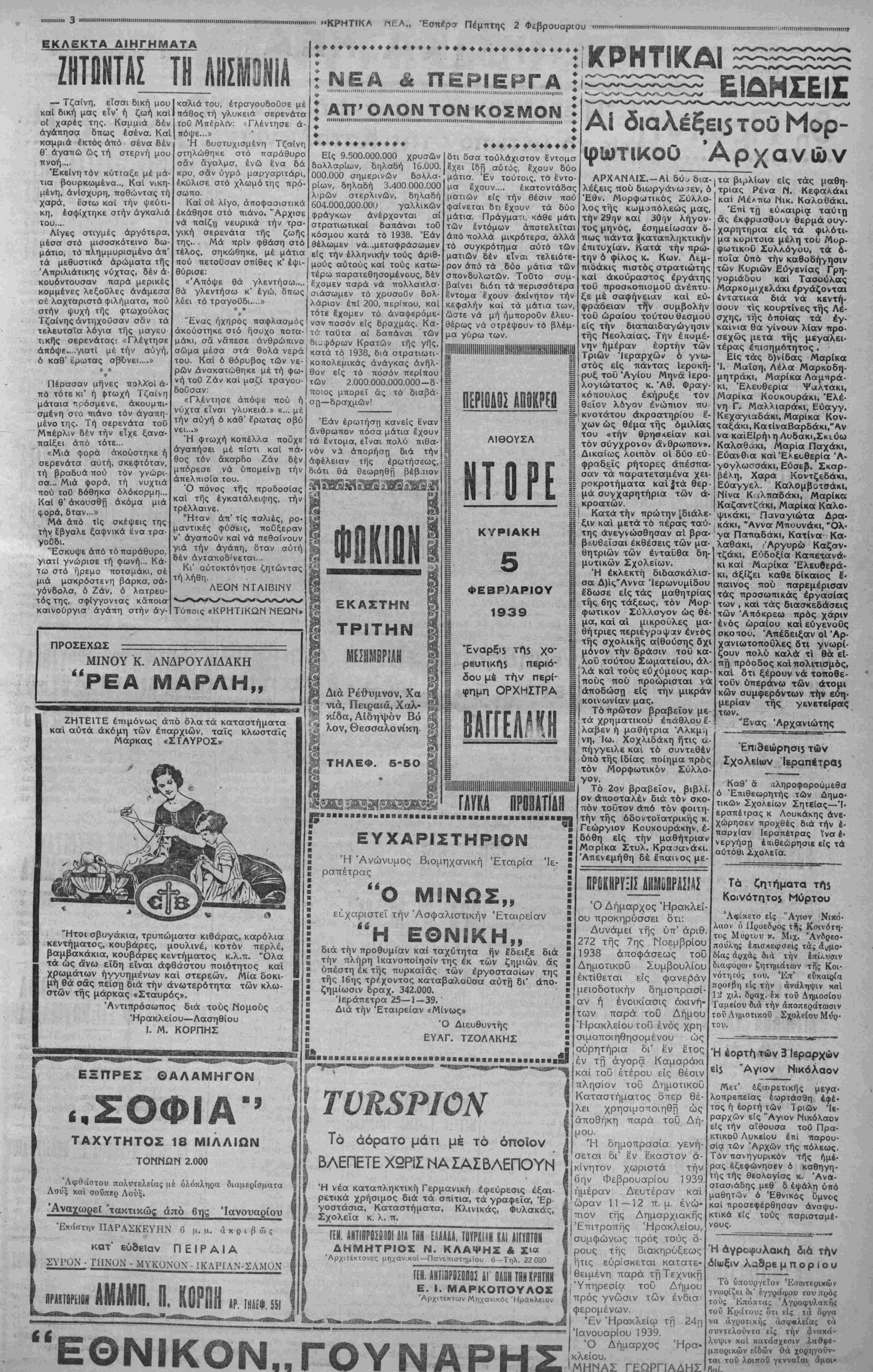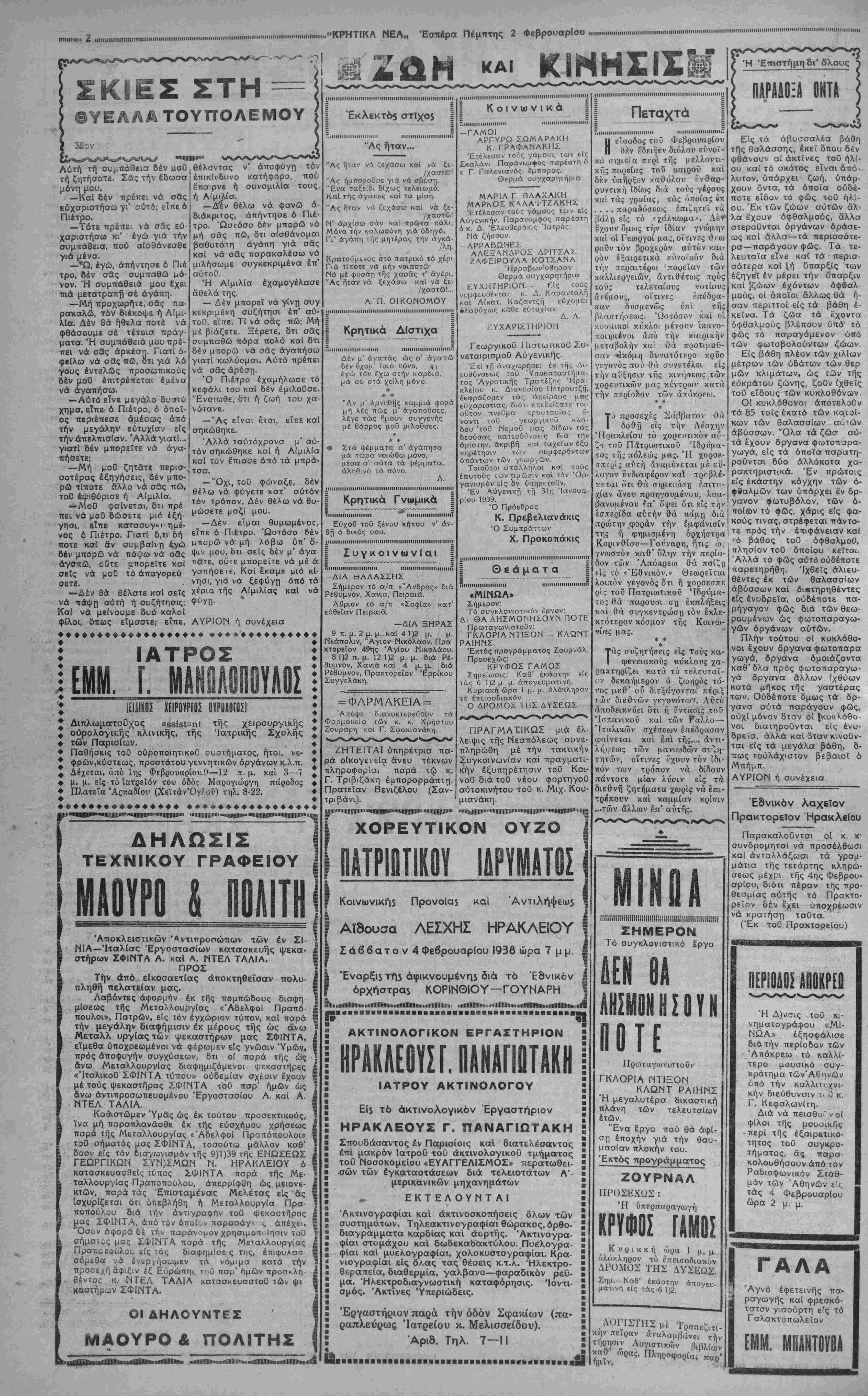 τ>< τών ενταύθα καπνυβιομη- ίνικών εταιριών 4 κύλινδροι αξίας" δρχ. 384. Μ κίνησι$ του η Ή κί*ησις τοΰ Ληξιαρχείου Ηρακλείου κατά τόν λήξαντα μήνα εΊ(ει ώς ακολούθως: Γά¬ μοι 42, Γεννήσεις 103, καί Θά· ατοί 49. Διορισμοί Κρησσών Διδασ)σσών Διά διατάγματος τοϋ Ύπουρ είου τής Παιδείας διορίζονται αί κάτωθι Κρήσσαι δημοδιδα- χάλισσα» ΑΙχ. Δραζινάχι είς ΟΡΑ 3Η Μ. Μ. Η ΓΑΛΛΙΑ ΑΠΙΣΓΕΑΑΕΙ ΠΡΕΪΒΥΗ ]Ε12_ΜΠ0ΥΡΓΚ0Σ ΑΘΗΝΑΙ 2-2—39 (τοΟ άν· ταποκριτοΟ μας).—"Υστατοι πληροφορίαι έκ Παρισίων, άγνέλλουν οτι απεφασίσθη ή αποστολή είς ΜποΟργκος δι- πλωματικοΟ αντιπροσώπου της Γαλλίας. 'Ως τοιοΟτος θά άποσταλη 6 Στρατηγός ΚορτοΟ. ΥΦΙΣΤΑΤΑΙ ΣΥΜΜΑΧΙΑ ΜΕΤΑΞΥ ΓΑΑΑΙΑΪ—ΑΜΕΡΙΚΗΣ; ΑΘΗΝΑΙ 2-2—39 (του άνταποκριτοΟ μας). —Σύμ- πας ό Ευρωπαϊκός τύπος ε¬ ξακολουθεί νά σχολιάζη διά μακρών τόν χθεσινόν λόγον ιοΟ κ. Ρούζβελτ. Κατά κοινήν όμολογίαν ουδέποτε άπό της έποχης τοΟ μεγάλου πολέμου Αμε¬ ρικανός πρόεδρος ώμίλησε μέ τόση ν σαφήνειαν καί τό· σην αποφασιστικότητα. Τινές ισχυρίζονται δτι υφίσταται μυστική συμμαχία μεταξύ Γαλλίας καί Ηνωμένων Πο¬ λιτειών. Βιτάλου Καρυστίαο, Κωνσταν» τία Κλωναράκη βίς Βασιλικοί Ζακύνθου. ΑΙκ. Άνδρουλα· κάκη εις Κίμωνον Νάξου καί Ελένη Χρνσοΰ είς Φλάμπου¬ ρου Αμυνταίου. Ή έλευδέρα μεταφορά του τυροΟ Δι' αγορανομικής διατάξεως έπ' εΰκαιρί^ τη; ενάρξεως τής παραγωγή; τής νέας τυροκο- μιπής περιόδου και πρβς διευ- κόλυνσιν των παραγώγων καί εμπόρων καττ|ογή<>ΐ)ααν οί πε¬