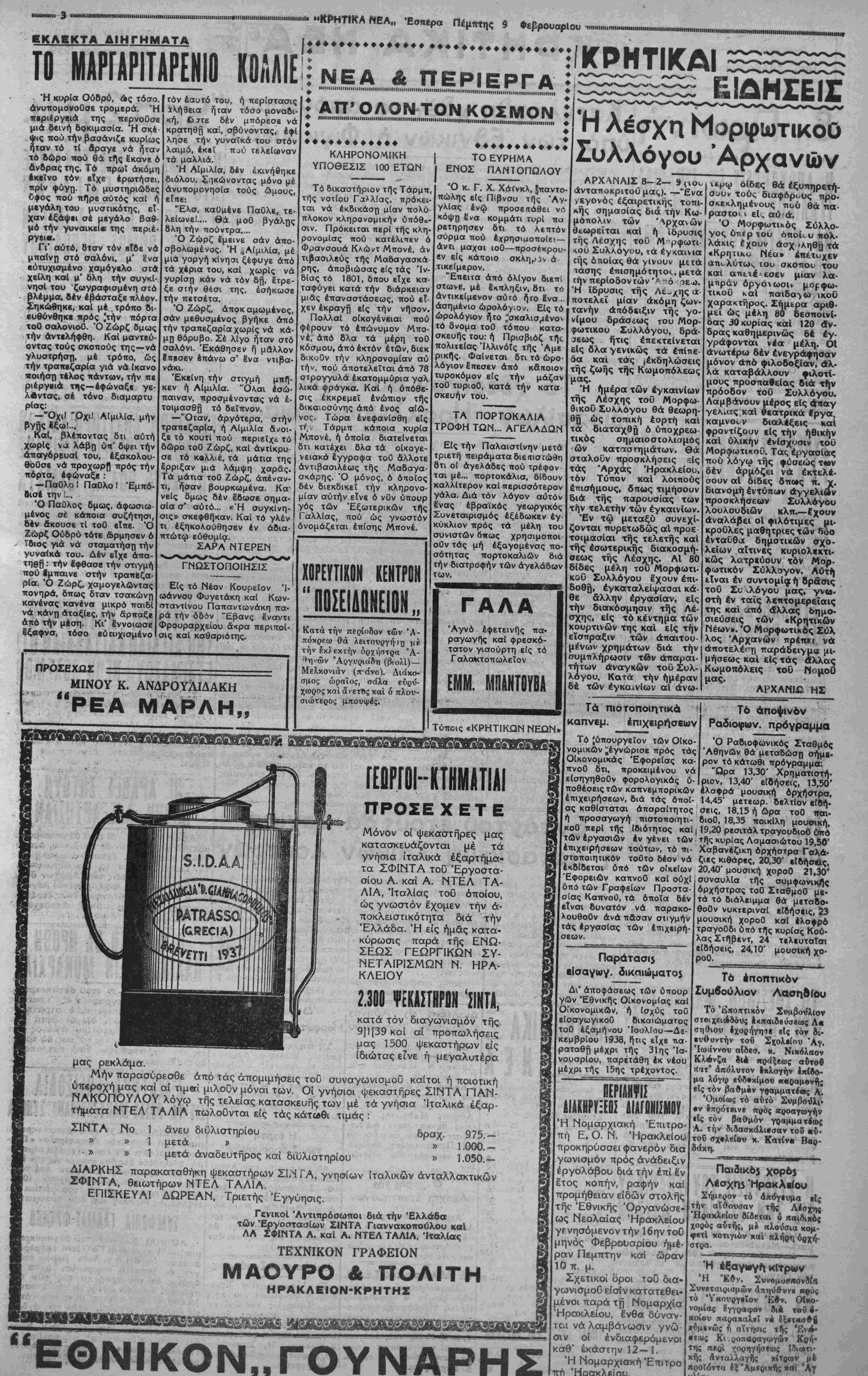 <ρονΐσμένα καί εφοδιασμένα οι δλων τών απαιτουμένων κομφόρ, ώστε νά συμπληρώ¬ σουν μίαν ανάγκην τής πό¬ λεως μας. Επίσης κατόπιν σχετικοΟ εγγράφου τοΟ Υπουργείου Παιδείας απεφασίσθη νά ά- ποσταλή εις "Αθήνας ό "Αρ¬ χιτέκτων τοΟ^Δήμου, ΐνα συ- νεννοηθη μετά τών αρμοδίων ύηηρεσιών τοΟ "Υπουργείου προς καταρτισμόν τοΟ σχε¬ δίου διά τήν συνέχισιν τής αναστηλώσεως τής Ενετικής λέσχης. Τέλος ενεκρίθησαν οί δροι ενοικιάσεως τών ίχθυ οπωλείων διά τό οίκονομ. Ε¬ τος 1939-40. Διάλεξες ■($ Καθηγητών "Ηρακλείου Διά τοΰ Ίτμοπλοίον της γραμμής άνβχώρησαν χ#ές δι* Αθήνας οί κο^ηγηταΐ χ. κ. Γ. Ξηοουχάκη; τοϋ Λυχείυυ δ Κ·ναής και Κ. Φασονλάχης τον Ιίφαχτιχον Λυχιίου, ίνα κατόπιν χροσχλήοβοβς τής έν Αθήναις Μαθητικής 'Κται- Οβίας Ανακοινώσουν διά δια¬ λέξεων έν τφ Αμςιιθεάτοφ τοϋ Πανεπιστημίου κοοίσμα- τα επιστημονικών μελετών των. Ό χορ05Τη$ Επιστημόνων Άνηγγέλθη δτι ό χοαός τής Λέσχης Επιστημόνων Οά 8ο- ^0 το τιλευταΐον Σάββαίον 19 Φίβυουαοίυυ είς τήν αϊΛυν- σαν «Νιορέ». Τά βιβλιάρια του Τ.Ε.Β.Ε. ΠληνΟιροοοΰμιθα δ τι εντός τών ήμερων θ* αποσταλούν εις τό ένταϋθα Έπαγγβλμα- τικόν και Βιοτεχνικόν Έπίμβ- λητήοιον, τά Τ. Κ. Β. Ε. Είς βιβλιάρια τοϋ τους έπαγγίλ- -Αρ;ος ματίας τοΰ γβίτονος Νημοΰ ΊλΒΟ **α διανβμηθώσι υπο του κ. 130 Κ. Βογιατζάχη. Ό χορ05 τοΟ ΜοριρωτικοΟ Άρχανών Ώς πληοοφοοοΰμεθα 6 Μορ¬ φωτικός Σύλλογος Άοχανών δίδει τό προσεχές Σάββατον 11η ν Φεβρουαρίου ώρα 9 μ. μ. μίγ«ν χοοόν βίς τό Κινηματο- θέ-ιτρον τής Κωμοπόλεως μέ πλ»οη όρχήστρον και ώραΐον διάκο·μ·ν. Ή εορτή τών Σιδηρουργών ΑΟριον έορτήν τοΟ Αγίου Χαραλάμπους, τό Σωματεΐον τον Σιδηρουργών Θά έορ τάση έν τώ ίερώ Ναφ τοΟ Μετά τήν Αγίου Ματθαίου. άρτοκλασίαν, ή βίκων τοΟ Άγιου Χαραλάμπους θά μεταφερθή είς τήν βί<ίαν τοΟ έορταστοΟ. Συλλογικά! Ζυμβάσκι; Τό Ύφυπουργεΐον Εργα¬ σίας δι' Ιγκυκλίων του πςός τάς Νομαρχίας τοϋ Κράτους καί 'λοιπάς Αρμοδίας Αρχάς κοινοποιεί υπογραφείσας συλ- λογικάς συμβάσεις ίργασίας ΣΛουελαιουργών, Σαπιονοποι- ών, ΙΙυρηνιλαιουργων καί Βυρ- σοδ«ψ·ργ«τών. ΥΠΑΡΧΟΥΝ ΠΟΛΛΑ ΑΘΗΝΑΙ 9—2—39 (τοΰ άνταπβιφΐτ·6 μας)— Κατά τελευταίας είδήσεις έκ Πα¬ ρισίων, εξεδόθη έπίσημον ανακοινωθέν επί τοΰ χθεσινού ατυχήματος κατά τήν διάρκειαν τών γυμνασίων τοΰ Γαλλικϋβ Στόλου. Τό άντιτορπιλλικόν «Μπιζών» συνεπεία ομίχλης εβλήθη παρά καταδρο μικοΟ, φονευθέντων 9 «έκ τοΰ πληρώμα¬ τος του, άπωλεσθέντων 3 καί τραυματι- σθέντων 14. ΟϊΤΤΑΑΟΙ ΚΑΤΗΓΟΡΟΥΝ" ΤΗΝ ΑΓΓΛΙΑΝΚΑΙ ΓΑΛΛΙΑΝ ΟΤΙ ΕΤρίΜΑΖΟΥϋΙΝ ΠΟΑΕΜΟΝ ΑΘΗΝΑΙ 9—2—39 (τοΰ άνταποκριτοδ μας),—Κατ' είδήσεις έκ Ρώμης ή «Ίμφορ- μασψνε Ντιπλωμάτικα» σχολιάζει διά μακρών τους τελευταίους λόγους των κ. κ. Μπονέ, Τσάμπερλαιν καί Νταλαντιέ, τονίζουσα δτι ή Αγγλία καί ή Γαλλία προετοιμάζουν νέον Εύρωπα'ικόν κφ- λεμον. ς 0 ΠΑ ΑΡΑΒΕΣ ΖΗΤ 1ΡΗ ΑΗΕΞΑΡΤΜ ΙΥΗ ΣΙΑΝ ι ΑΘΗΝΑΙ 9-2-39 (τοΟ άνταπ·κριτ·6 μας)—ΤηλέγραφοΟν έκ Λονδίνου, δτι με· γάλαι δυσχέρειαι έχουν άναψαν| είς τήν Διάσκεψιν διά τό Παλαιστινιακόν, λόγω τής αξιώσεως τών Αράβων δπως άφεθοϋν τελ< · ις ανεξάρτητοι. Λέγεται δτι ή Αγγλική κυβέρνησις τους ίταξε ώ- ρισμένην προθεσμίαν δπως αποδεχθούν τάς απόψεις της. 0 ΦΡΑΗΚ ΠΑΑΙΝΟΡθαΣ I ΟΑ ΠΡΟΒ« II ΜΟΗΑΡΧ Αί ΑΘΗΝΑΙ 9—2-39 (τοΟ *νταποκριτ·0 μας).—Καθ' α τηλεγραφοΰν *ξ Ισπανίας οΐ "Αγγλοι άνταποκριταί, ό στρατηγός Φράνκο έδήλωσε δτι ολίγον μετά τόν τερματισμό ν τοϋ εμφυλίου αγώνος καί τήν άποκατάστασιν τής τάξεως, 6ά ηροβί) είς τήν παλινόρθωσιν τάς πατροπαρά¬ δοτου δυναστείας. ΑΙΜΑΤΗΡΑ ΕΠΕΙΣΟΑΙΑ