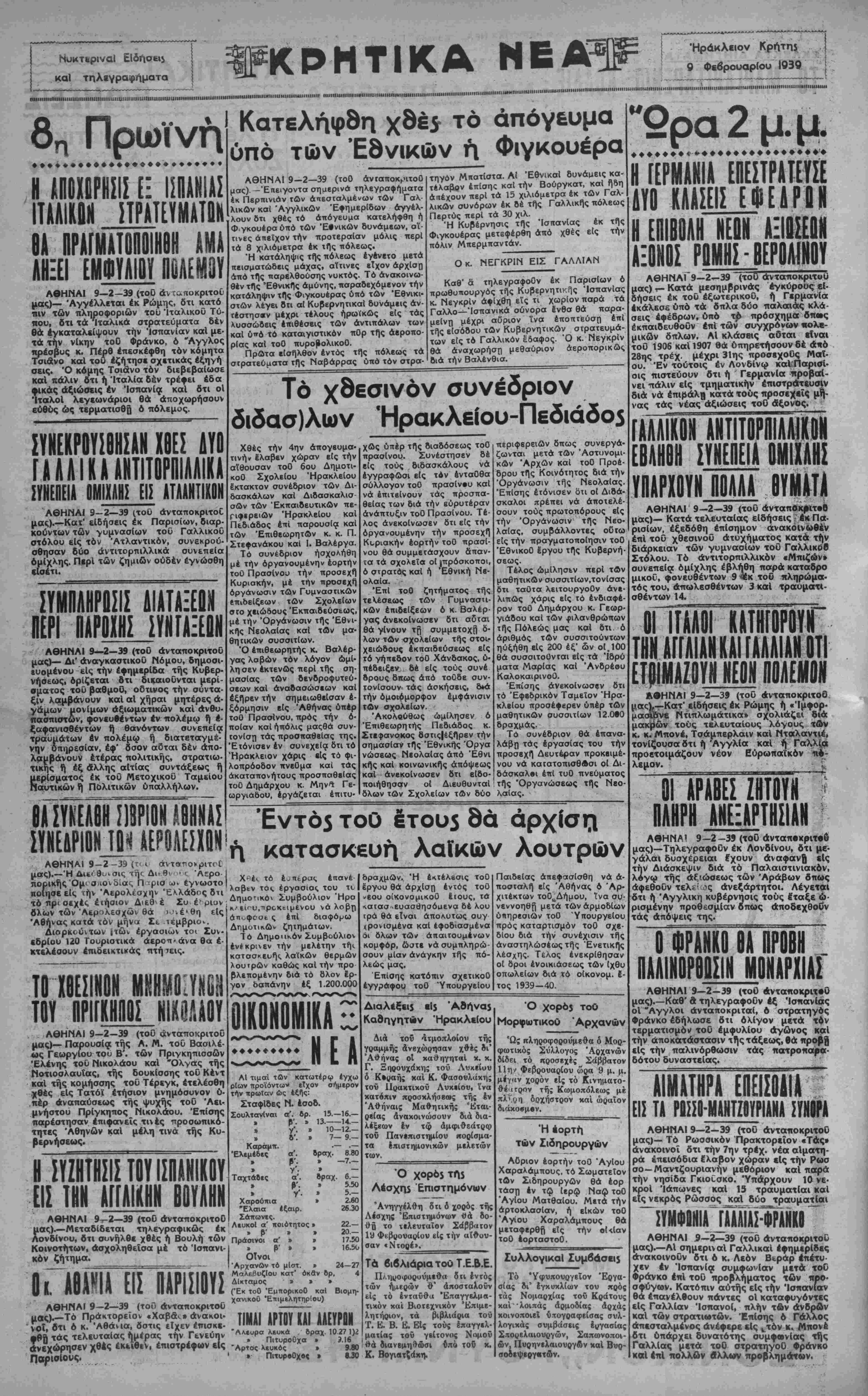 ΑΘΗΝΑΙ 9—2—39 (τοΟ ανταποκριτού