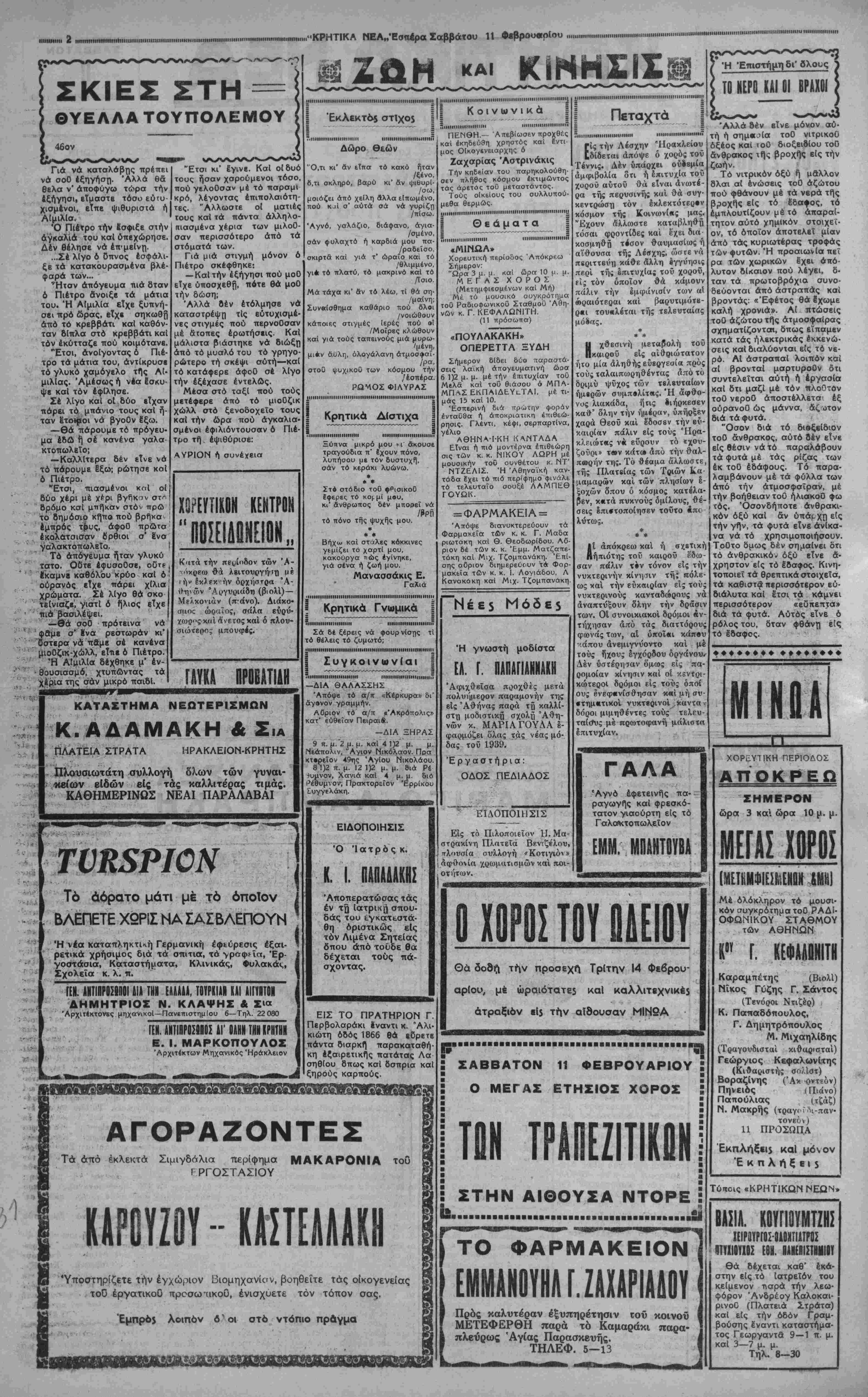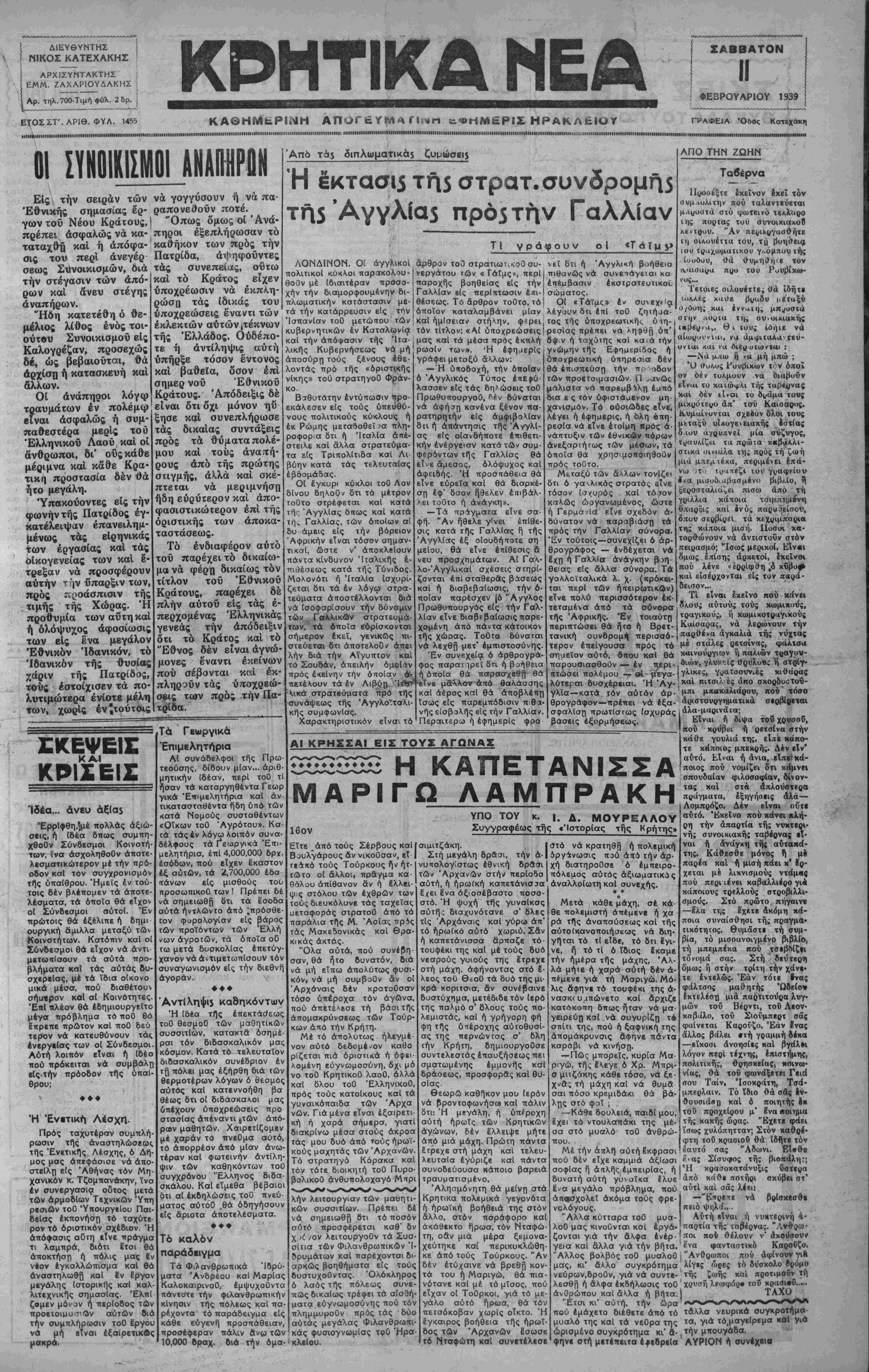 ρωση τ<*ς Ιδικός του υποχρεώσεις έναντι των εκλεκτών αυτών ^τέκνων τής Ελλάδος. Ουδέπο¬ τε ή άντίληψις αύτη υπήρξε τόσον έντονος και βαθεΐα, όσον επί Άπό τά$ 3ιπλωματικά$ Ή Ικτασΐ5τη5 στρατ. συνδρομή Αγγλία5 πρ05την Γαλλίαν ΤΙ γράφουν οΐ «Τ ά Τ μ $» ΛΟΝΔΙΝΟΝ. 01 αγγλικοί άρθρον τοΟ στρατιωτικού συ- νεΐ δτι ή "Αγγλική βοήθεια πολιτικοί κύκλοι παρακολου-1 νεργάτου τών «Τάΐμς», περί θοΟν μέ Ιδισιτέραν πρόσο-|παροχής βοηθείας είς τήν χήν την διαμορφουμένην δι- Γαλλίαν είς περίπτωσιν έιτι- πλωματικήν κατάστασιν με¬ τά τήν κατάρρευσιν εις τήν θέσεως. Το άρθρον τοΟτο, τό ό πιθανώς νά έπέμβασιν σώματος. ΟΙ «Τάϊμς» συνε^άγειαι κα εκστρατευτικού ρρ μ όποιον καταλαμβάνει μίαν λέγουν δη έπί έν συνεχ^'α τοΟ ζηιήαα ΑΠΟ ΤΗΝ ΖΩΗΝ Ταβέρνα Ηροοέξτε ίχεΐνον έχει τον συμ.ιυλιτην πού ταλαντεύεται μΛγυοτά στο φωτεινό τελλίιοο ι ης πυρτας τυύ συνοικιακοί κε^βυυ. "Αν πει/ΐΜ/γασΰήτε ιΐ| σίΛυυέττα του, τ ι] βυηϋεια ΐυυ τραχωματιχου γκόμπυυ τής ΐουόυυ, ·ί^ά ^υμηί^ήιε τον ίναισα^α π^υ του Ρουβίκω- νος... Τέτοιες σιλονέτιε, ί*ά ίδήτβ ΐιιλλες χα)Β ρίςιαδυ ι,έίαξύ και ένναΐη, μπ^υσιά σημερ νου Εθνικού των είς Έθνικόν Ίδανικάν Κράτους. Άπόδειξις δέ είναι δτιδχι μόνον η<3 ξησε καί συνεπλήρωσε τάς δικαίας συντάξεις προς μου ρους τά θύματα πολέ- τούς άνα/ϊή- τής πρώτης και άπό στιγμής, άλλα καί σκέ¬ πτεται νά μεριμνήση ήδη εύρύτερον καί άπο- φασιστικώτερον έπί τής οριστικής των αποκα¬ ταστάσεως. Τό ενδιαφέρον αυτό τοϋ παρέχει τό δικαίω¬ μα νά φερη δικαίως τόν τίτλον τοϋ Έ&νικοϋ δέ έ- περχομένας Έλληνικάς γενεάς τήν άπόδειξιν δτι τό Κράτος καί τό "Εθνος δέν είναι αγνώ¬ μονες έναντι εκείνων πού σέβονται καί έκ- πληρούν τάς ύποχρεώ- σβις ταιν προς τήν Πα¬ τρίδα. "Ισπανίαν του μετώπου τών [και ήμίσειαν στήλην, φ?ρει τος τής υποχρεωτικής ύτη-|ΟΙΙ'ν κυβερνητικών έν Καταλωνίσ. τόν τίτλον: «Αϊ υποχρεώσεις ] ρεσίας πρέπει νά ληφθη ύπ' και τήν άπόφασιν τής Ίτα- ( μας καί τά μέσα προς έκπλή δψ.ν ή τσχύίης κσί καιά τήν ρωοίν των». Ή έφηαερίς γνώμην τής γράφει μεταξύ άλλων: λικής Κυβερνήσεως νά μή άποσύρη τους ξένους έθε- λοντάς πρό τής «δριστνκής Φ Κράτους, παρέχει πλην αυτού εις τάς έ Έλλ ΣΚΕΨΕΙΣ ΚΑΙ ΚΡΙΣΕΙΣ Ίδέα... άνευ άξ(α$ Έρρίφθη,'μέ πολλάς αξιώ¬ σεις, ή ίδέα δπως συμπη- χθοΟν Σύνδεσμοι Κοινοτή¬ των, ϊνα ασχοληθούν άποτε- λεσματικώτερον μέ τήν πρό- οδον καί τόν συγχρονισμόν τής υπαίθρου. Ήμεϊς έν τού¬ τοις δέν βλέπομεν τά αποτε¬ λέσματα, τά όποια θά εΐχον οΐ Σύνδεσμοι αυτοί. Έν πρώτοις θά εξέλιπε ή δημι ουργική άμιλλα μεταξύ τών Κοινοτήτων. Κατόπιν και οί Σύνδεσμοι θά εΐχον νά άντι μετωπίσουν τά αυτά προ¬ βλήματα καί τάς αύτάς δυ- σχερβίας, μέ τά ϊδια οίκονο μικά μέσα, πού διαθέτουν σήμβρον καί αϊ Κοινότητες. Έπί πλέον θά έδημιουργεΐτο μέγα πρόβλημα τό ποΟ θό Ιπρβπε πρώτον και ποΟ δεύ τερον νά κατευθύνουν τάς ένεργβίσς των οί Σύνδεσμοι. Αυτή λοιπόν είναι ή ίβέα πού πρόκειται νά συμβάλη βίςτήν πρόοδον τής ύπαί θρου; ν ♦♦♦ Ή Ένιτικη Προς ταχυτέραν συμπλή- ρωσιν τής αναστηλώσεως τής "Ενετικής Λέσχης, ό Δή¬ μος μας απεφάσισε νά άπο- στβίλη είς Αθήνας τόν Μη- χανικόν κ. Τζόμπανάκην, ίνα έν συνεργασία οδτος μετά Ι τών αρμοδίων Τεχνικών Ύπη ρβσιών τοΟ Υπουργείου Παι- ββίας εκπόνηση τό ταχύτε- ρον τό όριστικόν σχέδιον. Ή άπόφασις αΟτη Εΐνε πράγμα τι λαμπρά, διότι Ετσι θά άποκτήσρ ή πόλις μας Ιν νέον έγκαλλώπισμα καί θά αναστηλωθώ και 8ν έργον μεγάλης Ιστορικής και καλ λιτεχνικής σημασίας. 'Ελπί ζομεν μόνον ή περίοδος τών