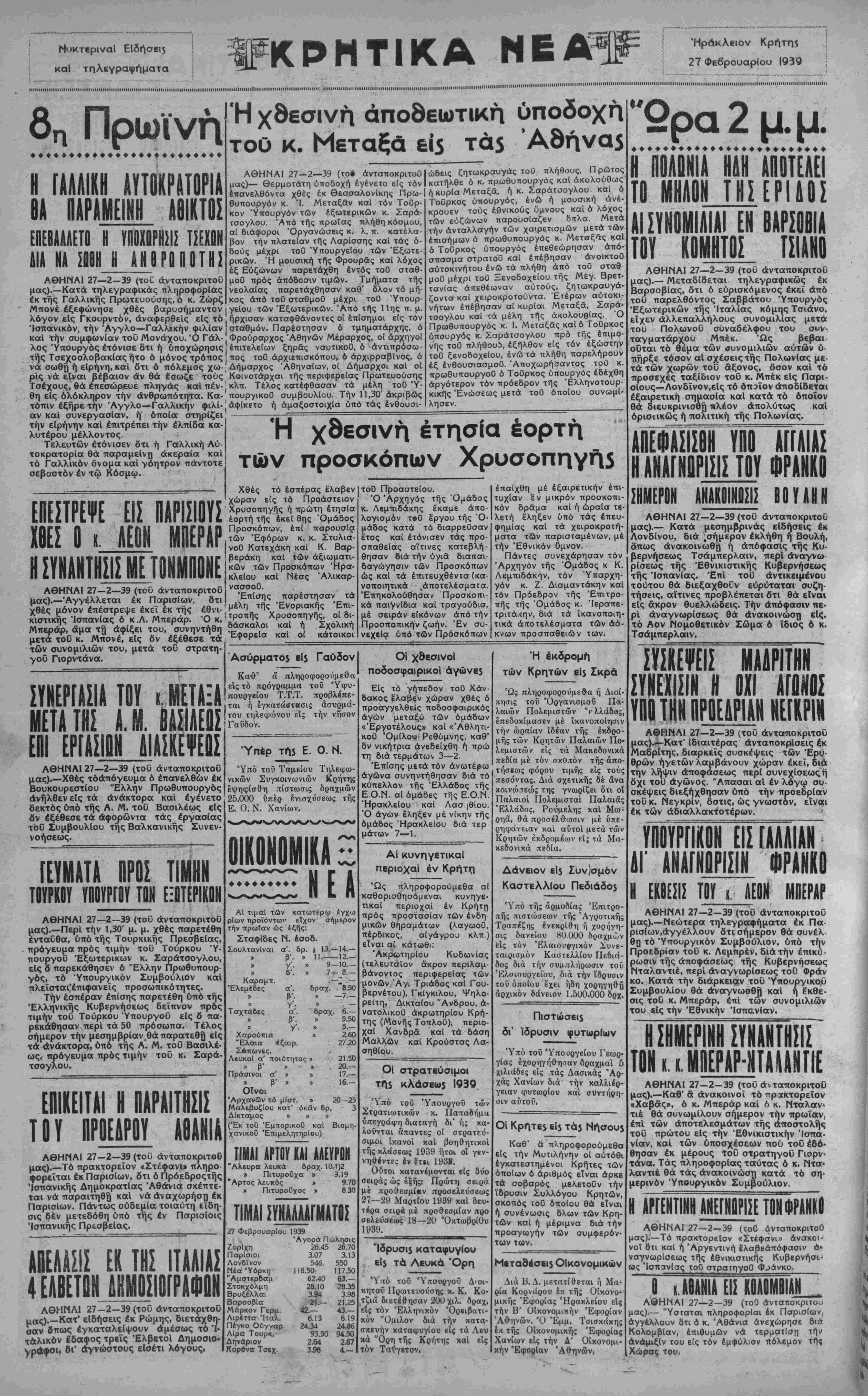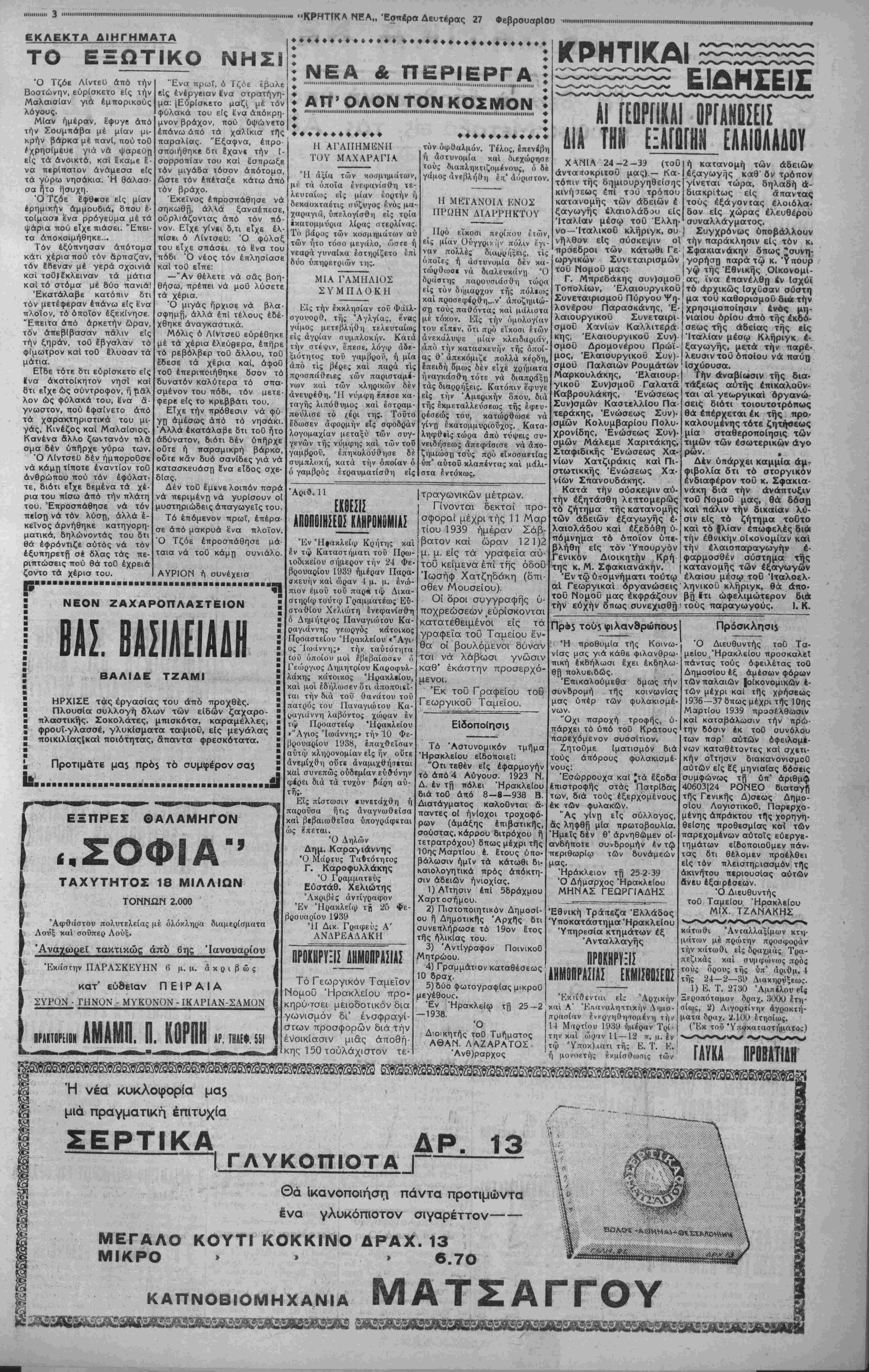 ΑΘΗΝΑΙ 27—2—39 (τοΟ ανταποκριτού