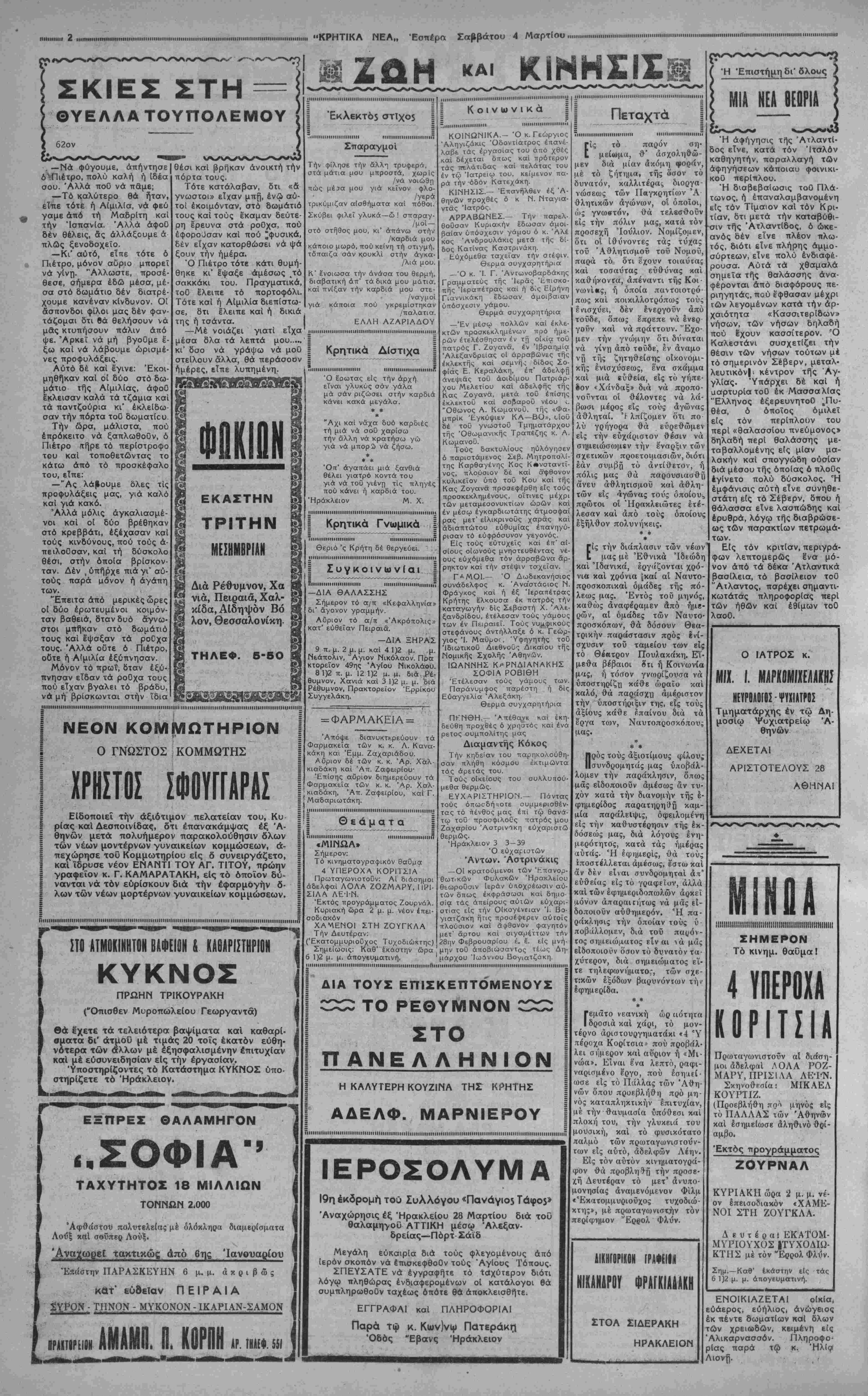 Μεταδίδεται έ< Γιβραλτάρ δτι έχουν συγκεντρωθη έκεΐ άνω τών 100 "Αγγλικά πολεμικά τών μοιρών τής Μεσογείου καί Άτλαντικοϋ. Έξ άλ,λου 50 "Αγγλοι Ναύαρχοι παρέ¬ θεσαν χθες έν Λονδίνω γεΟμα προς τιμήν τοΟ νέου υπουργού συντον.σμοΰ τών "Εξο¬ πλισμών λόρδου Τσάκφηλδ. ΣΥΝΕΧΙΖΕΤΑΙ ΚΡΙΣΙΣ ΕΙΣ ΒΕΛΓΙΟΝ Κατά τηλεγραφήματα έκ Βρυξελλών ό κ. Σουνιάν καιέθεσεν τήν έντολήν, μή δυνη¬ θείς νά σχηματίση Κυβέρνησιν.'Ήδη πίστευε ται δτι θά κληθη έκ νέου ύπό του Βασιλέως ό κ. Πιερλώ, δια τόν τερματισμόν τής κυ¬ βερνητικής κρίσεως. ΑΦΙΞΙΣ ΕΠΙΦΑΝΩΝ ΓΑΛΛΩΝ "2ρα 2 μ. μ. ♦♦♦♦♦♦♦♦♦♦♦♦♦♦♦♦♦♦♦♦♦♦♦♦♦ ΑΝΕΧαΡΗΣΕ ΧΟΕΣ ΑΙΑ ΡΟΜΗΝ 0 ΣΤΡΑΤΑΡΧΗΣ [ΚΑΙΡΙίΚ ΒΑ ΑΠΟΥΣΙΑΣΗ ΕΚ ΓΕΡΜΑΝΙΑΣ ΕΠΙ ΕΠΤΑ ΠΛΗΡΕΙί ΕΒΔΟΜλ&λϊ ΑΘΗΝΑΙ 4—3—39 (τοΰ άνταποκριτοΟ μας).— Κατά μεσημβρινός πληροφορίας έκ Βερολίνου, άνεχώρησε χθες εσπέρας εκείθεν δι" Ίταλίαν δ στρατάρχης Γκαΐ- ριγκ, προτιθέμενος νά άπουσιάση είς τό έξωτερικόν έπί 7 εβδομάδας. Ό στρα¬ τάρχης Γκαίριγκ θά παραμείντ) αρχι¬ κώς έν Ρώμη έπί άγνωστον εισέτι διά¬ στημα, ακολούθως δέ θά έπισκεφθη τήν Άφρικήν καί τήν Ίσπανίαν. Καίτοι ό Γερμανικός τύπος χαρακτηρίζει τό τα¬ ξίδιον αυτό ώς ταξίδιον αναψυχής, έν τούτοις έν Λονδίνω καί Παρισίοις του αποδίδουν έξαιρε'τικήν διπλωματικήν σπουδαιότητα. ΤΐΗΠΐΡίΤΟΣ ΤΑ ΣΥΜΠΕΡΑΣΜΑΤΑ ΕΚ ΓΥΜΗΑΣΙΟΗ ΤΟΥ ΜΕΓΑΛΟΥ ΑΜΕΡΙΚΑΝΙΚΟΥ ΠΟΛΟΥ ΑΘΗΝΑΙ ί—3—39 (του άνταποκριτοδ μας).—Κατά τηλεγραφήματα έξ Ηνωμέ¬ νων Πολιτειών, περατωθέντων τών γυ¬ μνασίων του Αμερικανικού στόλου, ό Πρόεδρος Ρούζβελτ προέβη είς δηλώ- οεις περί τών αποτελεσμάτων αυτών. Καθ' α εΐπεν ή Αμερική είναι απρόσβλη¬ τος καί δύναται νά ρίψ{| , όλόκληρον τό βάρος της προς τήν πλάστιγκα τής διατηρήσεως|τής ειρήνης. ί —— ΤΗΝ Μ Ε Γ Α Λ Η Η ΒΡΕΤΤΑΗ ΙΑ Ν ΑΙΑ ΤΟΝ Β0ΜΒΑΡΑΙ2Μ0Ν ΧΟΓΚΚΟΓΚ ΑΘΗΝΑΙ 3—4—39 (τοΰ άνταποκριτοΟ ' μας).—Κατά τηλεγραφικάς άνταποκρί* ' σεις'έκ τής "Απω "Ανατολής ή Ιαπωνία έδέχθή να αποζημίωση τήν Μ. Βρεττα- νίαν διά τόν βομραρδισμόν του Χόγκ— Κόγ,κ. Επίσης επιτροπή, σταλεΐσα έκ Τό¬ κιο υπέβαλε αϊχησιν συγγνώμης είς τδν "*-'-"'— διοικητήν τοΰ Χόγκ—Κόγκ. ΠΡΟΣ [Χ ΕΤΑ1Ν ΑΝΑΧΙ Σ ΑΙΑ ΜΠ ΡΕΙ ΙΥΡίΚΟΣ "Αφίχθησαν χθες ενταύθα, γενόμενοι εν¬ θουσιωδώς δεκτοί, οί επιφανείς Γάλλοι κ. κ. Πισσό και Ντελαός, Πρόεδροι τών Γάλλων Παλαιών Πολεμιστών. Πόση ή έξαχθείσα ποσότη5 ΑΘΗΝΑΙ 4—3—39 (τοΰ ανταποκριτού μας).— ΑΙ σημεριναι ΓαλλικαΊ έφημερί· 1 δες άγγέλλουν δτι ό στρατάρχης ΠεταΙν θά αναχώρηση διά ΜποΟργκος τήν προ¬ σεχή εβδομάδα, συνοδευόμενος ύπό τοΰ κ. Ζ(ζ, ώς εμπορικού ακολούθου. Ό Έ- ιθνικός Ισπανικός τύπος πλέκει ^τό έγκώ- μιον τοΰ στρατάρχου, ύπενθυμίζων δτι είναι δ ελευθερωτής τοΰ Ισπανικοί) με¬ τώπου έκτων ορδών τοΰ "Αβ—δέλ—Κρίμ. σταφίδων κατά τό λήξαν 6μηνον||[Α ΣΥ ΡΥΒΜΙΣ Συμφώνως προς τά παρε¬ χόμενα στοχεϊα, ή εξαγωγή σταφιδοκάρπου, κατά τό ά¬ πό 1ης Σεπτεμβρίου 1938 μέχρι 10ης Φεβρουαρίου 1939 χρονικόν διάστημα ά- νήλθεν είς Λ.Ε. 126.302.293 έναντι 113.744.821 τοΟ 1937 —38 και 136.089 070 τοΟ 1936 —37. Έκ παραλλήλου ή εξαγω¬ γή σταφιδοκάρπου κατά τό αυτό χρονικόν διάστημα ά- νήλθεν εις Λ.Ε. 64.777.657 έναντι 93 394 026 τοΟ 1937 -38 καί 77.338 363 του 1936 —1937. Άφ" ετέρου ή κίνησις τών ενεχύρων σταφιδοκάρπου παρουσιάζει ύπόλοιπον Λ.Ε. 1.537.488 Ιναντι 6.373.249 του 1937—38 καί 6.426 573 1936-37. Είς τήν σταφιδαγοράν Λον δίνου έσημειώθη ή κάτωθι έπί σταφίδων κίνησις: ΚΟΡΙΝΘ1ΑΚΑ1 ΣΤΑΦΙΔΕΣ Ελλάδος.— Ή μέχρι τοΟδε επικρατήσασα απρα¬ ξία επί τών ελληνικών Κο¬ ρινθιακών έξηκολούθησε και κατά τό 1Οήμερ·ν τούτο, κατά τό όποιον ελάχισ