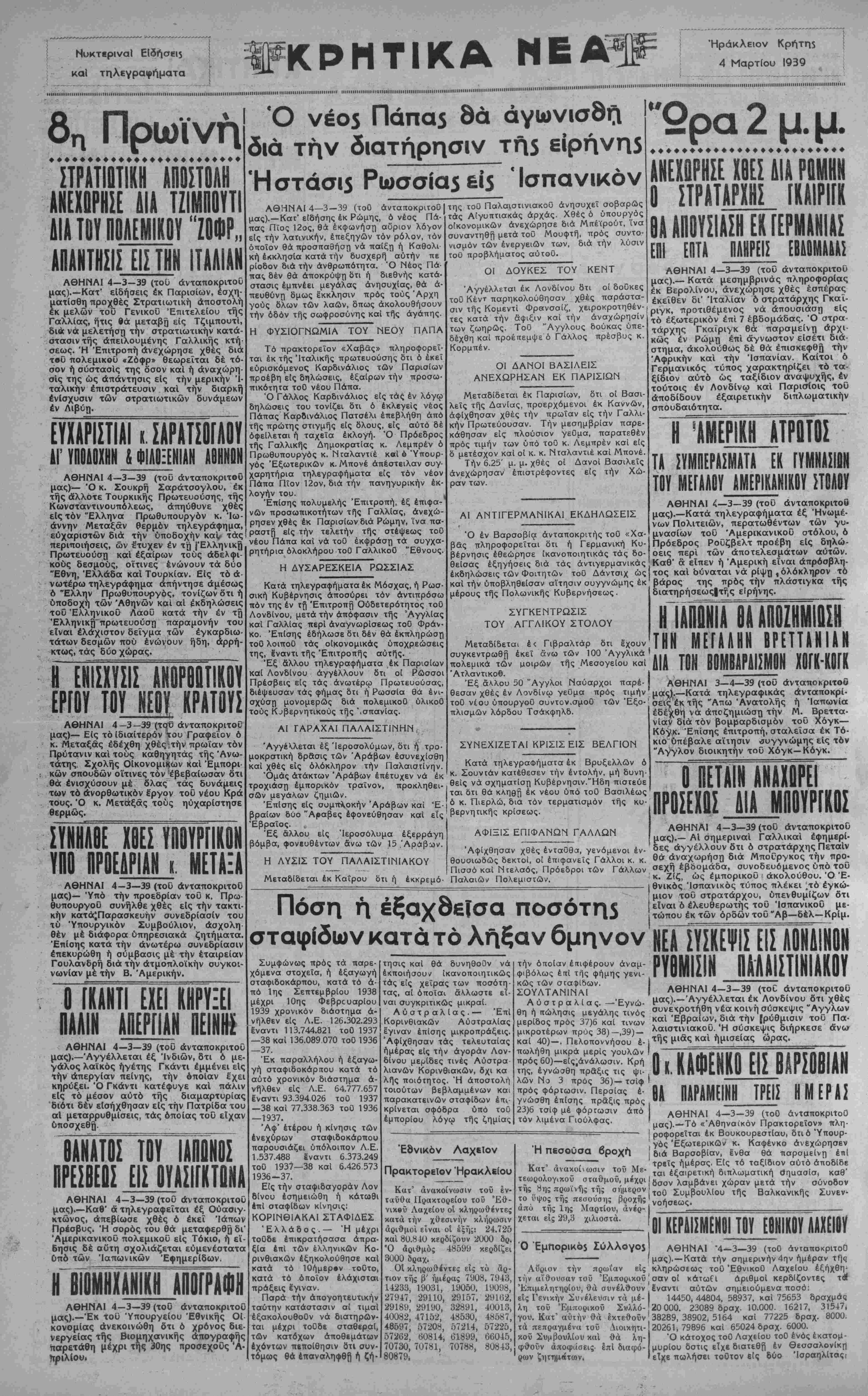 ΑΘΗΝΑΙ 4—3—39 (τοΰ άνταποκριτοΰ