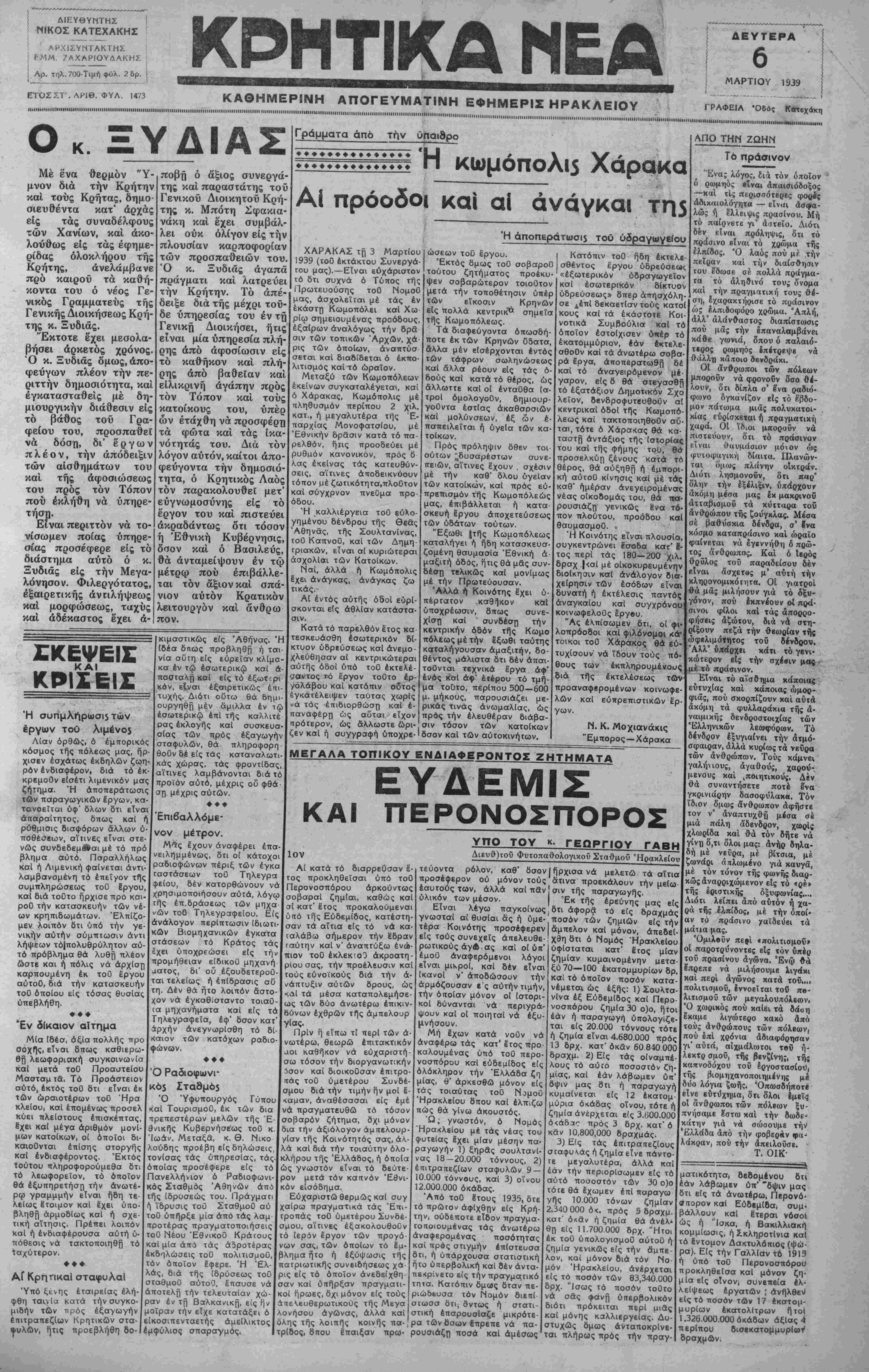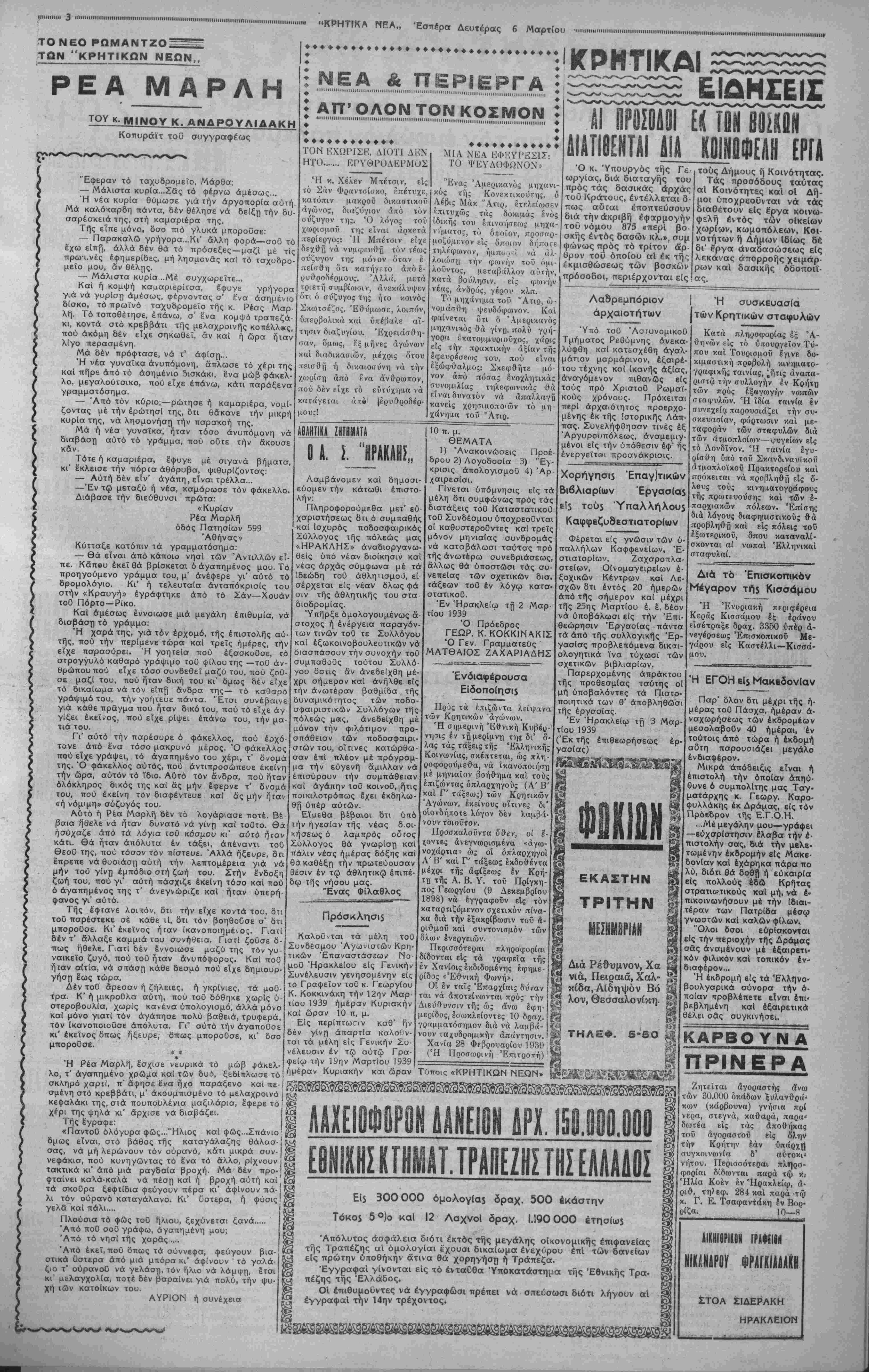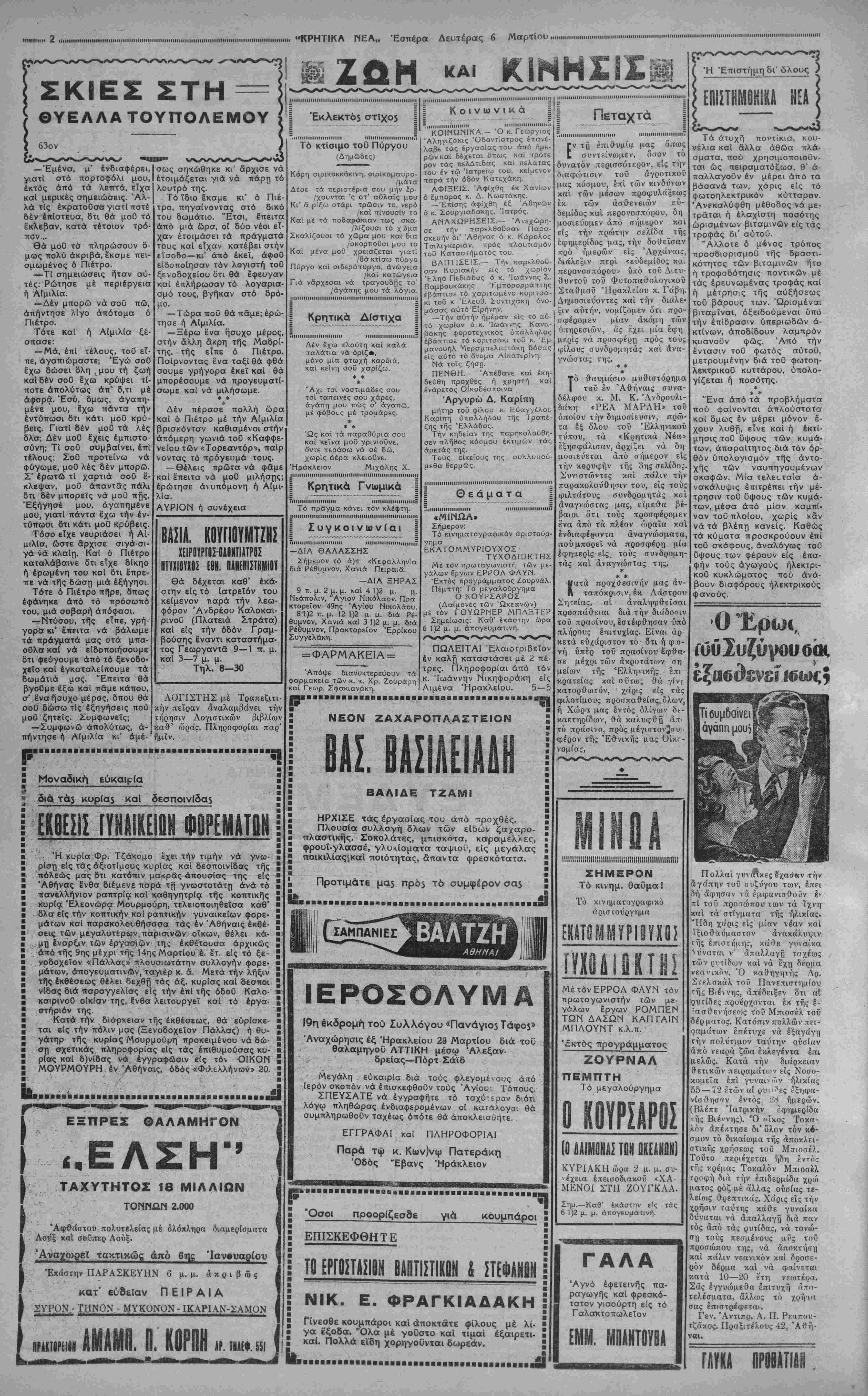 δ<τον και ό Βασιλεύς, θα ανταμείψουν έν τφ μέτρω πού επιβάλλε¬ ται τον άξιον και σπά· νιον αυτόν Κρατικόν λειτουργόν και άνθρω πον. Γράμματα άπό τήν ύπαιθρο ::::::::::::::: Ή κωμόπολη Χάρακα ΑΙ πρόοδοι και αϊ άνάγκαι τη5 Ή αποπεράτωση τοΰ ύ5ραγωγ6ίου ΣΚΕΨΕΙΣ ΚΑΙ ΚΡΙΣΕΙΣ Ή συπμλιΊρωσι$ των έργων τοϋ λψένο$ Λίαν ορθώς, ό εμπορικός κόσμος τής πόλεως μας, ήρ· χισεν εσχάτως έκδηλων ζωη- ρόν ενδιαφέρον, δια τό έκ- κρβμοΟν είσέτι λιμενικόν μας ζήτημα. Ή άποπεράτωσις τάν παραγωγικών έργων, κα¬ τανοείται ύφ' δλων 8τι εΐνσι απαραίτητος, 6πως και ή ρύθμισις διαφόρων άλλων ύ· ποθέσβων, αϊτινες είναι στε- νώς συνδεδεμΛαι μέ τό τιρό βλήμα αυτό. Παραλλήλως καΐ ή Λιμενική φαίνεται αντι¬ λαμβανόμενη τό επείγον τί|ς συμπληρώσεως τοΟ έργου, καΐ διά τοΟτο ή'ρχισεπρο και- ροΟ τήν κατασκευήν τών νέ¬ ων κρηπιδωμάτων. Έλπίζο- μεν λοιπόν 8τι Οπό τήν γε- νικήν αυτήν σύμπτωσιν άντι λήψεων τό|πολυθρύλητον αυ¬ τό πρόβλημα θά λυθη πλέον ώστβ και ή πόλις νά άρχίση καρπουμένη έκ τοϋ έργου αύτοΟ, διά τήν κατασκευήν τοΟ οποίου είς τόσας θυσίας υπεβλήθη. ♦ ♦♦ "Εν δίκαιον αίτημα Μία Ιδέα, όξΐα πολλής προ σοχής, είναι 8πως καθιερω- θη λεωφοριακή συγκοινωνία καΐ μετά τοΟ Προαστείου Μασταμτά. Τό Προάστειον αυτό, εκτός τοΟ δτι είναιέκ ίών ωραιότερων τοΟ "Ηρα κλείου, και επομένως προσελ κύει πλείστους έπισκέπτας, έχει καί μέγα αριθμόν μονί¬ μων κατοίκων, οί όποιοι δι- καιοΟνται επίσης στοργής καί ενδιαφέροντος. Έκτος τούτου πληροφορούμεθα οτι τό λεωφορείον, τό όποιον θά εξυπηρέτηση τήν άνωτέ- ρφ γραμμμήν είναι ήδη τε¬ λείως έτοιμον καί έχει ύπο- βληθη αρμοδίως καί ή σχε¬ τική αίτησις. Πρέπει λοιπόν καί ή ενδιαφέρουσα αυτή ΰ- πόθεσις νά τακτοποιηθη τό ταχύτερον. ♦ ♦♦ ΑΓ Κρητικοί σταφυλαΙ "Υπό ξΐινης εταιρείας ελή¬ φθη τααία κατά τήν συγκο- μιδήν τών ηρός έξαγωγήν έπιτραπεζίων Κρητικών στά¬ βλων, ήτις προεβλήθη δθ· κιμαστικώς είς Αθήνας. Ή Ιδέα 8πως προβληθη ή ται νια αϋΐη είς εύρεΐαν κλίμα· κα έν τώ έσωτερικώ καϊ ά ποσταλη καϊ είς τό έξωτ-ρι κόν, είναι εξαιρετικώς έπι τυχής. Διότι οϋτω θά δημι ουργηθη μέν άμιλλα έν ιώ εσωτερική έπί τής καλλιτέ ρας εκλογής καί συσκευα σίας τών προς έξαγωγήν σταφυλών, θά πληροφορη θοΟν δέ είς τάς καταναλωτι κάς χώρας, τάς φροντίδας αϊτινες λαμβάνονται διά τό προϊόν αυτό, μέχρις ου φθά ση μέχρις αυτών. ♦ ♦♦ Έπιβαλλόμε- νον μέτρον. Μ'ϊς έχουν αναφέρει έπα νειλημμένως, 8τι οί κάτοχο ραδιοφώνων πέριξ τών έγκα ταστάσεων τοΟ Τηλεγρα φείου, δέν κατορθώνουν νά χρησιμοποιήσουν αυτά, λόγω τής έπ.δράσεως τών μηχ^α νών τοΟ Τηλεγραφείου. Είς άνάλογον περίπτωσιν ιδιωτι¬ κών Βιομηχανικών έγκατα στάσεων τό Κράτος τάς έχει υποχρεώσει είς τή>