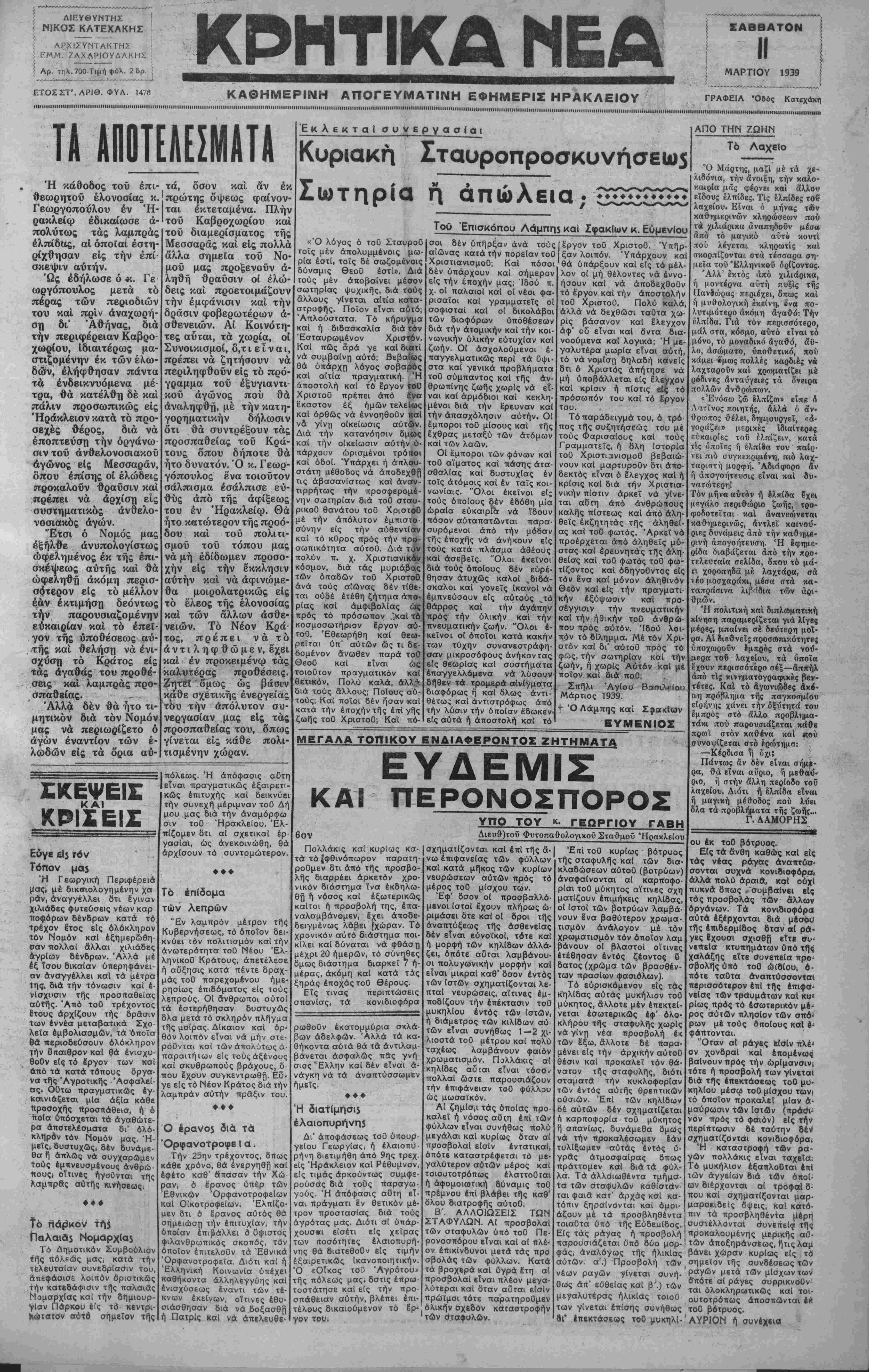 |Ι|ΙΙΙΙ||ΙΙΙΙΙΗΙΙΙΙΙΙΙΙΙ·<ΙΙΙΙΙΙ··ΙΙ·ΙΙ·4Η·ΗΙΙ·ΙΙΙΙΙΙΗΙΙΙΙ·ΙΙΙΙΙΙΜΙΙΙΙΙΙ·ΙΙΙΙΙΙΙΙΙΙΙΙΙΙΙΙΜΙΙ1ΙΙΗ^ ΤΑ ΑΠΟΤΕΛΕΣΜΑΤΑ Ή κάθοδος τοϋ επι¬ θεωρητού ελονοσίας κ. Γβωργόποϋλου έν Ή- ρακλείφ έδικαίωσε ά- πολύτως τάς λαμπράς ελπίδας, αί όποϊαι έστη- ρίχθησαν εις τήν έπί· σκβψιν αυτήν. Ώς έδήλωσε ό *ο. Γε ωργόπουλος μετά το πέρας των περιοδιών του και πριν άναχωρή- ση δι' Αθήνας, δια τήν περιφέρειαν Καβρο χωρίου, ιδιαιτέρως μα- στιζομένην έκ των έλω- δών, ελήφθησαν πάντα τα ενδεικνυόμενα μέ¬ τρα, θα κατέλθη δε και πάλιν προσωπικώς εις Ήράκλειον κατά το προ¬ σεχές θέρος, διά νά επόπτευση την όργάνω σιντοΰ άνθελονοσιακοϋ αγώνος είς Μεσσαράν, δπου επίσης οι έλώδεις προκαλούν θραϋσιν και πρέπει νά άρχίση είς συστηματικός άνθελο- νοσιακός άγων. "Ετσι ό Νομός μας εξήλθε άνυπολογίστως ωφελημένος έκ της επι¬ σκέψεως αυτής και θά ώφεληθη ακόμη περισ- σότερον είς το μέλλον έάν εκτίμηση δεόντως τήν παρουσιαζομένην εύκαιρίαν καΐ το επεί¬ γον της υποθέσεως αύ της και θελήση νά ένι- σχΰση το Κράτος είς τάς άγαθάς του προθέ¬ σεις και λαμπράς προ- σπαθβίας. Άλλα δεν θά ήτο τι μητικόν διά τον Νομόν μας νά περιωρίζετο ό άγων εναντίον των έ- λωδών είς τα δρια αύ τά, δσον καΐ ά*ν έκ πρώτης όψεως φαίνον¬ ται εκτεταμένα. Πλην τού Καβροχωρίου και τού διαμερίσματος τής Μεσσαράς και είς πολλά άλλα σημεία τού Νο¬ μού μας προξενούν α¬ ληθή θραύσιν οί έλώ¬ δεις και προετοιμάζουν τήν έμφάνισιν και τήν δράσιν φοβερωτέρων α¬ σθενειών. Αί Κοινότη¬ τες αΰται, τά χωρία, οί Συνοικισμοί, δ,τ ι ε ί ν α ι, πρέπει νά ζητήσουν νά περιληφθούν είς το πρό¬ γραμμα τού εξυγιαντι¬ κού αγώνος πού θά άναληφθή, με τήν κατη- γορηματικήν δήλωσιν οτι θά συντρέξουν τάς προσπαθείας τού Κρά¬ τους δπου δήποτε θά ήτο δυνατόν. Ό κ. Γεωρ- γόπουλος ένα τοιούτον σάλπισμα έσάλπισε ευ¬ θύς άπό τής άφίξεως του έν Ήρακλείω. Θά ήτο κατώτερον τής προό¬ δου και τοΰ πολιτι¬ σμού τού τόπου μας νά μή έδίδωμεν προσο- χήν είς τήν £κκλησιν αυτήν και νά άφινώμε- θα μοιρολατρικώς είς το έλεος τής ελονοσίας και τών άλλων ασθε¬ νειών. Το Νέον Κρά τος, πρέπει νά το άντιληφθώμεν, έχει και έν προκειμένω τάς καλυτέρας προθέσεις. Ζητεί δμως ώς βάσιν κάθε σχετικής ενεργείας του τήν απόλυτον συ- νεργασίαν μας είς τάς προσπαθείας του, δπως γίνεται είς κάθε πολι- τισμένην χώραν. Έ κ λ ε κ τ α Ι συνεργασία! Κυριακή Σταυροπροσκυνήσεω5 Σωτηρία ή απώλεια,· 2 ♦♦♦♦♦♦♦♦♦♦ Τοΰ Επισκόπου Λάμπη$ καΐ Σφακίων κ. Εύμενίου «Ό λόγος ό τοΰ ΣταυροΟ τοις μέν άπολυμμένοις μω¬ ρία εστί, τοις δέ σωζομένοις δύνσμις ΘεοΟ εστί». Διά ιούς μέν αποβαίνει μέσον σωτηρίας ψυχικές, διά τους άλλους γίνεται αίτια κατα- τροφής. Ποίον είναι αυτό; Απλούστατα. Το κήρυγμα <αί ή διδασκαλία διά τον Έσταυρωμένον Χριστόν. ΚαΙ πώς δρά γε και διατί νά συμβαίνρ αυτό; Βεβαίως θά ύπάρχη λόγος σοβαρός και αΙτία πραγματική. "Η 'ίποστολή και τό έργον τοΟ ΧριστοΟ πρέπει άπό ίνα ε"καστον έξ ημών τελείως και ορθώς νά έννοηθοΟν και α γίνχ) οίκείωσις αύτβν. Διά τήν κατανόησιν δμως καί τήν οίκείωσιν αυτήν υ¬ πάρχουν ορισμένοι τρότϊοι καί οδοί. Υπάρχει ή απλού¬ στατη μέθοδος νά άποδΕχθβ ις άβασανίστως καί άναν- ιρρήτως τήν προσφερομέ- 'ην σωτηρίαν διά τοΟ σταυ- ρικοΟ θανάτου τοΟ ΧριστοΟ μέ τήν απόλυτον έμπιστο σΰνην είς τήν αύθεντίβν καί τό κΟρος προς τήν προ¬ σωπικότητα αύτοϋ. Διά τ<ίν πολύν π. χ. Χριστιανικ&ν κόσμον, διά τάς μυριάδας τών οπαδών τοΟ ΧριστοΟ άνά τους αιώνας δέν τίθε¬ ται ουδέ ετέθη ζήτημα