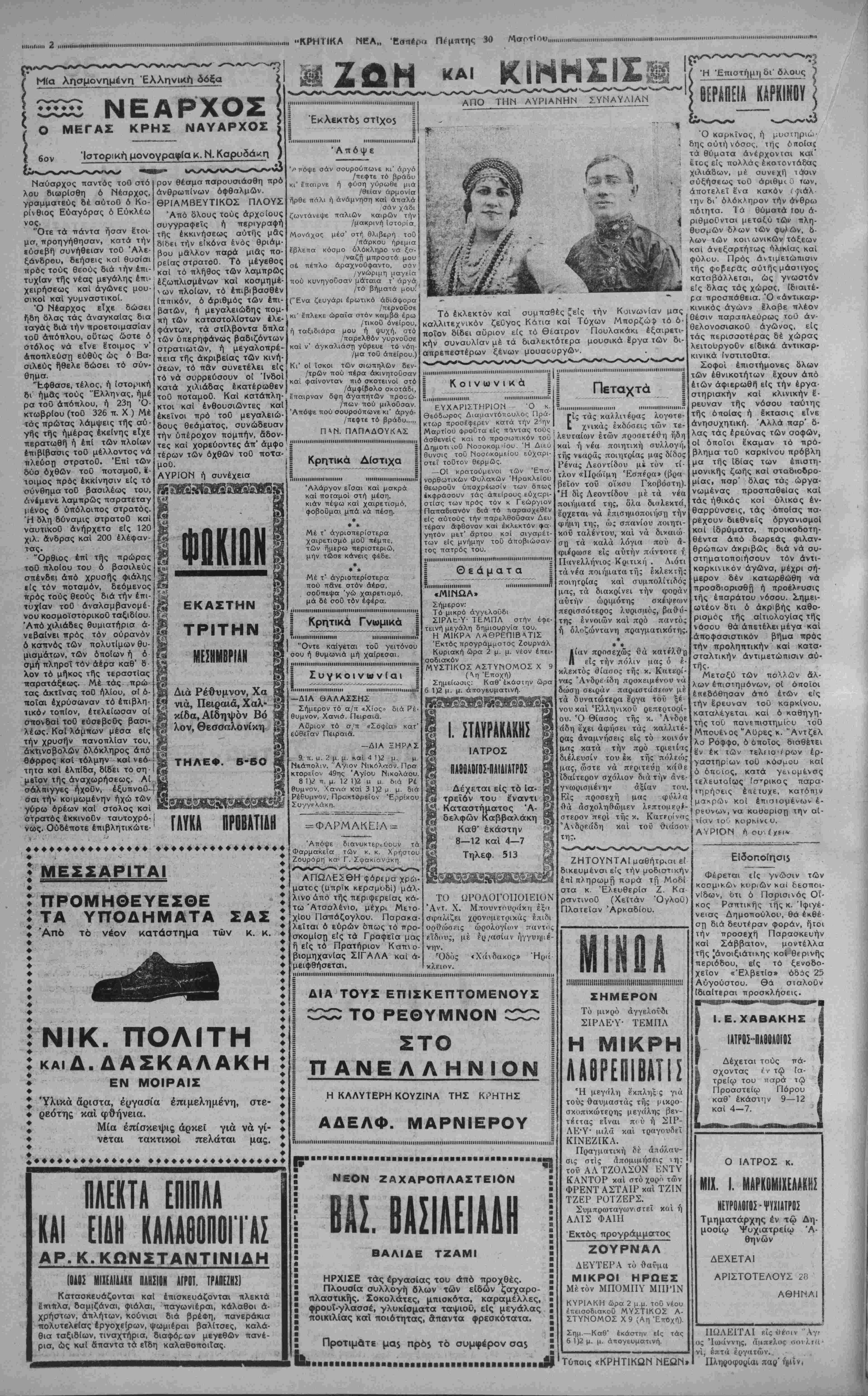 """""""""""""""".....ηΗΙ">υιι<ιιιιηιπ'ιιιιιιιιιηιιι""··ηη>"·Η·ι»···Η··ι··»·ιιι·ΗΐιιιιιιιιιιιιηιιιιιιηιιιιιιΐΜΐιιιιι·ιηιΙιιηιιιιηιι·ιιιιιι..υιιΐΜΐι·<ιιι^^ Όέπανελθών εξ 'Α- Όηνών Δήμαρχος της πόλεως μας κ. Μηνάς Γεωργιάδης, εις ανακοι¬ νώσεις του προς συνα¬ δέλφους επί των απο¬ τελεσμάτων τοϋ ταξιδι¬ ού του εις Αθήνας, εδοσε μίαν πλήρη και ζωηράν εΙκόνα του πάν¬ τοτε στοργικού και θερ¬ μού Κυβερνητικού εν¬ διαφέροντος, δια τα προ¬ βλήματα τοΰ Τόπου μας. "Ως άνεκοίνωσε ό κ. Γεωργιάδης, το πρό¬ βλημα των νέων Σχο¬ λείων δύναται να θεω- ρηθή ήδη λήξαν, κα¬ ταρτισθείσης επιτροπής έκ τοΰ κ. Νομάρχου, τοΰ άρχιτέκτονος τοΰ Υπουργείου Παιδείας και τοΰ Επιθεωρητού Μέσης Εκπαιδεύσεως Κρήτης, ήτις εντός τοΰ μηνός Απριλίου θα ύ- ποβάλχι σχετικόν σχέ- διον είς το Ύπουργείον. Επίσης απεφασίσθη ή σύστασις Ταμείου Σχε δίου πόλεως, το όποιον θα διευκολύνχ) την τα χυτέραν έφαρμογήν τοϋ οριστικού ρυμοτομικού σχεδίου. Τέλος δε επετεύχθη ή Κυβερνητική ένίσχυ σις δια την άνέγερσιν της «Στέγης Γραμμάτων και Τεχνών», τοϋ Δη¬ μοτικού Θεάτρου, την άποπεράτωσιν τοϋ Γυ μναστηρίου και την έκτε· λεσιν πλείστων άλλων έργων συγχρονισμού Η&Ι καλλωπισμού τής πόλεως. Όλα τ' ανωτέρω έ¬ χουν προφανή σχέσιν μέ την πο,όοδον τής πόλεως μας. Ή Κρατι¬ κή λοιπόν συνδρομή προς έπίτευξιν των εί¬ ναι μία ανεκτίμητος είς άξίαν έκδήλωσις στορ¬ γής τοϋ Νέου Κράτους μας προς το Ήράκλειον, τήν οποίαν, όπως και ας προηγουμένας, ύ- ποσχόμεθα να μήν λη- σμονήσωμεν. Το Ήρά· κλειον οφείλει ήδη πολ¬ λά είς το Έθνικόν Κρά¬ τος. Ή άποπεράτωσις τής διαρρυθμίσεως των Στρατώνων, ή λειτουρ¬ γία τού Αεροδρομίου Ρούσσων, ό Ασύρματος και πλείστα δσα αλλά είναι έργα του. Το νέον ενδιαφέρον του δια το Ήράκλ,ειον είναι ή ακλόνητος έπιβεβαίω- σις δτι εύχεται είλικρι- νώς και έπιθυμβΐ τήν άνύψωσιν τής πόλεως αυτής και συμβάλλει εις τήν σχετικήν προ- σπάθειαν δσον είναι δυ¬ νατόν. Πρέπει όμως να έ- ξάρωμεν και το ενδια¬ φέρον και τήν δραστη¬ ριότητα και τού κ. Γεωργιάδου, ό οποίος επί μίαν ήδη πενταε- τίαν παραμένει ό εμψυ¬ χωτής και ό πρωτερ¬ γάτης κάθε κινήσεως εκπολιτισμού, συγχρονι σμοΰ, άνυψώσεως, ανα¬ δείξεως τοϋ Ηρακλείου. Οί συνδημόται μας δεν θα έχουν ασφαλώς με¬ τανοήσει διότι ανέθεσαν εις χείρας τόσον ίσχυ- ράς τάς υποθέσεις τής πόλεως εις τήν κρισι- μωτέραν και ζωτικω- τέραν ακριβώς περίοδον δια το μέλλον της. ΕΚΕΨΕΙΕ ΚΑΙ ΚΡΙΣΕΙΣ Λαμηρόν παράδειγμα Τό Έφεδρικόν Ταμεΐον ΛασηβΙου, έφσρμόζον τόν νέον Νόμον περί «Εφεδρι¬ κών ΤσιιεΙων τής νήσου», ιϊαρέχει ε'να λαμπρόν παρά- ββιγμα εκτελέσεως τών έναν¬ τι τής Εφεδρικής Τάξεως τής περιφερείας του ύποχρε ώσεών του. Ανέγραψε είς τόν προϋπολογισμόν του νέου οίκονομικοό έτους κον- βύλιον έκ 350,000 δρχ. προς ένίσχυσιν τών οικογενειών εφέδρων Παλαιών Πολεμι¬ στών. Τό φωτεινόν αυτό ττα ράδειγμα τοΟ Εφεδρικού Ταμείου Λασηθίου έλπιζομεν οτι θά τό ακολουθήσουν και τά αλλά Εφεδρικά Ταμεία τής μεγαλονήσου, έφ' δσον είναι εκτός πάσης άμφισβη τήσεως δτι ή κυριωτέρα άπο- οτολή των εΐνσι ή δσκησις τής Κοινωνικής Προνοίας 6ιά τάς απόρους οικογε¬ νείας τών Παλαιών Πολε¬ μιστών. ♦ ♦♦ ΑΙ ΈργατικαΙ έκδρ ο μ αϊ Είναι λαμπρά ή ιδέα όπως καθιερωθοΟν αϊ έργατικαί έκδρομαί καΐ έν "Ελλάδι. Διό¬ τι ό εσωτερικός τουρισμός ευρίσκεται είς νηπιώδη κα- τάστασιν είς τήν Χώραν μας καΐ ό εργάτης πού αίσθάνε ται τήν ανάγκην ενός μικροΟ ταξιδιού αναψυχής δέν δύ νπχσι νά ϊ"[ΐ πραγματοποι- ϋυμένήν τήν ' έπι