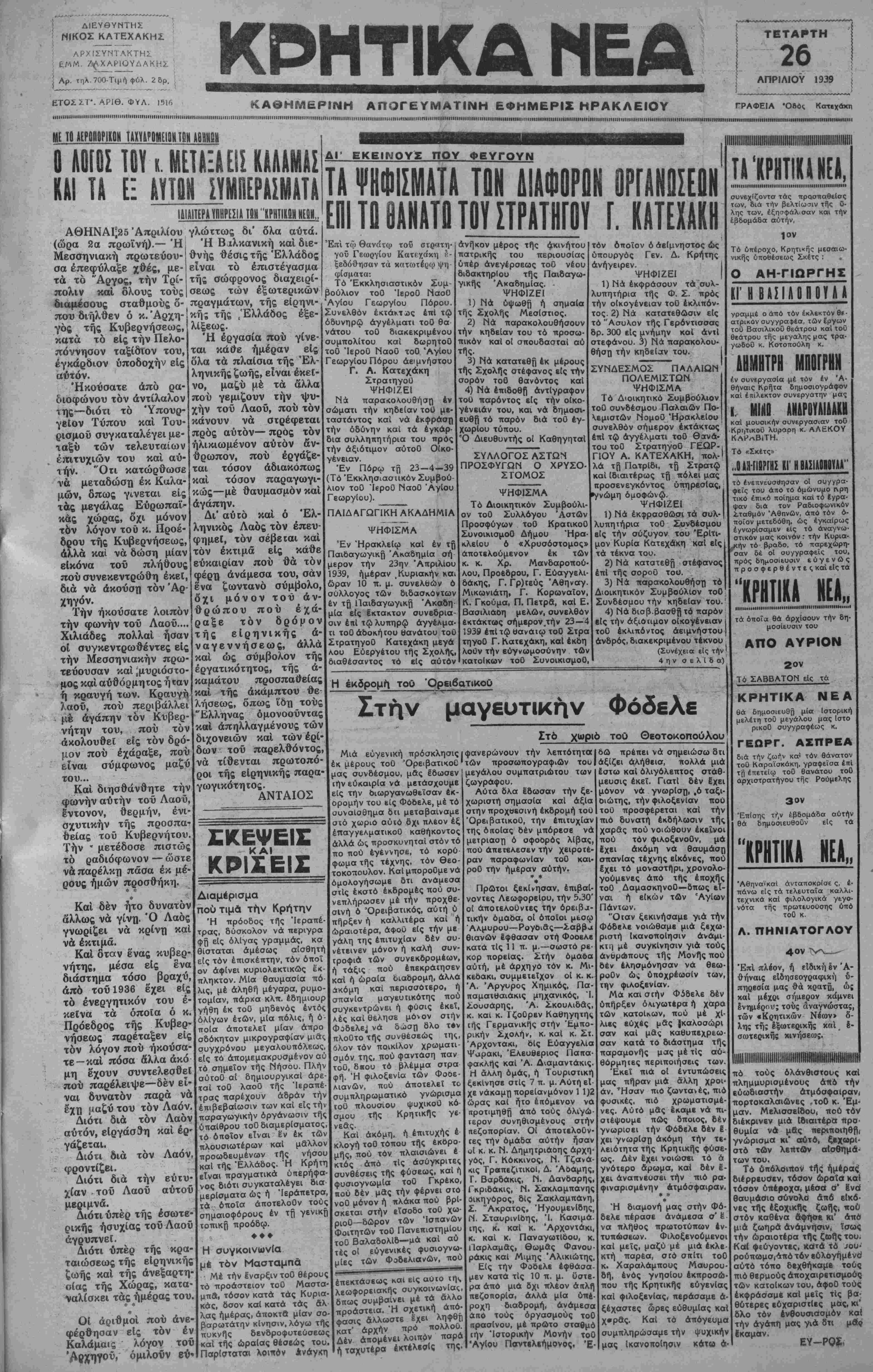 ΑΘΗΝΑΙ 26-4-39 <το0 άνταποκριτήδ μας).—Καθ' ά τηλεγραφεΐται έκ ΒρυξεΚ- λών, ό Βέλγος Πρωθυπουργός κ. Πιβρλώ έζήτησεν έξουσιοδότησιν μέχρι ΐης Δε¬ κεμβρίου τρέχ. έτους ϊνα όργαώση καΙ εξασφάλιση τήν Έθν. άμυναν τόσον έν τό Μητροπό) ει δσον καΙ τάς ^αποικίας. ΒτΠϊϊϊΠϊπΑίϊΜΓ ΤΡΙ01Ι ΚΑΤΑΑΡΟ^ΙΚΒΝ ΑΘΗΝΑΙ 26—4—39 (τοΟ άνταποκριτοΟ μσς).— Τό τιρακτορεΐον «Ρώϋτερ» άγγέλλει δτι αϋοιον Πέμπτην θά καταπλεύση ε(ς Τογγέρην τό Γερμανικόν καταδρομικόν «Λειψίσ». Είς τόν ανωτέρω λιμίνα θα κα¬ ταπλεύσουν όπό σήμερον άνά £ν 'Αγγλι- κόν καΙ Γαλλικόν καταδρομικόν, ΗΕΑ ΕΚΚΑΗΣΙΣ ΤΗ2 «ΜΕΡΙΚΗ! ΥΠΕΡ ΤΗ! ΔΙΑΤΗΡΗΤΕΟΣ ΤΗ! ΕΙΡΗΝΗΣ ΑΘΗΝΑΙ 26-4—39 (τοΟ άνταποκριτοΟ Τηλεγραφεΐται έξ "Ηνωμένων Πο>ι·