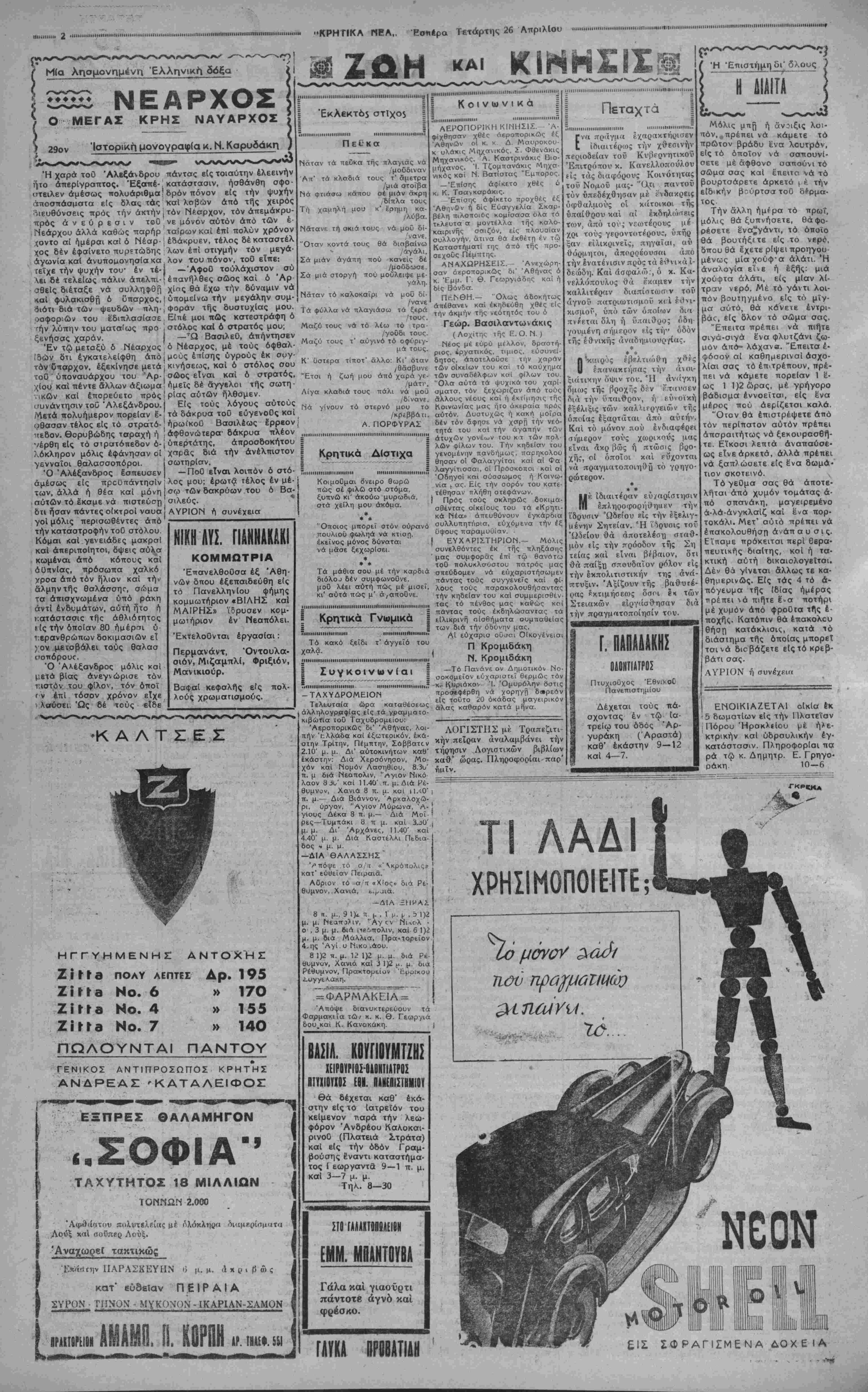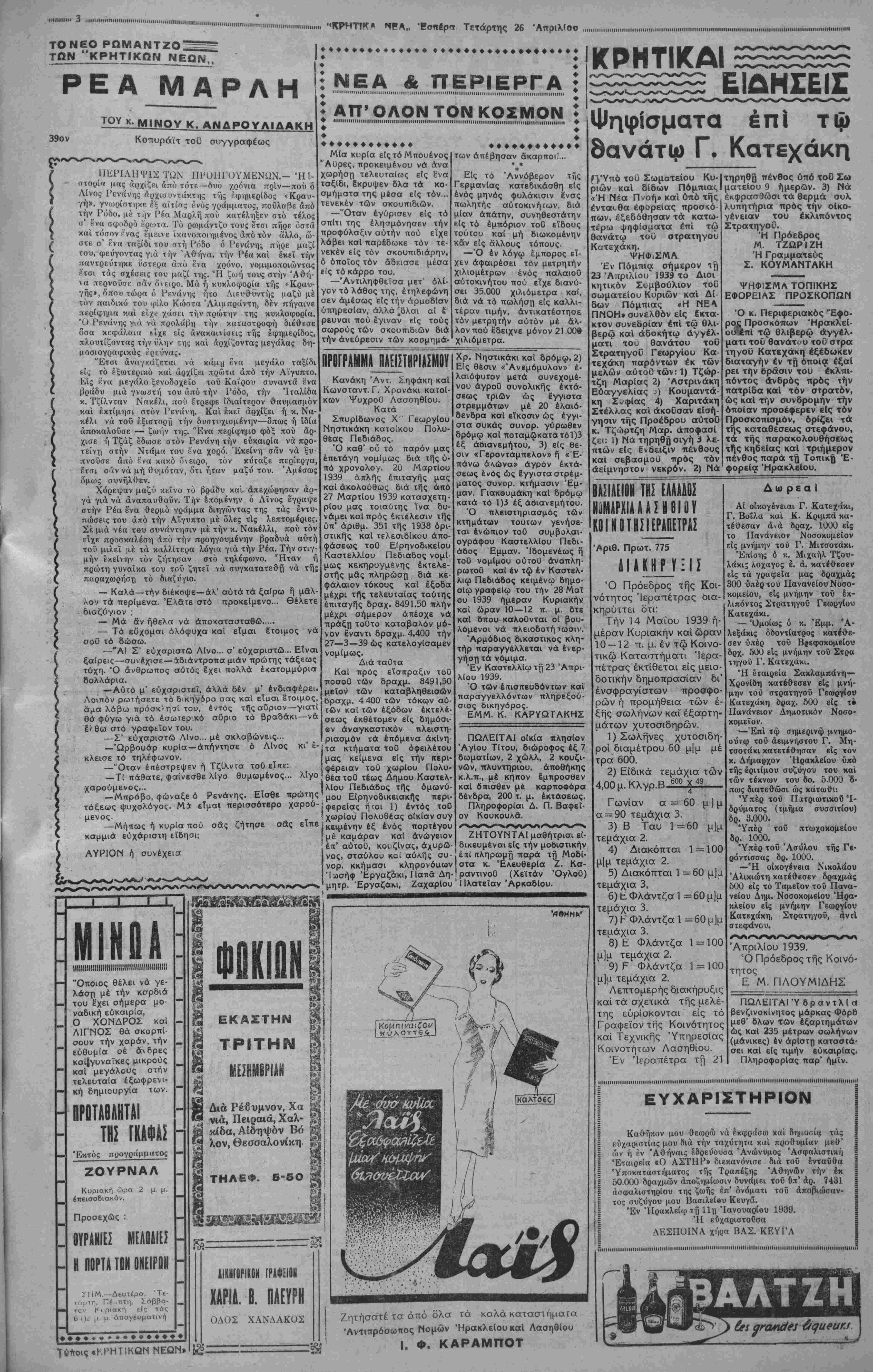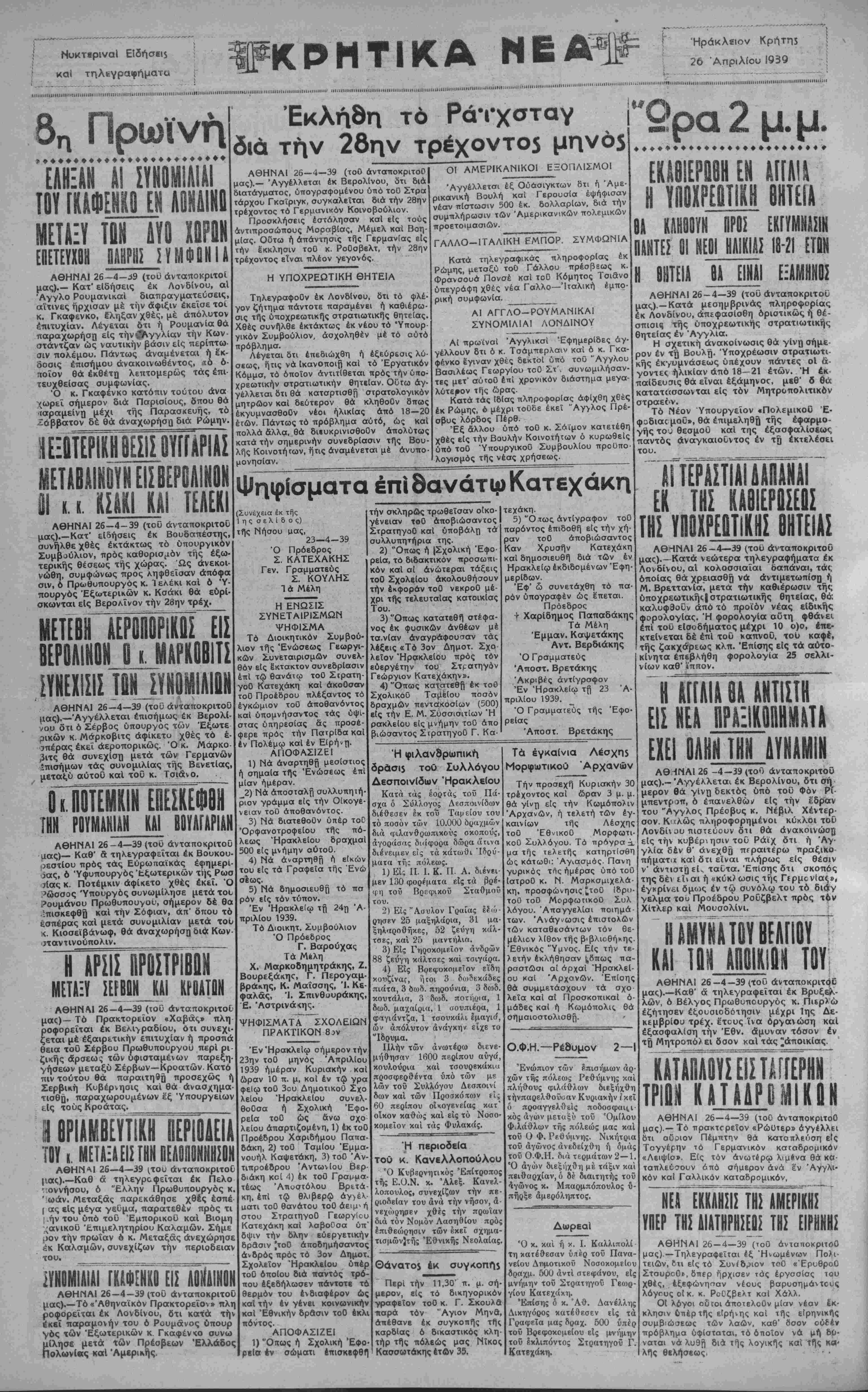 <ΓΠ τοΰ Βρεφιχοϋ Στα-Ομοΐ του. 2) Είς'Άσυλον Γραίας Ιίιι'» ρΐ|σ?ν 2δ μαξηλάρια, 31 μα ξηλαροθήκες, 52 ζεΰγη κάλ¬ τσες, καΙ 25 μαντιιλιο. 3) ΕΙς Γΐ|9οκομεΐον ανδρών 88 ζεΰγη κάλτσες και τσιγάρα. 4) Είς Βοεφοκομε'ον εϊδη κουζίνας, ηίοι 3 δ^ ά , η ς πιάτα, 3 δωδ. πηροΰνια, 3 δο)δ. κουτάλια, 3 δωδ. ποτήρια, 1 δωδ. μαχαίρια, Ι σουπιέρα, 1 φαγκίντξα, 1 τσουκάλι έμαγκί, ώ άπόλντον ανάγκην είχε το "Ιδρυμα. Πλην τών ανωτέρω διενε· μήθησον 1600 περίπου αυγά, κουλούρια και τσουρεκάκια προσφερθβντα ύπό τών με λών τοϋ Συλλόγου Δεσποΐλί δων και τών Προσκόπων ύς 60 περίπου οίκογενείας κατ' οίκον καθώς καΐ εις τό Νόσο- κομεΐον και τάς Φύλακας. Ή περιοδεία τοϋ κ. Κανελλοπούλου Ό Κυβερνητικός Επίτροπος τής Ε.Ο.Ν. κ. 'Αλεξ. Κανελ¬ λόπουλος, συνεχίζων τήν πε· ριοδβίαν του άνά τήν νήσον, α- νεχώρτμιεν χθες τήν πρω'ιαν διά τόν Νομόν Λασηθίου προς έπιθεώρησιν τών έκεΐ σχημα- τισμών2τής Εθνικής Νεολαίας. Θάνατο* έκ συγκοπϊ5 Περί τήν 11,30' π. μ. σή¬ μερον, είς τό δικηγορικόν γραφεΐον τοΟ κ. Γ. Σκουλά παρά τόν "Αγιον Μηνά, απέθανε έκ συγκοπής τής καρδίας ό δικαστικός κλη- τήρ τής πόλεως μας Νίκος {ασσωτάκης ετών 35. Τά εγκαίνια Λέσχη$ Μορφωτικού Άρχανών Τήν προσεχή Κυριακήν 30 τρέχοντος καΙ ώραν 3 μ. μ θά γίνη είς τήν Κωμόπολιν Άρχανών, ή τελετή τών έγ καιν ίων τής Λέσχη τοΟ 'ΕθνικοΟ Μορφωτι κοΟ Συλλόγου. Τό πρΛγρα ^, μα τής τελετής κατηρτίσθη ώς κάτωθι: Αγιασμός· Πανη γυρικός της ημέρας ύπό τοΟ ίατροΟ κ. Ν. Μσρκσμιχελά κη, προσφώνησις ζτοΟ ίδρο τοΟ τοΟ ΜορφωπκοΟ Συλ λόγου. 'Απσγγελίαι ποιημά των. "Ανάγνωσις επιστολών τών καταθεσάντων τόν θε· μέλιον λίθον τής βιβλιοθήκης "Εθνικός "Υμνος. Είς τήν τε- λετήν εκλήθησαν ^,βπως πα- ραστώσι αί όρχαΐ Ηρακλεί¬ ου καΙ 'Αρχσνών. Έπίοης θά συμμετάσχουν τά σχο λεία και αί Προσκοπικοί ό μάδες καΙ ή Κωμόπολις θά σημαιοστολισθη. Ο.Φ.Η.—Ρέδυμον 2—1 Ενώπιον τών Επισήμων άρ χών τής πόλεως Ρεθύμνης και πλήθους φιλάθλων διεξήχθη τήνπαρελθοϋοαν Κυριαχήν ί κει ό λθ ποδοσφαιςι Ό 2 μ. μ. ♦♦♦♦*♦♦♦♦♦♦♦♦♦♦♦♦♦♦♦♦♦♦«♦ ΕΚ& Η Υ ΕΡΟΘΗ ΕΝ ΑΙίΛΙϋ ΧΡΕΟΤΙΚΗ ΒΗΤΕΙΑ Βλ ΚΑΗ80ΥΗ ΠΡΟ! ΕΚΓΥΜΗΑΣΙΚ ΠΙΗΤΕ! 01 ΚΕΡΙ ΗΛΙΚΙΑ; 18-21 ΕΤ&Μ Η ΘΗΤΕΙΑ Β* ΕΙΗίΙ ΕΞΑΜΗΗΟΖ ΑΘΗΝΑΙ 26-4—39 (τοΟ άνταποκριτοϋ μας).—Κατά μεσημβρινάς πληροφορίας έκ Λονδίνου, απεφασίσθη οριστικώς ή θέ- σπισις τής υποχρεωτικής στρατιωτικής θητείας έν Αγγλία. Η σχετική άνακοίνωσις θά γίνη σήμε¬ ρον έν τη Βουλή. Ύποχρέωσιν στρατιωτι¬ κής έκγυμνάοεως υπέχουν πάντες οΐ ά¬ γοντες ήλικίαν άπό 18—21 ετών. Ή έκ- παίδευαις θά είναι εξάμηνος, μκθ' δ 6ά κατατ(<σσωνται εις τόν Μητροπολιτικόν στραεόν. Τό Μέον Ύπουργεΐον «ΠολεμικοΟ Έ- φαδιας μοΰ», θά έπιμεληθβ τής εφαρμο¬ γής το ΰ θεσμού καΙ της εξασφαλίσεως παντός άναγκαιοΟντος έν τη εκτελέσει του. ΑΙ ΤΕΡΑΣΤΙΑ! ΔΑΠΑΝΑ ΕΚ ΤΗΣ ΥΠ1 ΚΑΘ1ΕΡΟΣΕ0 ΧΡΕΟΤΙΚΗ! ΒΗΤ Σ ΙΑΣ ργνς φιςι κος άγο>ν μεταξύ τοΰ Όμίλου
