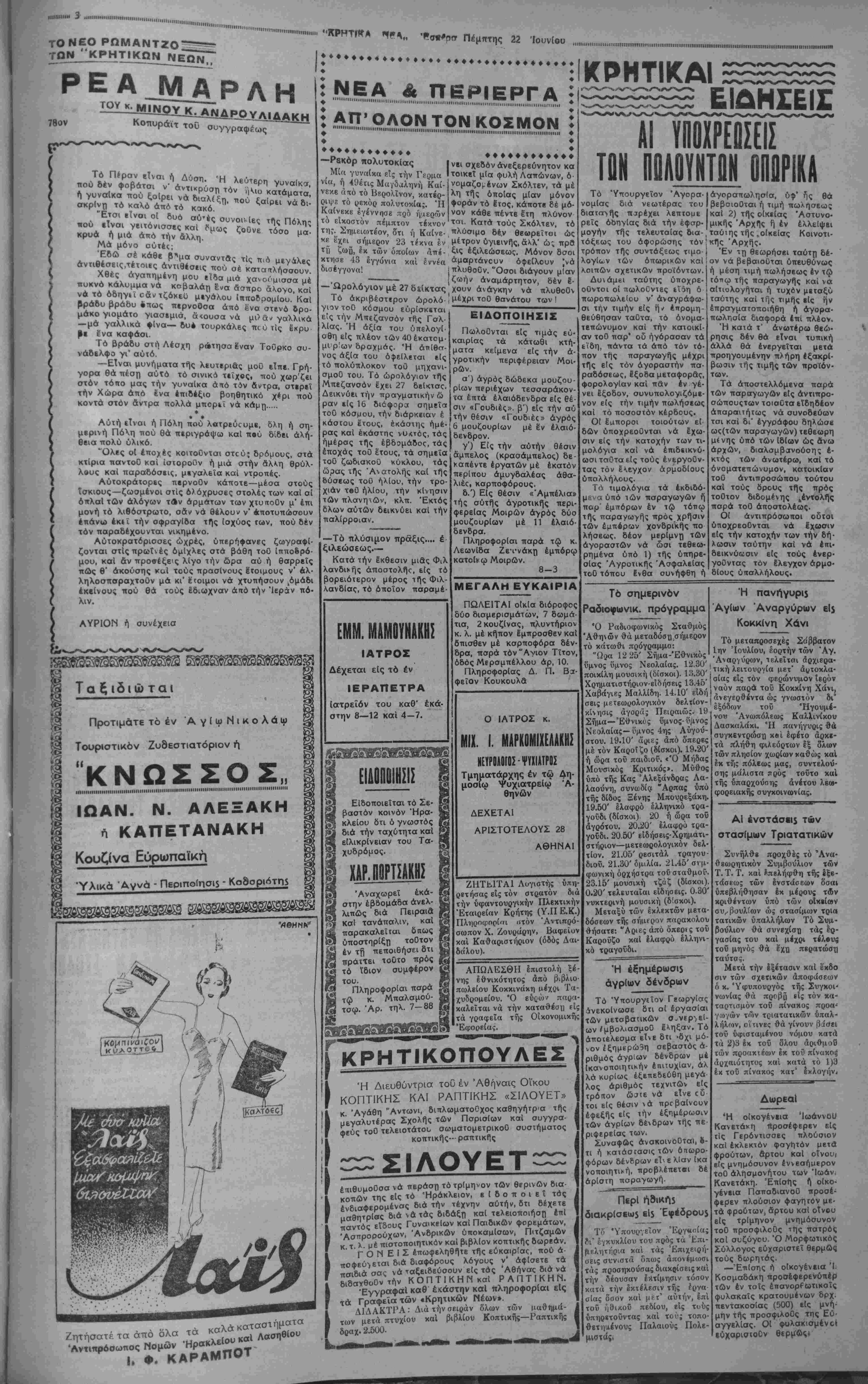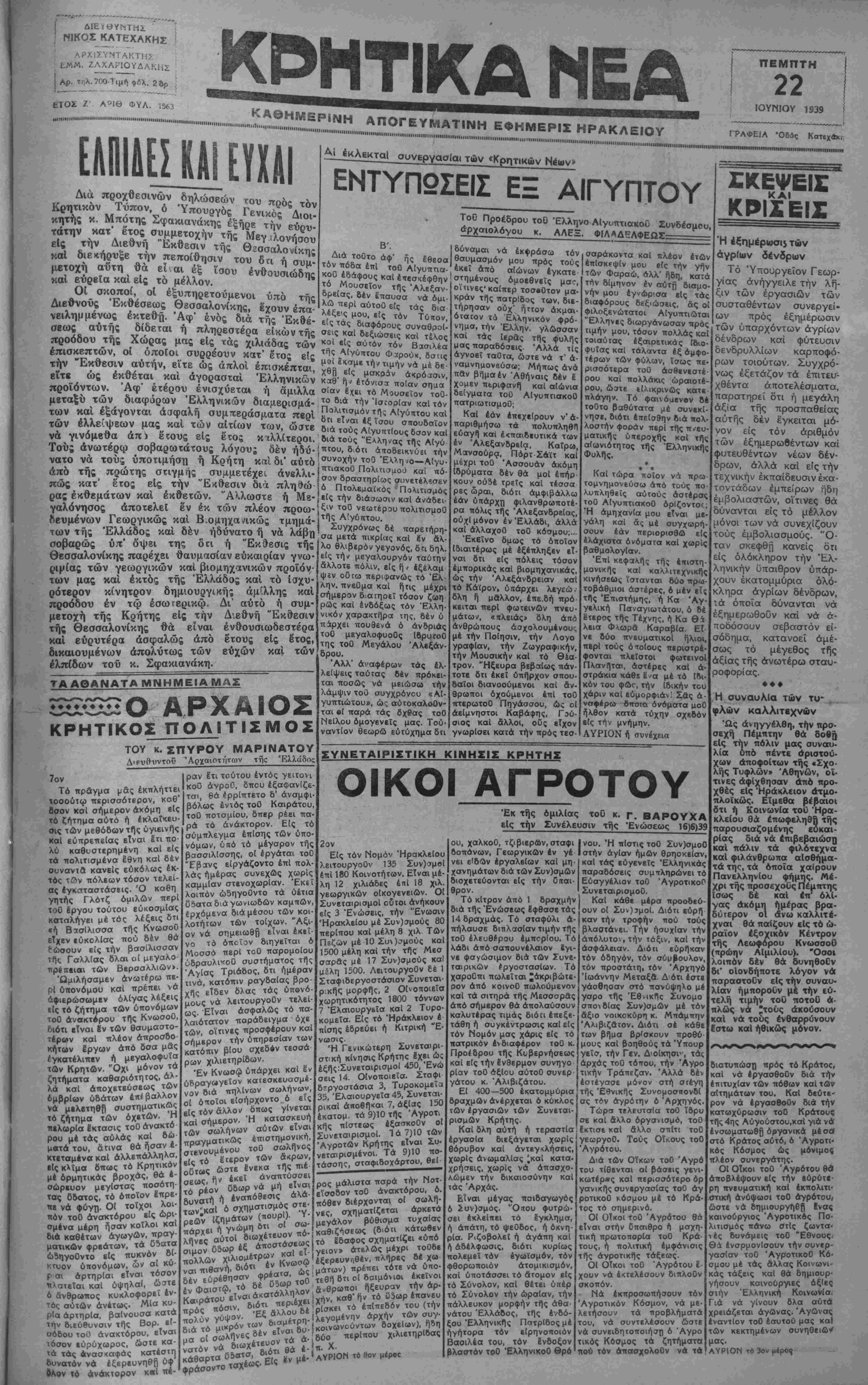 τοΟ ΑίγυπτιακοΟ όρΙζοντο< Ή αμηχανία μου εΤναι με γάλη και άς μέ συγχωρή σουν έάν περιορισθώ είς ελάχιστα ονόματα και χωρίς βαθμολογίαν. "Επί κεφαλής τής έπιστη μονικής καί καλλιτεχνικής κινήσεως ΐστανται δύο πρω τοβάθμιοι αστέρες, ό μέν εΐι τής Επιστήμης, ή Κα Άγ γ«λική Παναγιωτάτου, ό δέ Μτερος τής Τέχνης, ή Κα θ* λεία Φωρα Καραβιά. ΕΓ νε δύο πνευματικοί ήλιοι, περί τούς ότοίους περιστρέ φονται πλείστοι φωτεινό Πλανάται, αστέρες και ά στράκια κάθε έ.-α μέ τό Ιδι κόν του φώο, τήν ίδικήν του χάριν καί εύμορψιάν! Σας α¬ ναφέρω δποια ονόματα μοΟ ήλθον κατά τύχην σχεδόν βίς τήν μνήμην. ΑΥΡΙΟΝ ή συνέχεια ΣΥΝΕΤΑΙΡΙΣΤΙΚΗ ΚΙΝΗΣΙΣ ΚΡΗΤΗΣ ΟΙΚΟΙ ΑΓΡΟΤΟΥ Έκ τής ομιλίας τοΟ κ. γ. ΒΑ ΡΟΥΧΑ είς τήν Συνέλευσιν τής Ενώσεως 16)6)39 2ον Είς τόν Νομόν Ηρακλείου λειτουργοΟν 135 Συν)σμοί έπί 180 Κοινοτήτων. Είναι μέ¬ λη 12 χιλιάδες έπί 18 χιλ γεωργικών οικογενειών. ΟΙ Συνεταιρισμοί ούτοι ανήκουν είς 3 "Ενώσεις, τήν "Ενωσιν Ηρακλείου μέ Συν)?μοΰς 80 περίπου και μέλη 8 χιλ Τών Πεζών μέ 10 Συλ)^μούς κα1 1500 μέλη και τήν τής Μεσ σάρας μέ 17 Συν)σμούς κα! μίλη 1500. ΛειτουργοΟν 6έ 1 Σταφιδεργσστάσιον Συνεται¬ ρικής μορφής, 2 Οίχοποιεΐα χωρητικότητος 1800 τόννων 7 Έλαιουργδΐα καί 2 Τύρο κομεΐα. Είς τό Ήράκλβιον έ πίσης εδρεύει ή Κιτρική "Ε- νωσις. Ή Γενικώτερη Συνεταιρι στική κίνησις Κρήτης 6χβι ώς έξής:Συνεταιρισμοί 450, Ένώ σεις 14. Οινοποιεία. Στα φι β?ργοστάσια 3, Τυροκομεία 35, Ελαιουργεία 45, Συνεται¬ ρικοί άποβήκαι 7, άξιας 150 έκατομ. τά 9)10 τής Άγροτι κής πίστεως «ξασκοΟν οί Συνεταιρισμοί. Ίά 7)10 τών Αγροτών Κρήτης είναι Συ- εταιρισμένοι. Τά 9)10 πο- άσοης, σταφιδοχάρτου, θεί ρος μάλιστα παρά τήν Νοτ- εΐσοδον τοΟ ανακτόρου, ό. πόθβν διέρχονται οί σωλή- αρκετά τυχαίας καθΓζήσεως' (δ.όΠ κάτωθεν βς, σχηματίζεται μεγάλον βύθισμα Γλλ χ ναι πιθανή, Οοωρέξ χιλιομέτρων »^ *ν «ύπό άτέλώ'ς "μέχρι ™Οδε ν», .^ρβυνηθέν, πλήρες δέχω ώς,'μάτων) πρέπει τότε νά υαο- γειον» δέν ευρέθησαν φρ«α^. - .^ 8τι οί βαιμόνι- έν Φαιστώ, τό δέ υίωμ ·Λ..οΛ««Λ, «Ρίυοα· Καιράτο στώ, τό δέ ""^/άνθρωποι ήξευραν τήν άρ· ^σιν· βίΚι*ϊ!2ίβέ!ρΐ^ τό έπ1πεδ6ν του (τήν γύψον. Ε«*^ϊοη.ίλβγομένην αρχήν των■ σιιγ. κάΓαρ/οΓθ5«, **« ^μΙ^ΥΡίΟΗ τ, Βον μέροο φράσοντο ταχε»*·· ου, χαλκοΟ, τζιβιερων, σταφι δοπάνων, Γεωργικών έν γέ νει ε'δών εργαλείων και μη¬ χανημάτων διά τών Συν)σμών διοχετεύονται εις τήν Οιται· θρον. νου. Ή πίστις τοΟ Συν)σμο0 στην άγίαν ημών θρηοκείαν, και τάς ευγενείς Έλ,ληνικάς παραδόσεις συμπληρώνει τό Εύαγνέλιον τοΟ ΆγροτικοΟ 1 Συνεταιρισμού Τό κίτρον άπό 1 δραχμήν ] Καί κάθε μέρα προοδεύ διά τής Ενώσεως έφθασε τάς ουν οί Συν)7μο(. Διότι εύρή 14 δραχμάς. Τό σταφύλι ά-|καν τήν τροφήν πού τους πήλαυσε διτίλασίαν τιμήν τής βλαστάνει. Τήν ήσυχίαν τήν τοΟ ελευθέρου εμπορίου. Τό λάδι άπό σαπουνέλαιον Εγι¬ νε φανώσιμον διά τών Συνε¬ ταιρικών εργοστασίων. Τό χαροΟπι πωλείται ^άκριβώτε- οον άπό κοινοΟ πωλούμενον και τά σιτηρά τής Μεσσοράς άπό σήμερον θά απολαύσουν καλυτέρας τιμάς διό α έπεξε- τάθη ή συγκέντρωσις και είς τόν Νομόν μας χάρις είς τό πατρικόν ενδιαφέρον τοϋ κ. Προέδρου τής Κυβερνήσεως καί είς τήν ίίνθερμον συνηγο ρίαν τοΟ αξίου αύτοΟ συνερ γάτου κ. Αλιβιζάτου. Ε( 400—500 εκατομμύρια δραχμών ανέρχεται ό κύκλος τών εργασιών τών Συνεται¬ ρισμών Κρήτης. | Καί δλη αυτή ή τεραστία εργασία διεξάγεται χωρίς θόρυβον καί αντεγκλήσεις, χωρίς ανωμαλίας 'καί κατά χρήσεις, χωρίς νά άπασχο- λώμεν τήν δικαιοσύνην και τάς Αρχάς. Είναι μέγας παιδαγωγός ό Συν)σμός. "Οιτου φυτρώ¬ σε