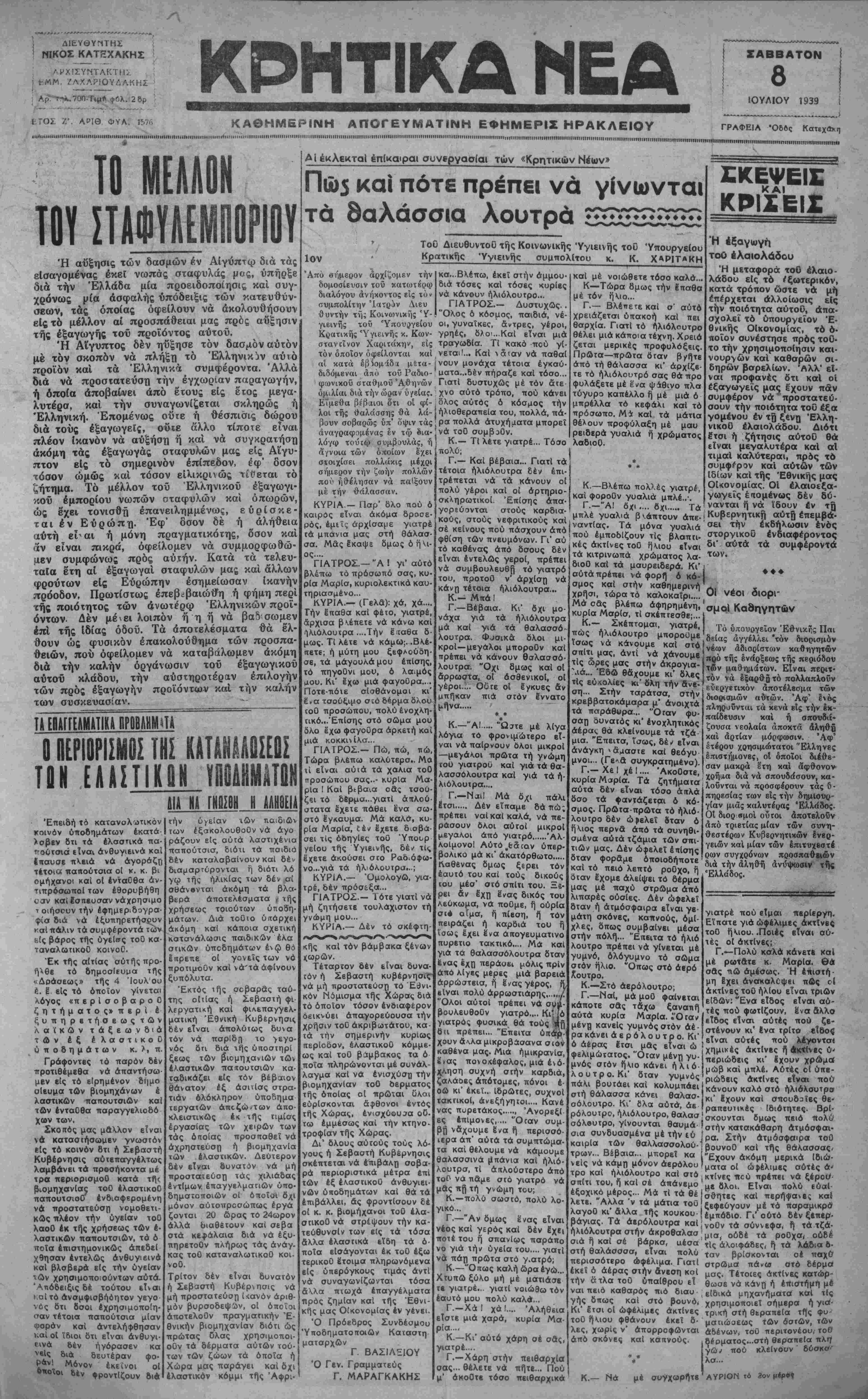 Κρατικής Υγιεινής κ. Κων- γρηές, δλο<...Καί εΤναι μιά στανάνον Χαριτάκην, εις τραγωδία. Τι κακό πού γ[· τόν όποιον οφείλονται καί νεται'... Καί ιαταν νά παθαί αί κατά εβδομάδα μετά-(νουν μονάχα τέτοια έγκαύ- διδόμεναι άπυ τοΰ Ράδιο- υατα.,.δέν πήραζε καί τόσο... φωνιχοΟ σταθμοϋ Αθηνών Γιατί δυστυχώς μέ τόν δτε- όμιλίαι διά τήν ώοαν υγείας, χνο αυτό τρόπο, πού κάνει Εϊμεθα βέβαιοι δτι οί φί- όλος αυτός ό κόσμος τήν λοι τής θαλάσσης θα λά"-| ηλιοθεραπεία του, πολλά, πά- βουν σοβαρώς ΰπ' όψιν τάς; ρα πολλά ατυχήματα μπορεί άναγραφομένας έν τω δια-!νά τοΟ συμβοόν. λόγω τούΈω συμβουλάς, ή αγνοία τών οποίων έχει στοιχίσει πολλάκις μέχρι σήμερον τήν ζωήν πολλών ποϋ ήθέλησαν νά παίξουν μέ τήν θάλασσαν. ΚΥΡΙΑ.— Παρ" δλο πού ό καιρός εΤναι ακόμα δροσε ρός, έμιΐς αρχίσαμε γιατρέ τά μπάνια μας στή Θάλασ σα. Μάς Εκαψε δμωςόηΛι ος.... ΓΙΑΤΡΟΣ.— "Α ! γι' αυτό βλέπω τό πρόσωπο σας, κυ ρία Μαρία, κυριολεκτικά καυ τηριασμένο... ΚΥΡΙΑ.— (Γελά): χά, χά.... Τήν έπαθα καί φέΐο, γιατρέ, άρχισα βλέπετε νά κάνω καί ■Ίλιολουτρα ....Τήν έ.ταθα δ μως. ΤΙ λέτε νά κάμω;. .Βλέ- ιτετε; ή μύτη μου ξεφλούδη σε, τά μαγουλά μου επίσης, τό πηγοΟνι μου, ό λαιμός μου. Κι' έχω μιά φαγοΟρα..., Πότε-πότε σίσθάνομοι κι ένα τσούξιμο σ:ό δέρμα δλου ΐοΟ προσώπου, πολύ ένοχλη τικό.·.Έπ(σης στό σώμα μου δλο έχω φαγοΟρα αρκετή καί μιά κοκκινίλα... ΠΑΤΡΟΣ.- Πω, πω, •πώ, Τώρα βλέπω καλύτερο.. Μα τϊ είναι αύιά τά χαλιά τοΟ προσώπου σας..- κυρία Μα¬ ρία ! Καί βιβαια οάς τσού ζει τό δέρμα...γιατί απλού¬ στατα έχετε πάθει ε'να σω στό ίγκαυμα. Μά καλά, κυ ρία Μαρία, (έν έχετε διαβά¬ σει τις οδηγίες τοΟ "Υπουρ γείου τής Υγιεινής, δέν τΙ<, έχετε ακούσει στο Ραδιόφω¬ νο...γιά τά ήλιόλουτρα...; ΚΥΡΙΑ.— "Ομολογώ, για¬ τρέ, δέν πρόσεξα... ΠΑΤΡΟΣ.- Τότε γιατί νά μή ζητήσετε τουλάχιστον τή γνώμη μου... ΚΥΡΙΑ.— Δέν τό σκέφτη- κής καί τόν βάμβακα ξένων <ωρών. Τέταρτον δέν εΐναι δυνα¬ τόν ή Σεβαστή κυβέρνησις~ νά μή προστατεύσε τό Έΰνι- κόν Νόμισμα τής Χώρας διά τό όποιον τόσον ενδιαφέρον δεικνύει άπαγορεύουσα τήν χρήσιν τοΟ ακριβότατου, κα¬ τά τήν σημερινήν κυρίως περίοδον, έλαστικοΟ κόμμε- ως καί τοΟ βάμβακος τα ό ποία πληρώνονται μέ συνάλ¬ λαγμα καί νά ενίσχυση τήν βιομηχανίαν τοΟ δέρματος τής οποίας ο( πρώται ϋλαι ευρίσκονται άφθονοι εντός τής Χώρας, ένισχύου^α ο0· τω εμμέσως και τήν κτηνο- τροφίαν τής Χώρας. Δι' δλους αυτούς τους λό¬ γους ή Σεβαστή Κυβέρνησις σκέπτεται νά έπιβάΛη σοβα¬ ρά περιοριστικά μέτρα επί τών έξ έλασίικοΟ ανθυγιει¬ νών υποδημάτων καί θά τά επιβάλλει, άς φροντίσουν δέ οί κ. κ. βιομήχανοι τοΟ έλα- στικοΟ νά στρέψουν τήν κα- τεύθυνσίν των εις τά τόσα αλλά ελαστικά εϊδη τά ό- ποΐα εΙσάγονται έκ τοΟ έξω τερικοΟ έτοιμα πληρωνόμενα είς υπέρογκους τιμάς αντί νά συναγωνίζωνται τόσα δλα πνωχά επαγγέλματα τιρός ζημίαν καί τής Εθνι¬ κής μας Οίκονομίας έν γένει. Ό Πρόεδρος Συνδέσμου Υποδηματοποιών Καταστη ματαρχών Γ. ΒΑΣΙΛΕΙΟΥ Ό Γεν. Γραμματεύς Γ. ΜΑΡΑΓΚΑΚΗΣ Κ.— Τι λέτε γιατρέ... Τόσο λαδιορ. πολύ; Γ.— Και βέβαια... Γιατί τά τέτοια ήλιόλουτρα δέν έπι- καί μέ νοιώθετε τόσο καλά... Κ—Τώρα 8μως τήν έπαθα μέ τόν ήΛιο... Γ.— Βλέπετε καί σ' αυτό χρειάζεται υπακοή και πει θαρχία. Γιατί τό ήλιόλουτρο θέλει μιά κάποια τέχνη. Χρειό ζεται μερικές προφυλάξεις. Πρώτα—πρώτα όταν βνήτε άπό τή θάασσα κι' αρχίζε¬ τε τό ήλιόλουτρο σας θά προ φυλάξετε μέ έ'να ψάθινο πλα τύγυρο καπέλλο γ] μέ μιά ό μπρέλλα τό κεφάλι και τό πρόσωπο. Μ* και τά μάτια θέλουν προφύλαξη μέ μαυ ρειδερά γυ