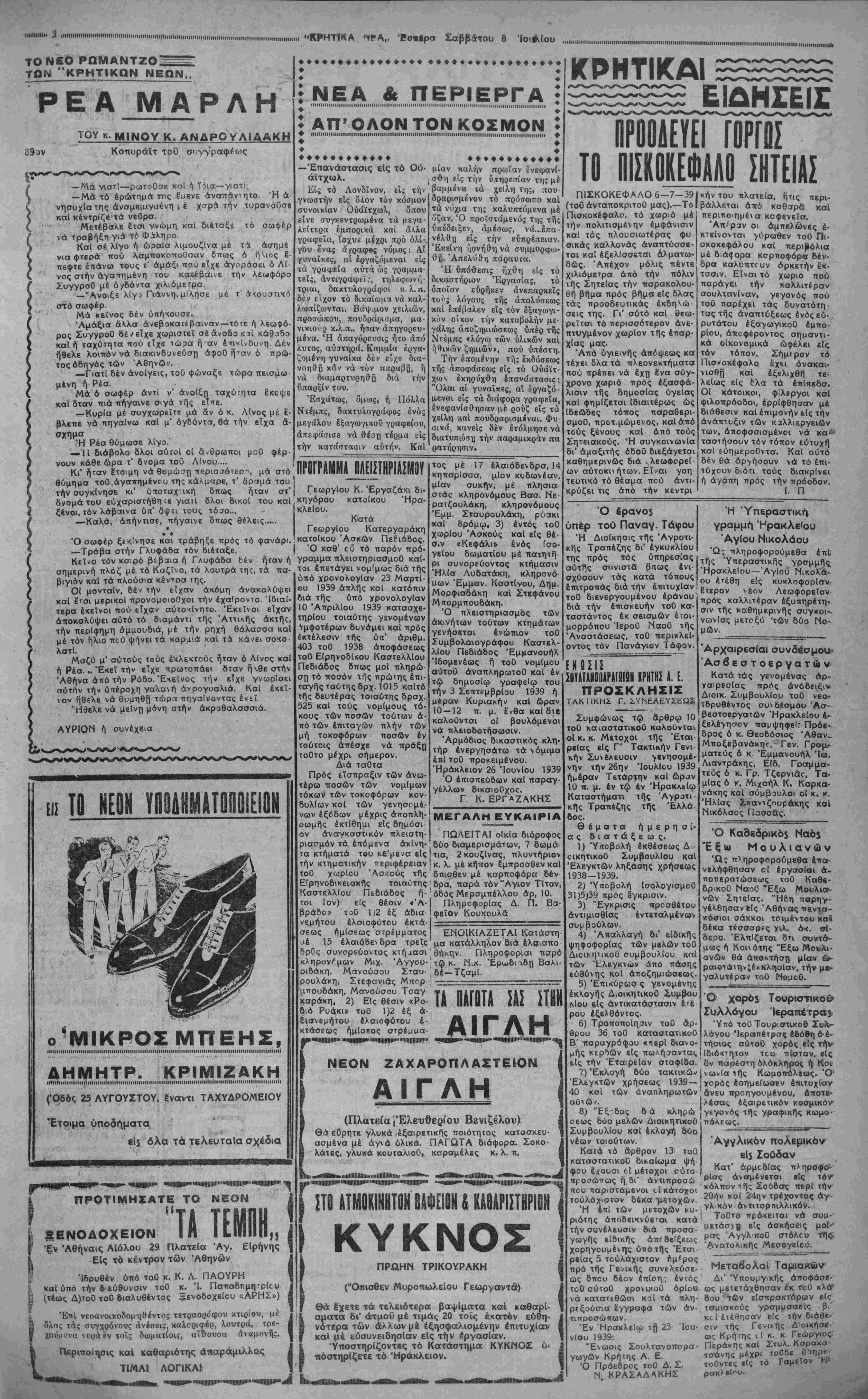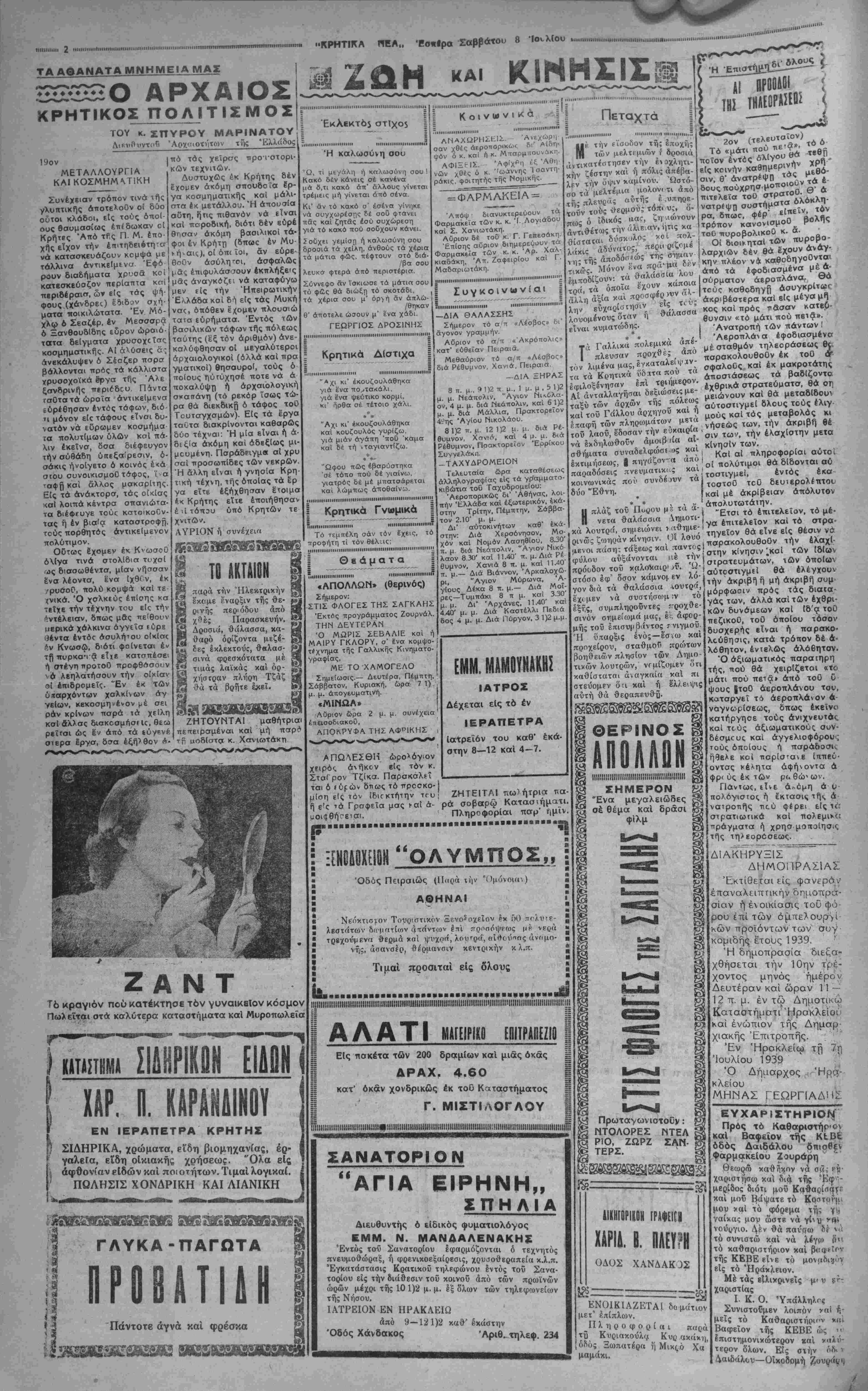 »ή<·αις), οί όπι ΐοι, αν εύρε· θοΟν άσύλη*οι, ασφαλώς μας επιφυλάσσουν εκπλήξεις μας αναγκάζει νά καταφύγω μεν είς τήν "Ηπειρωτικήν Ελλάδα κοί δή είς τάς Μυκή νας, οπόθεν έχομεν πλουσιώ ταΐα ευρήματα. Εντός τών βασιλικών τάφων τής πόλεως ταύτης (εξ τόν αριθμόν) άνε- καλύφθησαν οί μεγαλύτεροι αρχαιολογικοί (όλλά καί πρα γματικοί) θησαυροί, τούς ό ποίους ηύτύχησέ ποτέ νά ά ποκαλύψη ή αρχαιολογική σκαπάνη (τό ρεκόρ ϊσως τώ¬ ρα θά διεκδικβ ό τάφος τοΟ Τουταγχσμών). Εις τά έργα ταύτα διακρίνονται καθαρώς δύο τέχναι: Ή μία είναι ή ά- δεξία ακόμη καί άδεξίως μι- μευμένη. Παράδειγμα αϊ χρυ σαι προσωπίδες τών νεκρών. Ή άλλη είναι ή γνησία Κρη- τκή τέχνη, τής όποιας τά ερ γα εϊτε εξήχθησαν έτοιμα έκ Κρήτης είτε έποιήθησαν επιτόπου ϋπό Κρητών τε χνιτών. ΑΥΡΙΟΝ ή συνέχεια ΤΟ ΑΚΤΑΙΟΗ παρά τήν Ήλεοαρικήν εκι·με εναρξιν της θε¬ ρινής περιόδου άπό χθες Παρασκευήν. Δροσιά, θάλασσα, κα¬ θαρό ορίζοντα μεζέ¬ δες εκλεχτούς, θβλασ- σινά φρεσκότατα μέ τιαάς λαικάς και δρ- ρ πλι'ιρη Τζαζ τά βρήτε έχει. ΖΗΤΟΥΝΤΑΙ μαθήτριαι πεπειραμένοι και μή τη ιιοδίστσ κ. Χανιωτάκγι ΖΑΝΤ Τ6 κραγιόν πού κατέκτησε τόν γυναικΗίον κόσμον Πωλείται ατά καλύτερα καταστήματα καΐ Μυροτίωλεΐα ΚΙΝΗΣΙΣϋ ΙΜΙΙΙΙΙΗΙΙΙΙΙΗΗΙΗΙΗΙΙΜΙΗΙΙΙΙΗΙΙΙΙΙΝΙΙΙΙϋΗΙΙΙ Εκλεκτοί στίχοχ ιιιιιιιιι ι ■ ΙΗΙΙΙΙΙΙΙΙΙΙΗΗΙΗΗΙΙΙ ΙΙΙΙΙΗ1ΙΙΙΙΙΜΙΜΙΙΙΜΙΙΙΙ Ή καλωσύνη σου Μ.......«.ΙΙΙΙΗΙΜΗΗΙΙΜΙΙ····......Η··.···.»." 1 Κοινωνικά =■...................... ■■·........·............ι σαν χθες άίροπορικάκ δι Λΐδη- ψόν ό κ και ή κ. ΜπαρμπουνΑΜ' ΑΦΙΞ-ΙΣ ΆφίχΡη έξ Άθη νών χθες ό κ "ω-ϊννης Ίσαντη- ράκις. φοιτητής τής Νομικής^__ = ΦΑΡΜΑΚΕΙΑ = τά Ω, τι μεγάλη ή καλωαυνη σου ' Κακό δέν κάνεις σέ κανένα μά δ,τι κακό άπ' άλλους γίνεται τρέμεις μή γίνεται άπό σένα Κι' αν τό κακό ο' εσένα γίνηκε νά συγχώρεσης δέ σοΰ φτάνει Άπόφ διανυκτερεύουν πας καί ζητάς έσυ συχώρεση φαοαακεια τών κ. κ. Ί Λογιάδου γιά τό κακό πού σοΟχουν κάνει. κσίκ£ χανιωτάκη. Σουχει γεμίση ή καλωσΟνη σου ΑΟριον δέ τοΟ κ Γ. Γείιεσάκη δροσιά τά χείλη, ανθούς τά χέρια Επίσης αΟριον διημερεύουν ^τα τά μάτια φώς, πέφτουν στό διά- Φαρμακεία τών κ. κ. Αρ. /βα σου κιαδάκη. Άπ. Ζαφειρίου λευκό- φτερά άιτό περιστέρια Μαδαριωτάκη Σύννεφο αν Ισκιωσε τά μάτια σου ι·».....'·........'......'.....".....'""""1"".....' τύ φ£ς θά δίωξη τό σκοτάδι, . § ΣονΚΟΐνΗνίαΐ τά χέρια σου μ' όρ>ή άν άπλω·; | ·