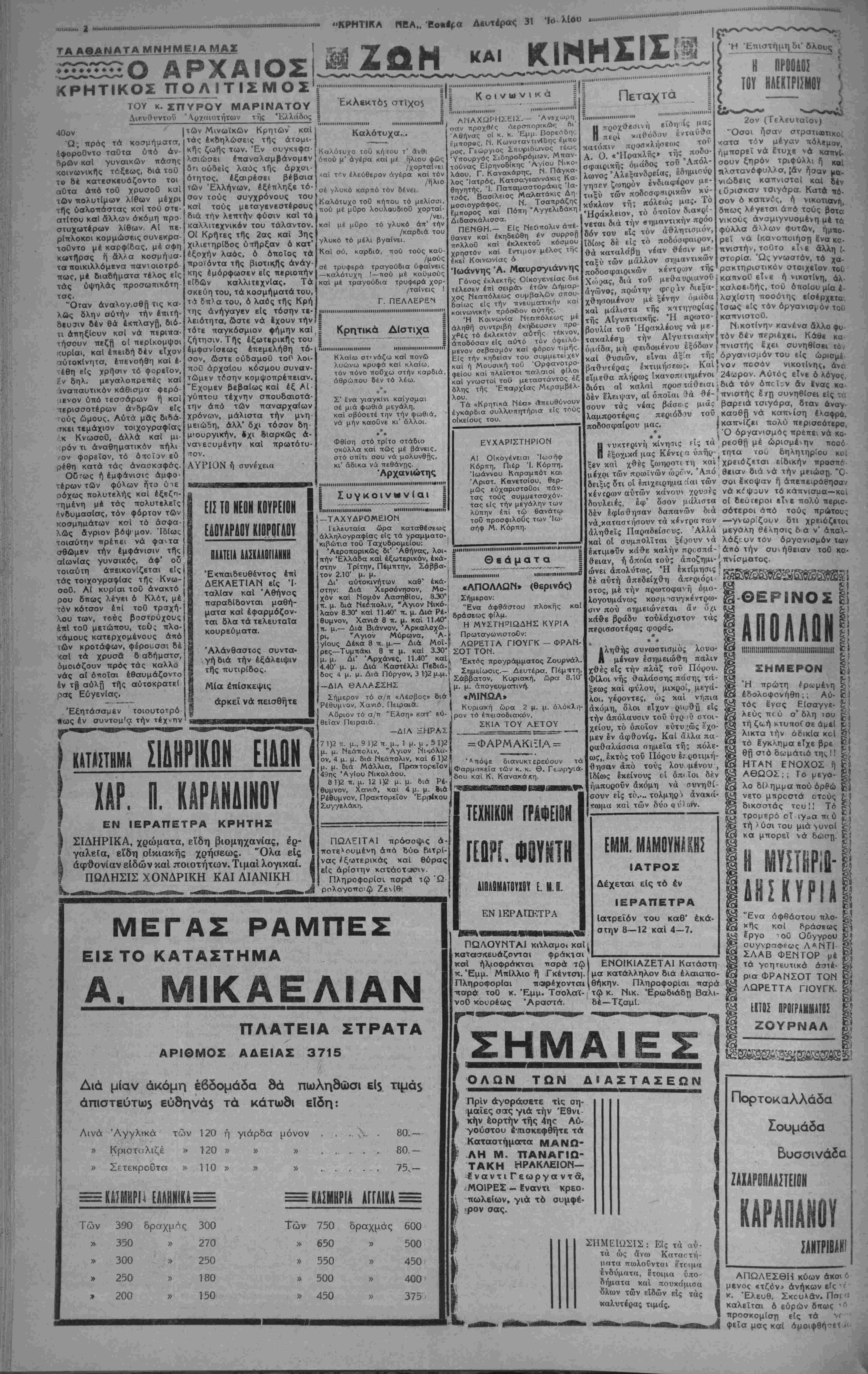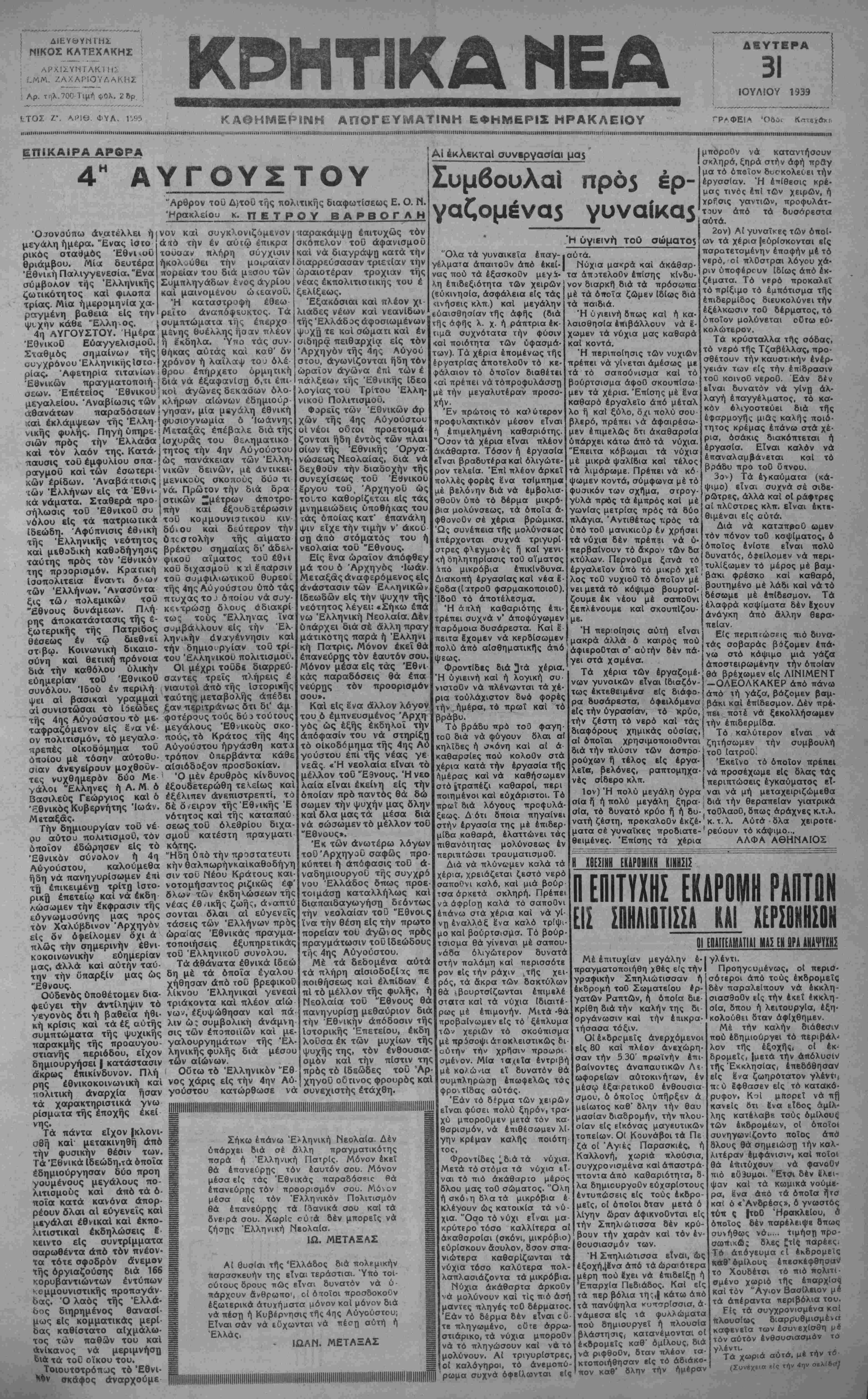 Αρ τηλ.700 Τιμή ψ<5λ. 2 βρ ΚΡΗΤΙΚΑ ΝΕΑ ΔΕΥΤΕΡΑ 31 ΙΟΥΛΙΟΥ 1939 ΙΤΟΙ τ. αΛ ι ΚΑ0ΗΜΕΡΙΝΗ ΑΠΟΓΕΥΜΑΤΙΝΗ ΕΦΗΜΕΡΙΣ ΗΡΑΚΛΕΙΟΥ "Ρ^ΦΕΙΑ Όδα. Κ.τ ■ ΙΗΗΙΙΙΗ»)ΙΙΙΗΙΗΙΗΙ·ΙΙΗΙΙΗΜΙΙΙΙΗΙΙΜΙΙΙΙΙΙΗΙΙΗΙΙΙΙΙΗΗΗΗΙΙΙΙΗΙΙΙΙΜΙΙΙΙΙΙΙΙΙΙΙΙΙΙΙΙ1ΙΗΙΗΙΙΙΙΙΙΙΐηΐΙΙΙΙΙΠ^ Ε ΠΙΚΑΙΡΑ ΑΡΘΡΑ 4Η ΑΥΓΟΥΣΤΟΥ "Αρθρον τοΰ Δ)τοΰ της πολιτικής διαφωτίσεως Ε. Ο. Μ. •Ηρακλείου κ. ΠΕΤΡΟΥ ΒΑΡΒΟΓΑΗ "Οσονούπω ανατέλλει ήινον και συγκονιζ6μενον ...^ν_Α------- «κ----- ι-----'άκό την έν αύτώ έπικρα μεγάλη ήμερα. "Ενας Ιστό ρικός σταθμός Έθνι<υϋ θριάμβου. Μία δευτέρα Εθνική Παλιγγενεσία. "Ενα συμβολον της "Ελληνικής ζωτικότητας καΐ φΐΑ,οπα τρίας. Μια ημερομηνία χα¬ ραγμένη βαθεια είς την τουοαν πλήρη αύγχιοιν ήκολ^ύθει τήν μοιραϊαν πορείαν του διά μέσου των Συμπληγάδων ένος αγρίου και μαινόμενου ώ<εανοϋ. Ή καταστροφή έθεω ρεΐτο αναπόφευκτος. Τά ψι,χήν κάθε Έλλη.ος. ίσυμπτώματα ΐης έπερχο 4η ΑΥΓΟΥΣΤΟΥ. Ημέρα μ^νης θυέλληςήααν πλέον ΈθνικοΟ ΕΰαγγελισμοΟ. | ή έκδηλα. Ύπο τάς συν- Σταθμός σημαίνων τής',θηκας αύτάς και καθ" δν ουγχρόνου ΕλληνικήςΙσίο-Ιχρόνον ή λαΐλαψ τοϋ όλέ ρίας. Αφετηρία τιτανίων ίθρου έπηρχετο ορμητική Εθνικών πραγματοποιή ,'διά νά έξαφανίσ]] δ,τι έπι· αεων. Επέτειος Εθνικού (κοί αγώνες δεκαόων όλο- μεγαλείου. 'Λναβίωσις των κλήρων αιώνων έδημιούρ αθανάτων παραδόσεων Ιγησαν, μία μβγάλη εθνική ι<αι εκλάμψεων τής Έλλη·| φυσιογνωμία 6 Ιωάννης νικής φυλής. Πηγή ύπηρε· Ι Μεταξάς επέβαλε διά της σιών προς τήν Ελλάδα Ισχυράς του θεληματικό καΐ τον λαόν της. Κατά-Ιτητος τήν 4ην Αυγούστου παυσις του εμφυλίου σ πα-(ως πανάκειαν τών Έλλη· ραγμοΰ και των έσωτερι ' νικών δεινών, με άνιικει- κών ερίδων. "Αναβάπτισα; (μενικούς σκοπούς δύο τι ιών Ελλήνων είς τά Εθνΐ- νά. Πρώτον τήν διά δρα κά νάματα. Σταθερά προ [στικών "μέτρων άποτρο- σήλωσις τοΟ ΈθνικοΟ συ ;πήν και έξουδίτέρωσιν νόλου είς τά πατριωτικά τοΟ κομμουνιστικού κιν ίδεώδη. 'Αφύπνισις εθνική δύνου και δεύτερον τήν της Ελληνικής νεότητος ΰκοτολήν της αίματο και μεθοδική καθοδήγησις βρέκτου σημαίας δι' άδε· ταύτης προς τον Έθνικόν φίκου αίματος του €θνΐ της πραορισμόν. Κραακή κοΟ διχασμού κιάέΊταρσιν Ισοπολιτεία έναντι δ*ων τοΰ συμφιλιωτικού θυρεοί των "Ελλήνων. Άνασύντα της 4ης Αυγούστου ύπό τάς παράκαμψη επιτυχώς τόν σκόπελον του αφανισμού και νά διαγράψο κατά την όιαρρεύσασαν τριετίαν την ώραιοτέραν τροχιαν της νέας εκπολιτιστικής του έ ξελίξεως. 'Εξακόσιαι καΐ πλέον χι λιάδες νέων και νεανίδων τής Ελλάδος αφοσιωμένων ΨυΧ3 τε και σώματι καΐ έν σιδηρά πειθαρχία είς τόν "Αρχηγόν της 4ης Αυγού στου, αγωνίζονται ήδη τόν ώραΐον αγώνα έτιι των έ πάλξεων της Εθνικής Ιδεο λογίας του Τρίτου Έλλη- νικοΰ Πολιτισμού. Φορείς των Εθνικών άρ ξις τώ/ πολεμικών του "Εθνους δυνάμεων. Πλή πτυχας το ^ οποίου νά σογ κεντρώας δλους σδιακρί „,.„ άποκατάστασις τής ε- τως τους Ελληνας ινα ξωτερικής τής Πατρίδος συμβάλλουν είς τήν Ελ θέσεως έν τω διεθνεΐ λην.κήν ώνΛγέννησιν _καΙ στβω σύνη Κοινωνική δίκαιο- τή'ν δήμιο», ργίαν τοΟ τρί- καί θετική πρόνοια του Έλ,ληνίκου πολιτισμοί διά τήν καθόλου 'ύλικήν ΟΙ μέχρι τουδβ διαρρευ εΰημερίαν τοΟ ΈθνικοΟ σαντες τρεις πλήρεις έ συνόλου. Ιδού έν περιλή νιαυτο'ι άπό τής Ιστορικής ψει αϊ βασικαΐ γραμμαί ταύτης μεταβολής άπέδει αί συνιστώσαι τό ίαεώοες ξαν περιτράνως δτι δι' άμ τής 4ης Αυγούστου τό με- φοτέρους τους δύ 3 τούτους ταφραζόμενον είς έ/α νέ- μεγάλους Εθνικούς σκο- λσμόν τό μεγάλο πους τό Κράτος τής 4η ταφραζόμενον είς έα μγς ς ον πολιτ