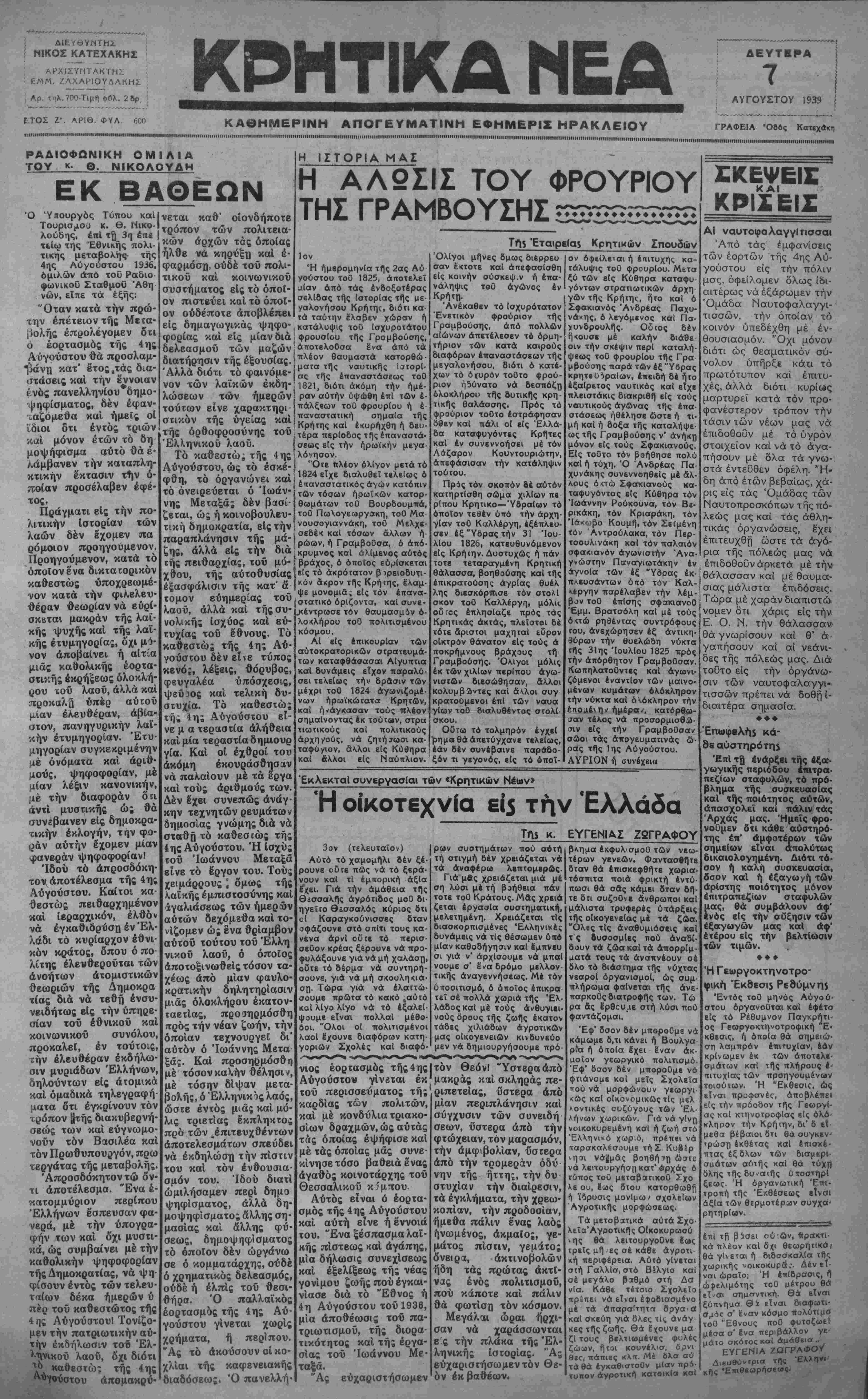 ρου του ' -"■ Λ1<ν~-'~: προκαλά να και ε" φαρμόση, ουδέ τοϋ πολι¬ τικού και κοινωνικού συστήματος είς το όποι¬ ον πιστβύει και το οποί- ον ουδέποτε αποβλέπει Η ΙΣΤΟΡΙΑ ΜΑΣ Η ΑΛ2ΣΙΣ ΤΟΥ ΦΡΟΥΡΙΟΥ ΤΗΣ ΓΡΑΜΒΟΥΣΗΣ 25 ♦♦♦♦♦♦♦♦♦♦♦♦♦ Τή$ Εταιρείας Κρητικών Σπουδών φοριας και δελεασμού Ιον Ή ημερομηνία τής 2ας Αύ γούστου τοΟ 1825, αποτελεί αίαν άηό τάς ένδοξοτέρας σελίδας τής Ιστορίας τί|ς με¬ γαλονήσου Κρήτης, διότι κα¬ τά ταότην Ιλαβεν χώραν ή είς δημαγωγικός ψηφο·,Κατάλυψις τοϋ Ισχυρότατου ψρουσίου τής Γρομβούσης, άποτελοΟσα Ενα άπό τα πλέον Θαυμαστά κατορθώ¬ ματα τ^ς ναυτικής ίατορί- ας τής επαναστάσεως τοΟ . 1821, διότι ακόμη τήν ήμέ- ήμερων^ ραν αυτήν ύψώθη επί των ε¬ πάλξεων τοΟ φρουρίου ή ε¬ παναστατική σημαία τής * Κρήτης καΐ έκυρήχθη ή δευ· χον ! τέρα περίοδος τής έπαναστά- Έλλ,ηνίκοϋ λαού. ίσεωςείςτήν ήρωικήν μέγα Τό καθεστώ; τής 4ης?λόνησον. Αυγούστου, ώς τό έσκέ-1 'Ό« πλέον ολίγον μετά τό '■' » · ' ~ ««} ; 1β24 βΤχβ διαλυθεί τελείως ό φ»η, το οργανώνει ««ΐ]6πανσσατιΚ0ςάνών Κατόπιν είς μίαν δια τών μαζών διατήρησιν τής εξουσίας. Άλλα διότι τό φαινόμβ- νον τών λαϊκών εκδη¬ λώσεων τών τούτων είνε χαρακτηρι σπκόν τής υγείας και τής όρθοφροσύνης τό ονειρεύεται ό Ίωάν νης Μεταξά; δέν βασί¬ ζεται, ώ; ή κοινοβουλβυ- τών τόσων ηρωικών κατορ¬ θωμάτων τοΟ Βουρδουμπά, τοΟ Πωλογεωργάκη, τοΟ Μα λαού, άλλα καί ύπβρ αύιοϋ μιαν έλευθέραν, άβία- στον, πανηγυρικήν λαϊ- κήν έτυμηγορίαν. Έτυ μηγορίαν συγκεκριμένην μέ ονόματα και αριθ¬ μούς, ψηφοφορίαν, μέ μίαν λέξιν κανονική ν, μέ τήν διαφοράν δη αντί μυστικής ώ; θα συνββαινεν είς δημοκρα- τικήν έκλογήν, την φο¬ ράν αυτήν εχομεν μίαν φανεράν ψηφοφορίαν! 'Ιδού τό άπροσδόκη- τοχ αποτέλεσμα τής 4 ης Αυγούστου. Καίτοι κα- θβστώς πειθαρχημένον και ίεραρχικόν, έλθόν να εγκαθίδρυση έν Ελ¬ λάδι τό κυρίαρχον έθνι- κόν κράτος, δπου ό πο λίτης έλενθεροΰται τών παραπλανησιν αλλά είς της τήν ή Οΐά εής πειθαρχίας, τοϋ μό¬ χθου, τής αυτοθυσίας έξασφάλισιν τής κατ' & άνοήτων θεωριών ατομιστικών τής Δημοκρα τίας διά νά τεθή ένσυ- νβιδήτως βίς τήν ύπηρε- σίαν τοΰ εθνικού καΐ κοινωνικού συνόλου, προκαλεΓ, έν τούτοις έλ προκ, τήν έλβυθέραν έκδήλω- σιν μυριάδων Ελλήνων, δηλούντων είς ατομικά και ομαδικά τηλεγραφή ματα δτι εγκρίνουν τόν τρόπον ||τής διακυβερνή- σβώς των και ευγνωμο¬ νούν τόν Βασιλέα καΐ τόν Πρωθυπουργόν, πρω τεργάτας τής μεταβολής. Άπροσδόκητοντώ ον- τι αποτέλεσμα. "Ενα έ- κατομμύριον περίπου Ελλήνων έσπευσαν φα¬ νερά, μέ τήν ύπογρα· φήν των και δχι μυστι¬ κά, ώς συμβαίνει με τήν καθολικήν ψηφοφορίαν τής Δημοκρατίας, νά ψη¬ φίσουν εντός τών τελευ¬ ταίων δέκα ήμερων ύ πέρ τοΰ καθεστώτος τής 4 ης Αυγούστου! Τονίζο· μεν τήν πατριωτικήν αύ· την έκδήλωσιν τοΰ Ελ¬ ληνικού λαοϋ, οχι διότι * καθεστώ; τής 4ης & άπομακρύ τομον λαού, νολικής Ισχύος καί ευ¬ τυχίας τού έθνους. Τό καθεστώς τής 4η; Αύ¬ γουστου δέν είνε τύπος κενό;, λέξεις, θόρυβος, φευγαλέα ύττόσχεσις, ψεύδος καί τελική δυ¬ στυχία. Τό καθεστώς τή; 4η; Αυγούστου εί¬ νε μ α τεραστία αλήθεια καί μία τεραστία δημιουρ γία. Καί οί εχθροί του ακόμη έκουράσθησαν νά παλαίουν μέ τά έργα καί τους αριθμούς των. Δέν έχει συνεπώς ανάγ¬ κην τεχνητών ρευμάτων δημοσίας γνώμης διά νά σταθό τό καθεστώς της 4ης Αυγούστου. Ή Ισχύς τοϋ Ιωάννου Μεταξά είνε τό έργον του. Τους χείμαρρους ', δμως τής λαϊκής εμπιστοσύνης καί άγαλιάσεως τών ήμερων αυτών δεχόμβθα καί το- νίζομεν ώ; ενα θρίαμβον αυτού τούτου τοϋ Έλλη νικοϋ λα