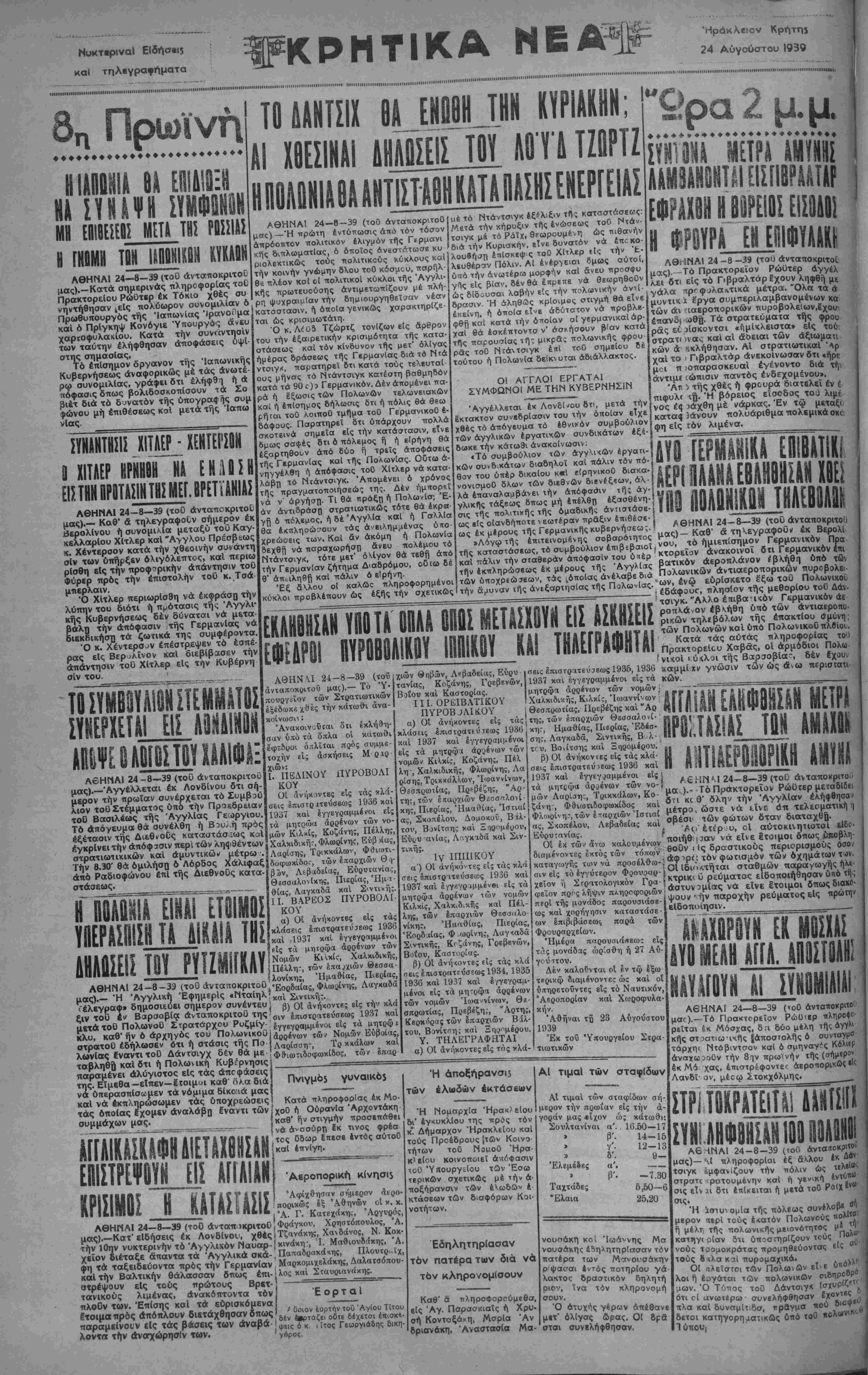έκ Μ6 χας, έπιστρέφοντετ αεροπορικώς ·'< Λανδΐ' ον, μέσω Στοκχόλμης. ΣΥΙΑΗΦΟΙΙΣϋΗΙΙΙΟΗΙ Α6ΙΝ «ι Α6-ΙΝΑΙ 24-8-39 (τοΓ» ανταποκριτού μας)— Μ πληροφορίαι έξ 6λου έκ Δάν· τσιγκ εμφανίζουν τήν πόλιν ώς «λ«1<^ στρατζ ψατουμένην κσΐ ή γενική έντύυβ σις εΐν 2ΐ δτι επίκειται ή μετά τοΟ Ρώίχϊνω σΐς'· Ή ϊσιυομία τής πόλεως συνίλοββ όΠ μερον ΐιερί τους εκατόν Πολωνούς τολ'Τ* ή μέλη τής πολωνικής μειονότητος μ6 ΐψ κατηγ( βίαν δτι υποστηρίζουν τους Πολω νους ΐοομοκράτας προμηθεύοντας είς σϋ τους &<ιλα καί πυρομαχικά. 01 ΐιλεΐσίοι τών Πολωιών εΐ-ε δτιόλΑ^ λοι Γ) έογάται τών πολωνικών σιδηρού μων. "Ο Τύπος τοΟ Δάντσιγ* (σχυρίζ»" οτι οί ανωϊέρω συνελήφθησαν Ιχοντες ε πλα καί δυναμό.§ο·( τραγμα πού δετοί κατηγορηματικώς ύπό τοϋ Ί ύπου,