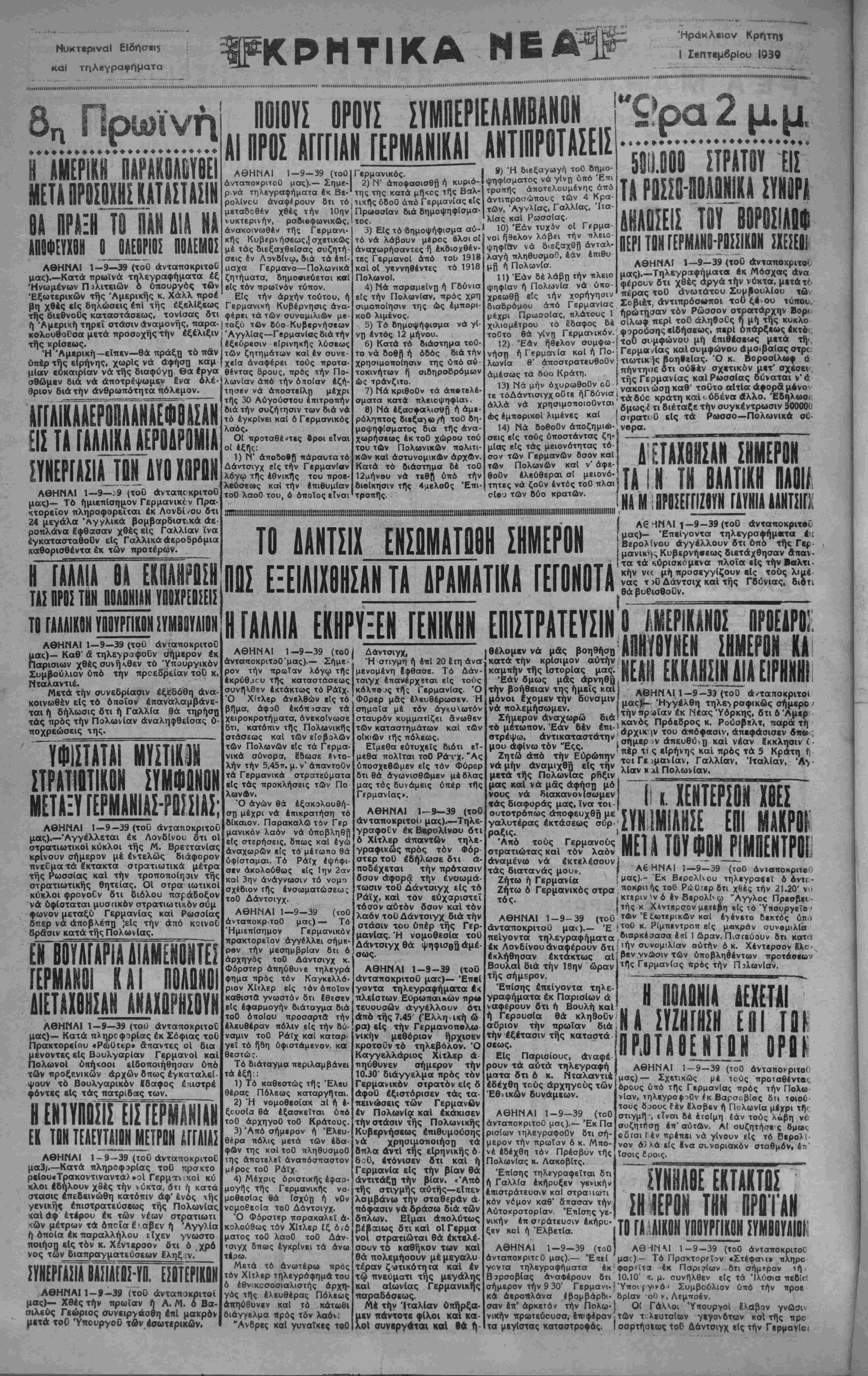κήν ν<< μή προσεγγίζουν είς τους λιμέ νας τ )0 Δάντσιχ καί τής Γδύνιαςι διότι θά βυθισθούν. ΑΘΗΝΜ 1-9-39 (τοΟ | ανταποκριτού'μας).— Σήμε¬ ρον τήν πρωΐαν λόγφ τής λκρύθαου τής καταστάσεως συνήΧθεν εκτάκτως τό Ράιχ. Ό Χ'τλερ άνελθών ε(ς τό βήμα, άφοΟ έκόπισαν τά χειροκροτήματα, Λνεκοΐνωσε δτι, κατόπιν τής Πολωνικής στάσεως καί τών εισβολών τών Πολωνών είς τά Γερμα¬ νικά σύνορα, Εδωσε εντο- λήν τήν 5,45ττ. μ. ν' άπαντοΟν τά Γερμανικά στρατεύματα είς τάς προκλήσεις τών Πο λωνών. Ό άγων θά εξακολούθη¬ ση μέχρι νά επικράτηση τό δίκαιον. Παρακαλώ τόν Γερ μανικόν λαόν νά ύποβληθη είς στερήσεις, δπως καί έγώ άναχωρών είς τό μέτωπο θά υφίσταμαι. Τό Ράιχ έψ(Ίφι- σιν ακολούθως «Ις 1ην 2αν και 3ην άνάγνωσιν τό νομό σχέδιον τής ενσωματώσεως τοΟ Δάντσιγχ. ΑΘΗΝΑΙ 1—9-39 (χοΟ άνταποκρτοΟ μας) — Τό Ήμιεπίσημον Γερμανικόν πρακτορεΐον άγγ#λλει σήμε¬ ρον τήν μεσημβρίαν δτι ό αρχηγός τοΟ Δάντσιγχ κ. Φόρστερ απηύθυνε τηλεγρά φημα προς τόν Καγκιλλό- ριον Χίτλερ ε(ς τόν όποιον καθίστα γνωστόν δτι Ιθεσεν είς έφαρμογήν διάταγμα διά τοΟ οποίου προσαρτά τήν έλευθέραν πόλιν είς τήν δύ- ναμιν τοΟ Ρά(χ καί καταρ¬ γεί τό ήδη ύφιστάμενον. κα θεστώς. Τό διάταγμα περιλαμβάνει τάέξή;: 1) Τό καθεστώς τή; Έλβυ Πόλεως καταργήται. 2) Ή νομοθεσίακ αϊ ή ε¬ ξουσία θά εξασκείται ύπό τοΟ άρχηγοΟ του Κράτους. 3) Άπό σήμερον ή Ελευ¬ θέρα πόλις μετά τών εδα¬ φών της καίτοΟ πληθυσμοΟ της αποτελεί άναπόσπαστον μίρος τοΟ Ράϊχ. 4) Μέχρις οριστικής εφαρ¬ μογής τής Γερμανικής νο¬ μοθεσίας θά (σχύη ή νΟν νομοθεσία τοΟ Δάντσιγχ. Ό Φόρστερ παρακαλεί α¬ κολούθως τόν Χίτλερ ίξ δ,ό ματος τοΟ λαοΟ τοΟ Δάν- τσιγχ δπως εγκρίνει τά άνω τέρω. Μετά τό ανωτέρω προς τόν Χίτλερ τηλεγράφημα του ό έθνικοσοσιαλιστής αρχη¬ γός τής ελευθέρας Πόλεως απηΰθυνεν καί τό κάτωθι διάγγελμα προς τόν λαόν: "Ανδρες καί γυναίκες τοΟ Δάντσιγχ, Ή στιγμή ή **' 20 ϊιη άνα μενομένη Ιφθασε. Τό Δάν¬ τσιγχ επανέρχεται είς τους κόλπο ίς τή; Γερμανίας. Ό ΦΟρερ μας ελευθέρωσε ν. Η σημαία μέ τόν άγκυλωτόν σταυρόν κυμματίζει άνωθεν τών καταστημάτων καί τών οικιών τής πόλεως. Είμεθα ευτυχείς διότι εί¬ μεθα πολίται τοΟ Ρά'ΐ'χ. "Ας ύποσχεθώμεν είς τόν Φύρερ δτι θα άγωνισθώμεν μέ 6λας μας τός δυνάμεις υπέρ τής Γερμανίας». ΑΘΗΝΑΙ 1-9—39 (τοΟ άνταποκριτοίι μας).—Τηλε γράφουν έκ Βερολίνου δτι ό Χίτλερ απαντών τηλε- γραφικως προς τόν Φόρ¬ στερ του έδήλωσε δτι α¬ ποδέχεται τήν πρότασιν δσον άφορα τήν ένοωμά- τωσιν τοΟ Δάντσιγχ ιίς τό Ράϊχ, καί τόν ευχαριστεί τόσον αυτόν δσον καΐ τόν λαόν του Δάντσιγχ διά τήν στάσιν του υπέρ τής Γερ¬ μανίας. Ή νομοθεσία του Δάντσιγχ θά ψηφισθώ αμέ¬ σως. ΑΘΗΝΑΙ 1-9-39 (τοΟ ανταποκριτού μας)— Έπιί γοντα τηλεγραφήματα έ< πλείστων Ευρωπαϊκών πρ«· τευουσων άγγέλλουν ότι άπό τής 7.45 (Έλληική ώ ρα) είς τήν Γερμανοπβλω- νικήν μεθόριον ήρχισεν κροτοΰν τό τηλεβόλον. Ό Καγγελλάριος Χίτλερ ά ηηύθυνεν σήμερον τήν 10.30* διάγγελμα προς τόν Γερμανικόν στρατό ν είς δ άφοΟ έξιστόρισεν τάς τα¬ πεινώσεις τών Γερμανών έν Πολωνία καΐ έκάκισεν τήν στάσιν τής Πολωνικής Κυβερνήσεως επιθυμούσης νά χρησιμοποίηση τά δπλα αντί τής είρηνικής δ δοΟ, έτόνισεν δτι και ή Γερμανία είς τήν βίαν θά αντιτάξω τήν βίαν. «Άπό τής στιγμής αυτής—εΐπεν λαμβάνω τήν σταθεράν ά· πόφασιν νά δράσω διά τών δπλων. Είμαι απολύτως βίΒαιως δτι καί οΐ Γέρμα νοί στρατιώται θά εκτελέ¬ σουν τό καθήκον των καί θά πολεμήσουν μέμεγαλυ Τέραν ζωτικότητα καί έν τω πνεύματι της μεγάλης και αΙωνίας Γερμανικής παρ
