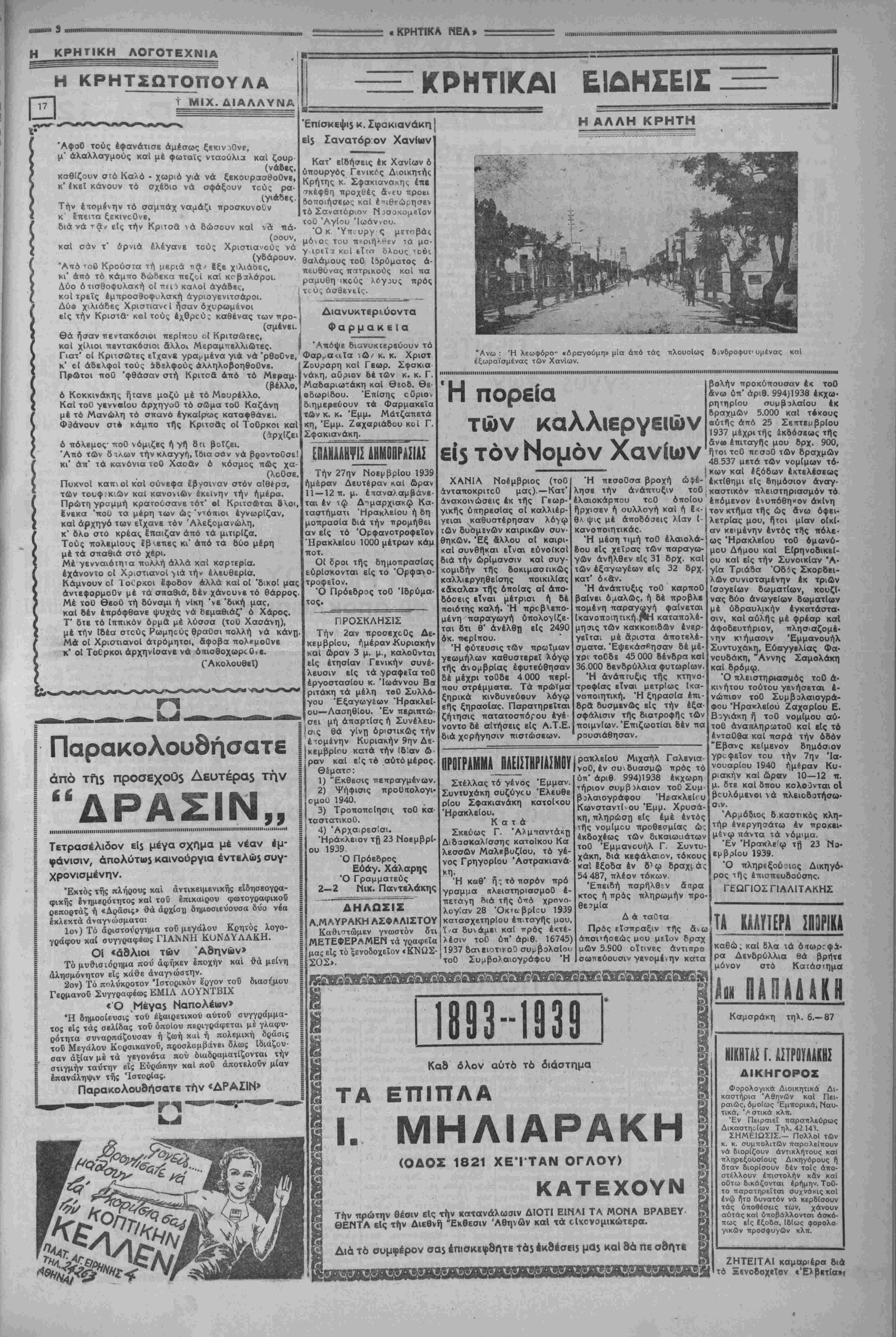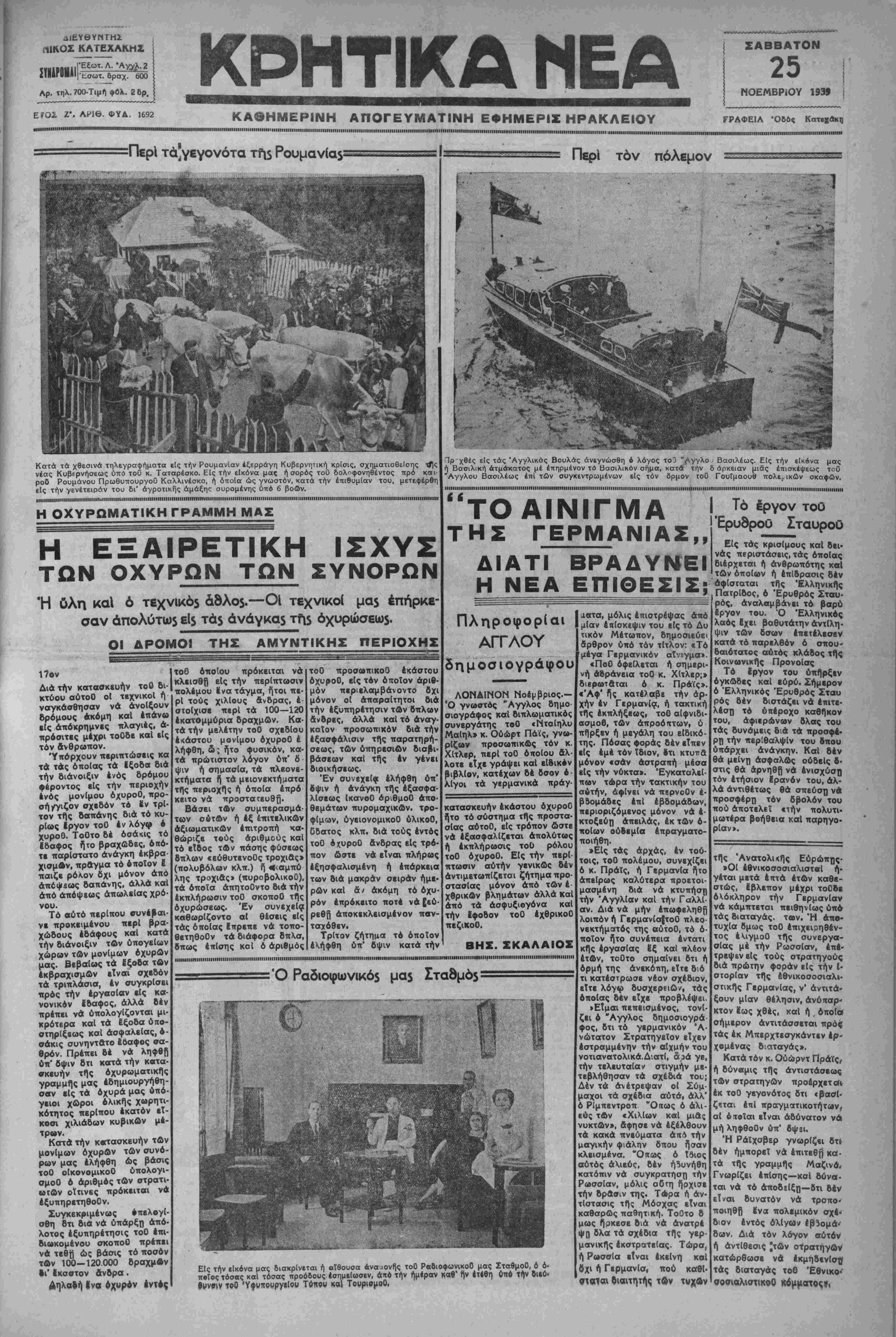 βίνφ καΙ Παρισίοις προέβη-! ΣβΡ£ι!<ή ^υβέρνησις δεν εΤναι διατεθη- σαν χθες τήν^ νύκτα ίΐς τά ?μ*νη νά Ικανοποίηση τάς αξιώσεις ταύτας 1 Τ ϊ χτίς Γερμανίας, θεωροΟσα τά χρέη ώς παρά ^^1;^^ σΗϋνθηκης ίωνΒΒρσαλ- λιώνι σχεηκ* διαβήματα. τους έδηλώθη δτι θά εύρε- θη τρόπος ν* μή θιγη τό έξαγωγικόν έμπόριον τών χωρών των. Η ΤΟΠΟΘΕΤΙΙΣΙΣ II ΤΗΣ ΤΟΥΡΚΙΑΣ Η ΧΘΕΣΙΝΗ ΕΚΤΑΚΤΟΣ πολεμική σύσκεψη έν Βερολίνω ΑθΗΝΜ 25—11—39 (τοΟΙπίψϊΐς των έ*1 της καταστάΐλωνο—ΓερμανικοΟ πολέμου ναντήση. δυσχέρείας είς τήν άνταποκριτοΟ μας).—Ένσχέ Ι σβως καΙ επί της πορείας Ι προς τάς γνώμας τών στρα " ΟΊΟΝΤΟΝ [Ν ΑΠΑΙΑ επί της σει μέ τήν χθεσινή ν Εκτακτον | τήν οιχοίαν πρέπει πολεμικήν σύσκεψιν έν Βέρο λίνφ ύπό τήν ιΐμοεδρεία^ του Καγκελλσρίου Χίτλερ, έγνώσθησαν α( ακόλουθοι νέαι λεπτομέρεια*. Ε(ς τήν ΑΘΗΝΑΙ 25-11— 39 (τοΟ άνταποκριτοΟ Ισύσκι ψ ν αυτήν μετέσχον οΐ "ν "~α' & τηλενραφϊΐται έκ Κο^εγ-|άνώταΐοι αρχηγοί τών Γερ Δυνάμεις αϊ άποτβλοΟσαι'μανικών ένοπλων δυνάμεων, μας).— Καθ χάγηο, αϊ τόν Συνασπισμόν τοϋ "Οσλο θά ανταλ¬ λάξουν τάς απόψεις τ«ν καΙ θά καθορί σουν κοινήν στάσιν έναντι ττ)ς αναγγελ¬ θείσης γκνικεύσεως τοϋ οίκοντμικοϋ ά- ποκλβισμοϋ εναντίον τής Γερμανίας. ΑΥΙΣΟΑΕΙΣ ΜΑΧΑΙ ΜΕΤΑΞΥ ΚΙΗΕΖΟΗ ΚΑΙ ΑΘΗΝΑΙ 25—11-39 (τοΟ άνταπ)τοϋ μας)— Τδ πρακτορείον «ΡώΟιερ» πληρο¬ φορείται έκ Χόγκ—Κόγο δτι λυσσώδης μάχη διεξάγεται είς τήν περιφέριιαν τοΟ ΠακόΙ μεταξύ Κινίζων καΙ Ιαπώνων. Έξ ΐσου σκληραΐ μάχαι συνάπτονται καΙ <1ς τά αλλά μέτωπα έν Κίνα. Η ΙΑηΟΝΙΑ ΕΠΙΘΥΜΕΙ ΣΥΝΕΝΝΟΗΣΙΝ ΜΕ ΑΜΕΡΙΚΗΝ ΑΘΗΝΑΙ 25—11—39 (τοϋ άνταποκριτοϋ μας)— Κατά πρωϊνά τηλβγραφήματα έκ Τόκιο, ΰπδ τοΟ Ίάπωνος Υπουργοϋ Έ ξωτερικών έδηλώθη χθες δτι ή Ίαπω νία θά καταβάλυ κάθε προσπάθειαν δ πως έηιτύχα φίλικήν διευθέτησιν δλων τών διαφορών της μετά τών Ηνωμένων Πολιτειών» κληθέντες ύπό τοΟ Φύρερνά εκθέσουν ελευθέρως τάς σ¬ λάβου ν αϊ πολεμικοί έπ.χερή σεις. 'Ο Χίτλερ άφοΟ ήκουσβ τάς άποψης τών αμέσων ή γετών τοΟ Γερμανικέ0 στρα· ήδη νά|τηγώντου. ΠαρΟμοΙα σύσκε- τοΟ, θά καθορ(σ(| ποία θά είναι ή προσεχής Γερμα¬ νική πολεμική δρβαις, συν- δυάζων τήν πεΐραν τοΟ Πο- ψ.ς δέν συνεκροτήθη έν Γβρ- μανία άπό της άρχης τοΟ πο· ΑΘΗΝΑΙ 25—11—39 (τοϋ άνταποκριτοΟ μας). Άγγέλλεται έκ Κωνσταντινουπόλε¬ ως βτι τό Πρακτορειον ι Ανατολής» δια¬ ψεύδει τάς φήμας δτι ή Τουρκία θά συ- ιήν τοποθέτησιν τών προϊότων της έν Αγγλία. Κατά τάς Τουρκικάς εφημερίδας είναι βέβαιον δτι ή έν Λονδίνω Τουρκική εμπορική άποστο λή ύπό τόν Ύφυπουργόν εξωτερικών θά λέμου, δι* δ αποδίδεται έξαι- επιτύχω τήν σύναψιν συμφωνίας, άνταπο- ρετική σοβαρότης είς τάς κρινομένης είς τά συμφέροντα καί τάς αποφάσεις αύτης. Ού5έν έ- άνόγκας καΙ τών δύο^χωρών. πίσημον ανακοινωθέν εξεδό¬ θη περί τών θεμάτων τά ό¬ ποια άπησχόλησαν τοός δια- σκεφθέντας. ΤΟ ΠΟΛΕΜΙΚΟΝ 24ΩΡΟν ΑΘΗΝΑΙ 25—11—39 (τοΟ δέ Γαλλικόν δτι κατερρίφθη- πλάνα εξακολουθούν τήν δι- άνταποκριτοΟ μας).— Κα-1 σαν οκτώ Γερμανικά, ίναν- τά τό εκδοθέν χθες εσπέρας | τι ενός μόνον ΓαλλικοΟ. Έ- ύπό τοΟ ΓαλλικοΟ ΓενικοΟ Επιτελείου πολίμικόν ανα¬ κοινωθέν, οΐ Γερμανοί επε¬ χείρησαν χθες έπίθεσιν ανα¬ τολικώς τοΟ Μαζέλλσ, άλλ' άπεκρούσθησαν, άφίσαντες ε(ς χείρας τών Γάλλων στρα¬ τιωτών πολλούς σίχμαλώ- τους. Επίσης τό πυροβολι¬ κών Ιδρασε εντόνως εις τόν ανωτέρω τομέα καΙ διά¬ φορα αλλά σημεία τοΟ με¬ τώπου. Ή δραοις δμως της αεροπορίας ύπαρξε μειωμέ¬ νη. Αμφότερα τά |*νακοινω· θέντα άσχολοΟνται μάλλον μέ τάς αερομαχίας αΐτινες συνήφθησα