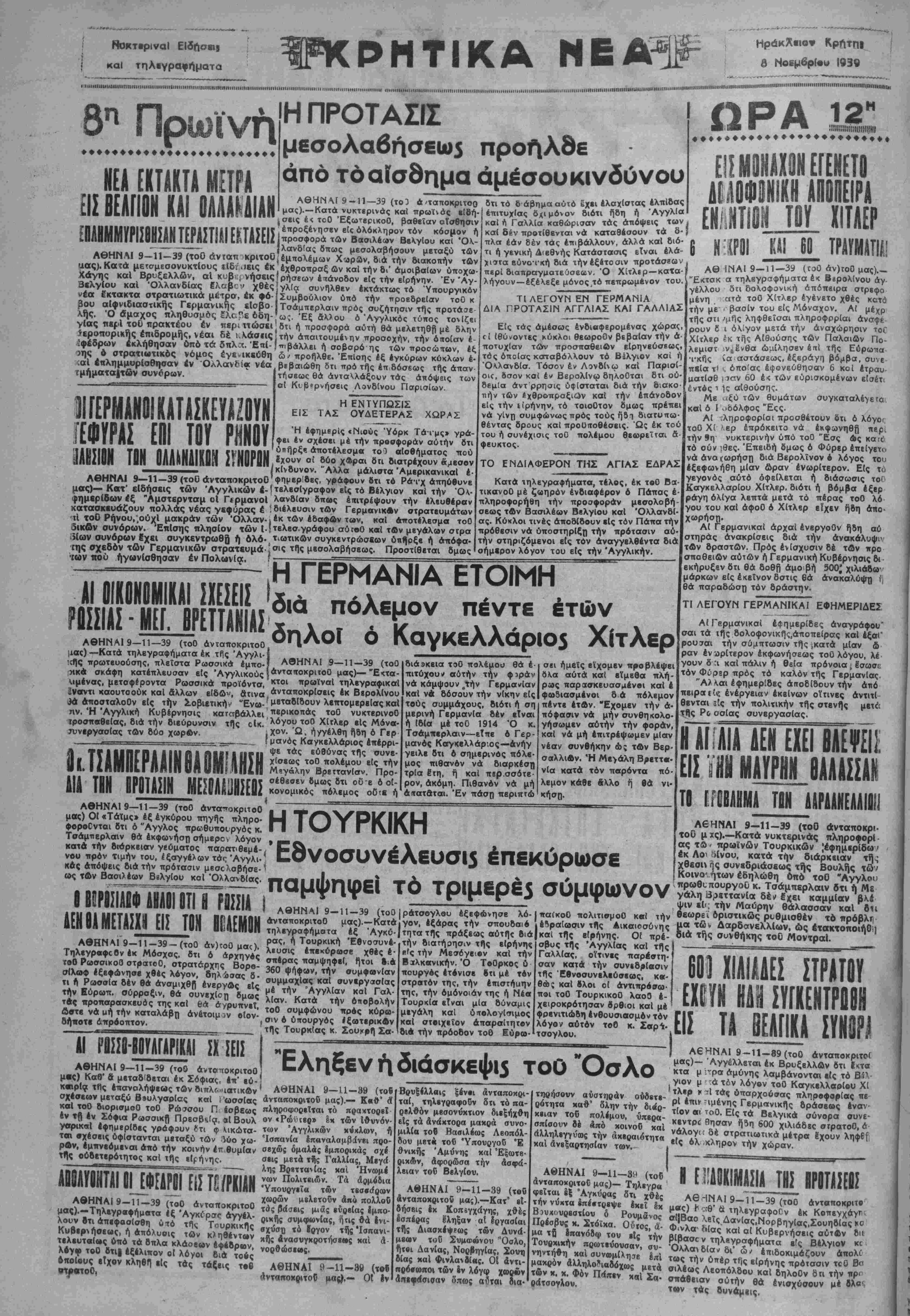 Εκτσκ α τηλεγραφήματα έ< Ββρολίνου όγ γέλλου 8" δολοφονική απόπειρα στρβφο μένη ατά τοΟ Χίτλερ έγένετο χθες κατά τήν με· · βασίν του είς Μόναχον. Αϊ μέχρ τής στι /μΠς ληφθεΐσαι πληροφρρίαι άναψε ρουν 6 ι όΜγον μετά τήν άναχώρησιν τοΓ Χίτλερ ίκ τής Αιθούσης τών Παλαιών Πο- λεμιστ νν^ένθα ώμίλησεν έπί τής Εόρωκτα •ι-κής ία.αστάσεως, έξεράγη βόμβα, συν ε πεία ΐ' ι. όποιας έψονεύθησαν 6 κοί έτραυ ματίσθ ιταν 60 έ< των ευρισκομένων εισέτι έντβς ι 1ς αίθούσης. Με νίξύ τών θυμάτων συγκαταλέ>ετα
