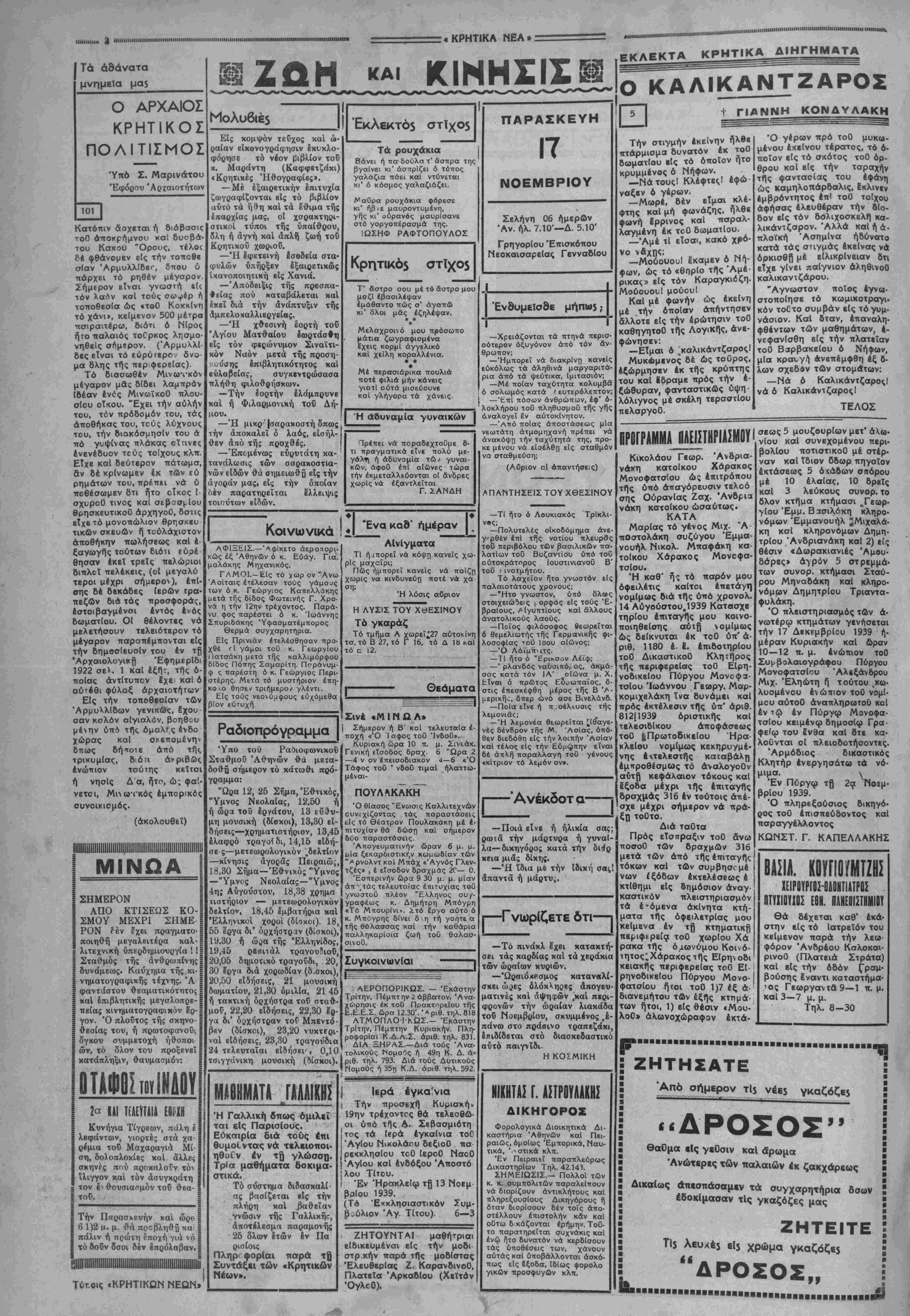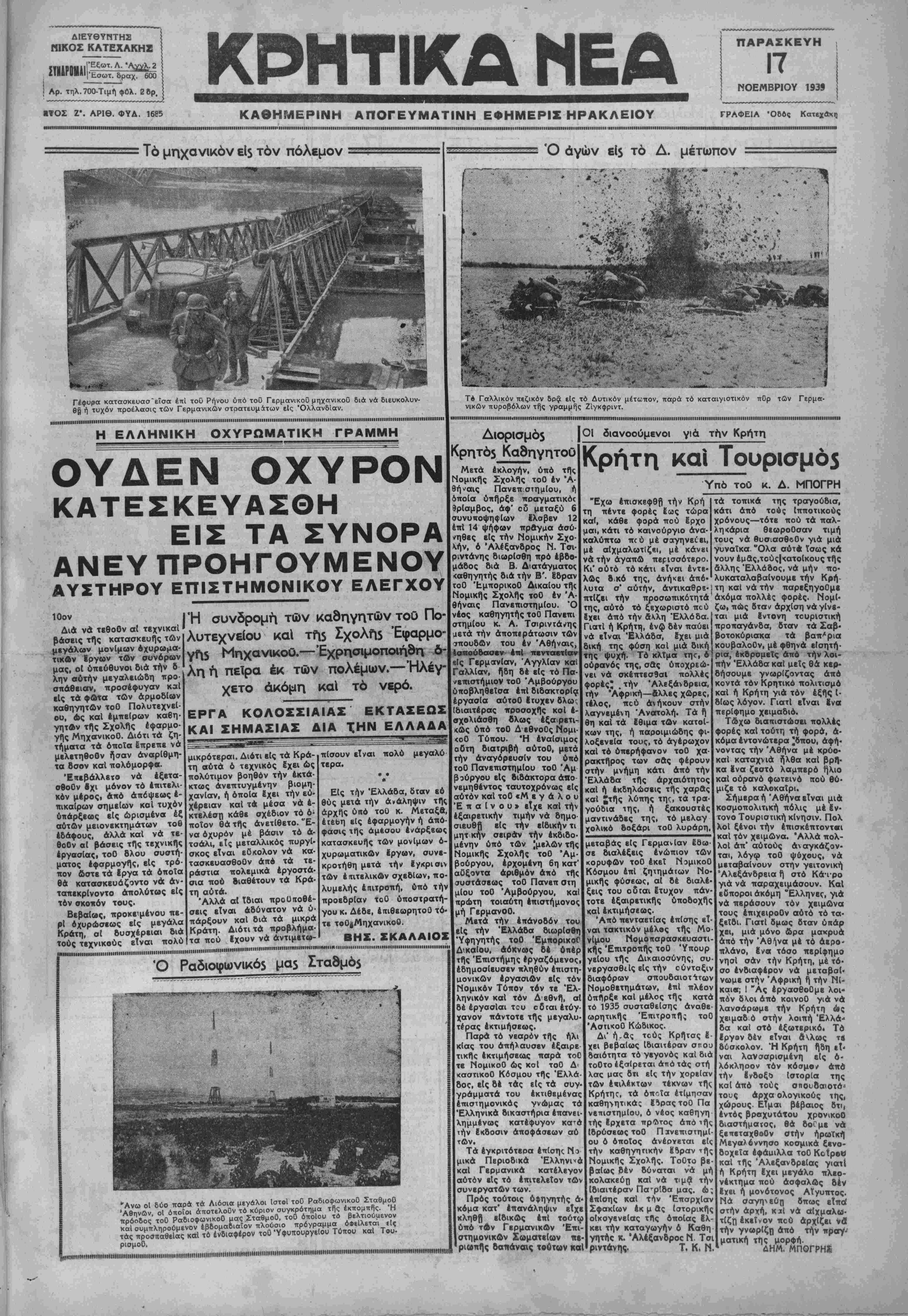γή ΜηχανικοΟ.—Έχρη<ημοπ«ή9η *" ληη πείρα εκ τών πολέμων.—"Ηλέγ _ · ■ # ΙΟον Διά νά τβθοΟν αϊ τβχνικαΐ βάσεις τής κατασκευής τών μβγάλων μονίμων όχυρωμα- τικΑν Εργων των συνόρων μας, οΐ υπεύθυνοι διά τήν δ λην αυτήν μεγαλειώδη προ· σπάθειαν, προσέφυγαν καΐ είς τά φβτα τών αρμοδίων καθηγητών τοΟ Πολυτεχνεί¬ ου, ώς καΐ εμπείρων καθη· γητβν της Σχολής εφαρμο¬ γής ΜηχανικοΟ. Διότι τά ζη¬ τήματα τά όποϊα έπρεπε νά μελετηθοΟν ήσαν αναρίθμη¬ τα 8σον καΐ πολόμορψβ. Έπεβάλλετο νά έξετα- σθοΟν β χι μόνον τό έπιτελι- κόν μέρος, άπό απόψεως ε¬ πικαίρων σημείων καΐ τυχόν υπάρξεως είς ώρισμένα έξ αυτών μειονεκτημάτων τοβ εδάφους, αλλά καΐ νά τε- θοΟν αϊ βάσεις τής τεχνικής εργασίας, τοΟ δλου συστή¬ ματος εφαρμογής, είς τρό¬ πον ώστε τά έργα τά όποια θά κατασκευάζοντο νά άν- ταπεκρίνοντο απολύτως είς τόν σκονόν τους. Βεβαίως, προκειμένου πε¬ ρί όχυρώσεως είς μεγάλα Κράτη, αϊ δυσχέρειαι διά τους τεχνικούς εΤναι πολύ χετο ακόμη καΐ τό νερό. ΕΡΓΑ ΚΟΛΟΣΣΙΑΙΑΣ ΕΚΤΑΣΕΩΣ ΚΑΙ ΣΗΜΑΣΙΑΣ ΔΙΑ ΤΗΝ ΕΛΛΑΔΑ διανοούμενοι γιά τίν Κρήτη μικρότεροι. Διότι είς τά Κρά¬ τη αυτά ό τεχνικός ϊχει ώς πολύτιμον βοηθόν τήν εκτά¬ κτως άνεπχυΥμένην βιομη- χανίαν, ή οποία Ιχει τήν εύ- χέρειαν και τά μέσα νά έ- κτελέση κάθε σχέδιον τό ό¬ ποιον θάτής άν ετίθετο. "Ε¬ να όχυρόν μέ βάσιν τό α¬ τσάλι, εΐς μεταλλικός πυργί¬ σκος είναι ευ κόλον νά κα¬ τασκευασθούν άπό τά τε¬ ράστια πολεμικά έργοστά- σια πού διαθέτουν τά Κρά¬ τη αυτά. 'Αλλά αϊ ΐδιαι προΟκοθέ- σεις είναι αδύνατον νά υ¬ πάρξουν καΐ διά τά μικρά Κράτη. Διότι τά προβλήμα¬ τα πού Ιχουν νά αντιμετω¬ πίσουν είναι πολύ μεγαλό τερα. * · * Είς τήν Ελλάδα, δταν εό θύς μετά τήν άνάληψιν τής αρχής ύπό τοΟ κ. Μεταξά, έΐε&η είς έφαρμογήν ή άπό· φασις τής αμέσου ενάρξεως κατασκευής τών μονίμων ο¬ χυρωματικών ίργων, συνε- κροτήθη μετά τήν ϊγκρισιν τών επιτελικών σχεδίων, πο¬ λυμελής επιτροπή, ύπό τήν προεδρίαν τοΟ υποστρατή¬ γου κ. Δέδε, επιθεωρητού* τό¬ τε τοΟ|ΜηχανικοΟ. ΒΗΣ. ΣΚΑΛΑΙΟΣ Έχω έπισκεφθβ τήν Κρή τη πέντε φορές έως τώρα κα(, κάθε φορά πού Ερχο μαι, κάτι τό καινούργιο ανα¬ καλύπτω πού μέ σαγηνείει, μέ αιχμαλωτίζει, μέ κάνει νά τήν αγαπώ περισσότερο. Κι' ούτό τό κάτι είναι εντε¬ λώς δ.κό της, ανήκει από¬ λυτα σ' αυτήν, άντικαθρε·; ταίζει τήν προσωπικότητα της, αυτό τό ξεχωριστό πού ίχει άπ6 τήν άλλη Ελλάδα, "ιατί ή Κρήτη, ένώ δέν παύει ά εΤναι Ελλάδα, Ιχει μιά δική της φύση κοί μιά δική της ψυχή. Τό κλίμα τη<τ, ό ουρανός της, σας υποχρεώ¬ νει νά σκέπτεσθαι πολλές φορές* .τήν Αλεξάνδρεια, Γήν "Αφρική—άλλες χώρες, τέλος, πού άήκουν στην λαγνεμένη Ανατολή. Τά ή θη καΐ τά Εθιμα τών κατοί¬ κων της, ή παροιμιώδης φι- λοξενεία τους, τό άγέρωχον καΐ τό ύπερήφανον τοΟ χα· ρακτήρος των σας φέρουν στην μνήμη κάτι άπό τήν Ελλάδα τής αρχαιότητος καΐ ή εκδηλώσεις τής χαράς καΐ 2τής λύπης της, τά τρα¬ γούδια ιης, ή ξακουστές μαντινάδες της, τό μελαγ χολικό δοξάρι τοΟ λυράρη, τους τεχνικούς βιν«ι ιι«/ν< ·*« ■·~-' -λ--· · --------- ,,,,„„„......1,,............,,„«„............"».....................................Β1,η,».»ηη.η..η™ηπ-.».-«.Η,,.............,......„.., Ό Ραδιοφωνικό$ μα$ Στα8μό$ "Ανω οΐ δύο παρά τά Λιόσια μεγάλοι ΙστβΙ τοΟ Ραδιοφωνικοί) ΣταθμοΟ 'Αθηνών οΐ οποίοι άποτελοΟν τό κύριον συγκρότημα τής εκπομπής. Η πρόοδος" τοΟ ΡαδίΟφωνικοΟ μας ΣταθμοΟ, τοΟ οποίου τό βελτ.ουμενον καί συμπληρούμενον έβδομαβιαίον πλούσιο πρόγραμμα οφείλεται ίΐς ΐάς προβηαθεΐΚ καί τό ενδιαφέρον τοΟ Υφυπουργείου Τύπου καί Του- ρισμοΟ. ΙΙΗΗΜ.Η.ΜΗΙ.Ι·ΙΙΜΙ