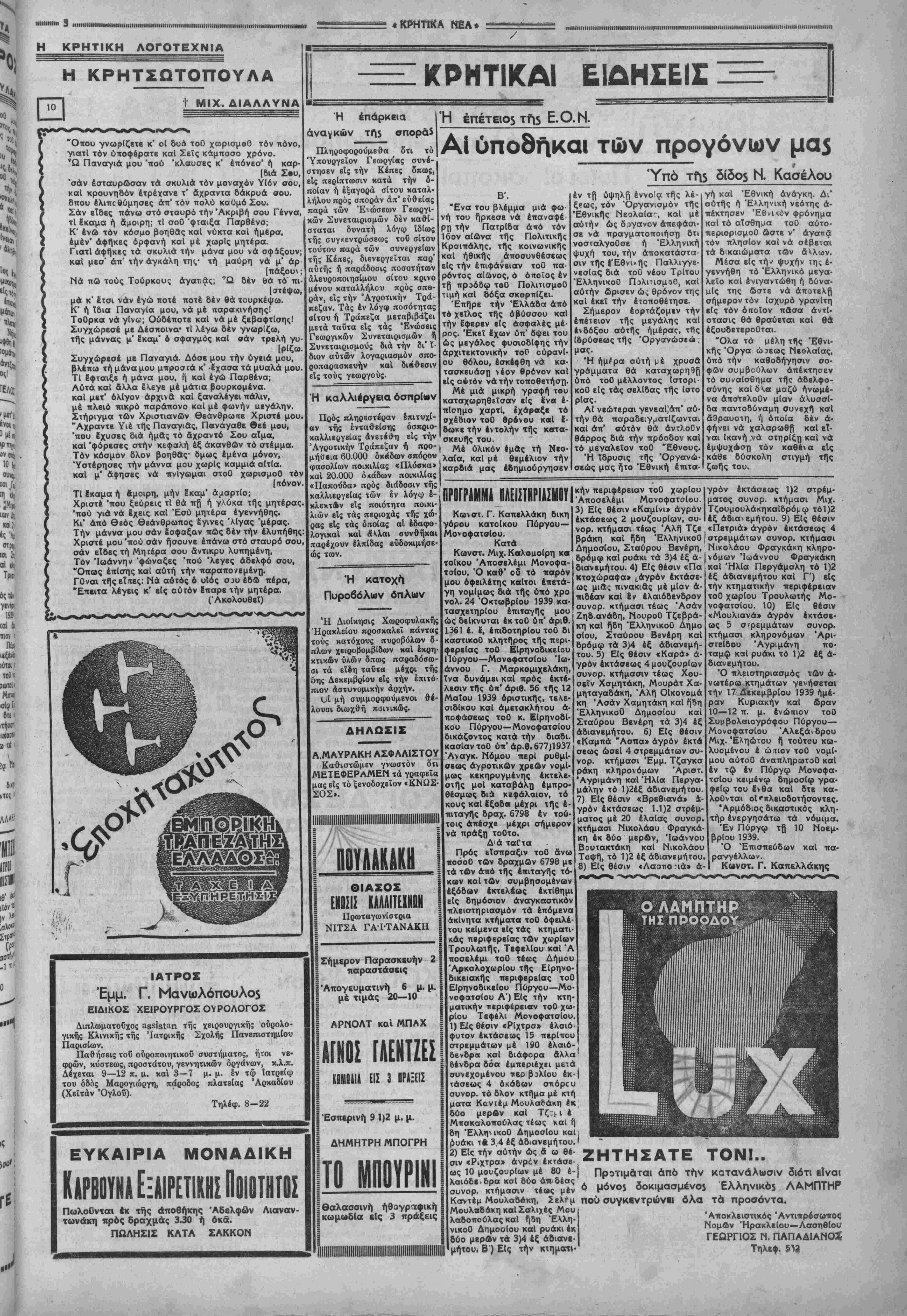 ιιιη(ΐιιιιιιιιιιιιιιιιιιιιιιιι:ιιιιηιιιιιιΐ|ΐίΐιιιιιιιιιιιιιιπιιιιιιιιιιιι<ιιιιιιιιΐιιιιι)ιΐΐιΐιιίηϋιΠΙιιΐιιΐιιΐιιηιιιιιιιΐιιι(ιιιι Η ΚΡΗΤΙΚΗ ΛΟΓΟΤΕΧΝΙΑ Η ΚΡΗΤΣΩΤΟΓΤΟΥΛΑ 1" ΜΙ Χ. ΔΙΑΛΛΥΝΑ "Οπου γνωρίζετε κ" οί δυό τοΟ χωρισμβΟ τόν πόνο, γιατί τόν υποφέρατε καΐ Σεις κάμποσο χρόνο. ΤΩ Παναγιά μου 'πού 'κλαυσβς κ' έπόνεσ' ή καρ- [βιά Σ·υ, 'σάν έσταυρώσαν τά σκυλιά τόν μοναχόν Υίόν σου, καΐ κρουνηδόν έτρέχανε τ' άχραντα δάκρυα σου. δπου έλιπο θύμησες άπ' τόν πολύ καϋμό Σου. Σάν εΤδες πάνω στό σταυρό τήν Ακριβή σου Γέννα, τΐ Εκαμα ή άμοιρη; τΐ σοΟ 'φΐαιξα Παρθένο; Κ' ένώ τόν κόσμο βοηθάς καΐ νύκτα και ήμερα, έμέν' άφήκες ορφανή καί μέ χωρίς μητέρα. Γιατί άφήκες τά σκυλιά τήν μάνα μου να σφίξουν; καΐ μεσ* άπ' τήν αγκάλη της* τή μαύρη νά μ' άρ [ € ί ΚΡΗΤΙΚΑ! ΕΙΔΗΣΕΙΣ ί Νά πω τους Τούρκους άγατιδς; ΤΩ δέν θά τό πι- [στέψω, μά κ' Ιτσι νάν έγώ ποτέ ποτέ δέν θά τουρκέψω. Κ' ή ίδια Παναγία μου, νά μέ παρακίνησης! ΤοΟρκα νά γίνω; Ουδέποτε καΐ νά μέ ξεβαφτίσηςί Συγχώρεσε με Δέσποινα* τΐ λέγω δέν γνωρίζω, τής μάννας μ' έκαμ' ό σφαγμός καϊ σάν τρελή γυ· [ρίζω. Συγχώρεσε με Παναγιά. Δόσε μου τήν υγειά μου, βλέπω τή μάνα μου μπροστά κ' -Εχασα τά μυαλά μου. ΤΙ Εφταιξε ή μάνα μου, ή" καϊ έγώ Παρθένα; Αυτά καί αλλά έ'λ,εγε μέ μάτια βουρκομένα. καϊ μετ' ολίγον αρχινά καϊ ξαναλέγει πάλιν, μέ πλειό πικρό παράπονο καϊ μέ φωνήν υεγάλην. Στήριγμα των Χριστιανών θεάνθρωπε Χριστέ μου. "Αχραντε Υιέ τή"ς Παναγίας, Πανάγαθε θεέ μου, 'που Εχυσες διά ήμας τό Αχραντο Σου αΤμα, καϊ 'φόρεσες στην κεφαλή έξ ακανθών τό στέμμα. Τόν κόσμον δλον βοηθάς* δμως εμένα μόνον, Υστέρησες τήν μάννα μου χωρίς καμμιά αίτία. καϊ μ' άφησες νά πνίγωμαι στοΟ χωρισμοΟ τόν [πόνον. ΤΙ Εκαμα ή Αμοιρη, μήν Εκαμ' άμαρτίσ; Χριστέ 'που ξεύρεις τΐ θά πβ ή γλύκα τής μητέρας, 'πού γιά νά Εχεις καϊ Έσύ μητέρα έγεννήθης. Κι' άπό θεός θεάνθρωπος έγινες 'λίγας "μέρας. Τήν μάννα μου σάν έσφαξαν πώς δέν τήν έλυπήθης: Χριστέ μου 'πού σάν ήσουνε επάνω στό σταυρό σου, σάν είδες τή Μητέρα σου Αντίκρυ λυπημένη, Τόν Ιωάννη ν "φώναξες 'πού 'λεγες αδελφό σου, "Οπως επίσης καϊ αυτή τήν παραπονεμένη. ΓΟναι τήςεΐπες: Νά αυτός 6 υΙός σιυ έβώ πέρα, "Επειτα λέγεις κ' είς ούΐόν Επαρβ τήν μητέρα. (Ακολουθεί) ΙΑΤΡΟΣ Έμμ. Γ. Μανωλόπουλο$ ΕΙΔΙΚΟΣ ΧΕΙΡΟΥΡΓΟΣ ΟΥΡΟΛΟΓΟΣ Διπλωματοΰχος ^ίδί^η της χειρουργικής ουρολο¬ γικής Κλινική; της Ιατρικής Σχολής Πανεπιστημίου Παρισίων. Παθήσεις τοΰ ουροποιητικοί συστήματος, ηΐοι νε· φρών, κύστεως, προστάτου, γεννητικών οργάνων, κ.λ.π. Δέχεται 9—12 π. μ. και 3—7 μ. μ. §ν τψ ϊατρείω του οδός Μαρογιώργη, πάροδος πλατείας Αρκαδίου (Χεΐτάν Όγλου). Τηλέφ. 8—22 ΕΥΚΑΙΡΙΑ ΜΟΝΑΔΙΚΗ Καρβουνά Εξαιρετικής Ποιότητος Πωλούνται 4κ ττ)ς αποθήκης Αδελφών Λιαναν- τωνάκη προς δραχμάς 3.30 η όκα. ΠΛΛΗΣΙΣ ΚΑΤΑ ΣΛΚΚΟΝ Ή επάρκεια αναγκών ΤΠ5 σποράί Πληροφορούμεθα δτι τό Ύπουργεΐον Γεωργίας συνέ- στησεν είς τήν Κέπβς δπως, είς περίπτωσιν κατά τήν ο¬ ποίαν ή εξαγορά σίτου καταλ¬ λήλου προς σποράν άπ' εύθείβς παρά τών Έ-.ώσεων Γεωργι¬ κών Συνεταιρισμών δέν καθί¬ σταται δυνατή λήγω Ιδίως τής συγκεντρώσεως τοΰ σίτου τούτου παρά τών συνεργείων τής Κέπες, διενεργείται παρ' αυτής ή παράδοσις ποσοτήτων άλευροποιησίμου σίτου κρίνο μένου καταλλήλου προς σπβ- ράν, είς τήν 'Αγροτικήν Τρά- πεζαν. Τάς έν λόγω ποσότητας σίτου ή Τράπεζα μεταβιβάζει μετά ταΰτα είς τάς Ενώσεις Γεωργικών Συνεταιρισμών ή Συνεταιρισμούς διά τήν 8ι' ί¬ διον αυτών λογαριασμόν σπο- ροπαρασκευήν καϊ διΐίθεσιν εί