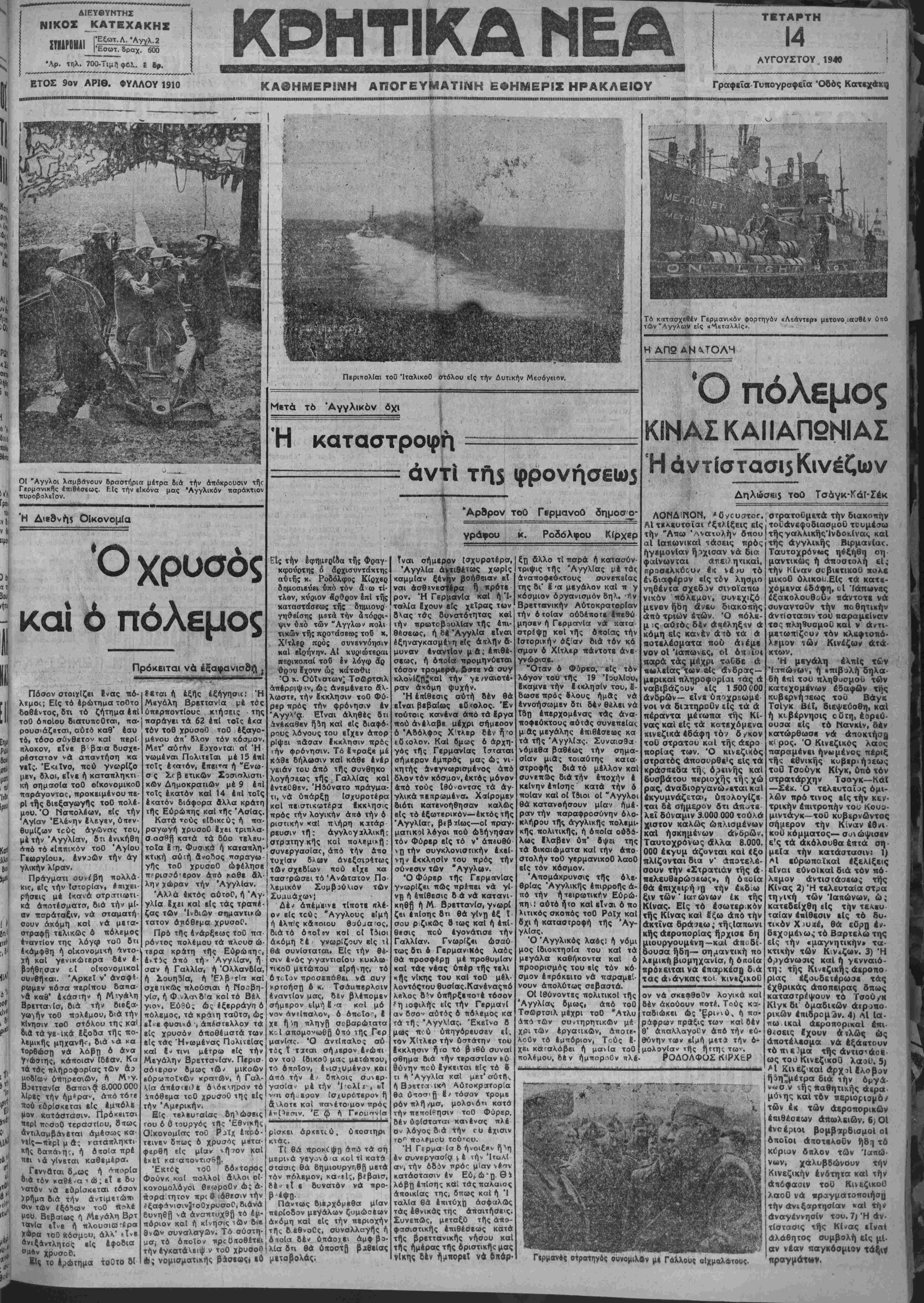 εΐναι βεβαίως εΟ<ολος. Έν τούτοις κανένα άπό τά Εργα πού ανέλαβε μέχρι σήμεοον ό "Αδόλφος Χ'τλερ δέν ήτο ιΟίολον. ΚαΙ 6μως 6 αρχη¬ γός της Γερμανίας Τσταται σήμερον εμπρός μας ώ; νι¬ κητής ανεγνωρισμένος άπό δλον τόν κόσμον, εκτός μόνον άπό τους Ιθύνοντας τά άγ γλικά πεπρωμένα· Χαίρομεν διότι κατενοήθησαν καλώς είς τό έξωτερικόν—εκτός της "Αγγλίας, βεβίίως—οί πραγ ματικοί λόγοι πού ώ&ήνηβαν τόν Φύρερ είς τό ν' άπβυθύ ν η τήν συγκλσνισηκήν έκβί- νην ΕκκλησΙν του προς τήν σύνβσιν των Ό Φύρερ Αγγλων, της Γερμανίας γνωρίζει πως πρέπει νά γ( νρ ή έπίθεσις δ ά νά κατανι¬ κηθώ ή Μ. Βρεττανίσ, γνωρί ζει επίσης δτι θά γίνη έξ Ι σου ρ.ζικως σ τως και ή έπί- θβσις πού έγονάτισε τήν Γαλλίαν. Γνωρίζει ώσαύ τως δτι & Γερμανικός λαός θά προσφέρπ μέ προθυμίαν καΐ τάς νέας υπέρ της τέλι χής νίκης του καΐ τοθ μέλ- λοντόςτου θυσίας.Κανέναςπό λβλος δ*ν Οπήρξεποτέ τόσον ?ηιοφιλή·ς είς τήν Γερμανί αν δσο·- αυτός ό πόλεμος κα τά τη^ Αγγλίας. Έχείνο δ μοβς πού ϋπηγόρευάεν εί. τόν Χίτλερ τήν ύστάτην του Εκκλησιν ί)το τό 0 ϊβύ συνα( σθημα διά τήν τεραστίαν ίύ βΰνην πού Εγκειται είς τό 8 τι ή Αγγλία καΐ μΒτ'αύτη ή Β^βττα ΐκ«Ί Αύτοκραιτορία θώ ύιοσ>β ϊ^ τόσον τρόμε
