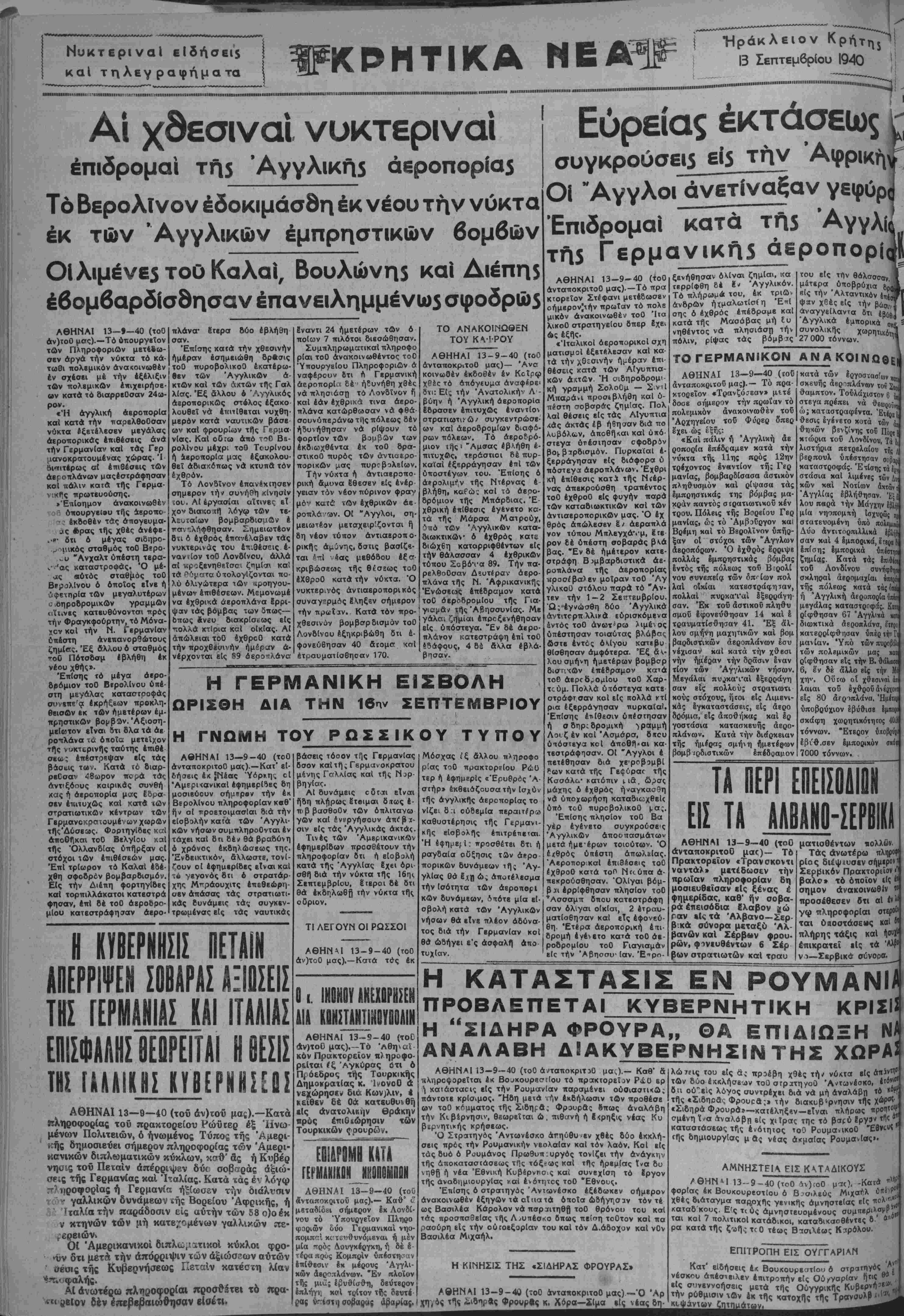 ων τοθ κ<*αματος τής Σιβη^β; Φρουράς 8πως άναλάβη τήν Κιβέρνησιν, θεωρείται ώ. πιθανή ή 6<ρηξις νέας Κυ βερνητικής κρήσβως. Ό Στρατηγός Άντωνέσκο άΓηύθυ'βν χθες δύο εκκλή¬ σεις προς τήν Ρουμσνικήν νεολαίαν καί τόν λαόν. Κοί κίς τάς Βυό ό Ρουμάνος Πρω9υπ:υργός τονίζει τήν ανάγκην τής αποκαταστάσεως τΠς τόξ<ως καί τής ηρεμίας ίνα δυ νηθβ ή νέα Εθνική Κυβέρνπσ.ς καί συνβχίση τό ϊργον τής ώναβημιουργίας καί ένότητος τοθ "Εθνους. Επίσης ό στρατηγός Άντωνέσκο έξέοωκεν σήμερον ανακοινωθέν έξηγων τά οΤπατά όποΐα ώδήγησαν τόν τέ ως Βασιλέα Κάρολον νά πσρΐΐτηθβ τοθ θρόνου του καί τάς προσπσθβίας τής Λ^υπέσκο Οπως τιείαη τοΟτον και πα ραούρη είς τήν ούίοεξορίαν του και τόν Δ.άδοχον καί νΟν Βασιλέα Μιχαήλ. Η ΚΙΝΗΣ1Σ ΤΗΣ «ΣΙΔΗΡΑΣ ΦΡΟΥΡΑΣ» ΑΘΗΝΑΙ 13-9-40 (τοθ ΛνταποκριτοΟ μας)—Ό 'Αρ κ. Χ6ρα—Σίμα δη· του είς ά^ προέβη χθες τή/ ν6<τα είς τ©ν δύο έκκλήσβυν τοθ στριτηνοΰ Ά^τωνέσκο, 6 η ού'εις λόγος συντρέχει βιά νά μή άναλάβη το ^ τής «Σιδηρά, Φρουρά;» τήν 6ιακυβ*ρνησιν τί|ς χώρ«· «Σιδηρά Φρουρά»—καϊέληξβν—είναι πλήρως προητοΐΙ σμένη ϊνα Λναλόβη βίς χιτΡας της τό βαρύ ίργίν τί|<4 καταστάσεως τής ένότηιος τΟ0 ΡουμανίκοΟ ΈΨκ^Λ* ^ς δημιουργίας μ άς νέας ακμαίας Ρουμανίας» ΑΜΝΗΣΤΕΙΑ ΕΙΣ ΚΑΤΑΔΙΚΟΥΣ /ΘΗΝΜ 13-9-40 (τοθ ^ν)ωθ μ^). -Κατά ^ φορίας έκ Βουκουρεστίου ό Βασιλεύς Μιχαήλ Οττβ>Ρ"