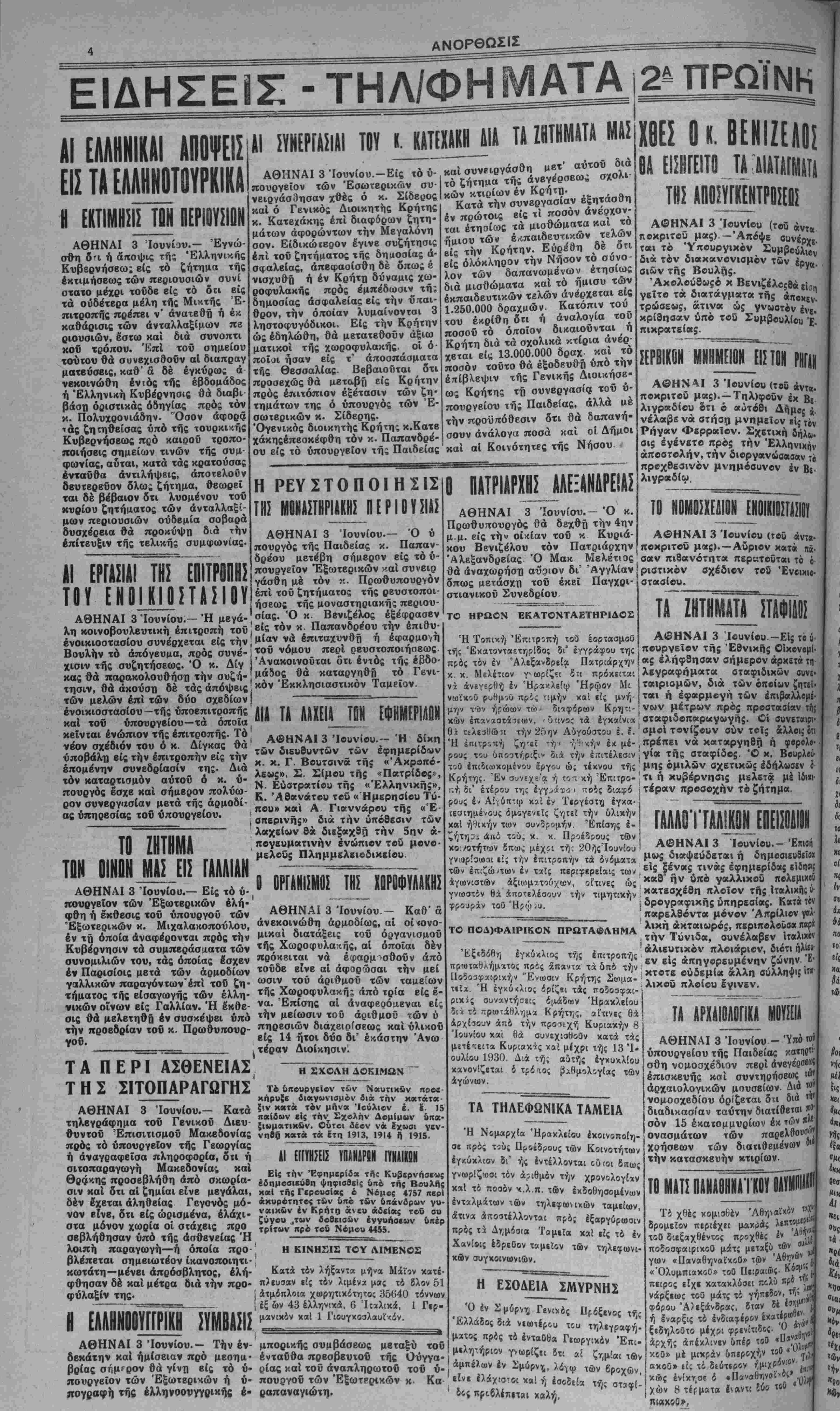 έν Σμύρνης, /<^φ τών 6οου ίίνι «άχιοτοι χα! ή δος προδλίπιχβι χαλ^, ΤΑ ΑΡΧΑΙΟΛΟΓΙΚΑ ΜΟΥΣΕΙΑ ΑΘΗΝΑΙ 3 Ιουνίου - "Υπ* υπουργείου τής Παιδείας κατΐβι1' σθη νομοσχέδιον περί άνβγβρι επισκευής «αϊ συντηρήσεως αρχαιολογικών μουσείων Διό νομοσχεδίου ορίζεται δτι διά «Ι· διαδικασίαν ταΐτην διατίθεται π»" σόν 15 εκατομμυρίων έκ τών »« ονασμάτων τών παρελθοι""»» χρήσεων τών διατιθεμένων οι· χήν κατασκευήν κτιρίων. ΤΙ ΜΑΤΣ ΠΑΝΑΘΗΗΑΊ ΚΟΥ ΒΛΥΜπΙΗ Τ4 χθες χομιαθέν δρομεΐον περιέχει μακράς ΐοΟ διεξαχθένχος προχθές έν ποδοσφαιριχοΟ μάχς μεταξύ ^ν γων «ΠαναθηνβϊχοΟ» χ©ν «ΌλυμπιακοΟ» χοΟ Πειρ«(5'4 πιιρος είχί χαταχλύοει πολύ νάρξιως τοΟ μάχς τό φόρου Ά)εξάνδρα;, ή ίναρξις χά ενδιαφέρον ξεδηλοΟχο μέχρι φρενίχιδος αρχής άπέχλινεν υπέρ χοΟ» μέ μιχράν αχοΟ» ίϊς τό δι6τ$ρον ιίμιχΡονιον τ«>4