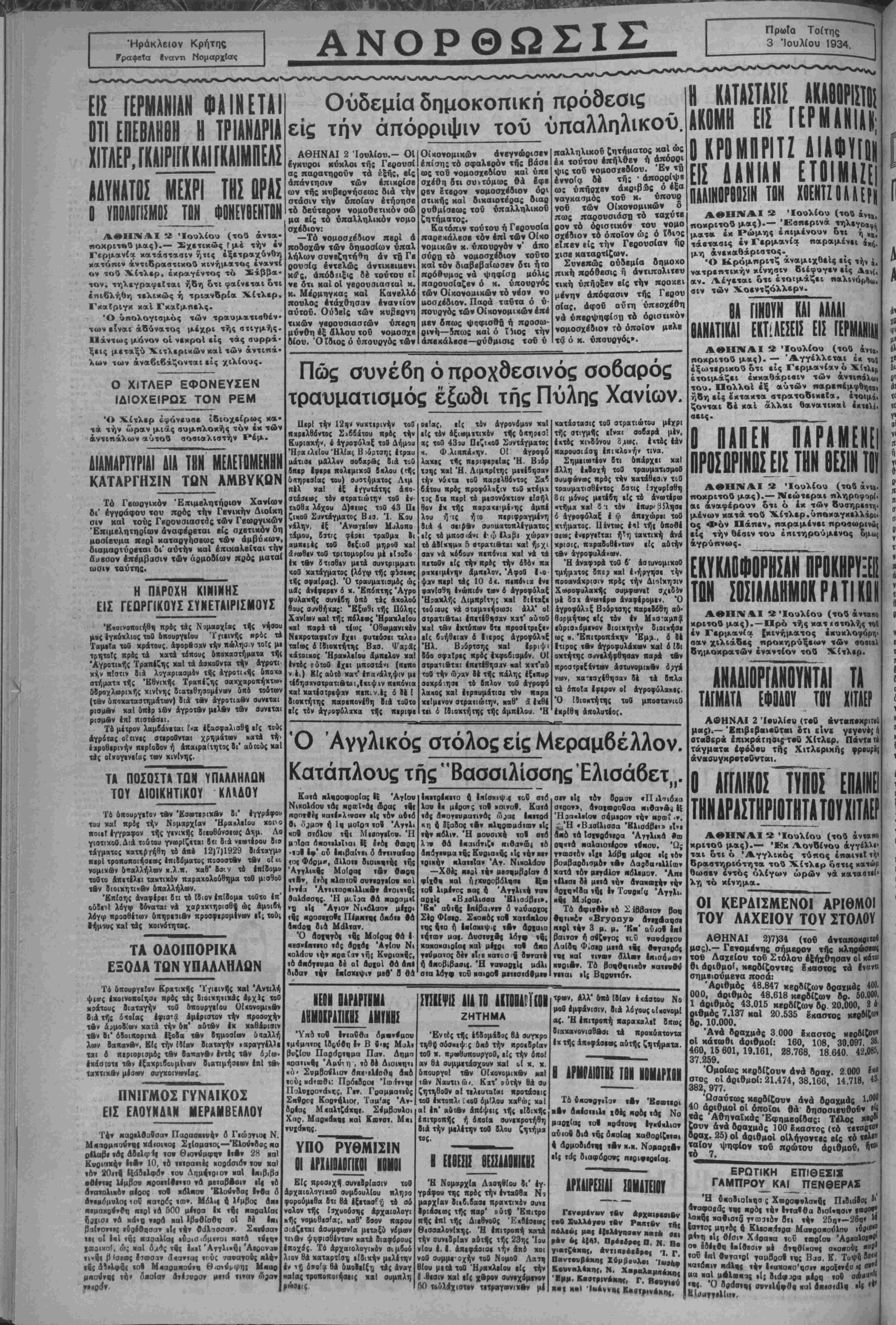 έξωτεριχού ότι είς Γερμανίαν ό Χ<τλ(ρ ετοιμάζει εκκαθάρισιν των άν«τι«νω, τού. Πολλοί έξ αυτών παρεπέμφθη,,, ηδη είς εκτακτα στρατοοικεία, έτοΐμίι ζονται δέ καί άλλαι θανατικαί έκιεΐ* «εις. __________ ΠΑ ΡΟΣΟΡ Ν 1ΣΕΙΣ ΑΡΑΜΕΚΕ ΗΝ ΟΕΣΙΝ ΤΟ ΑΘΗΝΑΙ 2 Ιουλίου (τοΰ άντ*, ποκριτού μας).— Νεώτεραι πληροφορί. αι άναφέρουν ότι ό έχ των Βυσηρεβτη μένων κατά τού Χίτλερ,ύποκαγκελλίρι ος 4*όν Πάπεν, παραμένει προσωριγώ^ είς την θέσιν τού έπιτηρούμενος δμ αγρύπνως. ΠΡΟΚΗΡΥΞΕΙΪ ΕΚΥΚΛΟΦΟΡΗΣΑΝ ΤΩΝ ΣΟΣΙΑΑΔΗΜΟΚΡΑ ΑΘΗΝΑΙ * Ιουλίου (τού κριτού μας).—Πρό τής κατ «ατολής ιοϊ έν Γερμανία [χινήματος έκυκλο^όρ βαν χιλιάοες «ροκηρύξεων των σοβικ οημοκρατών εναντίον τού Χίτλερ. αηααιοργαΜΥηται τα ΤΑίΗΑΤΑ ΕΦΟ-ΟΥ Τ8Υ Χ1ΤΑΕΡ ΑΦΗΝΑΙ 2 Ιουλίου (τ·δ λνταη·Νριτ·. μ«ς).— Ίπιβεβ«ι·ϋται ότι είνε γεγονέ; 4 οταθερά έπιχράτηαις-τοΰ Χίτλερ. Πάντβ τέ τάγματα έφοδου τής Χιτλερικής φρ·υ;έ{ άνασυ γχροτοθνται. Ο ΑΓΓΛΙΚΟΣΤΙΣ ΤΗΝΑΡΑΣΤΗΡίΟΤΗΤΑΤΟΥΧίΤΑΕΡ ΑΘΗΝΑΙ 2 Ιουλίου (τού άν«««« κριτού μας).—· Έκ Λονοίνου άγγέλνε ται ότι ό Άγγλικός τύπος έπαινιΐ «η δραστηριότητα τού Χίτλερ όστις κατώρ θωοεν εντός ολίγων ώρών νά καταβιΐί' λη τό κίνημα. ΟΙ ΚΕΡΔΙΣΜΕΝΟΙ ΑΡΙΘΜΟΙ ΤΟΥ ΛΑΧΕΙΟΥ ΤΟΥ ΣΤΟΛΟΥ ΑΘΗΝΑΙ 2)7)34 (τού άνταποκοιτοί μσς).- Γενομένης σήμερον τής κληρόοεβχ τοθ Λαχείου τοϋ Στόλον εξήχθησαν οί κάιιο θι άριθμοί, κβοδίζοντες 6*αστος τα Ιναν« σημειούμβνα ποοά: 'Αοιθμός 48.847 κβρδίζων δραχμάς 400. 000, άοιθμός 48.618 κβρδίζων δρ. 50.000, 1 άριθμός 43.015 κβοδίζων δρ. 20.000, 2 έ ριθμός 7.137 χαΐ 20.535 έκαστος δίζη δρ. 10.000. Άνά δραχμάς 3.0ΟΟ έκαστος κεοδΐζβ οί κάτωθι άοιβμοί: 160, 108, 30.097, 38, 460, 15 601, 19.161, 28.768, 18 640. 42.085, 37.259. "Ομοίως χβροίζουν ανά λραχ. 2.000 « «Ι άοιθμοί: 21.474, 38.166, 14.718, , 977. 'βσβΰτως κβοβ(ίουν άνά δραχμάς 1.00» 40 άοιθμοί οί δποίοι θά δησοσιβνθοθν Α «άς ΑθηναΙκάς Έφημββίδας: Τέλος κ**» ,ουν άνά δραχμάς 100 έκαστος (τό τ·«οβ«« βραχ. 25) οί άοιθμοί οίλήγοντες είς τό %*<>