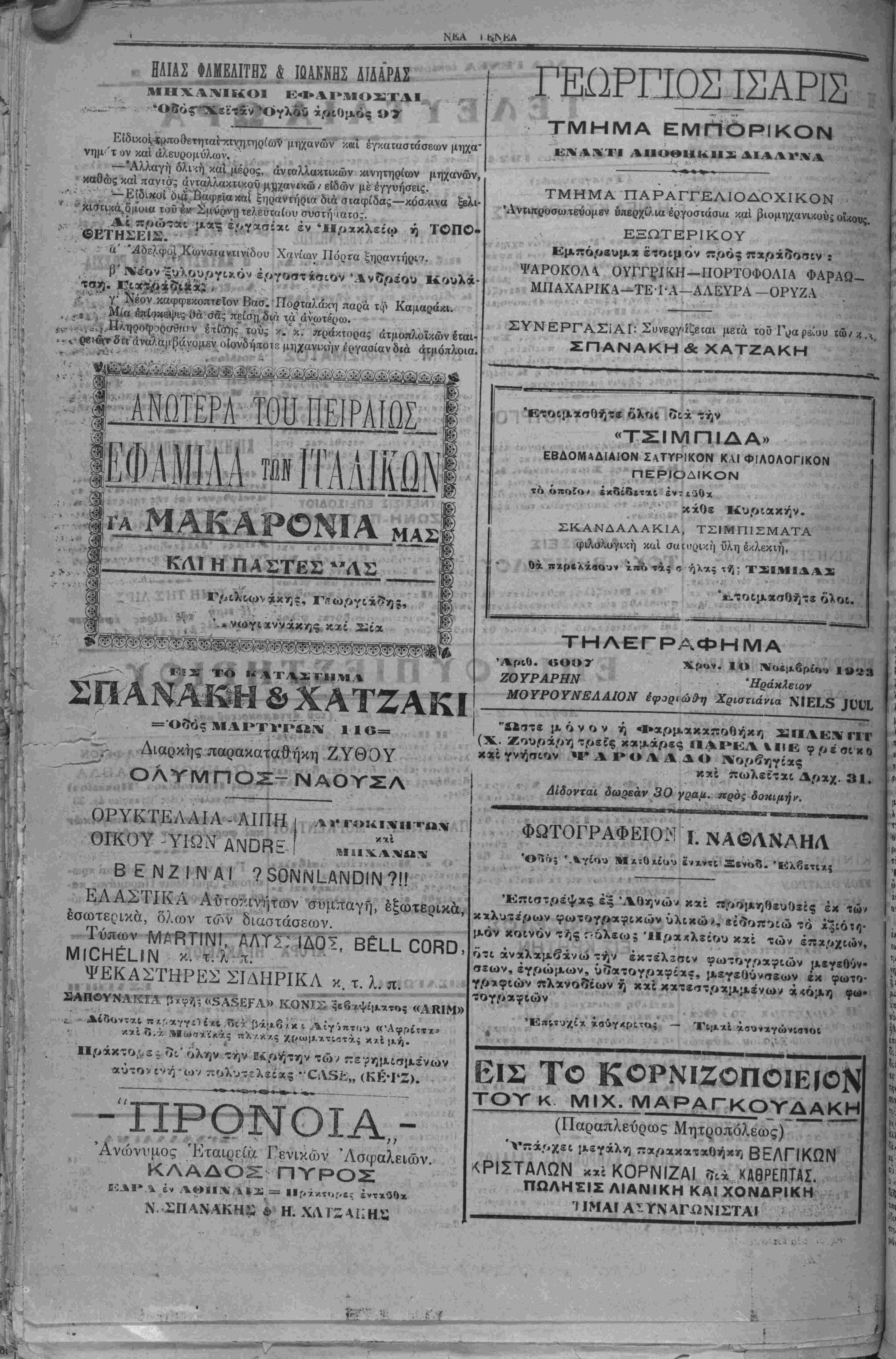 —Άλλαγή όλι<ή καί μέρος, άνιολλακτικών κινητηρίων μηχανών, καθώς καί παντός άνταλλακτιχοϋ μ,ρχανικώ / είδών μέ έγγυήσεις. ■—Είδικαΐ δια^ΒαφεΐακαΙ ξηραντήρια διά σΐαφίδας—κόσ,ανα ξελι· κιοττικα^μυια τοΰΊ&^ΣμνρΛ'ητελευτοίου συστή'ΐαΓος. Ας πρώται μας εργασίαι έν Ηρακλείω ή ΤΟΠ©· ©ΕΤΗΣΕΙΣ. α' Αδελφυ^Κώνσΐαντινίδου Χανίων ΙΙόρτα ξηραντήοι^. β'Λί·εον ςυλουργο.ό* εργοστάσιον Άνδρέου Κουλά· γ* Νέον καφφεκοπτείον Βασ. Πορταλάκη παρά τφ Καμαράκι. Μία επίφίίβψΐις θά σδς πείση, διά τα ανωτέρω. , ^(-:,}..Ι1ληροί)ρ )ρο*ΰ»ίν έτΓσης τυύς *. κ. πράκτορας άτμοπλοϊκών έΐαι- ·.· ρβιφτόπ άναλαμβάνομεν οίονδήποτο μηχανικήν εργασίαν διά άτμόπλοια. ΓΕΩΡΠΟΙ] ΙΣΑΡΙΣ ■β •ψ' Ι λ ------—- ΤιΜΗΜΑ ΕΐνΐΠΟΡΙΚΟΝ ΕΝΑΝΤΙ ΑΗΟΘΗΚΗΣ ΔΙΑΛΥΝΑ ΑΝΩΤΕΡΑ Τθϋ ΠΕΙΡΑΙΩΣ ΕΦΑΜΙΑΑ ™ι ΙΤΑΛΙΚΟΝ ΜΑΚΑΡΟΝΙΑ ΚΛΙΗ ΠΑΣΤΕΣ^'ΛΣ ΧΑΤΖΑΚΙ ^ ΤΟ ΣΠΑΝΑΚ ='θδός ΜΑρχνρίηΐν ιιβ— Διαρκής παρακαταθήκη ΖΥΘΟΥ θλΤΜΠΟ^-ΝΑΟΥΣΛ ΤΜΗΜΑ ΠΑΡΑΓΓΕΛΙΟΔΟΧΙΚΟΝ Άντιπροσωτεύομεν ύπερχίλια έργοστάσια καί βιομηχανικούς ΕΞΩΤΕΡΙΚΟΥ Κμπόρευμα έτοιμον πρός παράδοσιν : ΨΑΡΟΚΟΛ ΟΥΓΓΡ.ΙΚΗ—ΠΟΡΤΟΦΟΛΙΑ ΦΑρΑΩ ΜΠΑΧΑΡΙΚΑ—ΤΕΙΑ-ΑΛΕΥΡΑ —ΟΡΥΖΑ ΣΥΝΕΡΓΑΣΙΑΙ: Συνεργάζειαι μετά τοϋ Γραρ^υυ ΣΠΑΝΑΚΗ <& ΧΑΤΖΑΚΗ όλος διά την «Τ2£ΙΜΠΙΔΑ» ΕΒΔΟΜΑΔΙΑΙΟΝ ΣλΤΥΡΙΚΟΝ ΚΑΙ ΦΙΛΟΛΟΠΚΟΝ ΠΕΡΙΟΔΙΚΟΝ τό ό-οΐο< έκδίδϊται έντΛθθχ κάθε Κυριακήν. ΣΚΑΝΔΑΛΑΚΙΑ, ΤΣΙΜΠΙΣΜΑΤΑ φιλολυγιχή καί σαίΐ'ρΐ-ΐή ΰλη έκλεκιή, Οά παρελάαουν ίηο τάς ι ήλας τή: ΤΣΙΜΙΔΑΣ όλοι. ΤΗΛΕΓΡΑΦΗΜΑ Αριθ. 6ΟΟ7 Χρον. 1Ο Νοεμβριού 1 $>'.»»