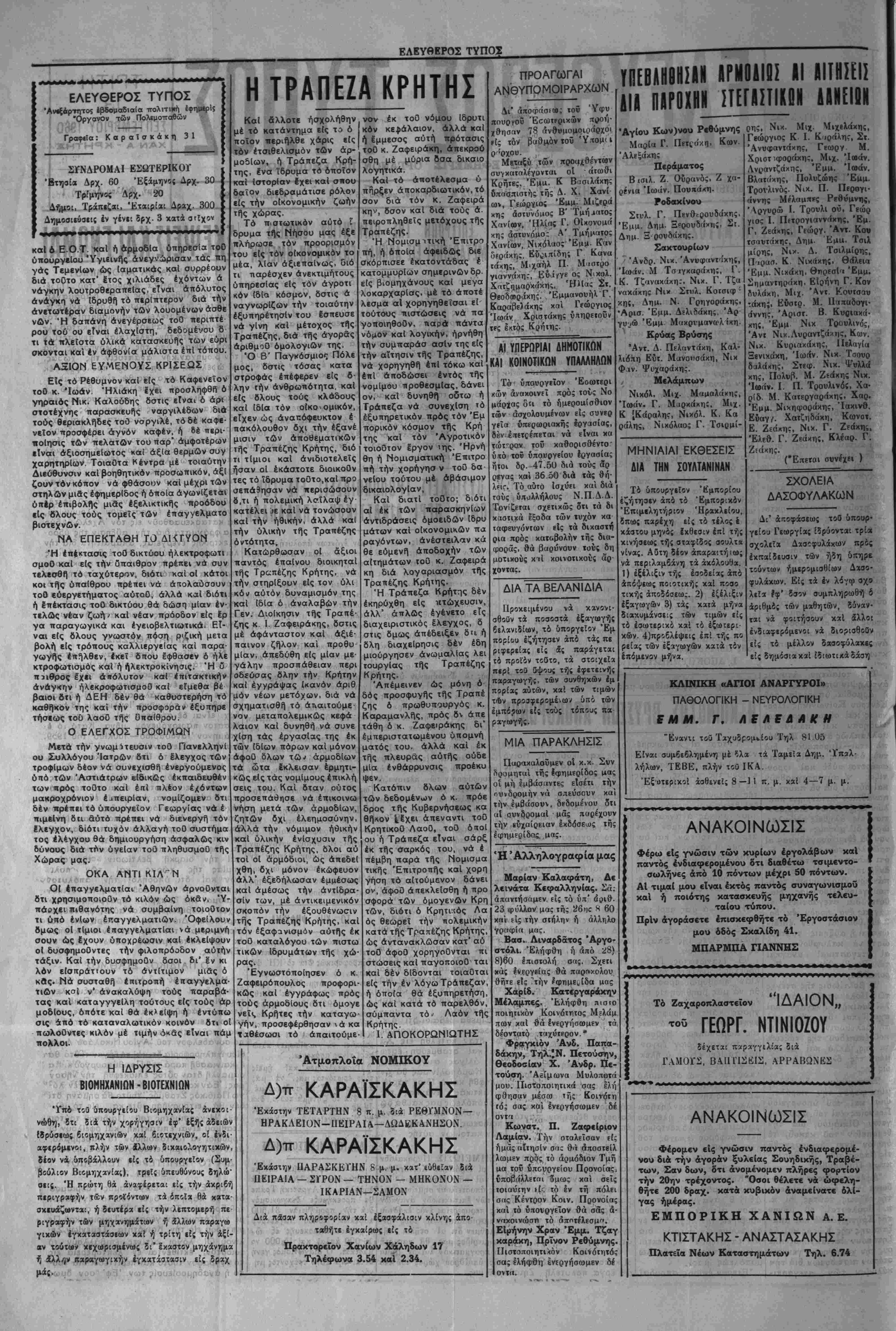 όντότητα. . /( 7< Κατώρθωσαν οί αξιοί παντός έπαίνου διοικήται τής Τραπέζης Κρήτης, νά την στηρΐξουν είς τον ύλι κόν αυτόν δυναμισμόν της καί Ιδία ό αναλαβών την Γεν. Διοίκησιν τής Τραπέ¬ ζης κ. Ι. Ζαφειράκης, δστις μέ αφάνταστον καΐ αξιέ¬ παινον ζήλον καί προθυ μίαν, απεδόθη είς μίαν με¬ γάλην προσπάθειαν περι οδίύσας όλην την Κρήτην καί έγγράψας Ικανόν αριθ μόν νέων μετόχων, διά νά σχηματισθή τό άτναιτούμε- Όν μεταπολεμικώς κεφά .αιον καΐ δυνηθή νά συνε ;1ση τάς εργασίας της έκ ών ίδΐων πόρων καί μόνον άφοθ δλων των αρμοδίων ά ώτα έκλεισαν έρμητι- ίώς είς τάς νομίμους έπικλή σεις τού. Καί οταν ούτος προσεπάθησε νά έπικοινω νήση μετά των αρμοδίων, ζητών δχι έλεημοσύνην, άλλά την νόμιμον ηθικήν καΐ ύλικήν ενίσχυσιν τής Τραπέζης Κρήτης, δλοι αύ τοί οί άρμόδιοι, ώς άπεδεΐ χθη, δχι μόνον έκώφευον άλλ' εξεδήλωσαν έμμέσως καΐ άμέσως την άντΐδρα- σΐν των, μέ αντικειμενικόν σκοπόν την έξουθένωσιν τής Τραπέζης Κρήτης, καί τόν έξαφανισμόν αυτής έκ τοθ καταλόγου των πιστω τικών ίδρυμάτων τής χώ¬ ρας. ΈγνωστοποΙησεν ό κ. Ζαφειρόπουλος προψορι- κώς καί εγγράφως πρός τούς άρμοδίους δτι όμογε νεΐ», Κρήτες την καταγω γήν, προσεφέρθησαν ν ά κα Ταθέσωσι τό άπαιτούμε- *Γπδ τοθ δπουργείου Βιομηχανίας ανεκοι¬ νώθη, δτι διά την χορήγησιν Ιφ' έξτ]ς άδειών Ιδρύσεως διομηχανιών καί βιοτιχνιών, οί ένδι· αφερόμενο:, πλήν των ίλλων δικαιολογητικών, δέον νά, ΰποβάλλουν είς τό υπουργείον (Συμ¬ βούλιον Βιομηχανίας), τρείς ΰπευθύνους δηλώ" σει»Λ Έ πρώτη θά άναφέρεται είς την άκριδή περιγραφήν των προϊόντων τα οποίαι θά κατα σκευάζωνται, ή δευτέρα είς την λεπτομερή πε¬ ριγραφήν των μηχανημάτων τ) έλλων παραγω γ ι κων εγκαταστάσεως κα! ή τρίτη είς την αξί¬ αν τούτ»ν κεχωρισμένως δι' έκαστον μηχάνημα ή 5λλ/]ν παραγωγιχήν εγκατάστασιν είς δραχ μάς. νόν έκ τοθ νόμου Ιδρυτι κόν κεφάλαιον, άλλά καί ή Ιμμεσος αυτή πρότασις , τοθ κ. Ζαφειράκη, άπεκρού σθη μέ μύρια δσα δικσιο λογητικά. Καΐ τό άποτέλεσμα ύ πήρξεν αποκαρδιωτικόν, τό σον διά τόν κ. Ζαφειρά κην, δσον καΐ διά τούς ά. ιτειροπληθεΐς μετόχους τής Τραπέζης. Ή Νομισμιτική Έπιτρσ πή, ή όποΐα άφειδώς διε σκόρπισεε εκατοντάδας έ κατομμυρΐων σημερινών δρ. είς βιομηχάνους καί μέγα λοκαρχαρΐσς. μέ τό άποτέ λεσμα αί χορηγηθεΐσαι εί τούτους τιιστώσεις νά πά γοποιηθοϋν, παρσ πάντα νόμον καΐ λογικήν, ηρνήθη' την συμπαράσ ασΐν της είς την αίτησιν τής Τραπέζης, νά χορηγηθή επί τόκω καί επί αποδώσει έντός τής νομΐμου τιροθεσμΐας, δάνει όν, καΐ δυνηθή οδτω ή Τραπέζα νά συνεχίση τό έξυπηρετικόν πρός τόν Έμ πορικόν κόσμον τής Κρή της καΐ τόν Άγροτικόν τοιούτον έργον ΐης. Ήρνή θη ή Νομισματική Έπιτρο πή την χορήγησ ν τοθ δα νείου τούτου μέ άβάσιμον δικαιολογίαν, Καΐ διατί τουτο; διότι αί έκ των παρασκηνΐων άντιδράσεις όμοειδών Ιδρυ μάτων καί οίκονομικών πά ραγόντων, άνέστειλαν κά θε εύμενή αποδοχήν των α(τημάτων τοθ κ. Ζαφειρά κη διά λογαριασμόν τής Τραπέζης Κρήτης. Ή Τραπέζα Κρήτης δέν εκηρύχθη είς ιιτώχευσιν, άλλ' απλώς εγένετο είς διαχειριστάς έλεγχος, δ στις δμως απέδειξεν διι ή δλη διαχεΐρησις δέν έδη μιούργησεν άνωμαλίας λει τουργΐας τής Τραπέζης Κρήτης. Άπέμεινεν ώς μόνη ό δός προσφυγής τής Τραπέ ζης ό πρωθυπαυργός κ. Καραμανλής, πρός όν. άπε τάθη δ κ. Ζαφειράκης δι" έμπεριστατωμένου ύπομνή ματός τού. άλλά καΐ έκ τής πλευράς αυτής ούδε μΐα ένθάρρυνσις προέκυ ψεν. Κατόπιν δλων αυτών των δεδομένων ό κ. πρόε δρος τής Κυβερνήσεως κα θήκον ι,Ιχει άπενα