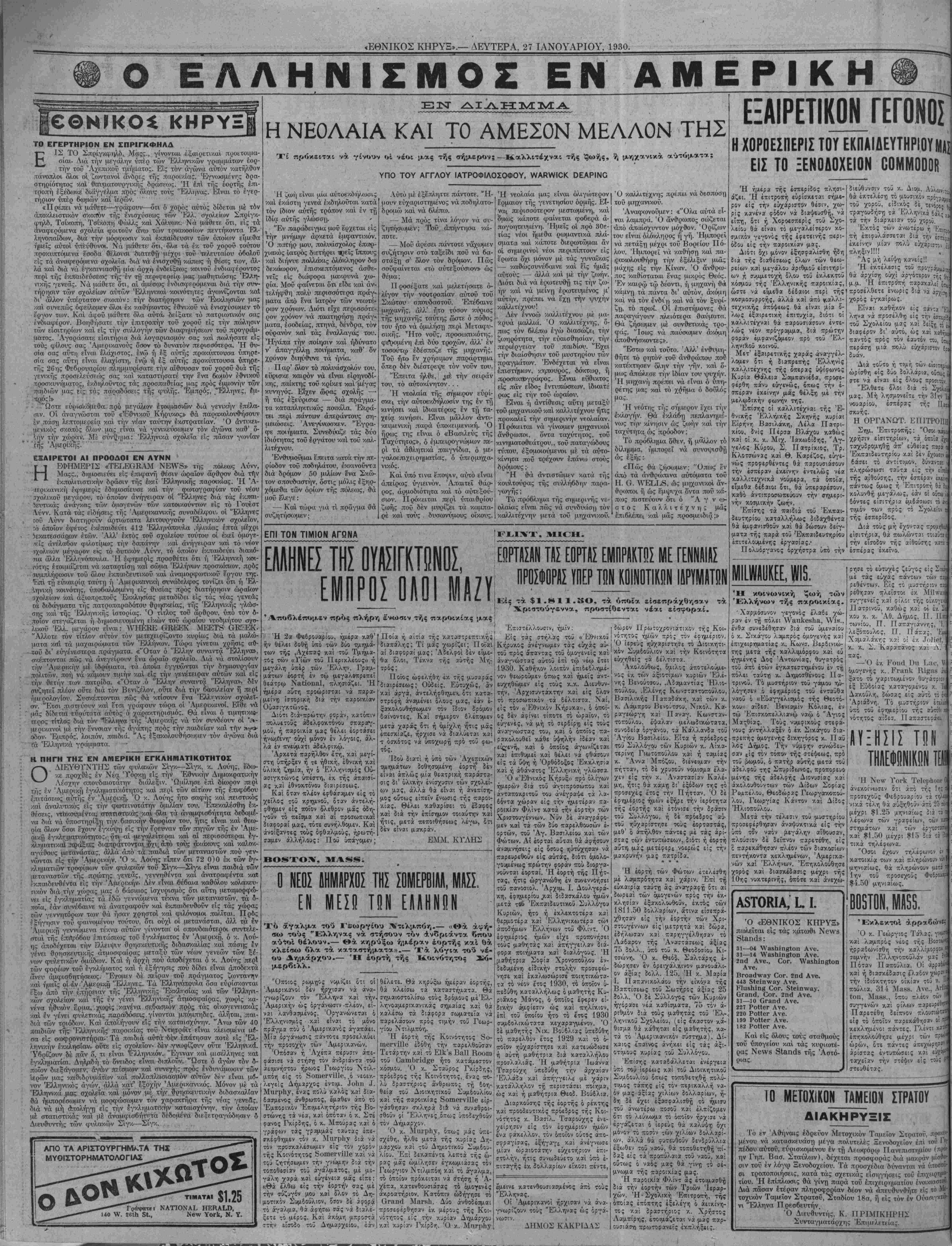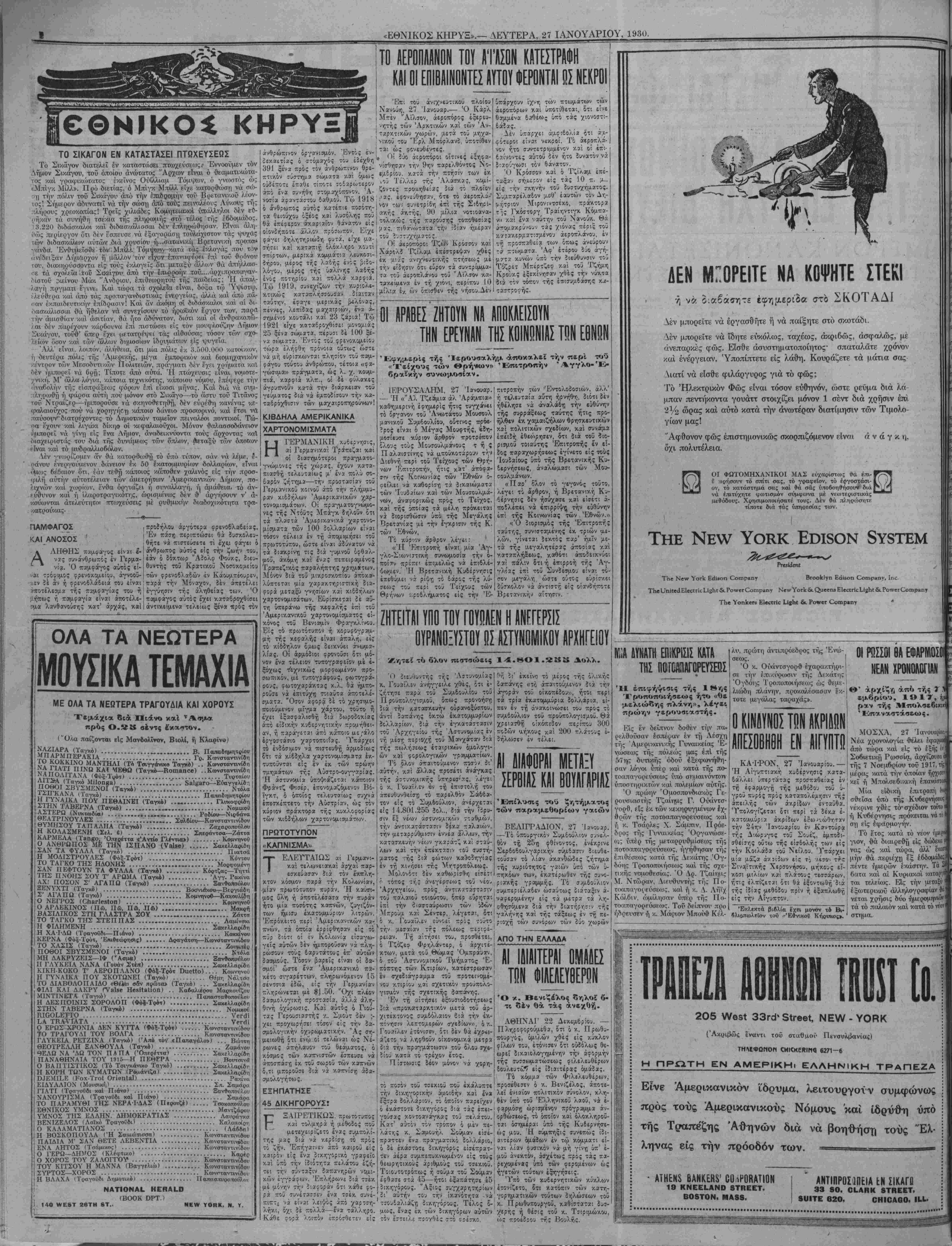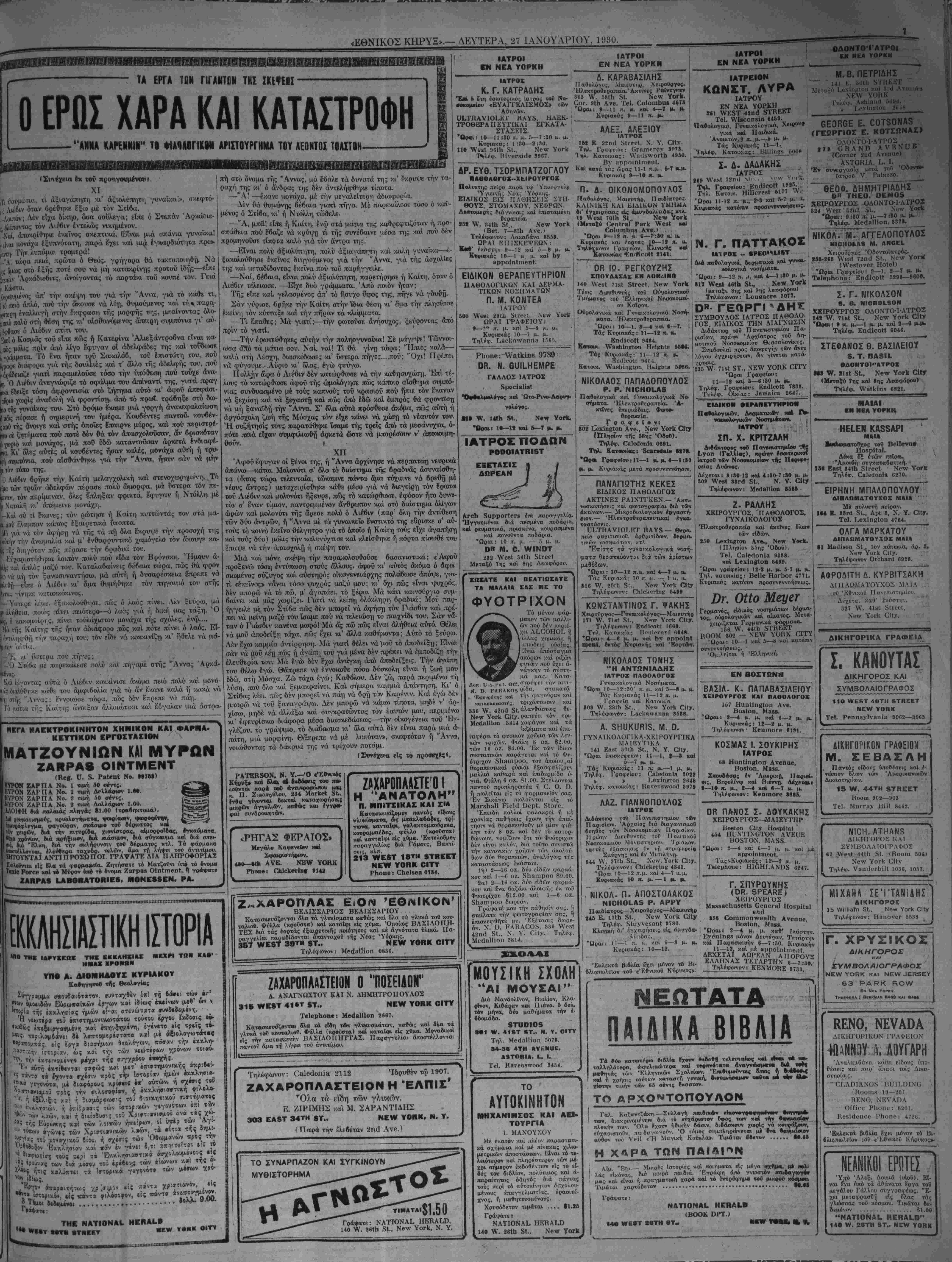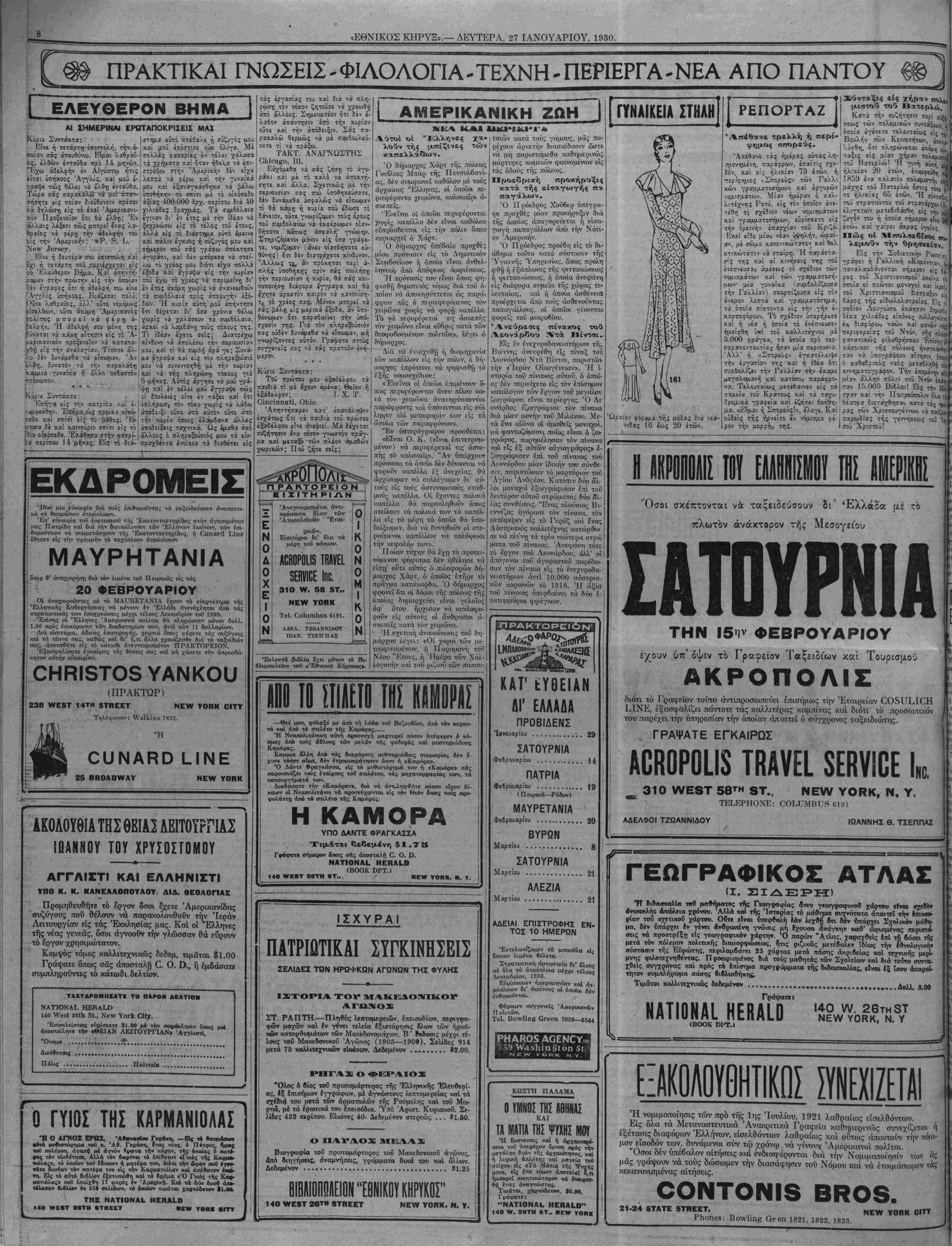 Ή »ι»αβκαλΙα —« μαθήματος τής ΓϊωγραφΙας βνευ γείογοαφικοβ χάρτου είνβι „&<,„, άνχικρβλής άπώλβια χρόνον. Άλλά καί τής Ίστορίας τό μάβημα συχνότατα άπαιτεΐ την έπικσο ςίαν τοΰσχετικοΰ χάρτου. Οντε είναι ύπερβολή εάν λεχτ» δτι δέν ύπάρχει Σχολικόν μάθη- μα, δέν ΰπάρχει έν γένει ανθρωπίνη γνώσις μή Ιχσυσα ανάγκην καθ* ωρισμένας περιστά· σεις νά προστρέξτ) είς γεωγραφικόν χάρτην. Ό παρών "Ατλας, χαραχτϊείς επί τ« βάσει τής μετα τόν πόί^μον πολιτικής διαμορφωσίως, τ)τις ριζικώς μετέβαλεν Ιδίως την Ιθνολογικήν σύστασιν τη; Εύρώπης, περιλαμβάνει 23 χάρτας μετά πάσης ακριβείας καί τεχνικής μίρί. μνης φιλοτεχνηθέντας. Προωρισμένος διά τούς μαθητάς των Σχολείων καί διά τουτο συντα. χβεΐς συγχοόνως καί πρός τα έπίσημα προγράμματα τής διδασκαλίαν είναι έξ Ιοου απαραΐ· τητον συμπληρωμα πάσης βιβλιοθήκης. Τιμάται χαλλιτεχνικώς δεδεμένον.............········.·...····,.♦...Δολλ. Λ.00 Γράψατεΐ ΝΑΤΙΟΝΑΙ ΗΕΒΑίΟ (ΒΟΟΚ ΌΙΤ.ί 140 νν. 26τη8Τ ΝΕνν ΥΟΛΚ, Ν. Υ ΚΡΣΤΗ ΠΑΛΑΜΑ Ο ΥϋΟΣ ΤΗΣ ΑΘΗΝΑΣ ΚΑΙ ΤΑ ΝΙΑΤΙΑ ΤΗΣ ΨΥΧΗΣ ΜΟΥ Ή ίμπνευσν; χαΐ ή άοχαιο—4- πε^ τσΰ ύπερόχου ΰμ-νου «ράς την μεγάλην βεά-ν τής αρχαιότητος, καί ή λυρυίή άπλότη; καί μαγεία τοϋ οΐίχου εί; «Τα Μάτια τής Ψυχής μοί», είς ίνα τόμον άχοτιλΐΐ ο, τι ήμ—ρεί πΜητιχώτερον νά όνβφευ. Θί έ'νας άναννώστης. Τιμάται. χαρτόοετον. $0.90. Γράψατε: "ΝΑΤIΟΝΑ^ ΗΕΒΑΙ.Ο" 140 ΜΤ. 2βΤΗ ·Τ.. ΝΕ* ΥΟΠΚ Η νομιμοποιησις των πρό τής 1ης Ιουλίου, 1921 λαθραίως εΐσελθσντων. Εις ολα ταΜεταναστευτικά Άνακριτικά Γραφεία καθημερινώς συνεχίζεται ή εξετασις διαφόρων Ελλήνων, είσελθόντων λαθραίως καί ούτως άποκτοΰν την νόμι- μον είσοδον των δυνόμενοι συν τφ χρόνφ νά γίνουν Άμερικανοί πολίται. Οσοι δεν υπέβαλον αιτησεις καί ένδιαφέρονται διά την Νομιμοποίησίν των ά; μας γραψουν να τους δώσωμεν την διασάφησιν τοΰ Νόμου καί νά έτοιμάσωμεν τας κεκανονισμένας αιτησεις. ΟΟΝΤΟΝΙδ ΒΡΟδ. 21-24 9ΤΑΤΕ 3ΤΗΕΕΤ, : Βον*·1ίη? θε επ 1821, 1822, 1828. ΝΕ>ν ΥΟΒΚ ΟΙΤΥ