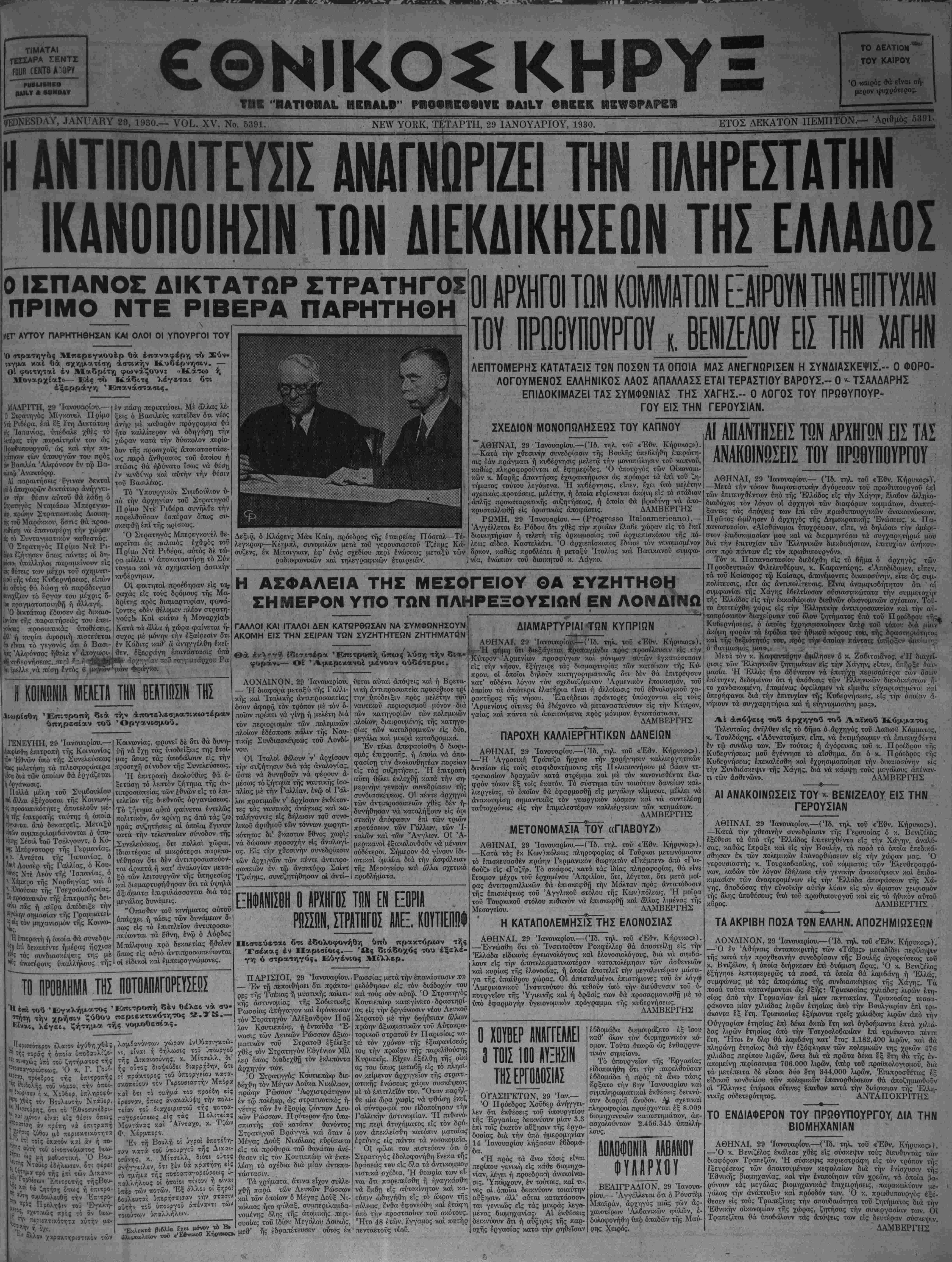 τχγμα κ<αϊ θ« σχηματίση αστικήν Κυβέρνησιν. — Οί φοιτηταί έν ΛΙαδρίτη φωνάζουν: «Κάτω ή Μοναρχία!»— Είς τδ Κάδιτς λ£γ«τ<*ι ότι εξερράγη Έά ΜΑΔΡΙΤΗ, 29 Ιανουάριον.— Ό Στρατηγός Μίγκσυελ Π ρίμο Ντέ Ριοέρα, £πί Εξ ετη Δικτάτωρ ής Ίσπανίας, υπέβαλε χθές τό ((Βέρας την παράίτησίν τού ώς Πρωθυπουργόν, ώς καΐ την πα- οηίτησιν των ύπουργών τού πρός Βασιλέα Άλφόνσον έν τό) Βα- Άό •όν φ ιιλΐχφ Άνακτόρψ. Αί παραιτήσεις ώ δ έγιναν δεκταί ά άή ρή γ μ ό άποχωρών δικτάτωρ άνήγγει- Ιεϊ την ίϋέσιν αυτού θά λάβη ό Στοα-πγγός Νταμάσω Μπερεγκο- τ4ο, πρώην Στρατιωτικάς Διοικη- ΐη; τού Μαρόκκου, δστι; θά προσ- ια{τήση νά έπαναφέρτ) την χώραν είς τό Συνταγματικόν -καθεστώς. Ό Στρατηγός Πρίμο Ντέ Ρι- ι εζήτησεν όπως πάντες οί δη- υπάλληλοι παραμείνουν είς ιβ: θέσεις των μέχρι τοΰ σχηματ!- ΐιιοϋ τής νέας Κυβερνήσεως, ειπών ότι αύτός θά δώση τό παράδειγμα βννεχίζων τό ε'ργον τού μέχρις δ- ΐου πραγματοποιηθή ή άλλαγή. Ό δικτάτωρ έ'δωσεν ώς δικαιο- '""';ην τής παραιτήσεως τού έπει- ι; προσωπικάς ΰποθέσεις, Μ ή κυρία άφοομή πιστεύεται δτι είναι τό γεγονός ότι ό Βασι- )ίν; Άλςρόνσος ή'θελε ν' άπ * Μή ^ ? έν πάση περιπτώσει. Μέ ά*λλας λέ- ξεις ό Βασιλεύς κατι^ΐδεν δτι νέος άνήρ μέ καθαρόν πρόγραμμα θά ■ήτο καλλίτερον νά οδηγήση την χώραν κατά την δύσκολον περίο¬ δον της προσεχούς άπσκαταστάσε- ως παρά άνθροχτος τοΰ όποίσυ ή πτώσις θά ηδύνατο ΐσως νά θέση έν κινδχ'νω καί αύτην την θέσιν τοΰ Βασιλέο>ς.