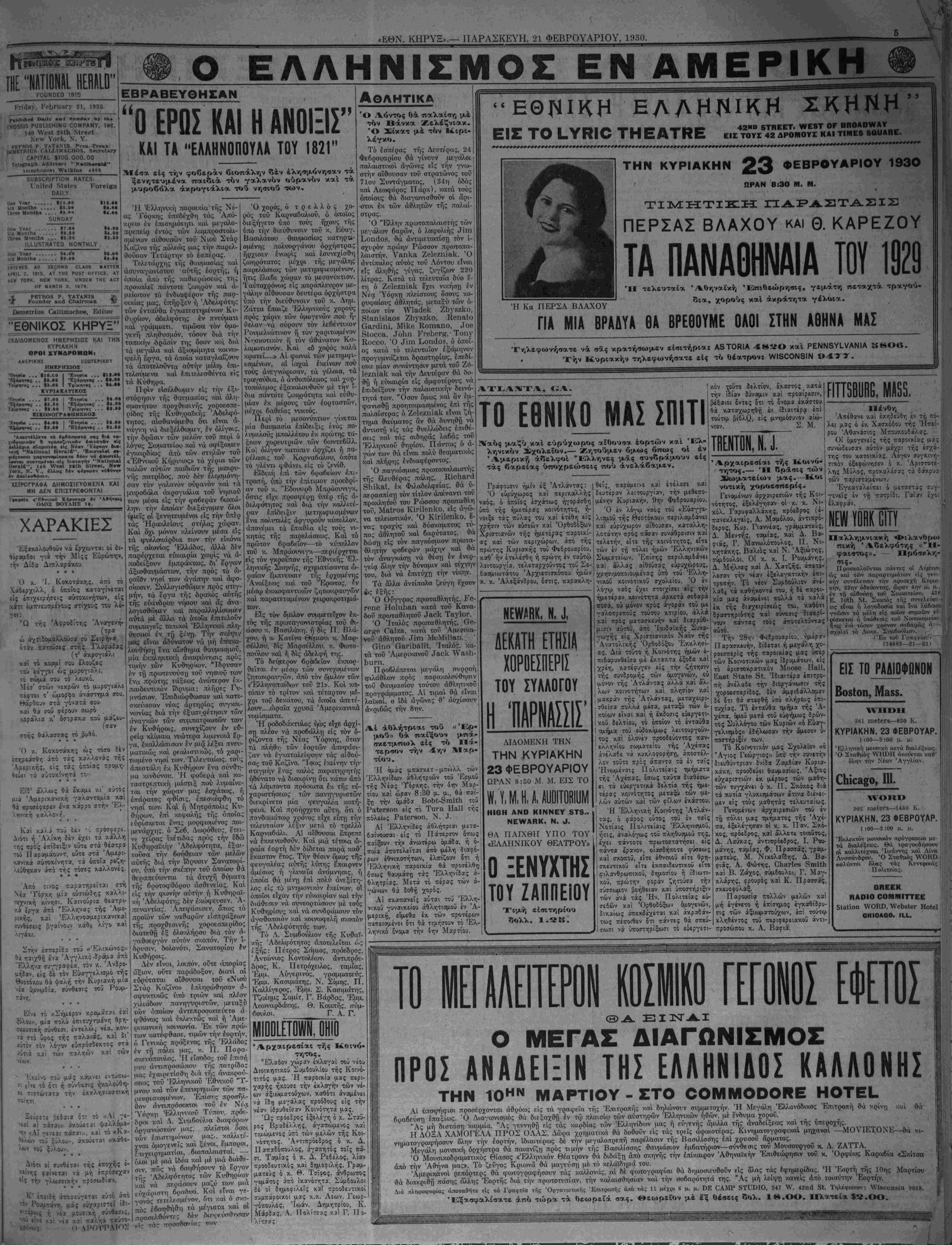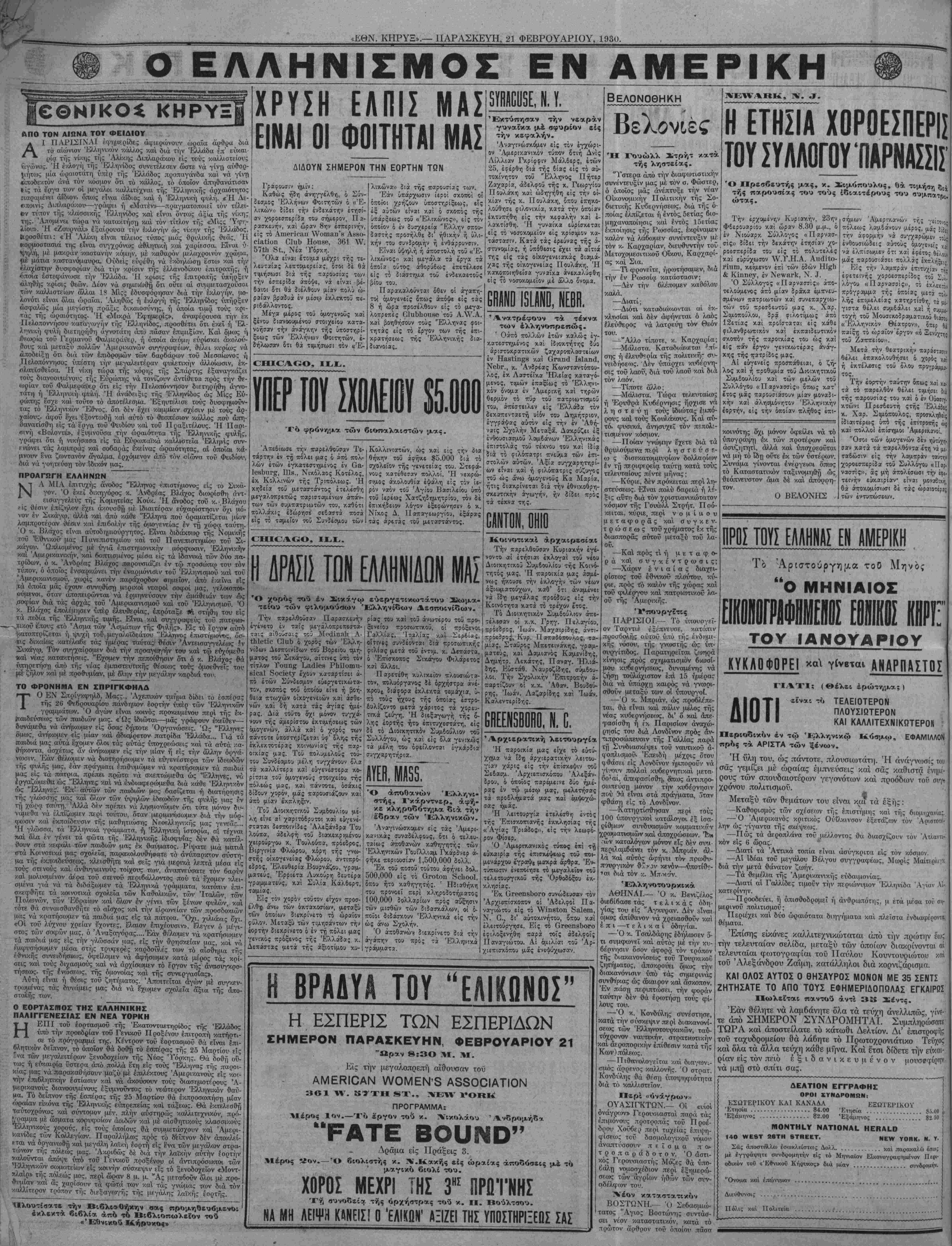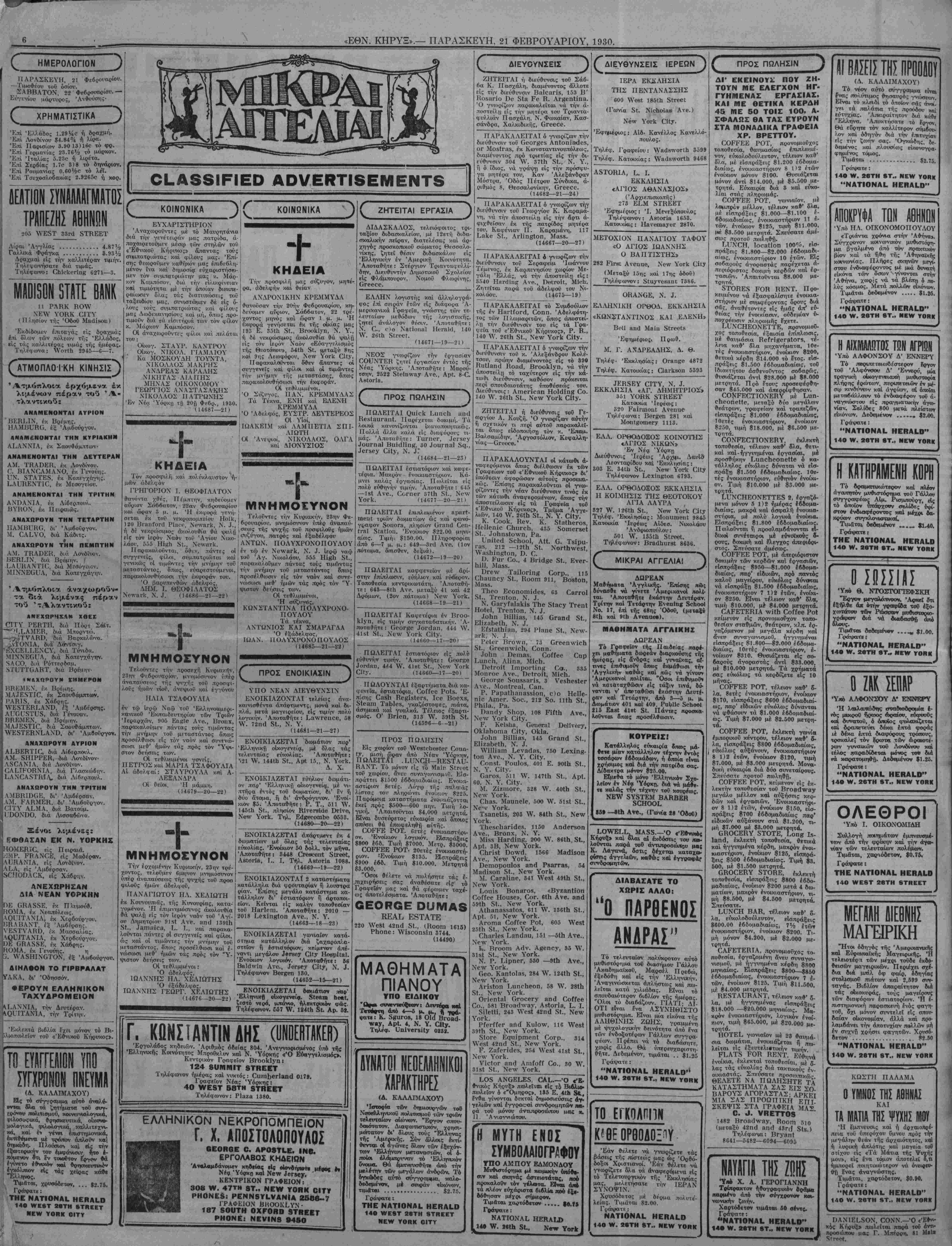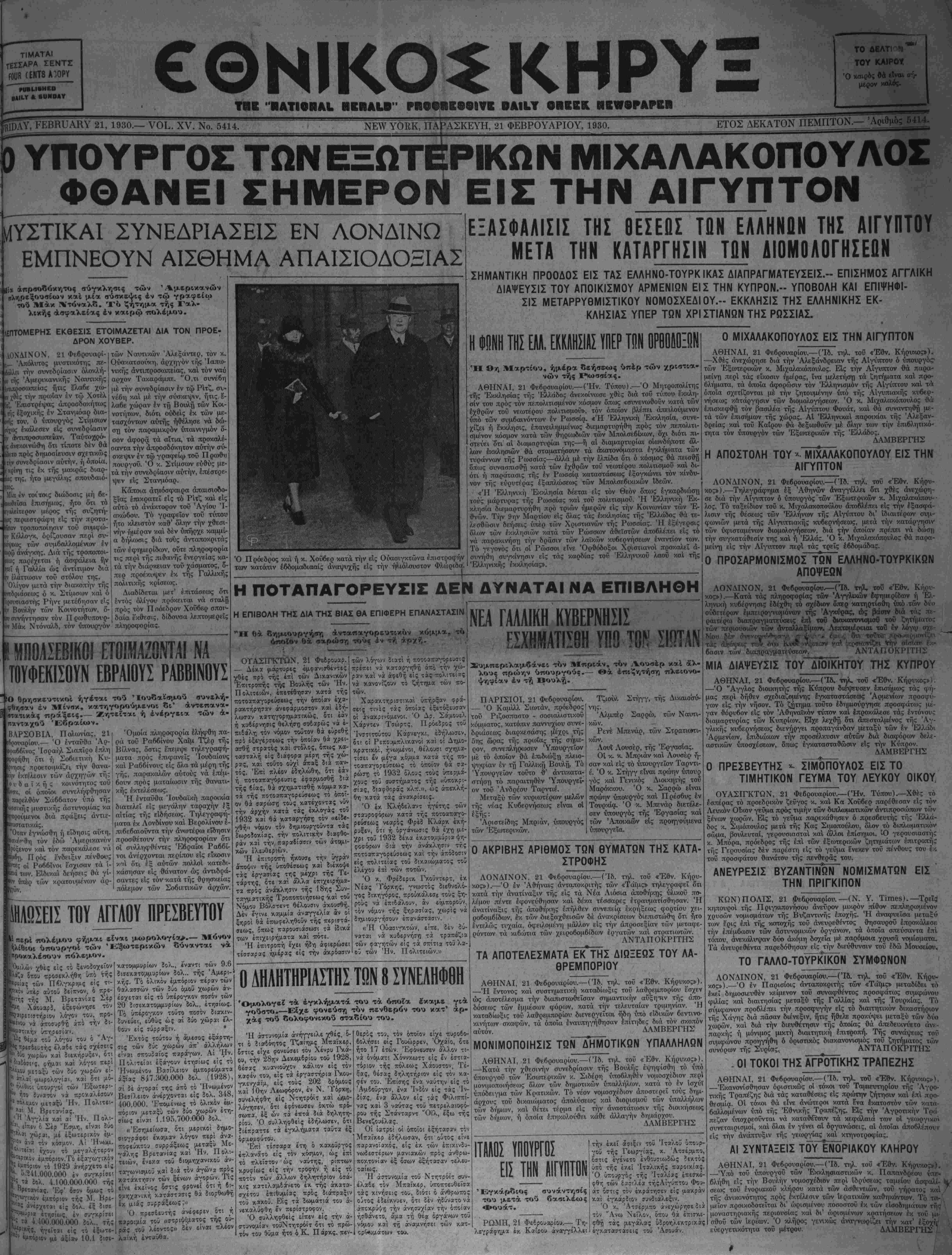 =ΝΕν ΥΟΕΚ, ΠΑ^ΑΣΚΕΥΗ, 21 ΦΕΒΡΟΥΑΡΙΟΝ 1930.